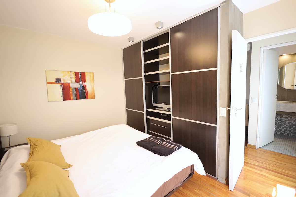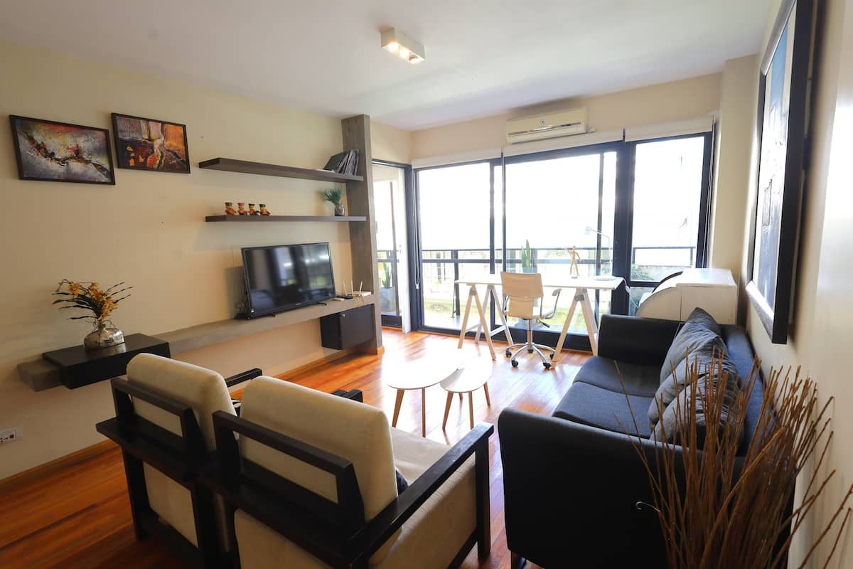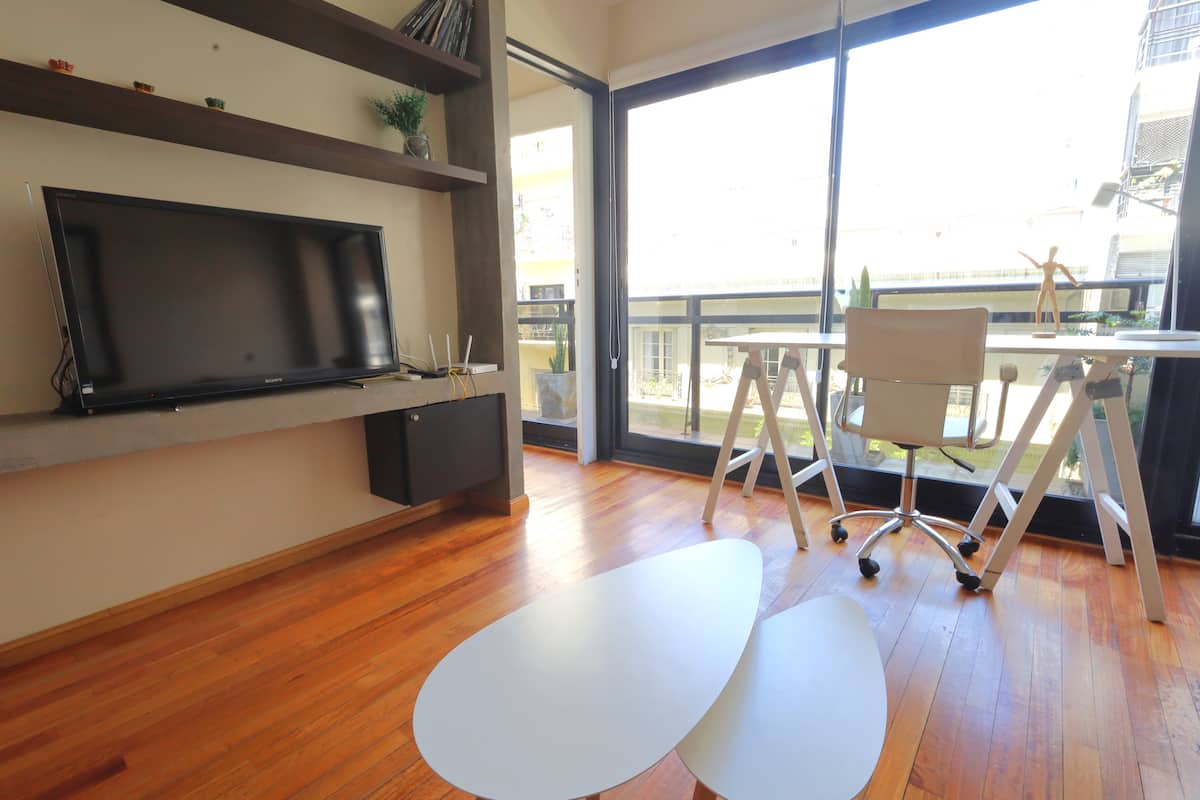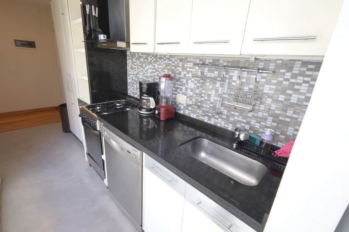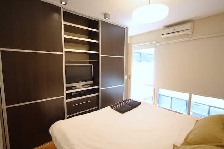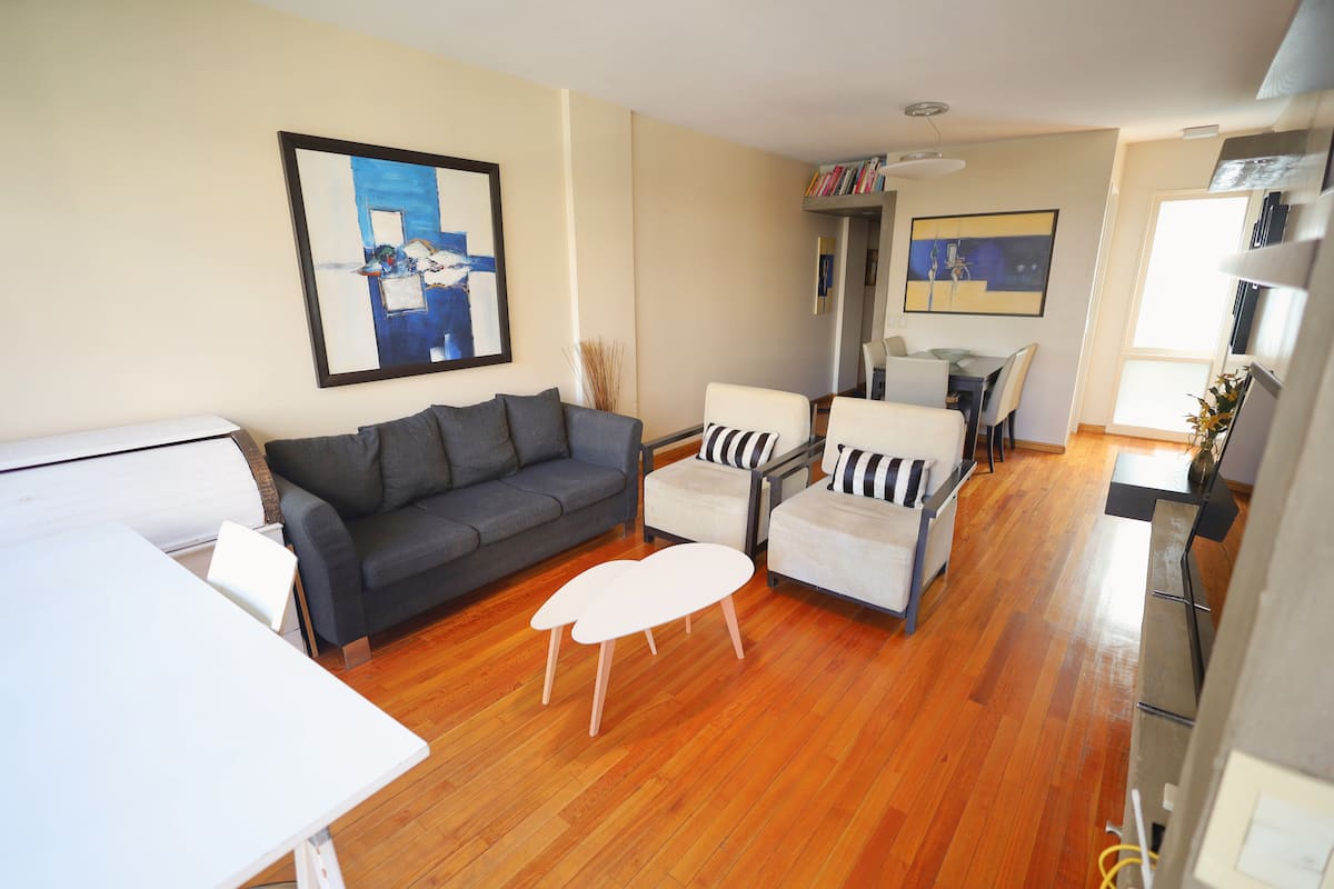 Two-bedroom apartment in Recoleta available for long stays. It has a separate kitchen, a shared living and dining area with a desk and TV, one full bathroom and a toilette, and a balcony. The first bedroom is fitted with a king-size bed and includes a TV and closet space, while the second bedroom has a queen-size bed and closet space. The kitchen is equipped with a stove, oven, microwave, coffee machine and dishwasher, plus a washing machine. The building has a doorman during commercial hours, a