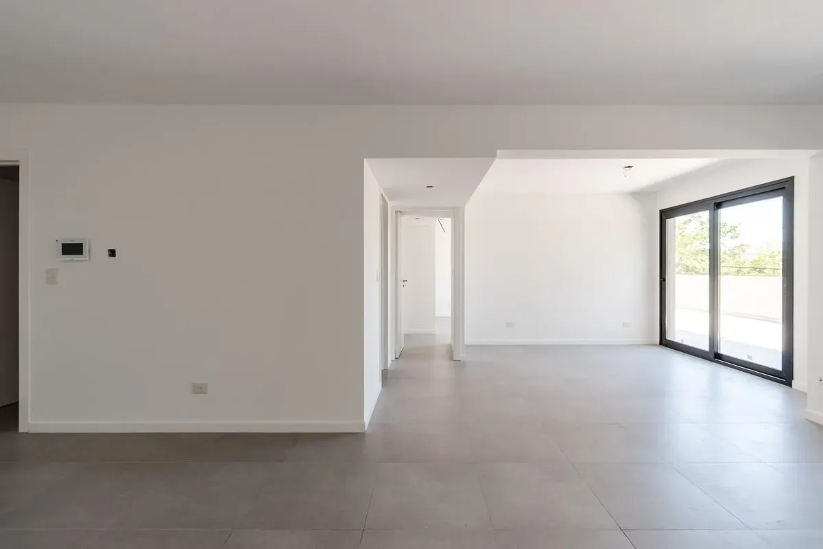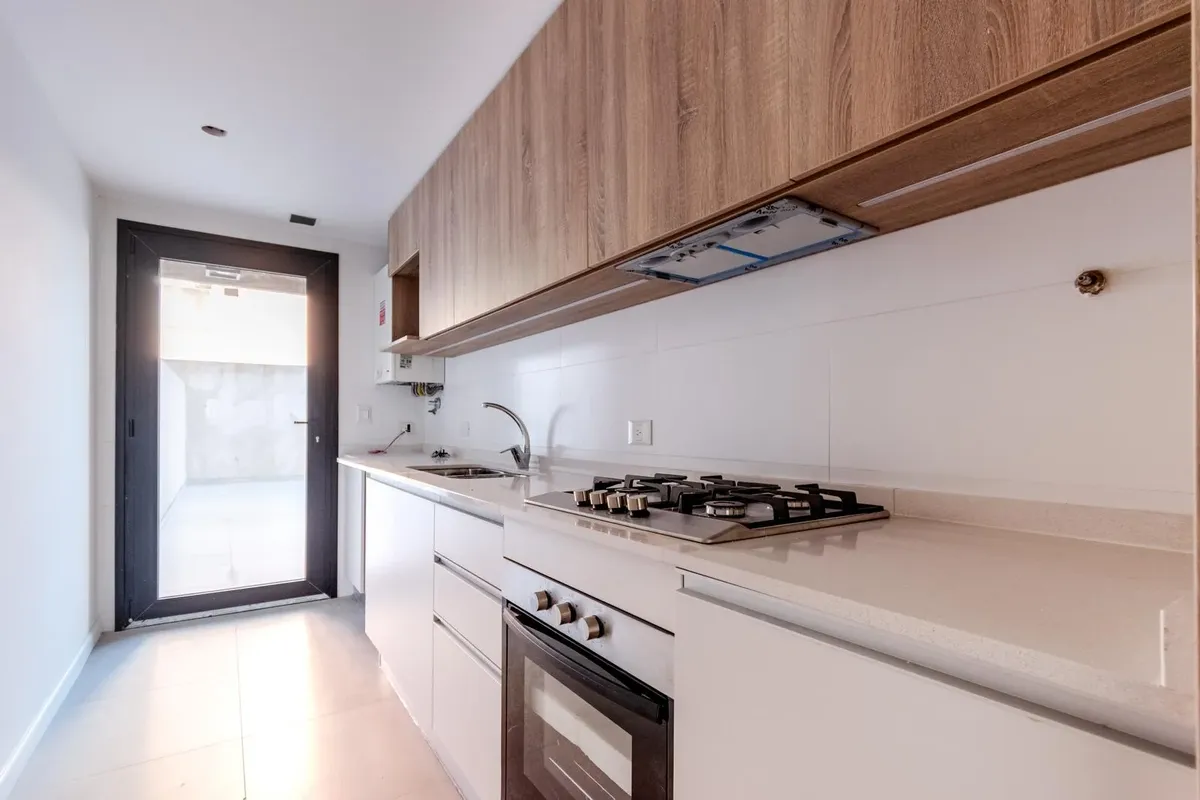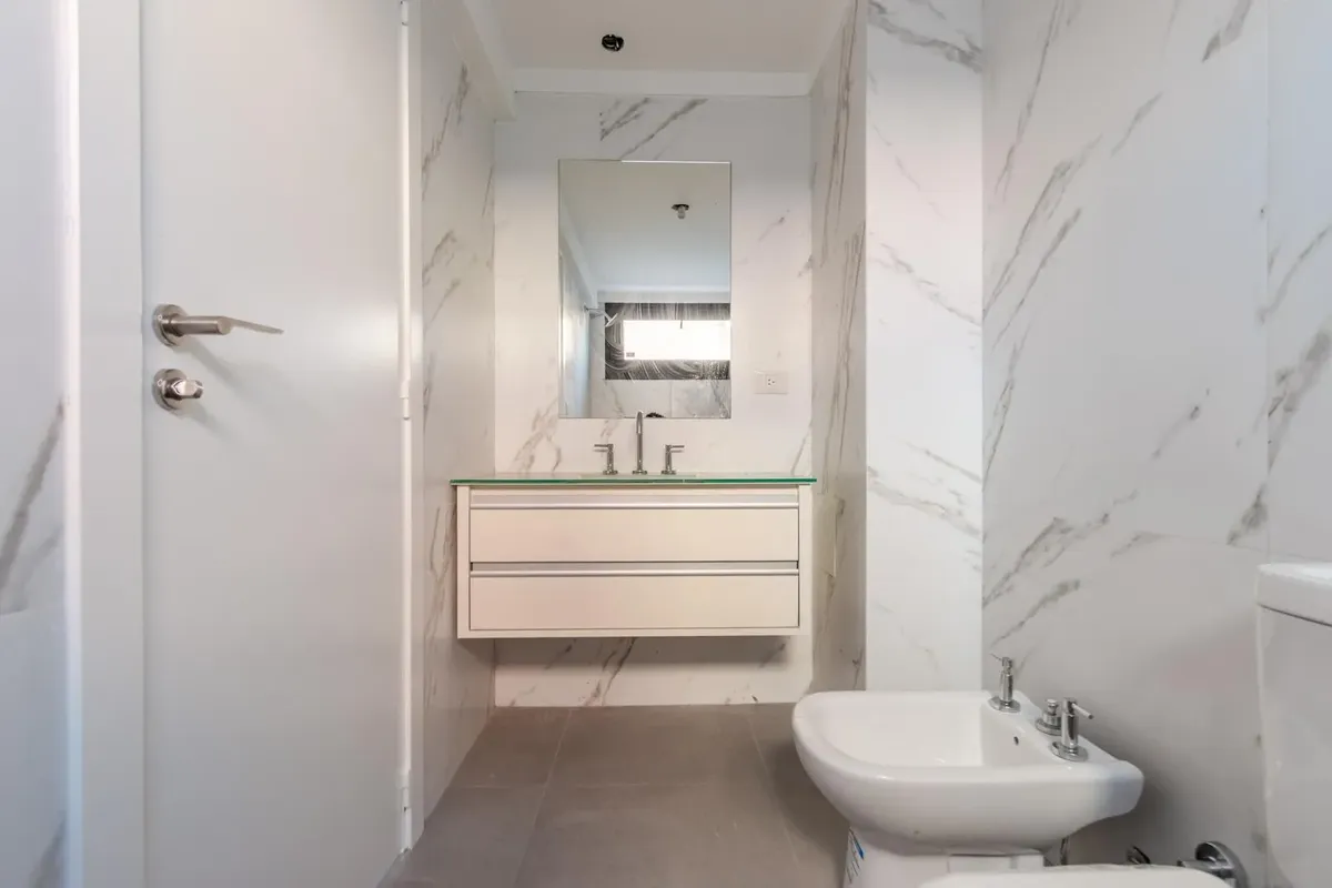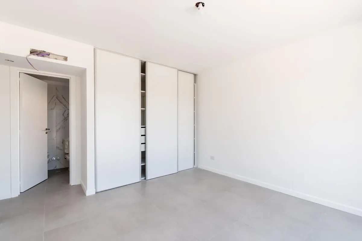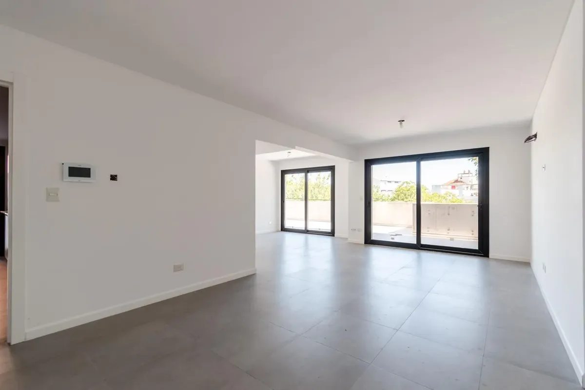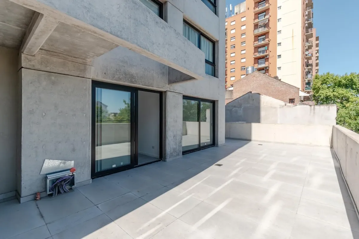 Three-room apartment with 76 m² covered area and a private patio of 101 m², for a total of 177 m². It is a two-bedroom unit that faces the street with open views of the avenue. The living and dining area is paired with a separate modern kitchen with built-in cabinetry and space for a washer and dishwasher. The master bedroom is en suite, and the second bedroom uses a full bathroom that also serves as a guest toilet; both rooms have access to the patio. The building is in a 9-storey tower with a