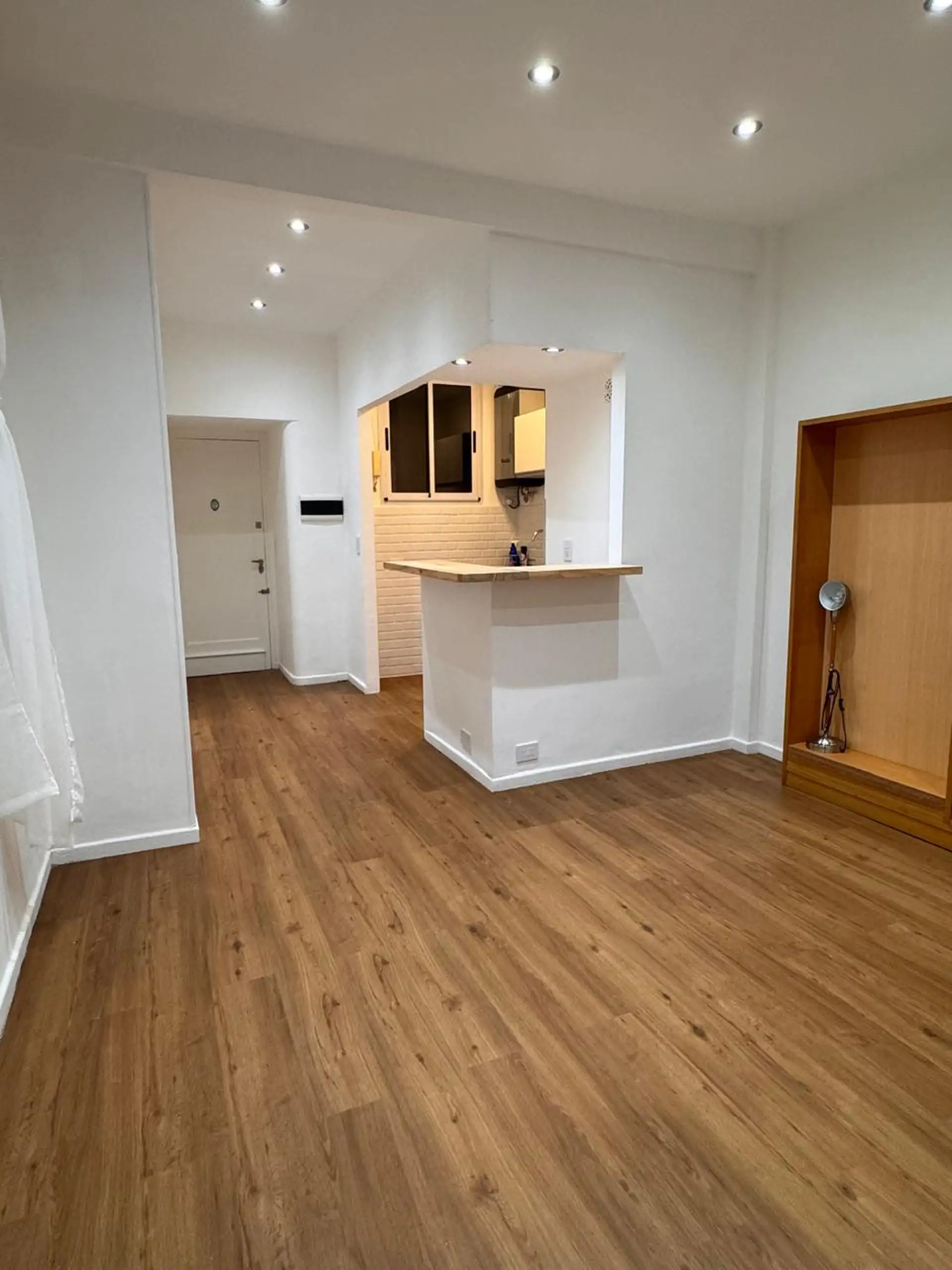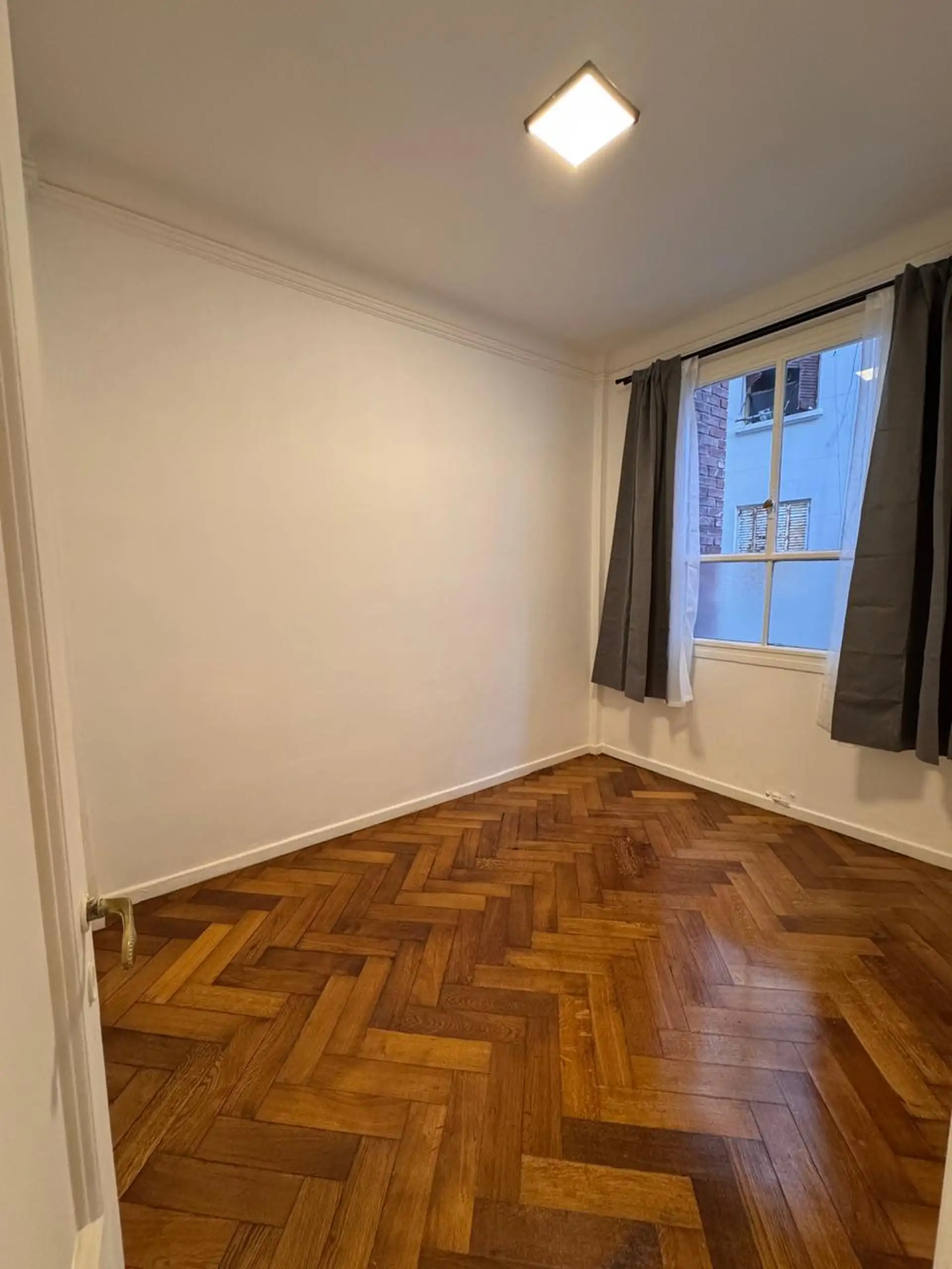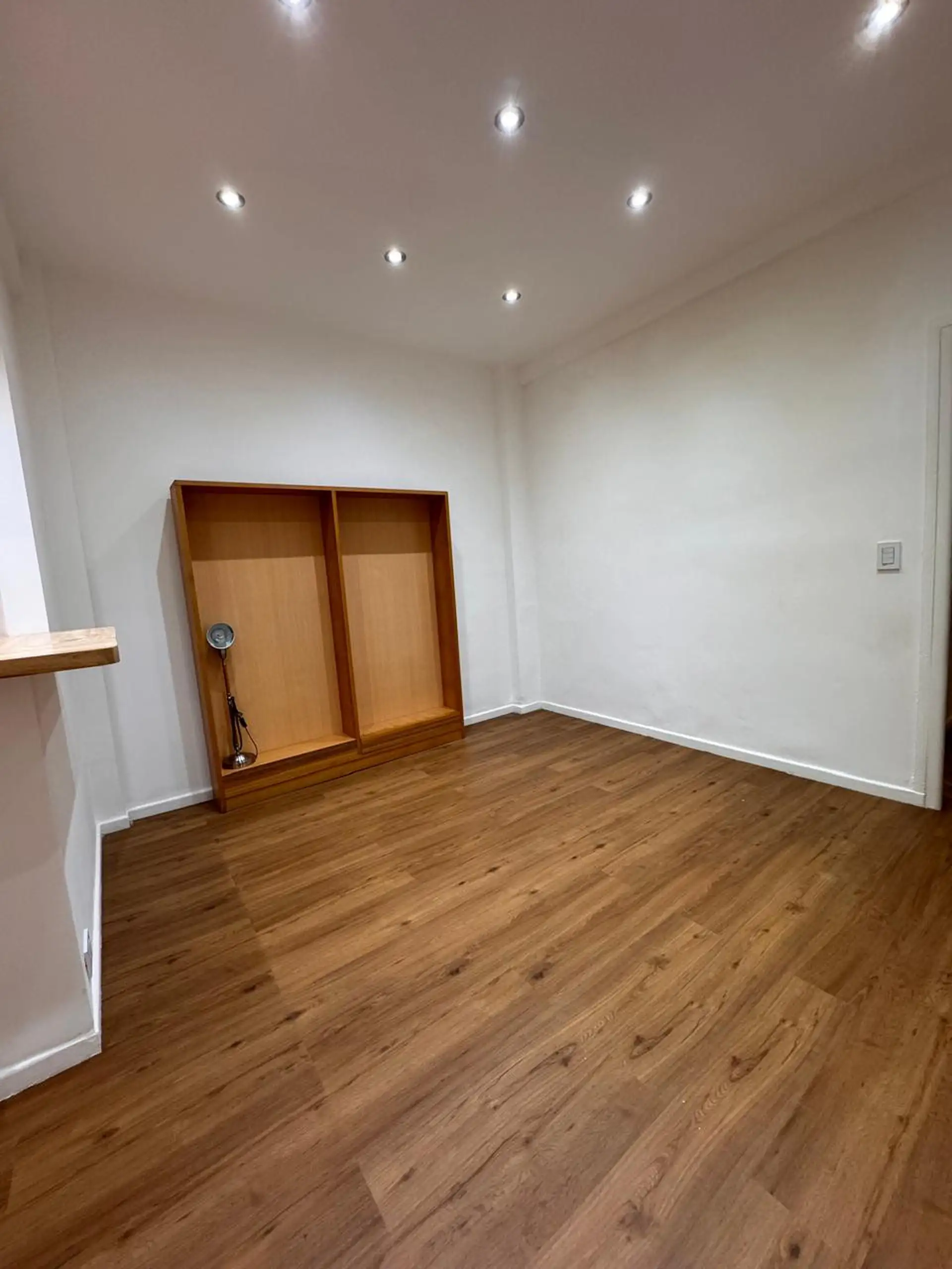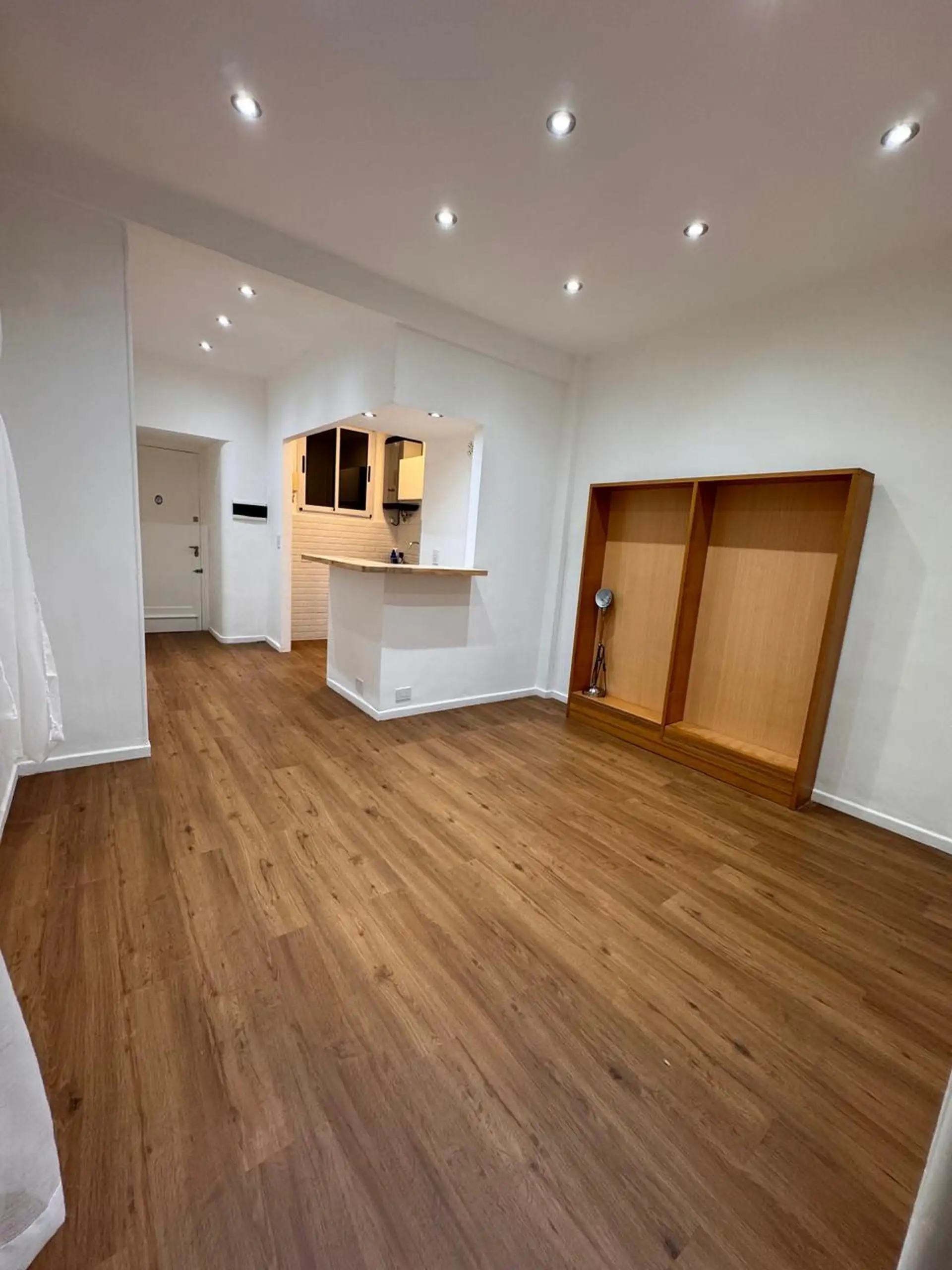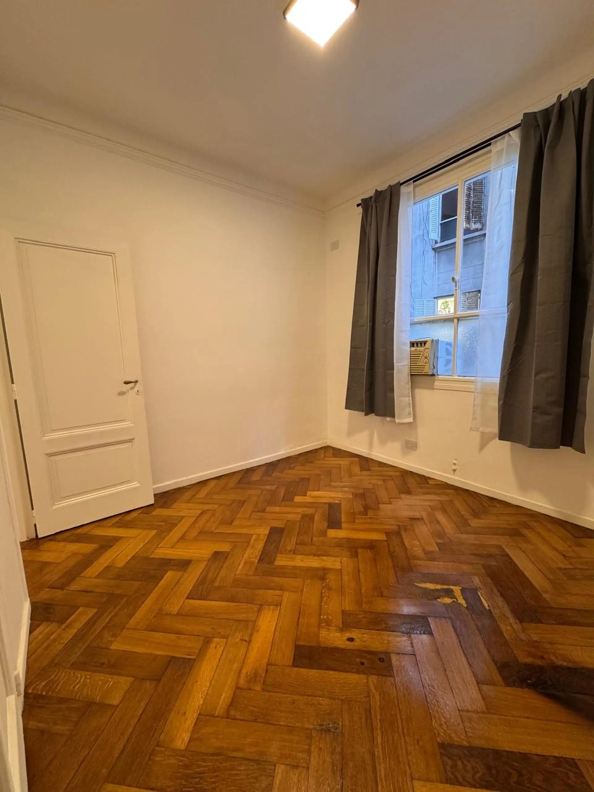 Apartment in central Buenos Aires, 1 block from Av. Corrientes, 2 blocks from Av. Callao, and half a block from the Paseo de la Plaza. Layout includes a living-dining room, 2 bedrooms, and a small storage room or office. Integrated-bar kitchen with oven and electric water heater; bathroom has been fully refurbished. Recently painted and had floor polishing; building fees are described as low.