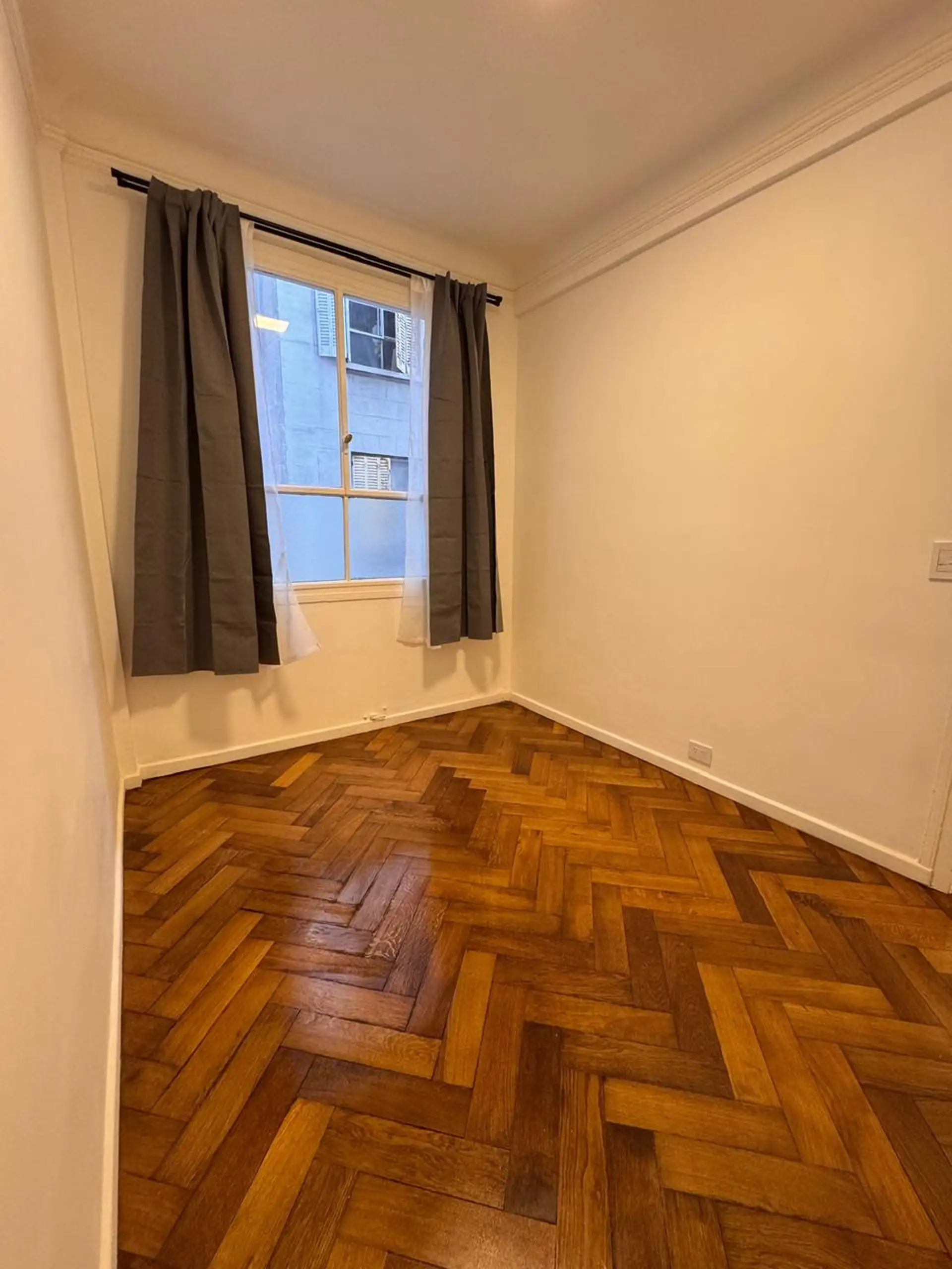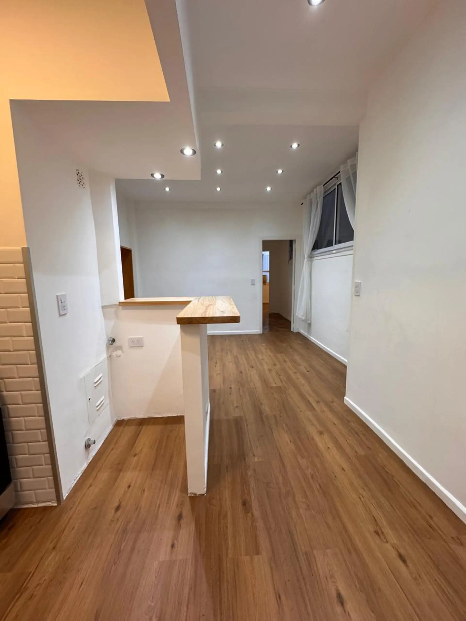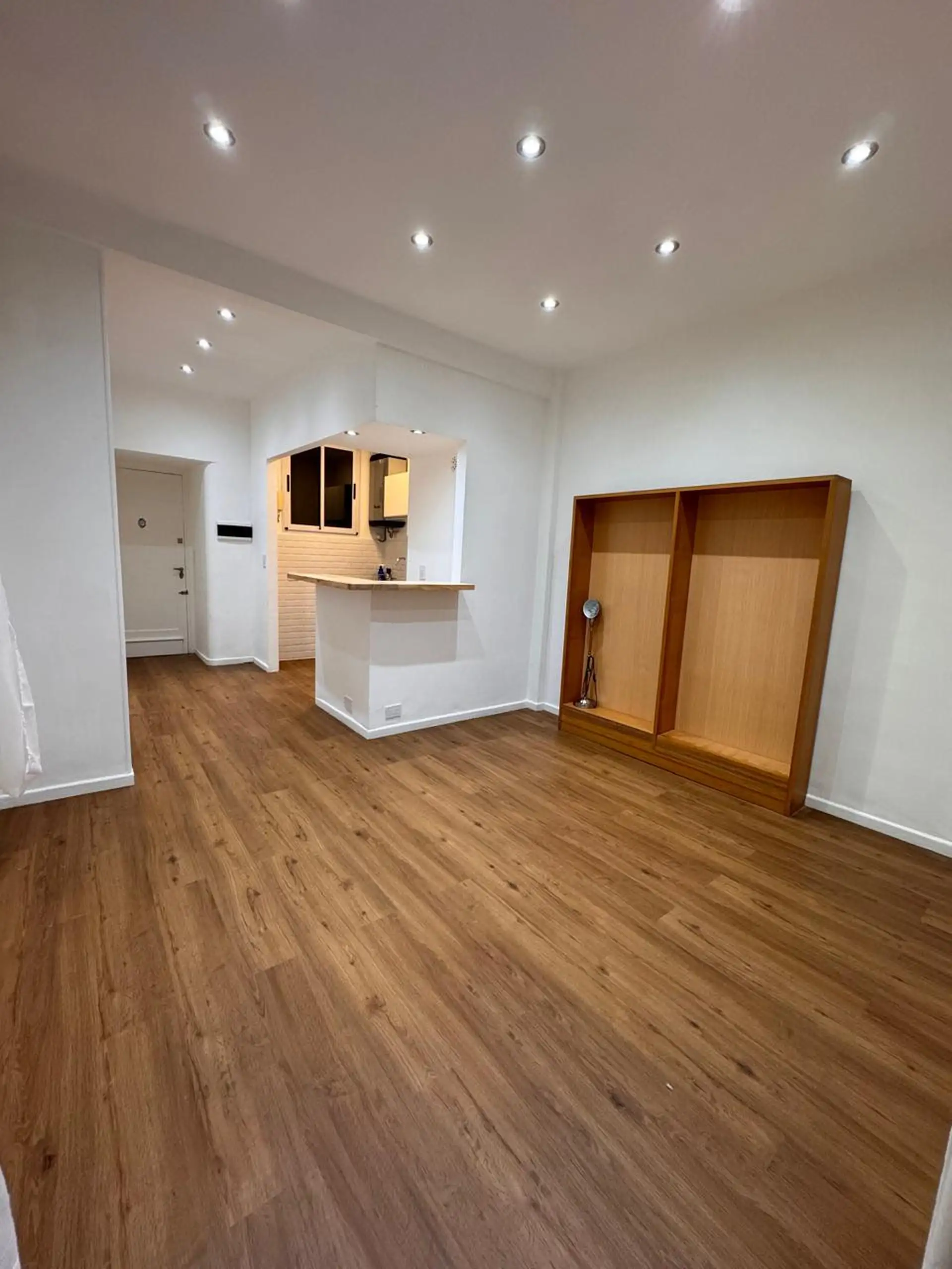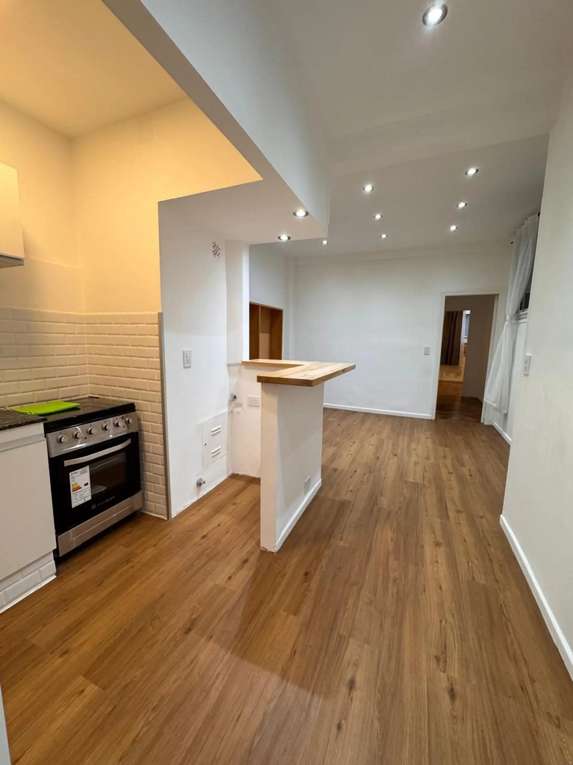 Apartment in central Buenos Aires, 1 block from Av. Corrientes, 2 blocks from Av. Callao, and half a block from the Paseo de la Plaza. Layout includes a living-dining room, 2 bedrooms, and a small storage room or office. Integrated-bar kitchen with oven and electric water heater; bathroom has been fully refurbished. Recently painted and had floor polishing; building fees are described as low.