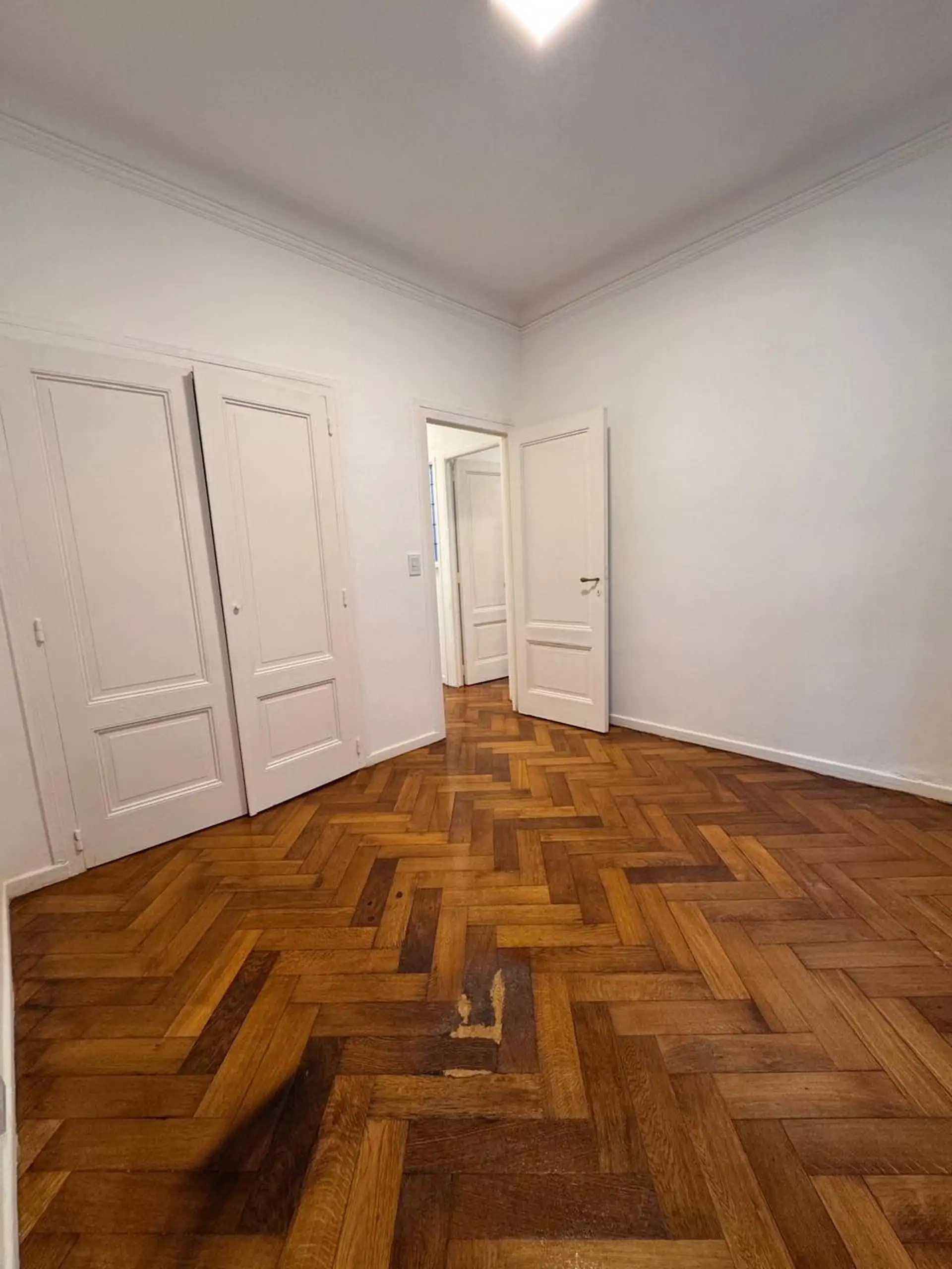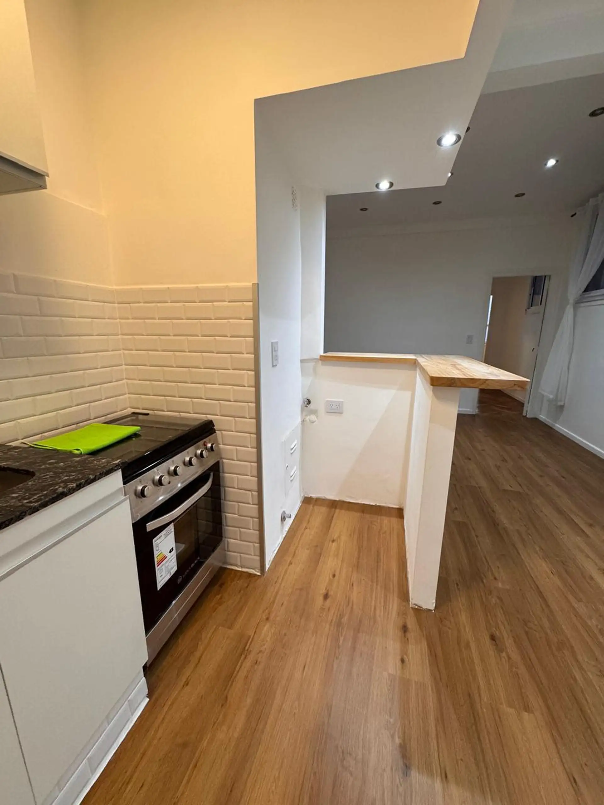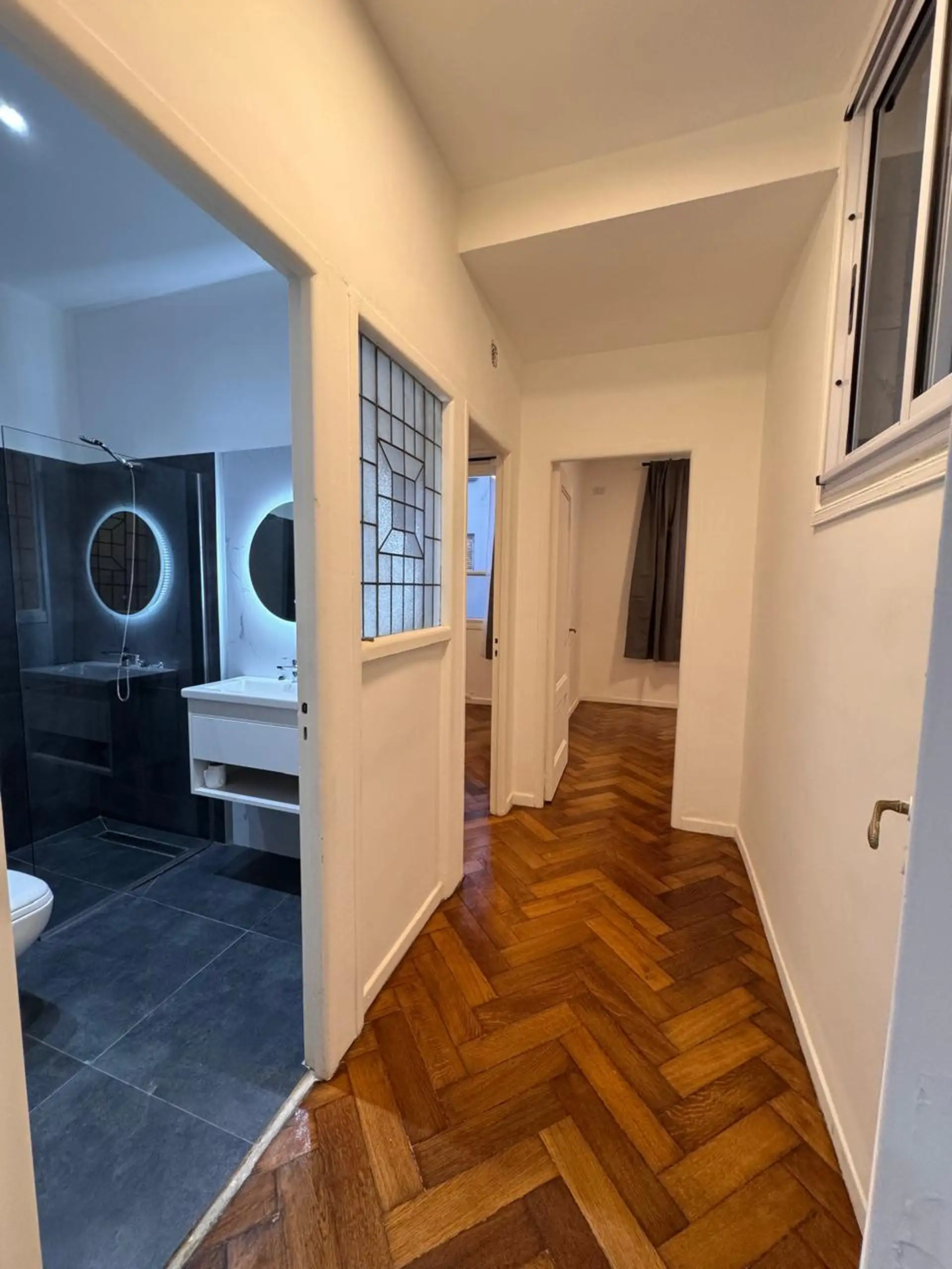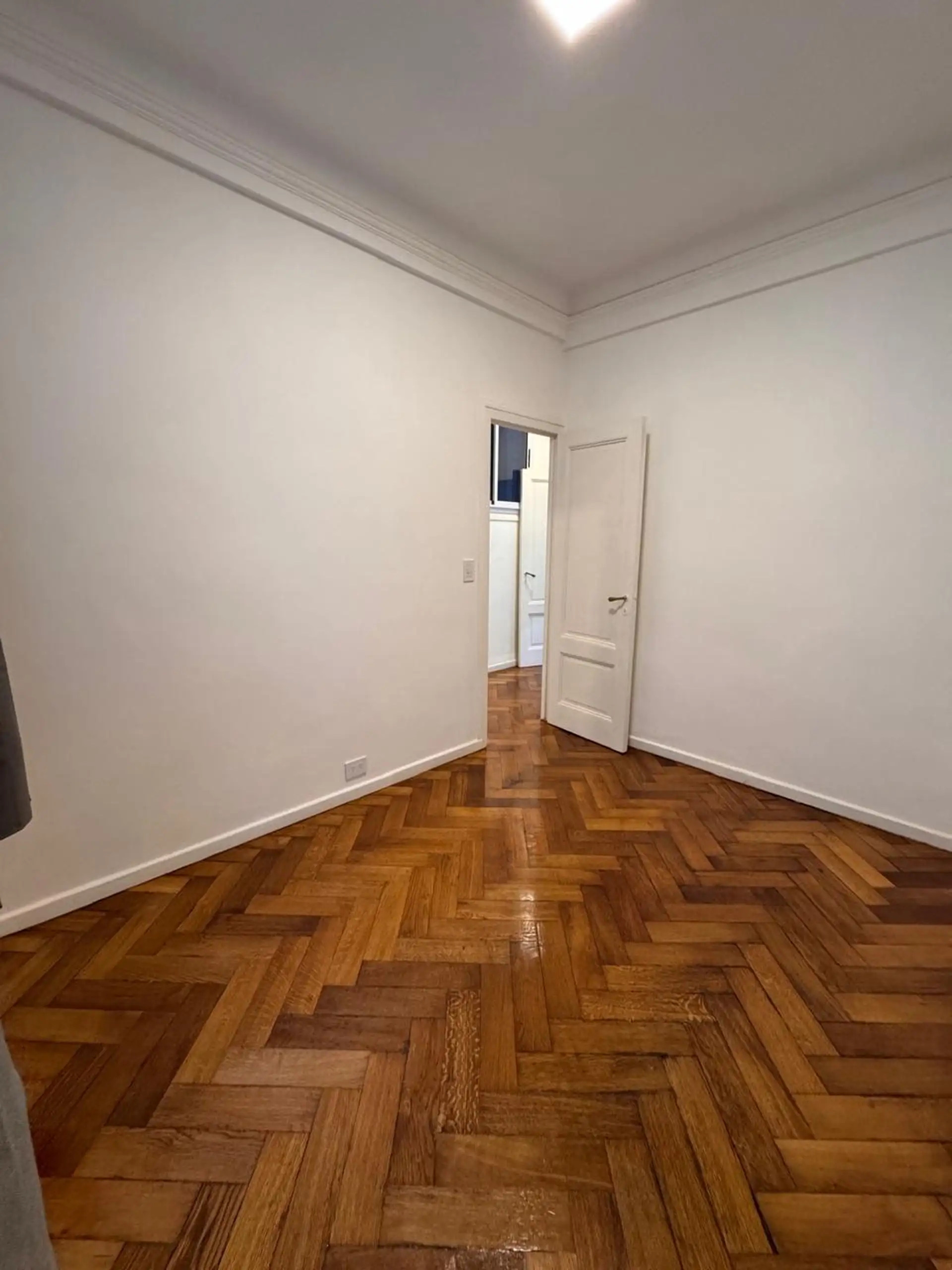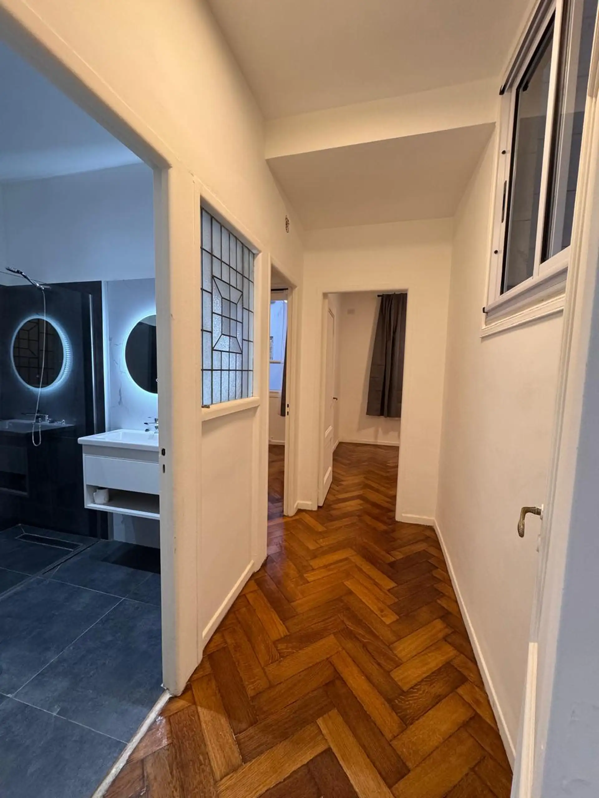 Apartment in central Buenos Aires, 1 block from Av. Corrientes, 2 blocks from Av. Callao, and half a block from the Paseo de la Plaza. Layout includes a living-dining room, 2 bedrooms, and a small storage room or office. Integrated-bar kitchen with oven and electric water heater; bathroom has been fully refurbished. Recently painted and had floor polishing; building fees are described as low.