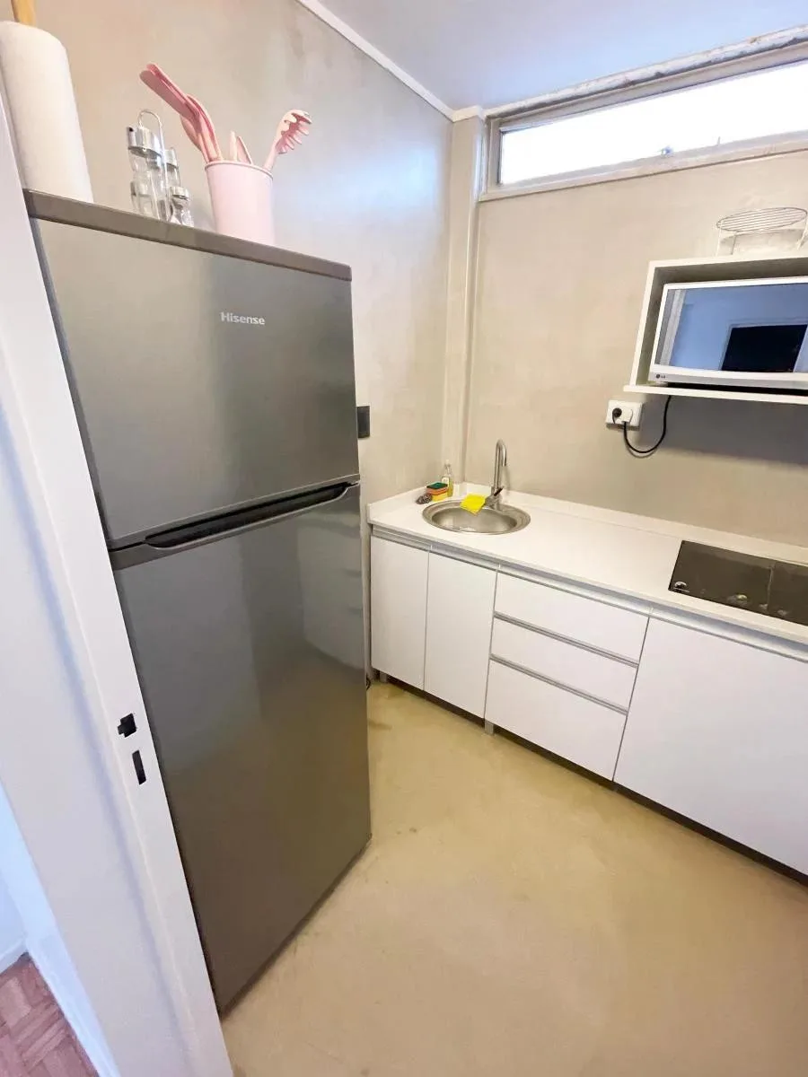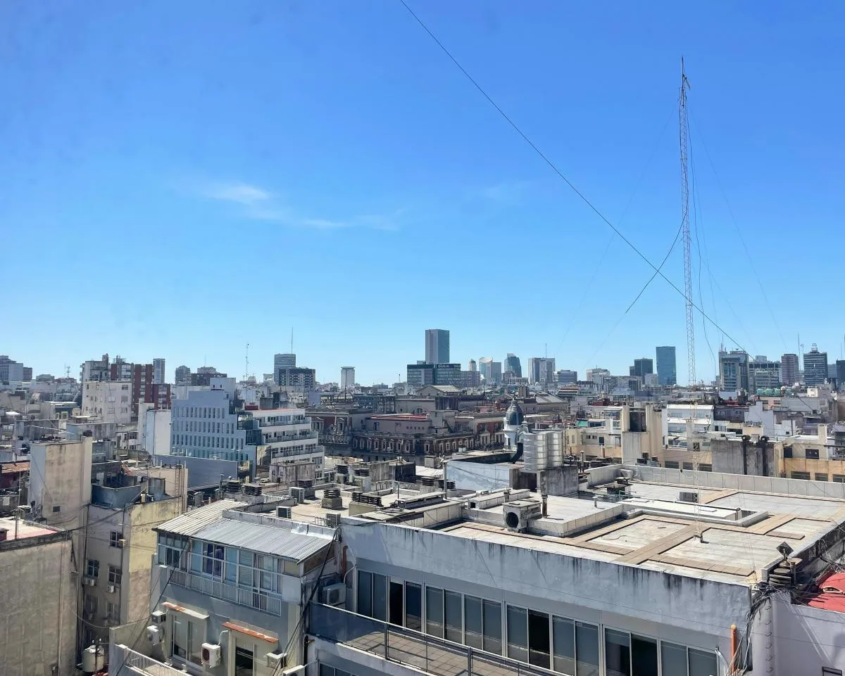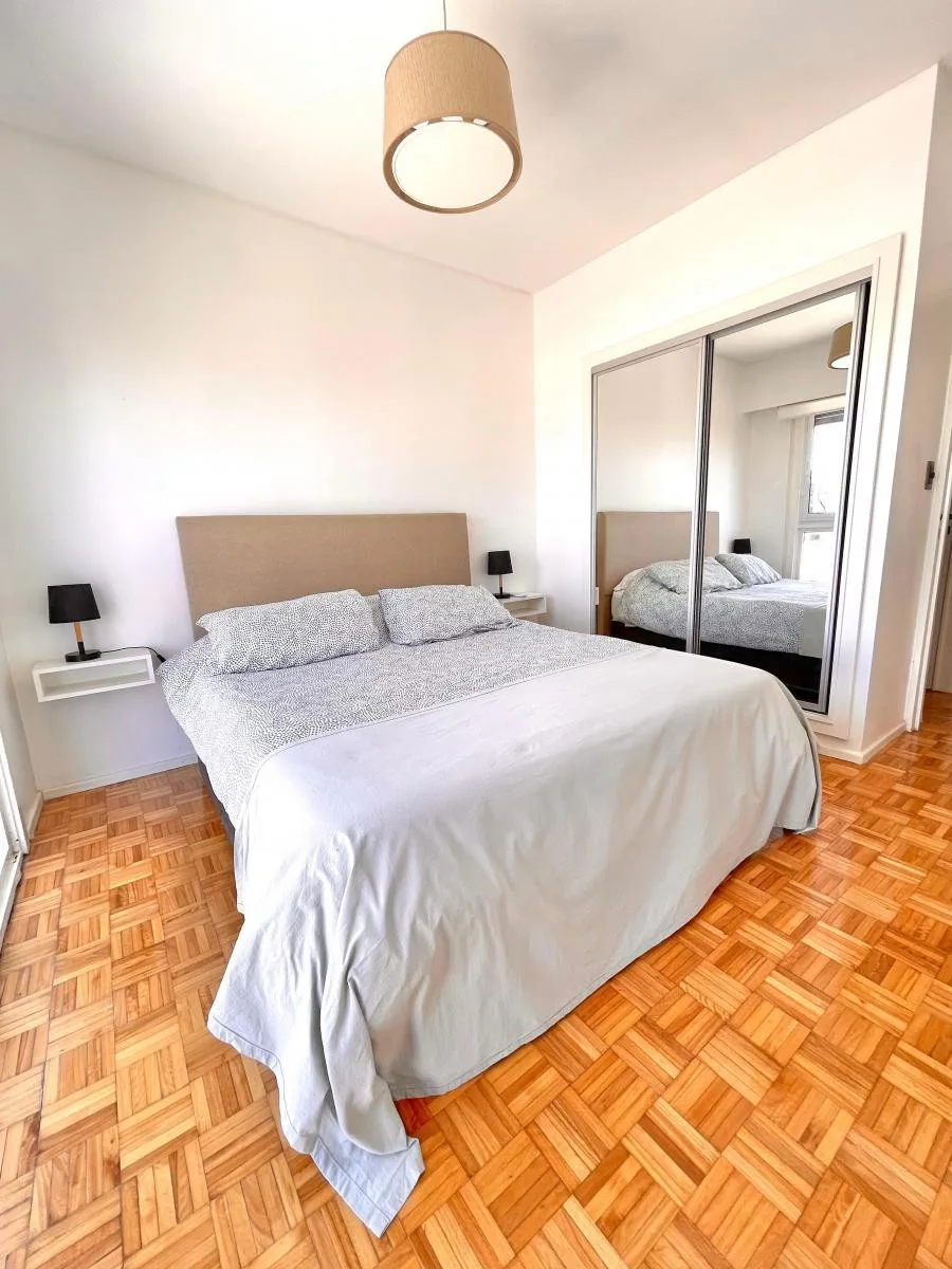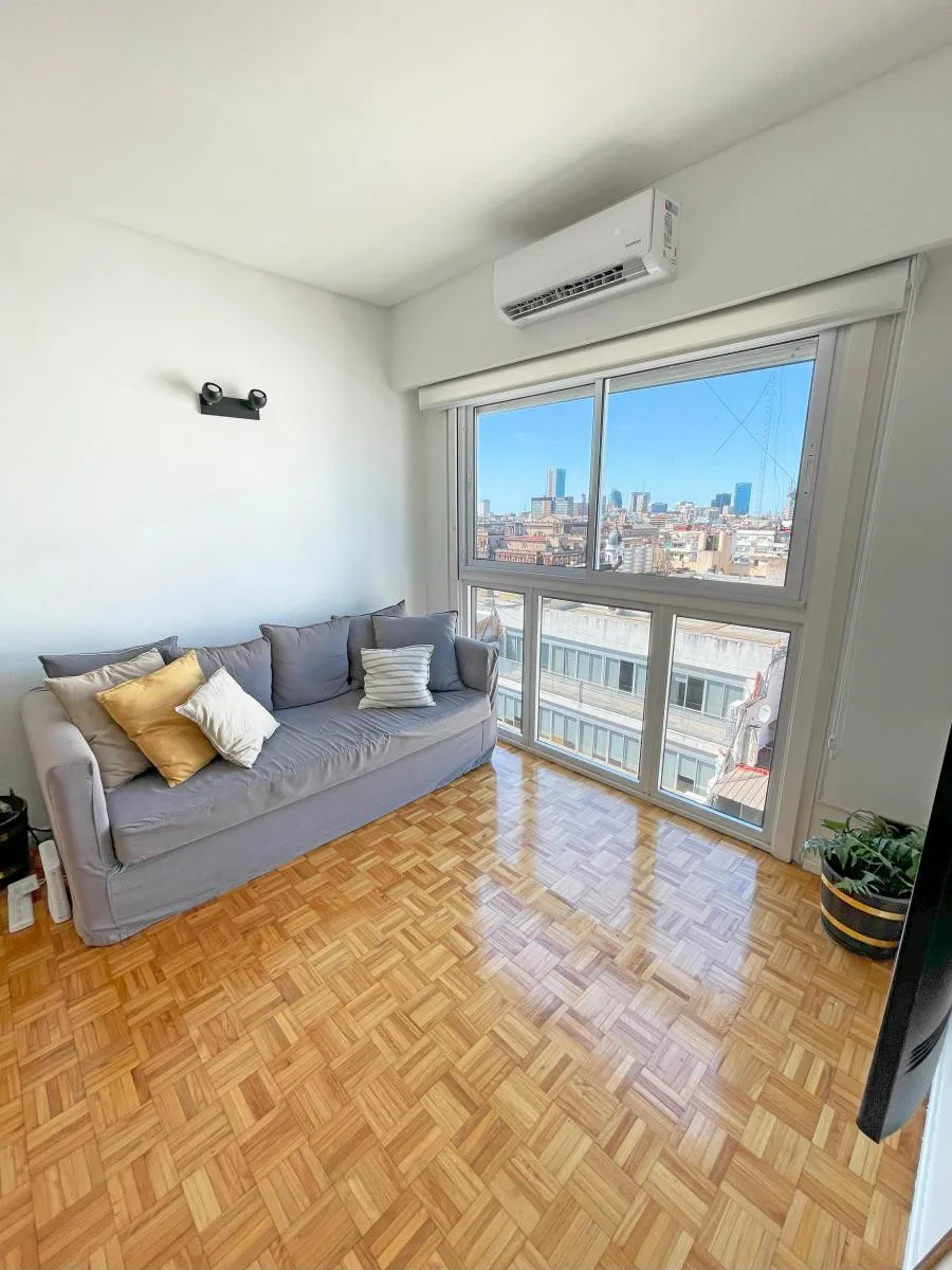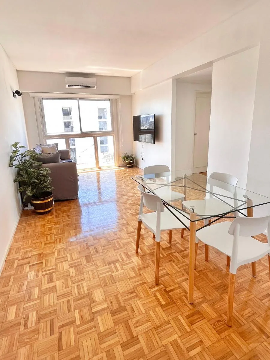 Three-room apartment in Microcentro (Paraná 400), fully remodelled. Two bedrooms, living-dining room, separate kitchen and a renovated bathroom. All rooms have air conditioning, and the building has 24-hour doorman services. Price is USD 1,200 plus building fees (expensas).