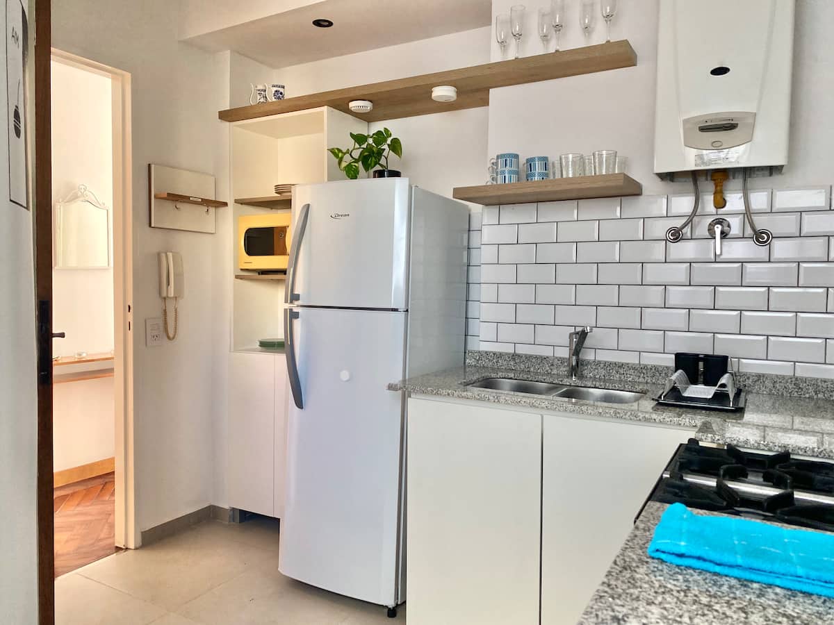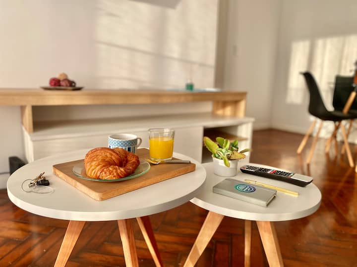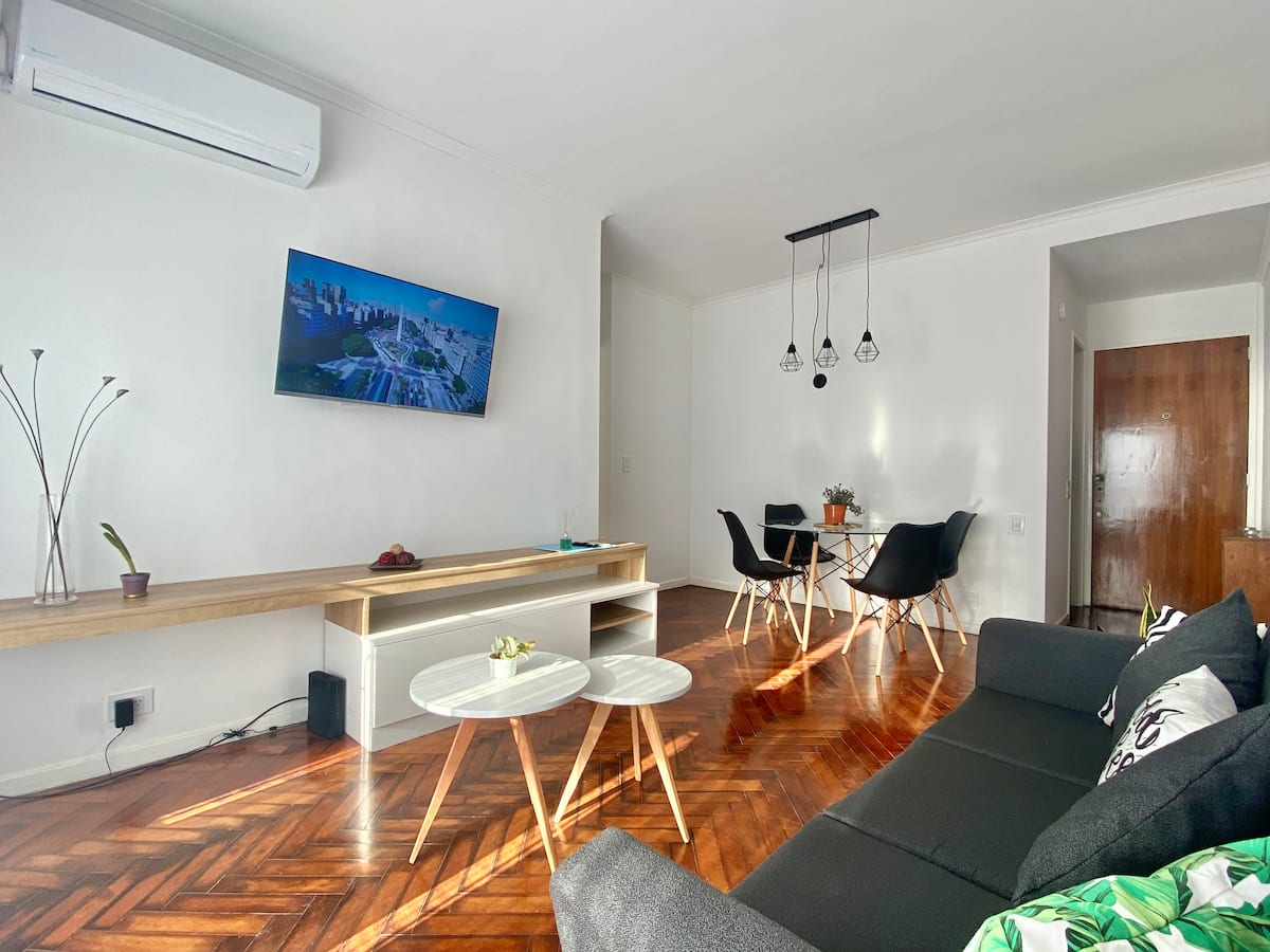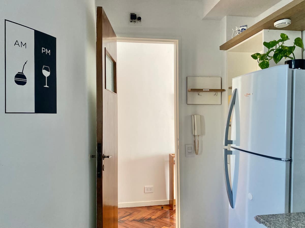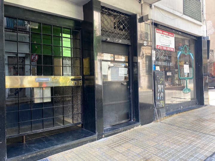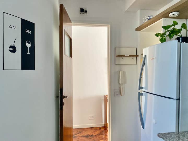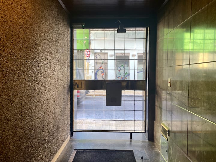 Two-bedroom apartment in San Telmo, furnished and equipped for stays. The kitchen and rooms are fully equipped, and complimentary supplies are provided during the stay. Guests have access to the building’s common areas shown in the photos.