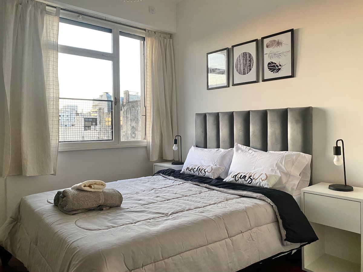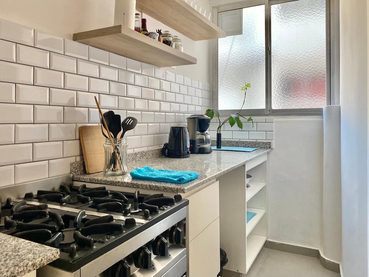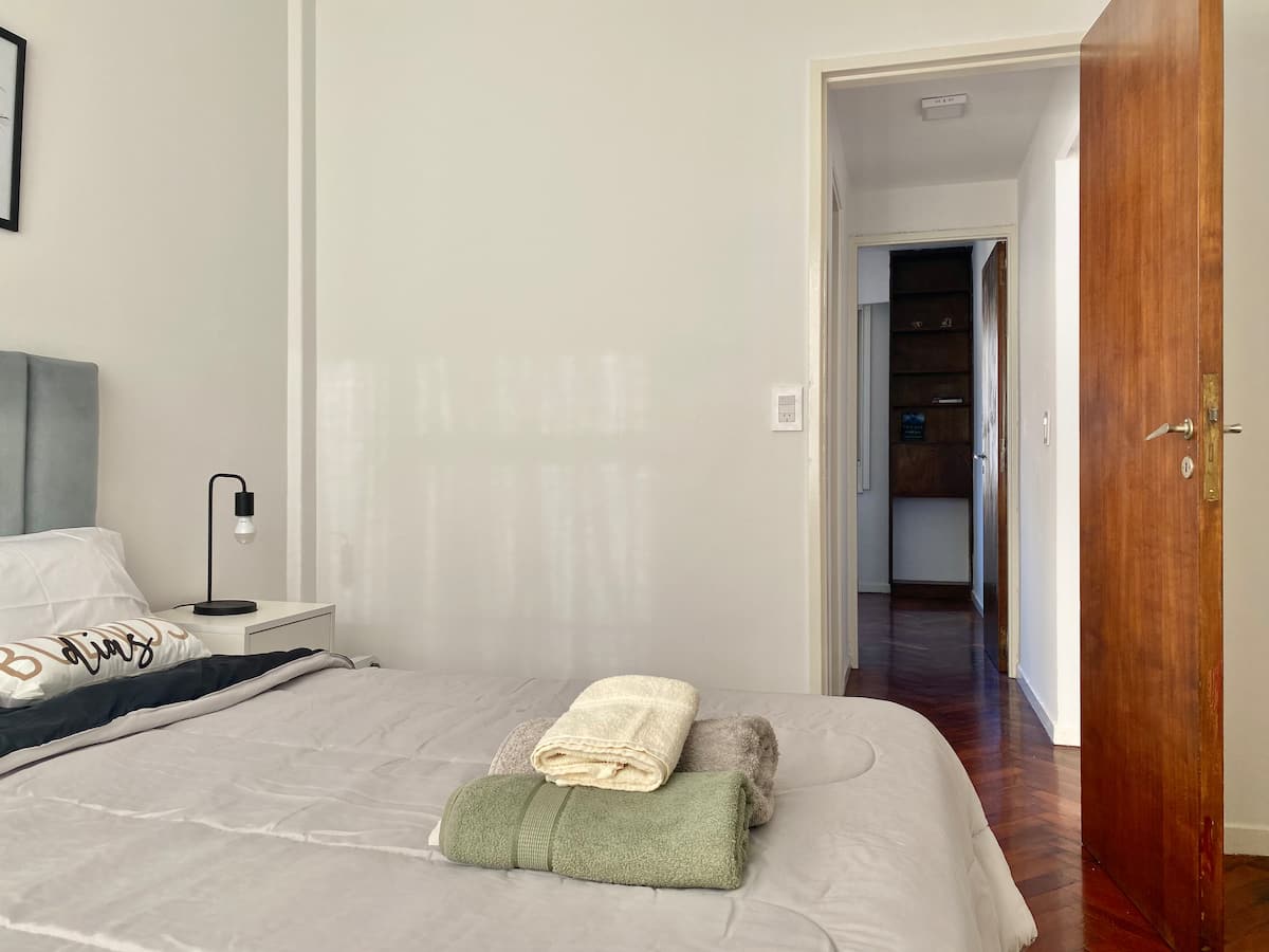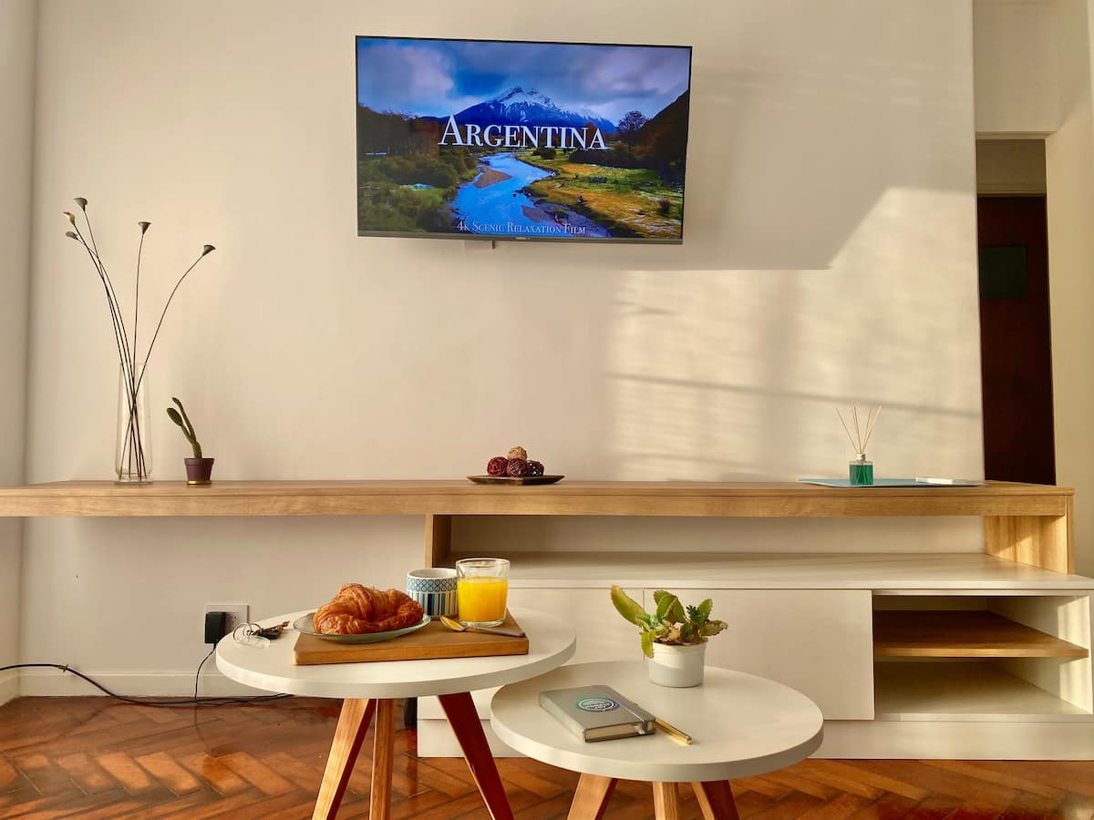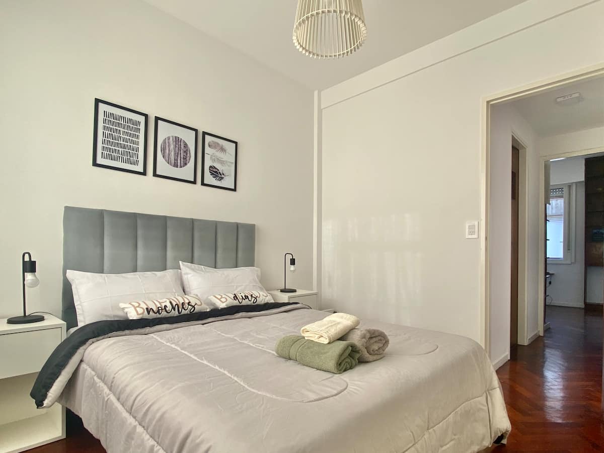 Two-bedroom apartment in San Telmo, furnished and equipped for stays. The kitchen and rooms are fully equipped, and complimentary supplies are provided during the stay. Guests have access to the building’s common areas shown in the photos.