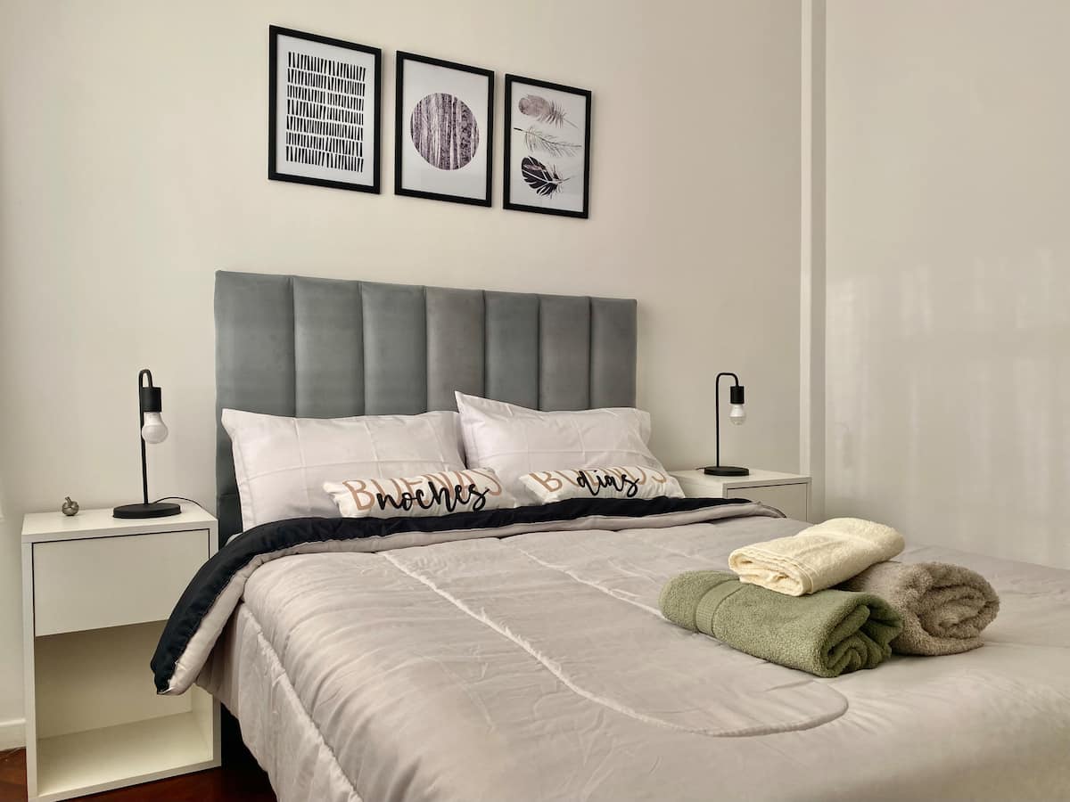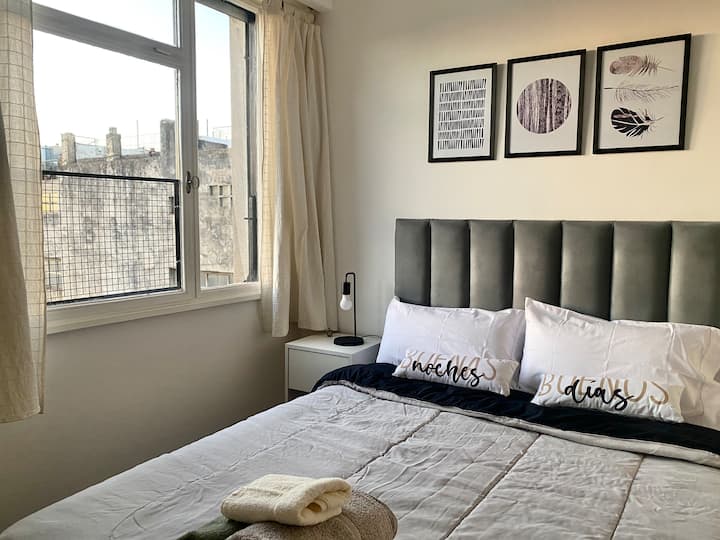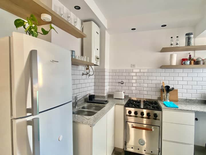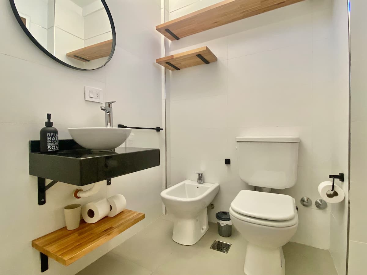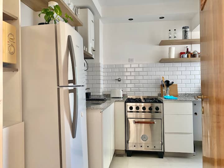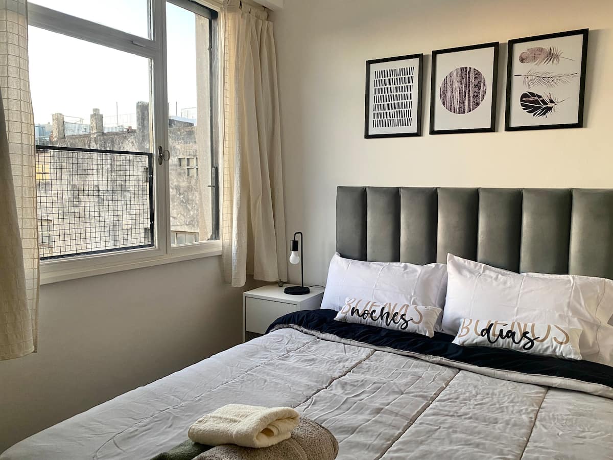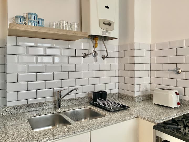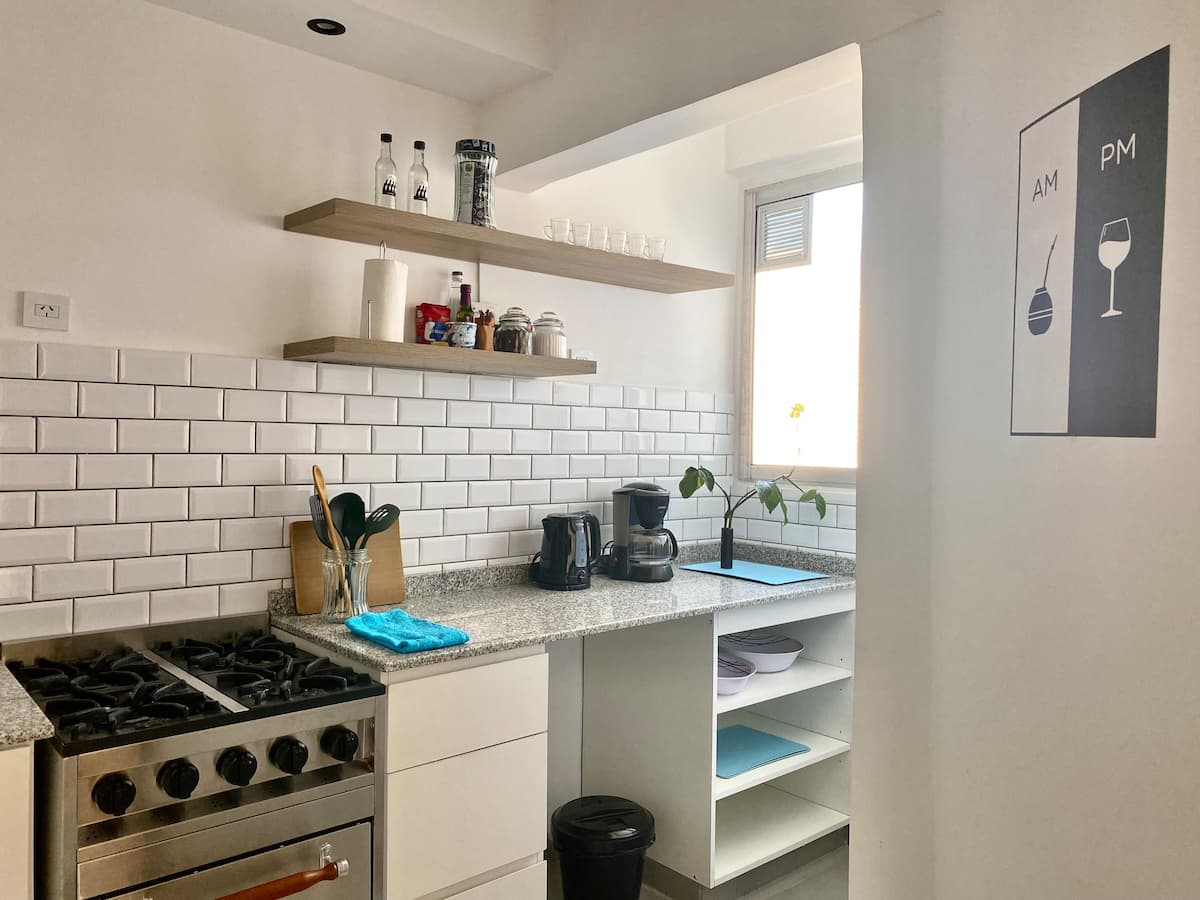 Two-bedroom apartment in San Telmo, furnished and equipped for stays. The kitchen and rooms are fully equipped, and complimentary supplies are provided during the stay. Guests have access to the building’s common areas shown in the photos.