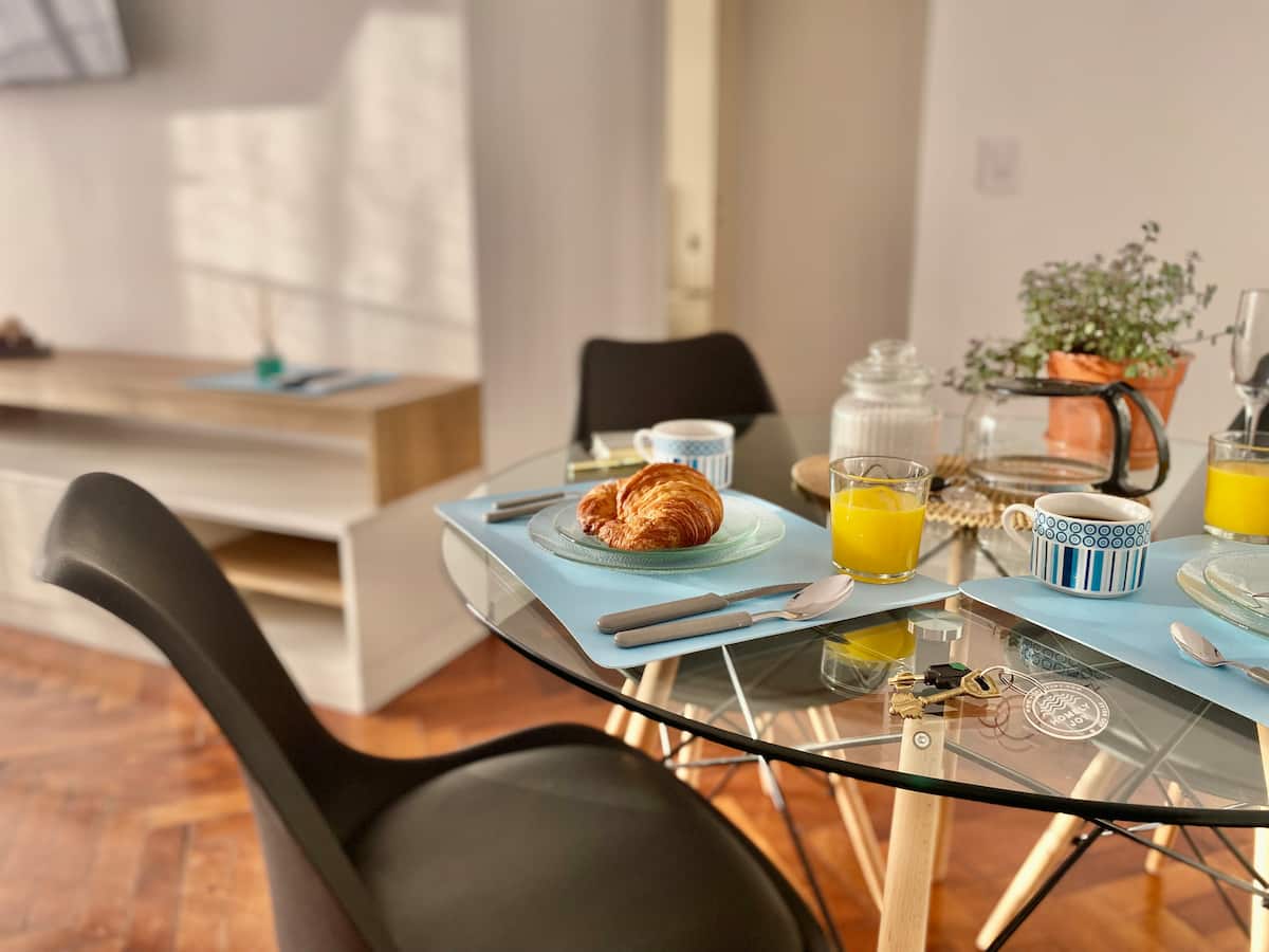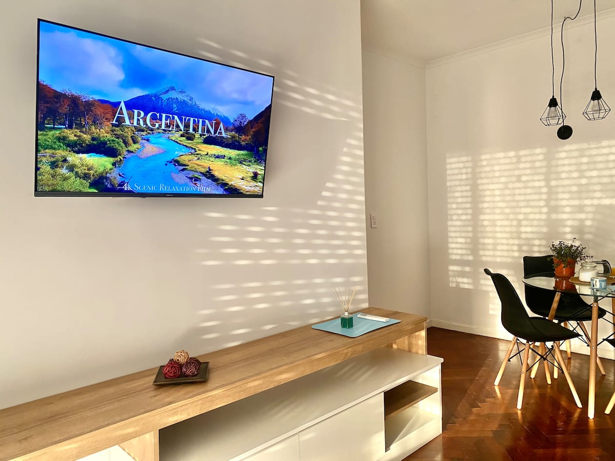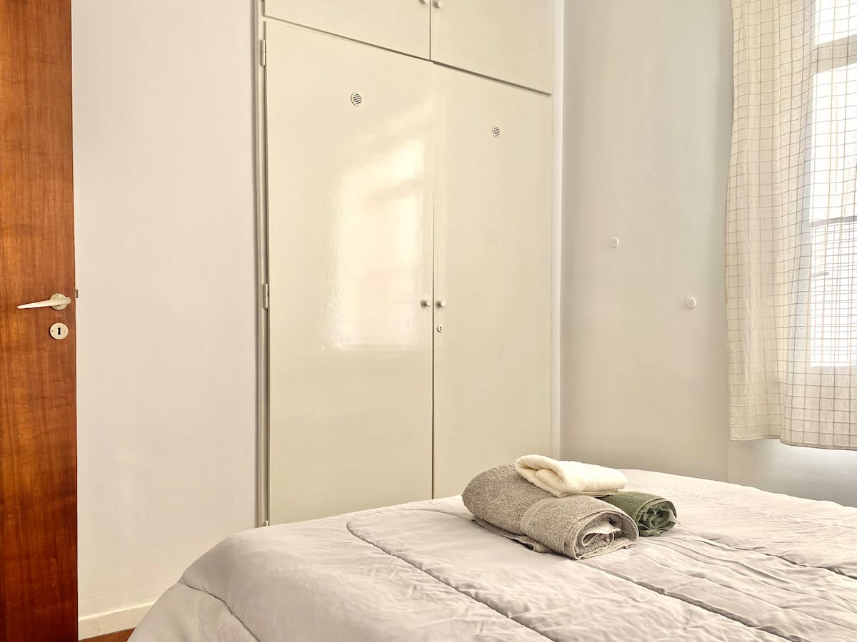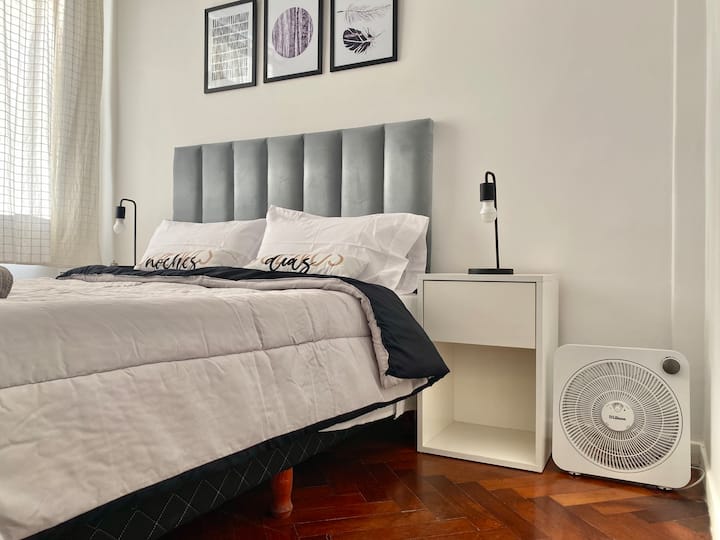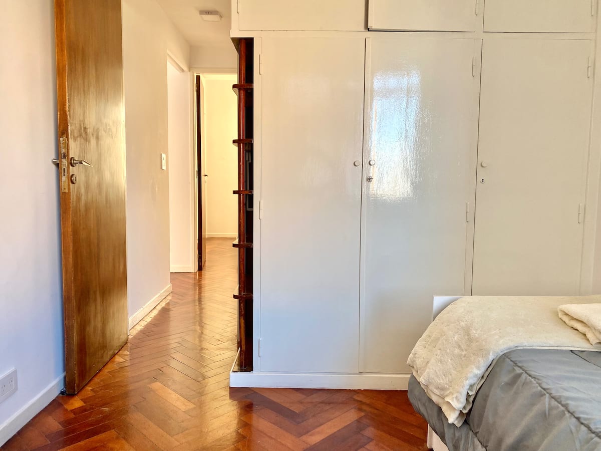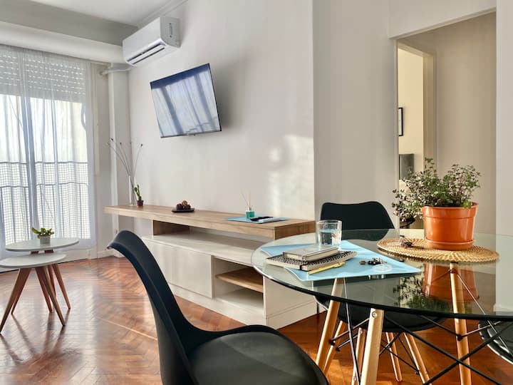 Two-bedroom apartment in San Telmo, furnished and equipped for stays. The kitchen and rooms are fully equipped, and complimentary supplies are provided during the stay. Guests have access to the building’s common areas shown in the photos.