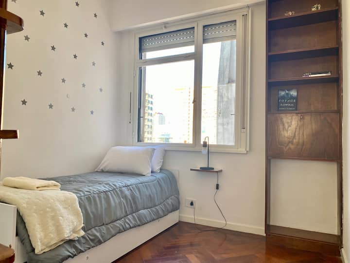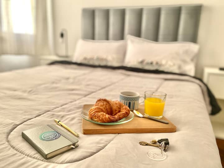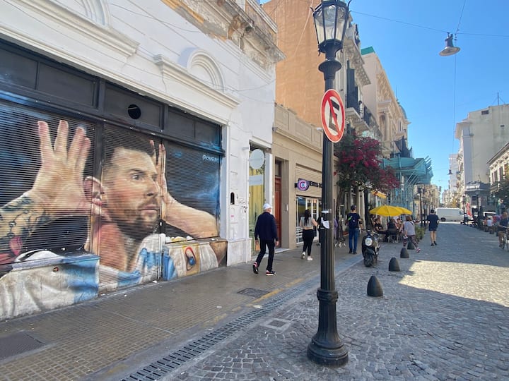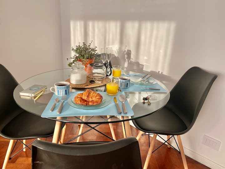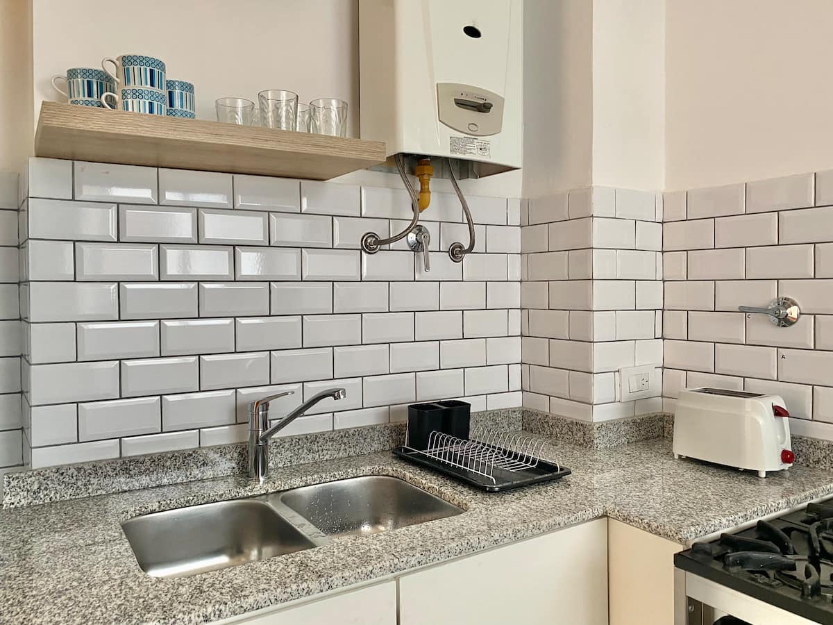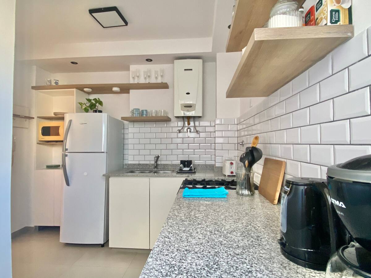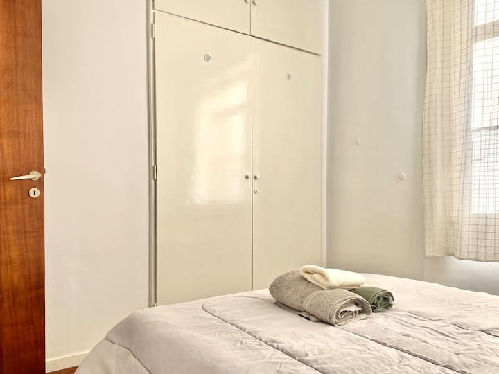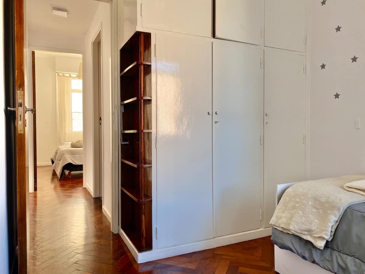 Two-bedroom apartment in San Telmo, furnished and equipped for stays. The kitchen and rooms are fully equipped, and complimentary supplies are provided during the stay. Guests have access to the building’s common areas shown in the photos.
