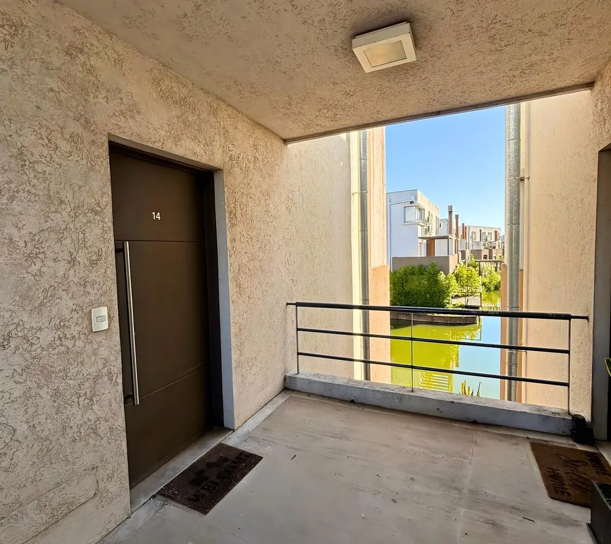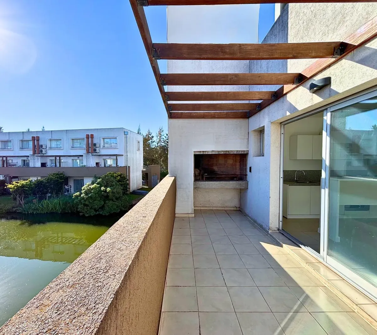 Duplex two-room apartment for rent in Lagos de Sendero, Nordelta, Tigre. It has 2 bedrooms, 2 bathrooms including a full bathroom on the upper level, and a street-facing open-plan living and dining area with a balcony with grill overlooking the lagoon. The integrated kitchen includes a breakfast bar and both upper and lower cabinets, with a laundry area; air-conditioning is installed in all rooms. The complex has a pool, solarium and changing rooms, a children’s play area, 2 tennis courts, a foo