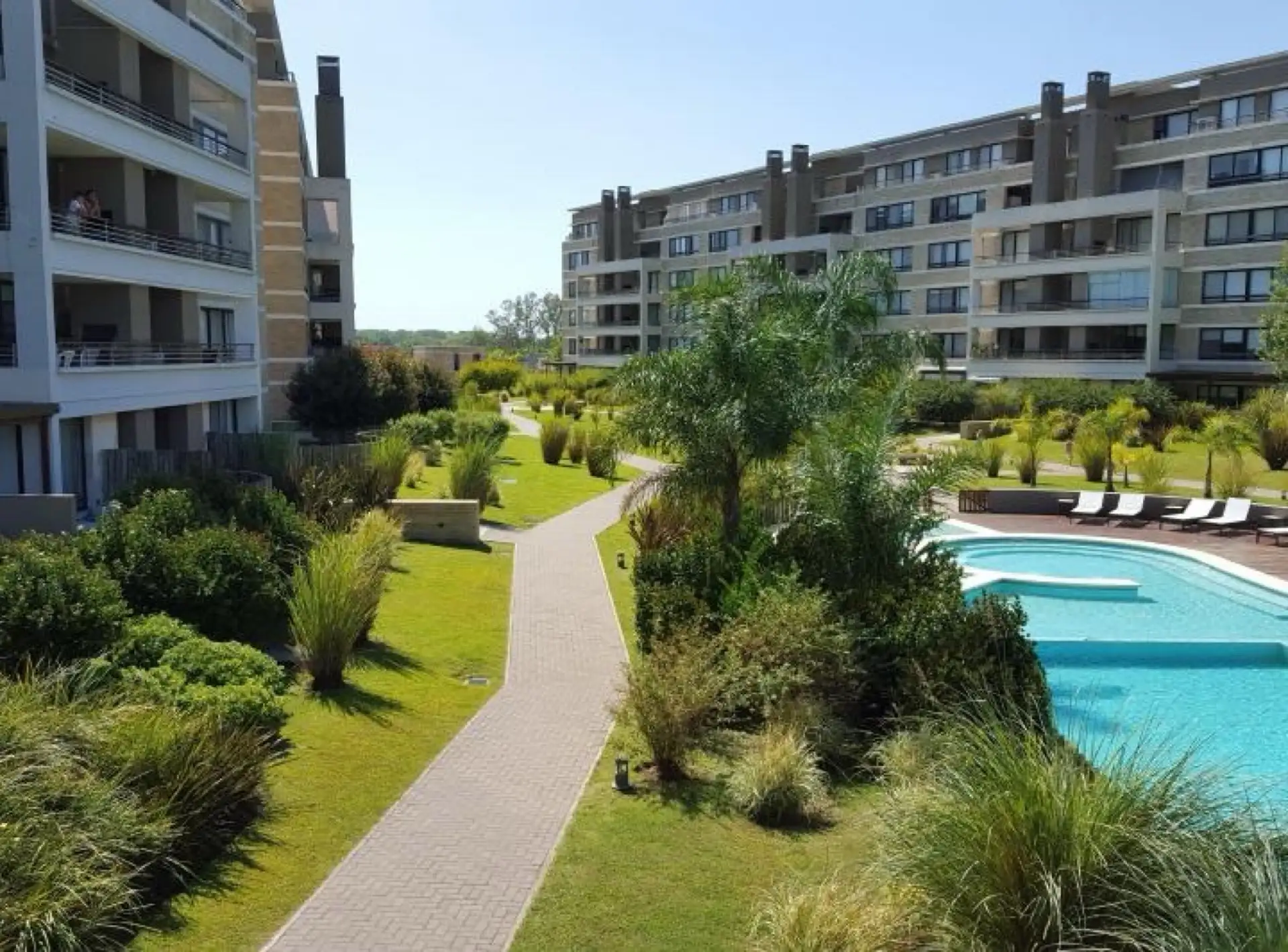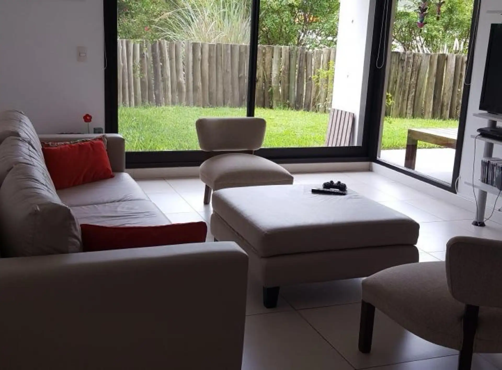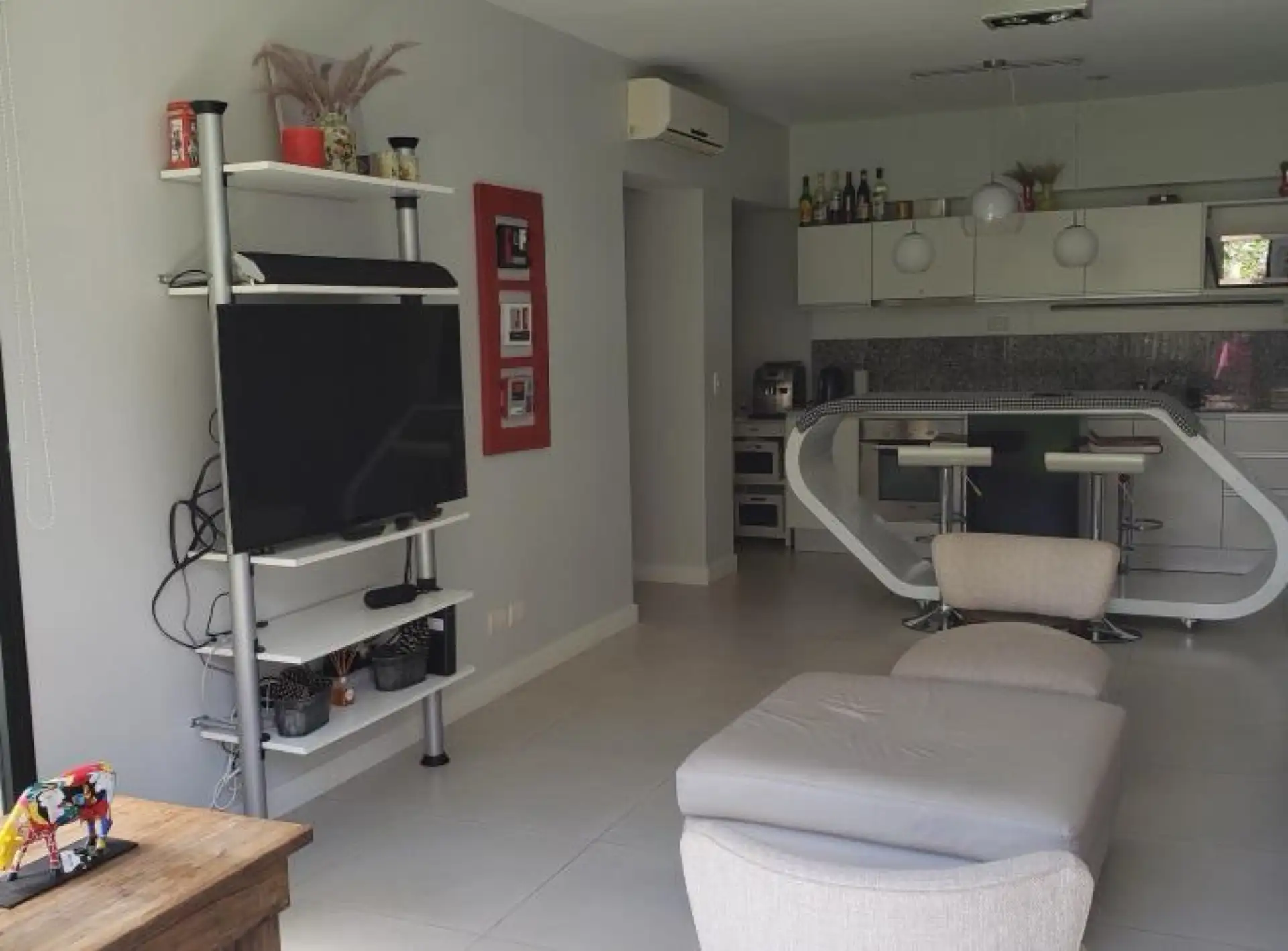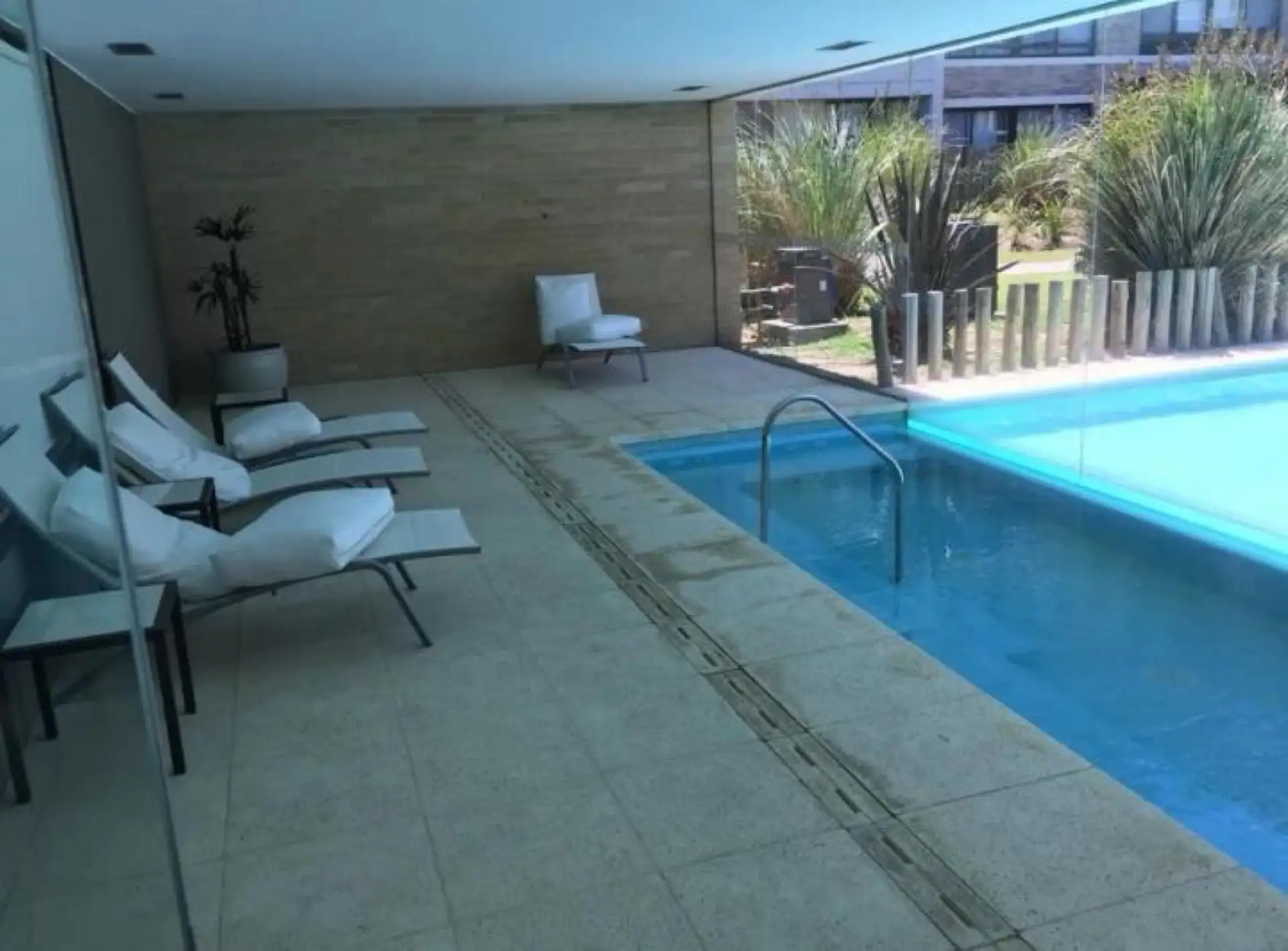 Ground-floor apartment with private garden in Quartier Nordelta, Tigre. Three rooms, furnished and fully equipped, with two bedrooms and two full bathrooms, the main bedroom with an en-suite bathroom. Living area with integrated kitchen and breakfast bar, air conditioning (heating and cooling) in all rooms, and an electric grill in the garden. The building includes 24-hour security, pool, sauna, communal room (SUM), BBQ area (quincho) with grill, gym, changing rooms, reading room and TV room, ch