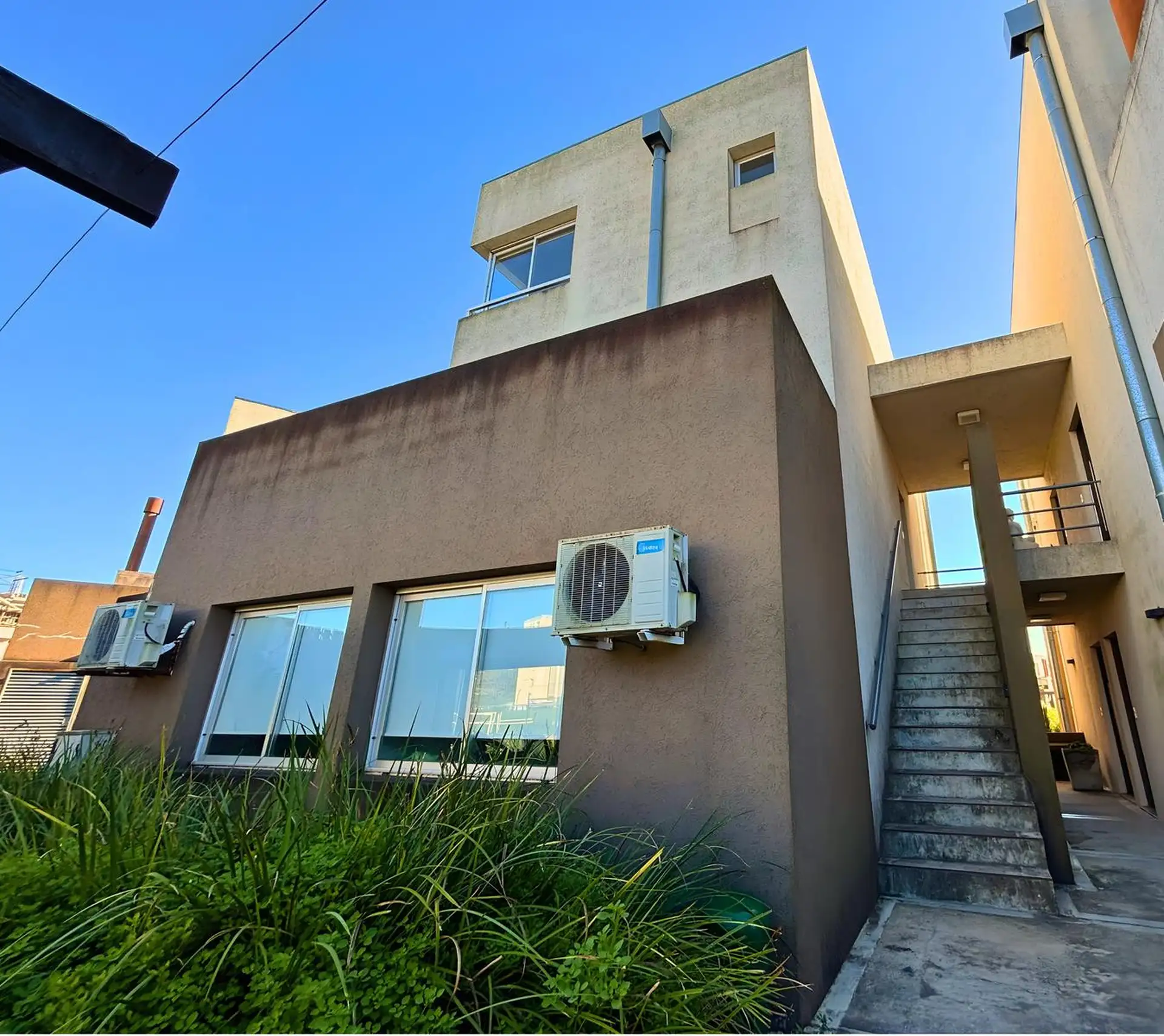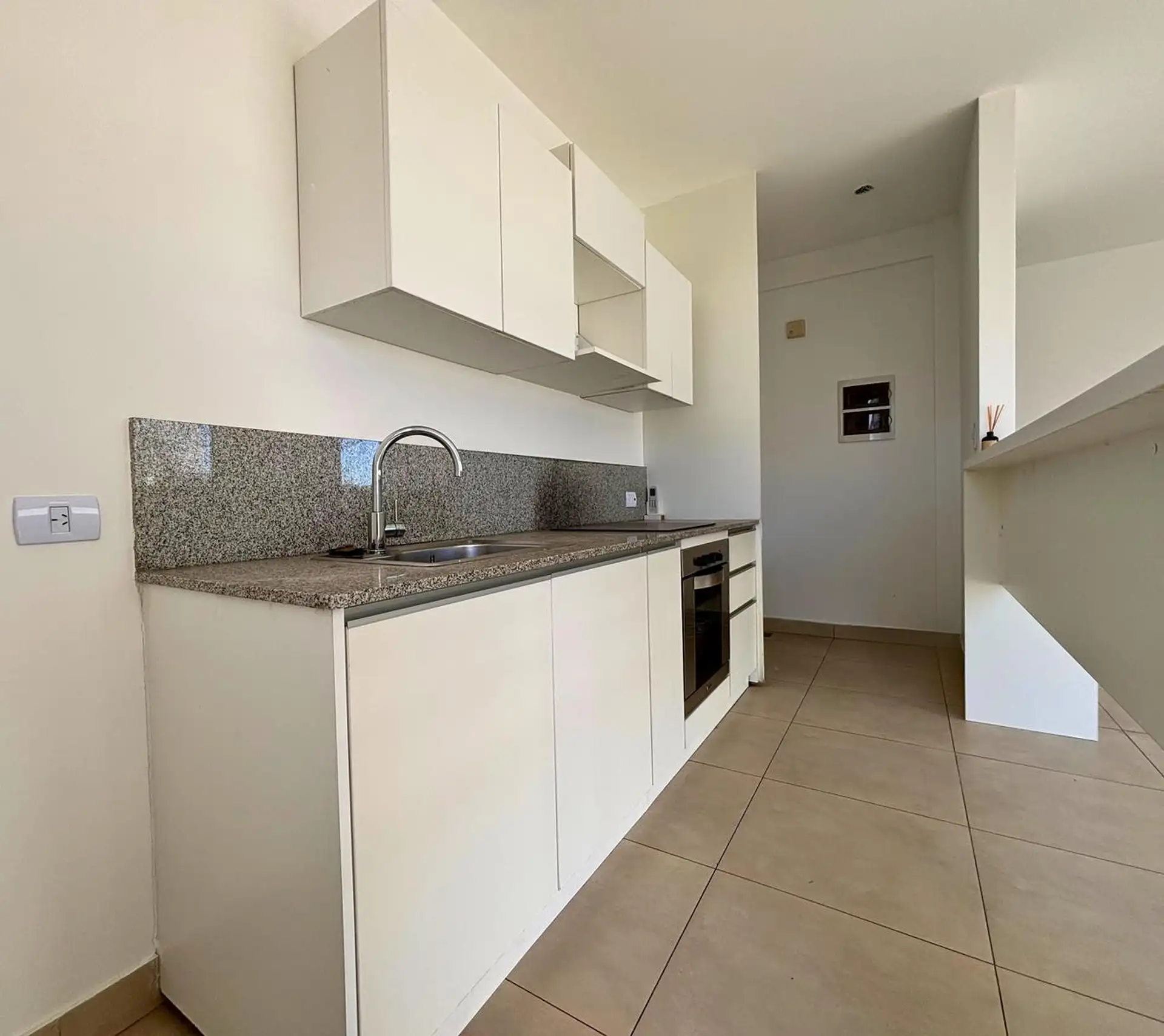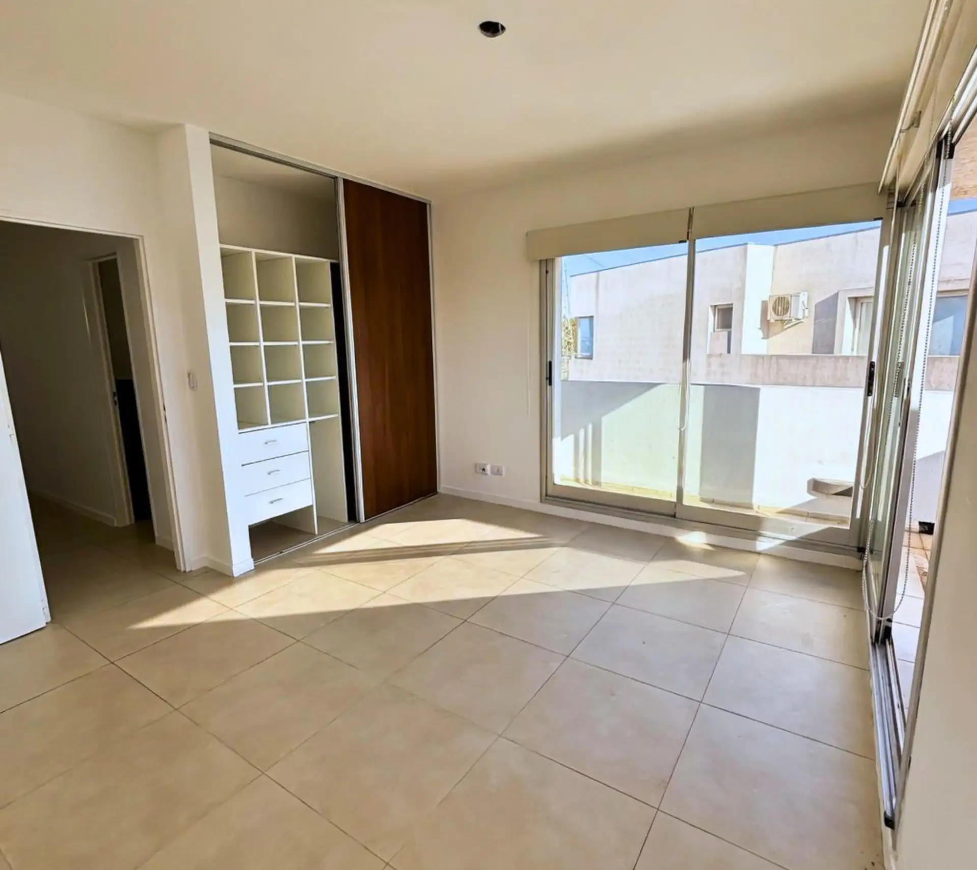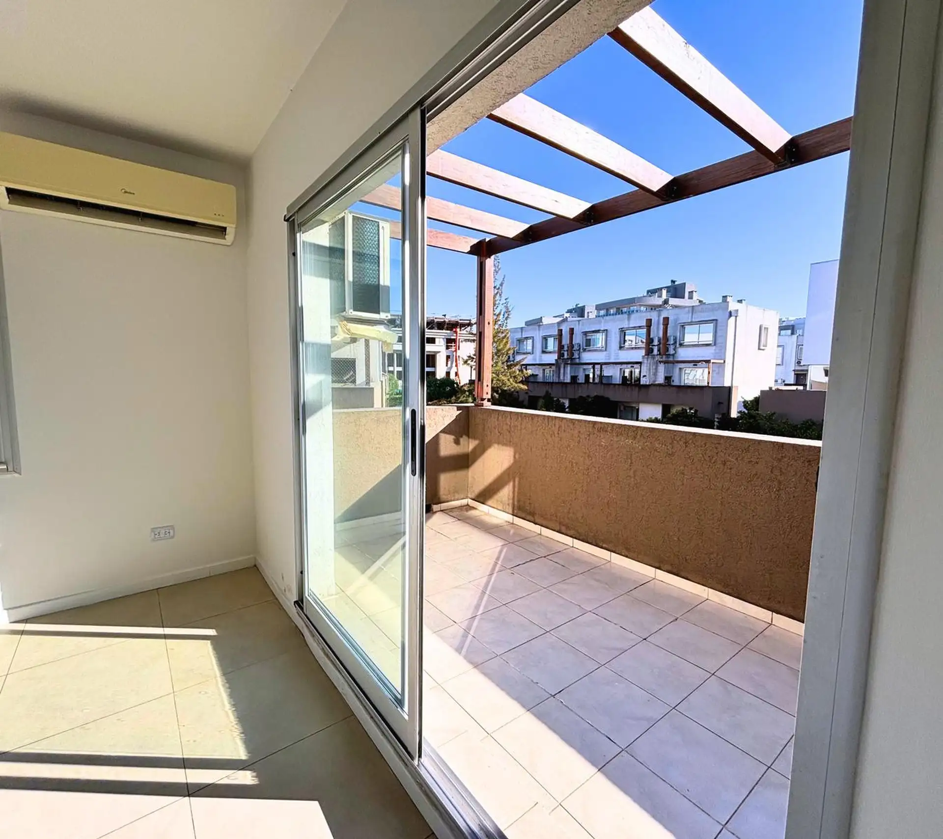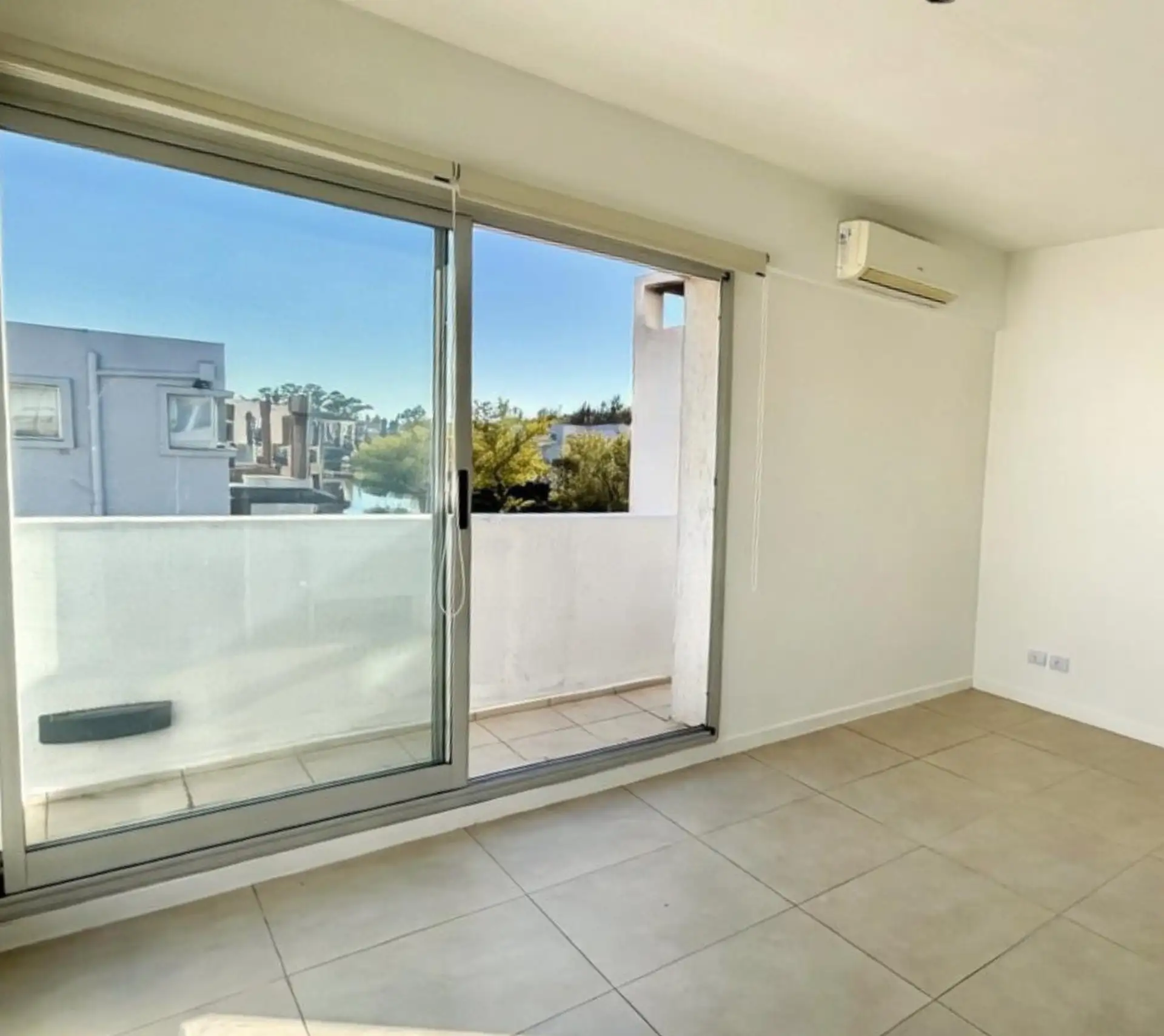 Two-room (studio) duplex apartment for rent in Nordelta, Tigre. It includes an (assigned) parking space and has a lagoon-facing view; the unit has integrated kitchen and a covered, terrace-style balcony with a grill. Air conditioning is installed in all rooms. Layout is split between two levels: on the ground floor there is an entry hall, a guest toilet, open-plan living and dining area with built-in reception storage and access to the balcony, and a separate laundry area; on the upper level the