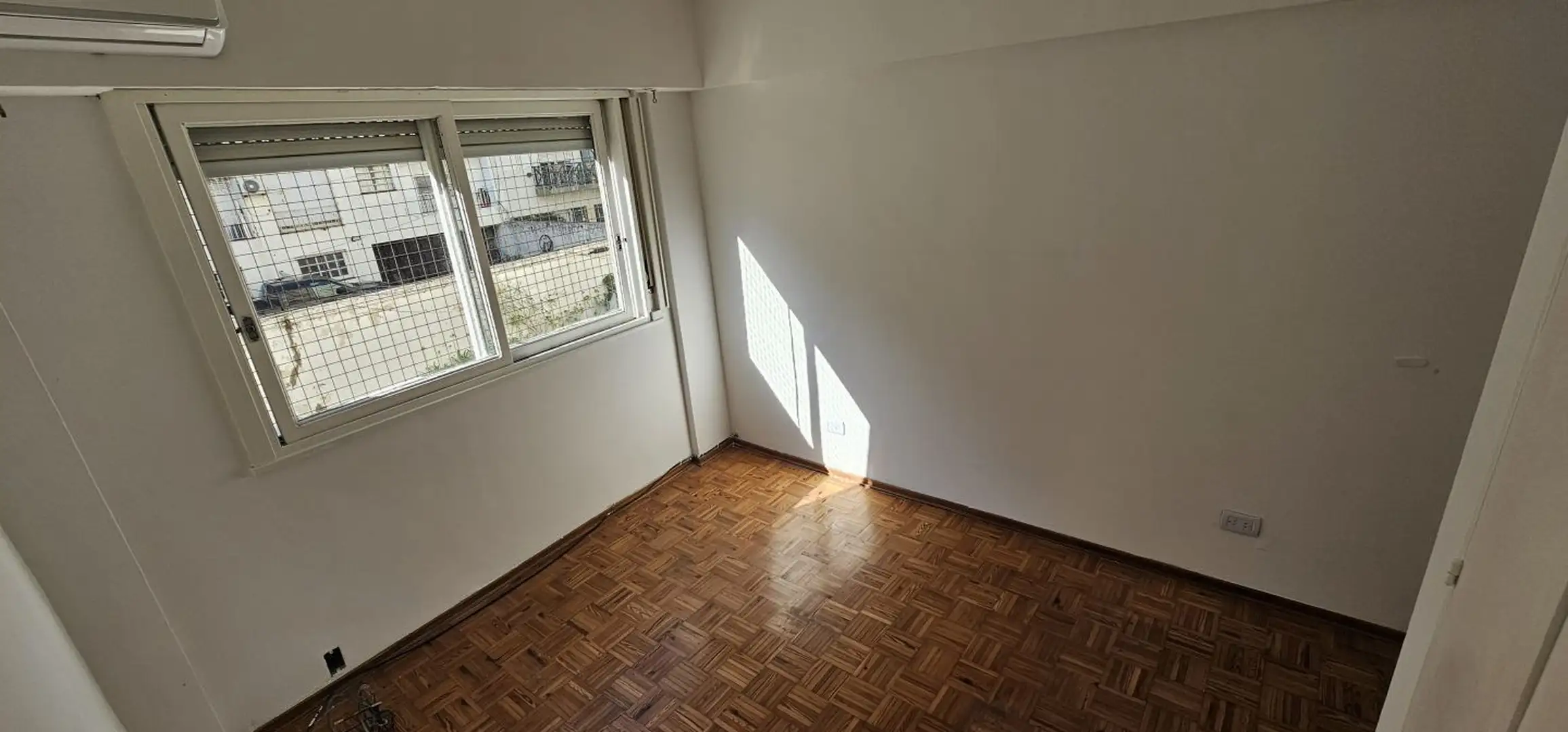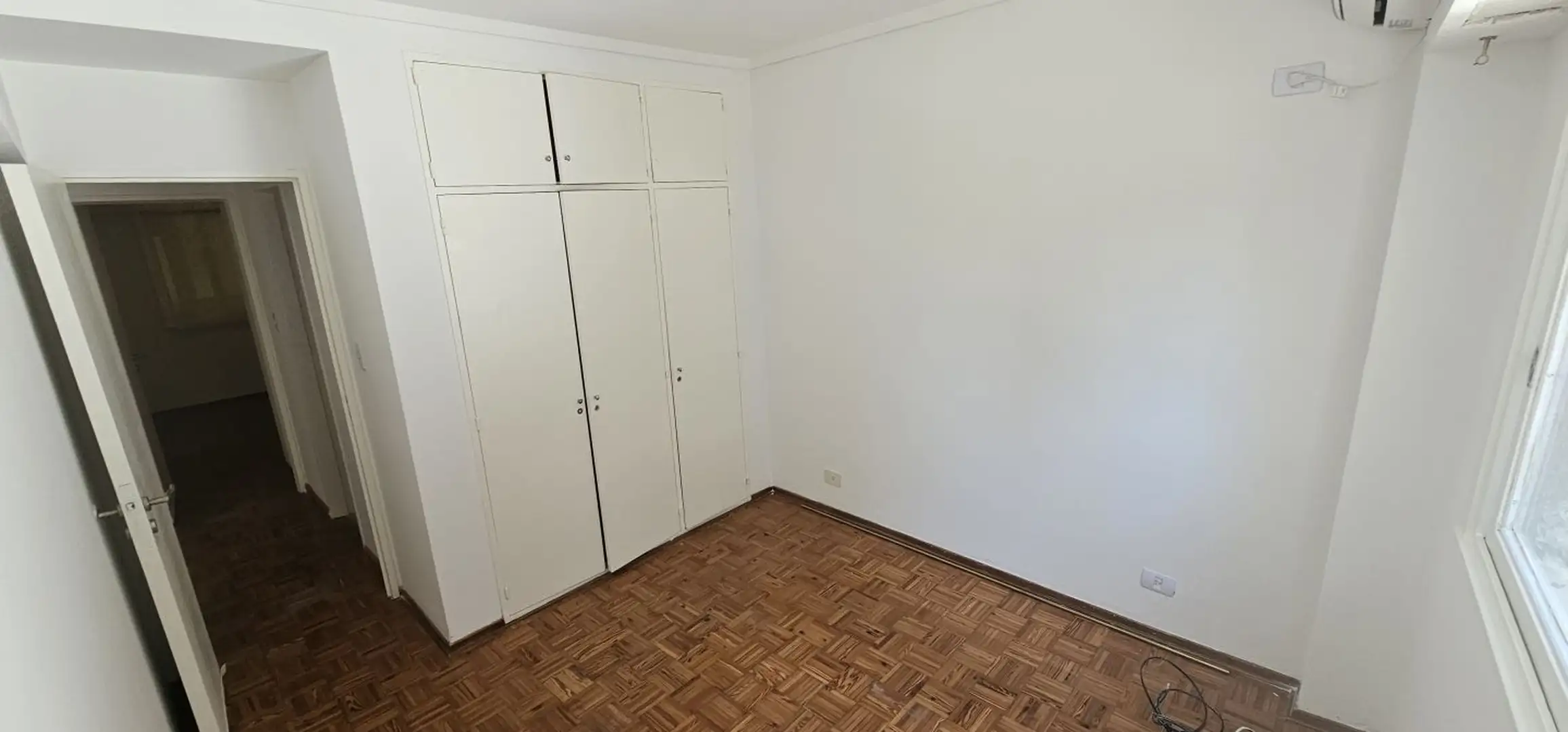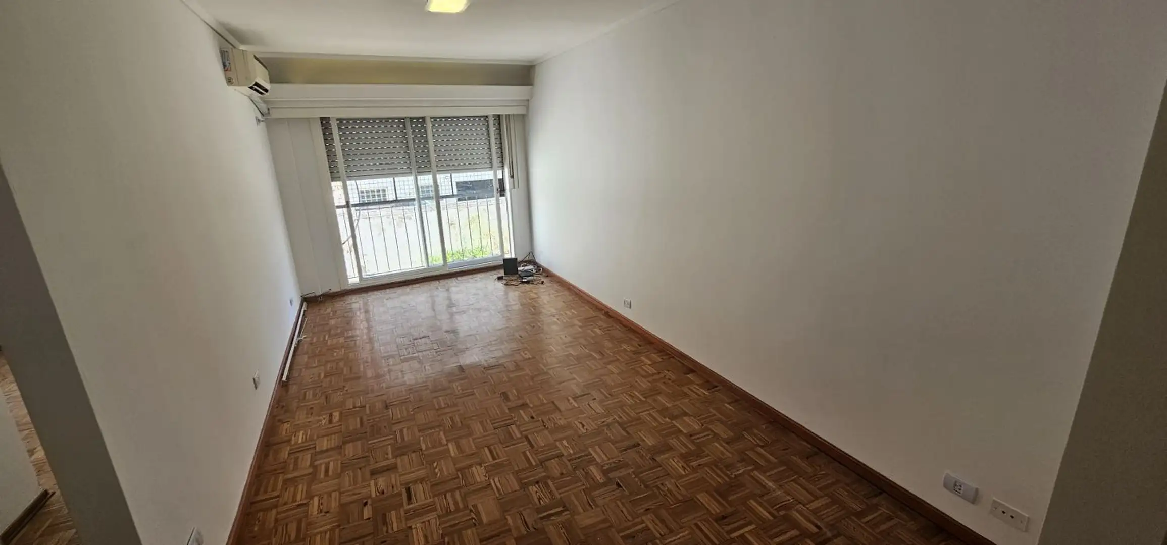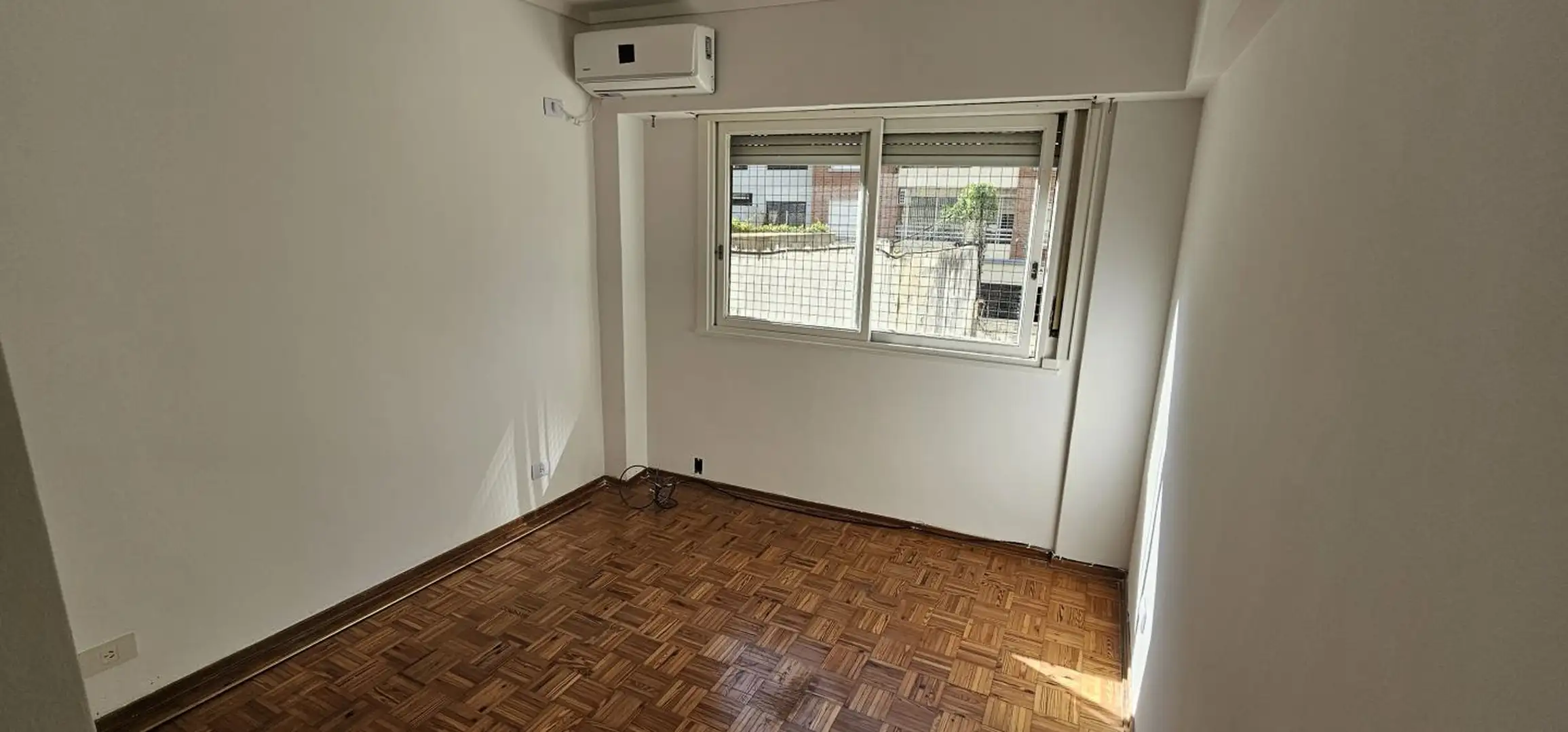 Three-room apartment on the 1st floor in Olivos, Vicente López, courtyard-facing (contrafrente) and north-facing. The unit has a living-dining area with 6 x 3 m wooden floors and a French balcony, plus split air conditioning. There is a separate, fully equipped eat-in kitchen (3.75 x 2.70 m) with an independent laundry (2.50 x 1.50 m), a full bathroom (1.85 x 1.80 m) with a bathtub, a north-oriented main bedroom (3.00 x 2.85 m) with wooden floors, a closet and split air conditioning, and a secon