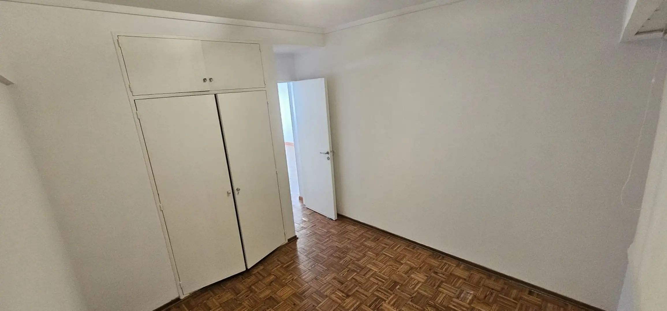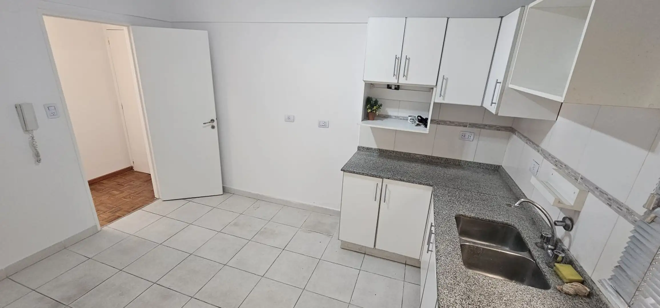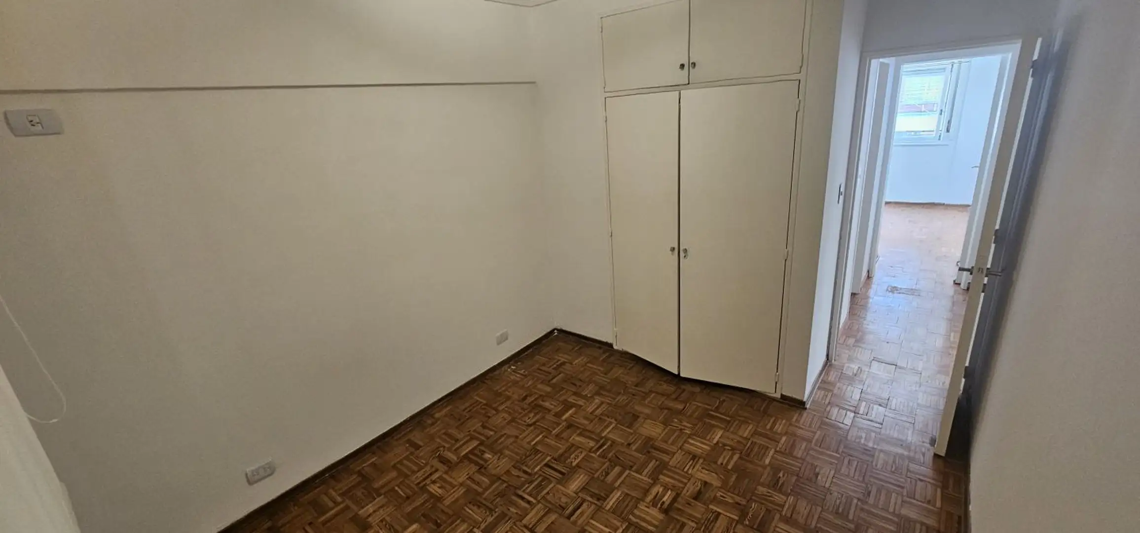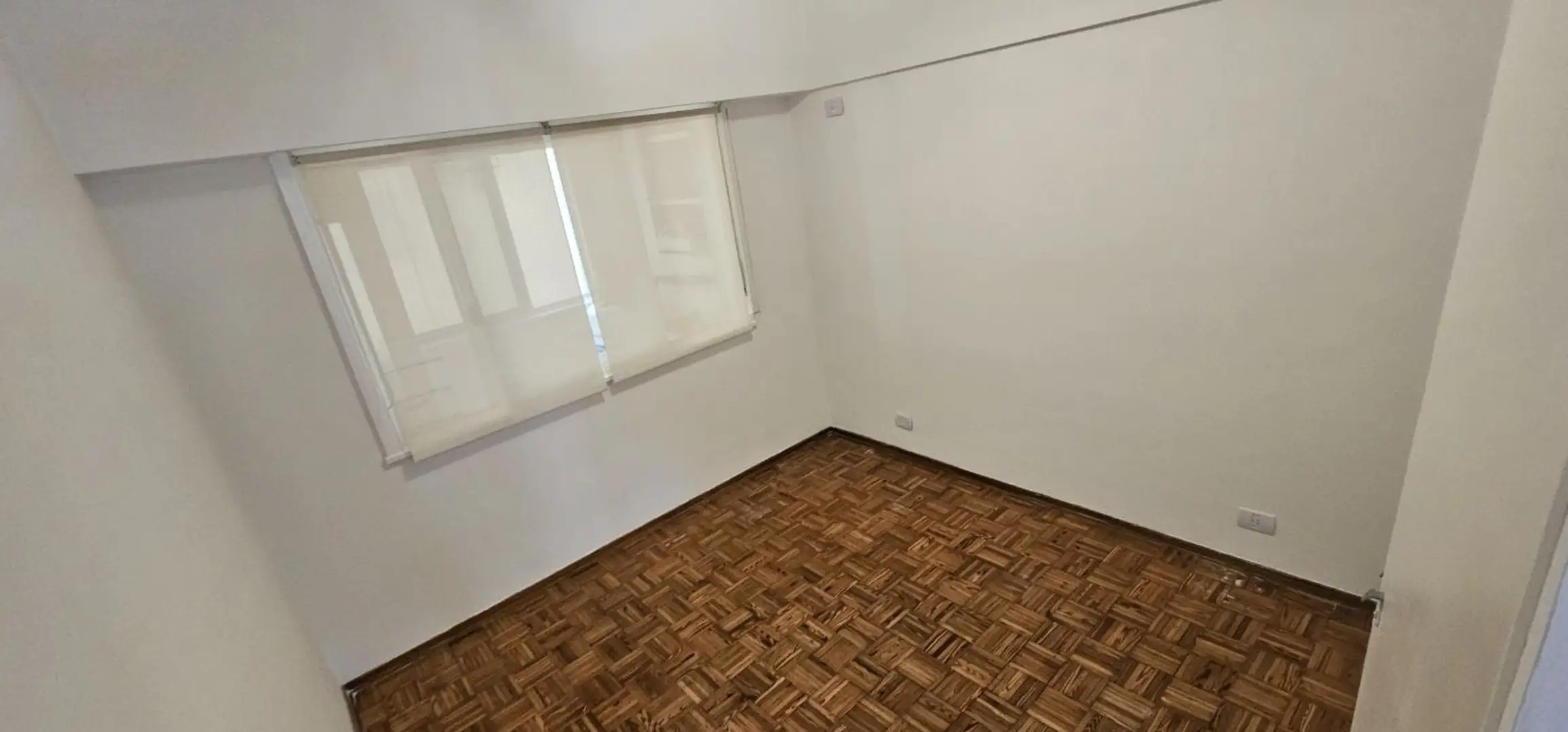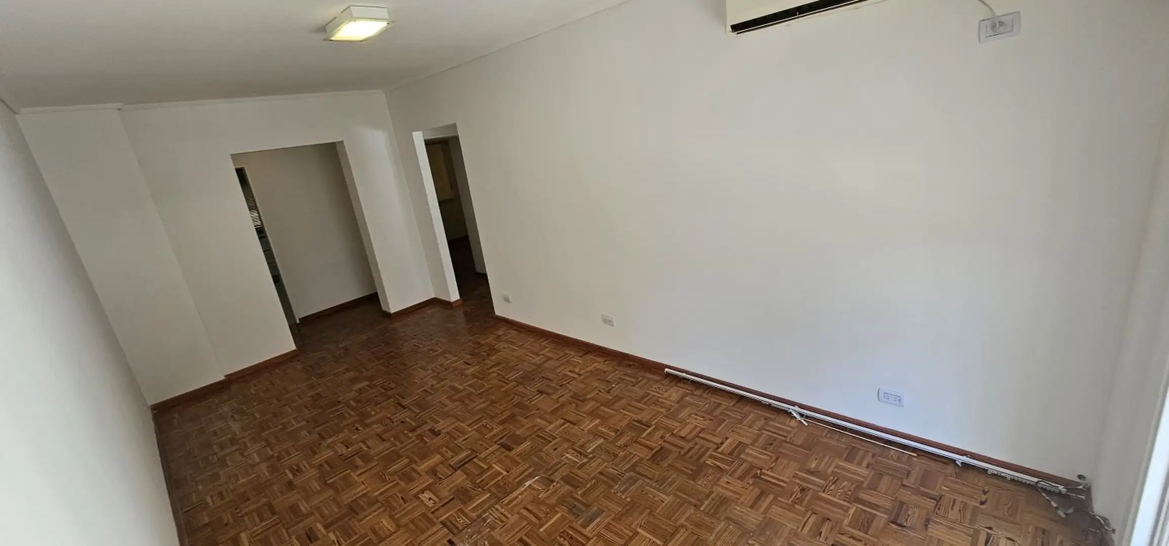 Three-room apartment on the 1st floor in Olivos, Vicente López, courtyard-facing (contrafrente) and north-facing. The unit has a living-dining area with 6 x 3 m wooden floors and a French balcony, plus split air conditioning. There is a separate, fully equipped eat-in kitchen (3.75 x 2.70 m) with an independent laundry (2.50 x 1.50 m), a full bathroom (1.85 x 1.80 m) with a bathtub, a north-oriented main bedroom (3.00 x 2.85 m) with wooden floors, a closet and split air conditioning, and a secon