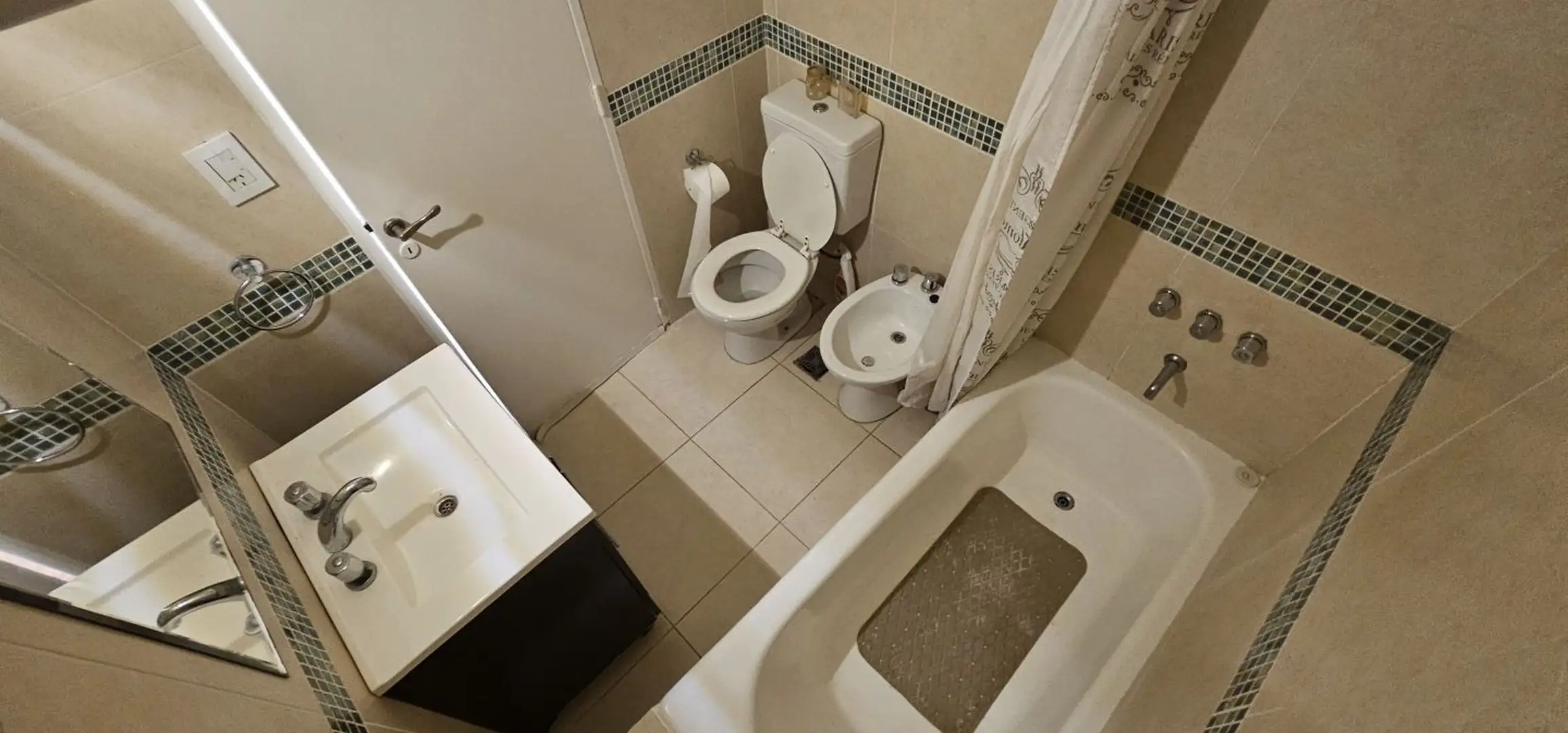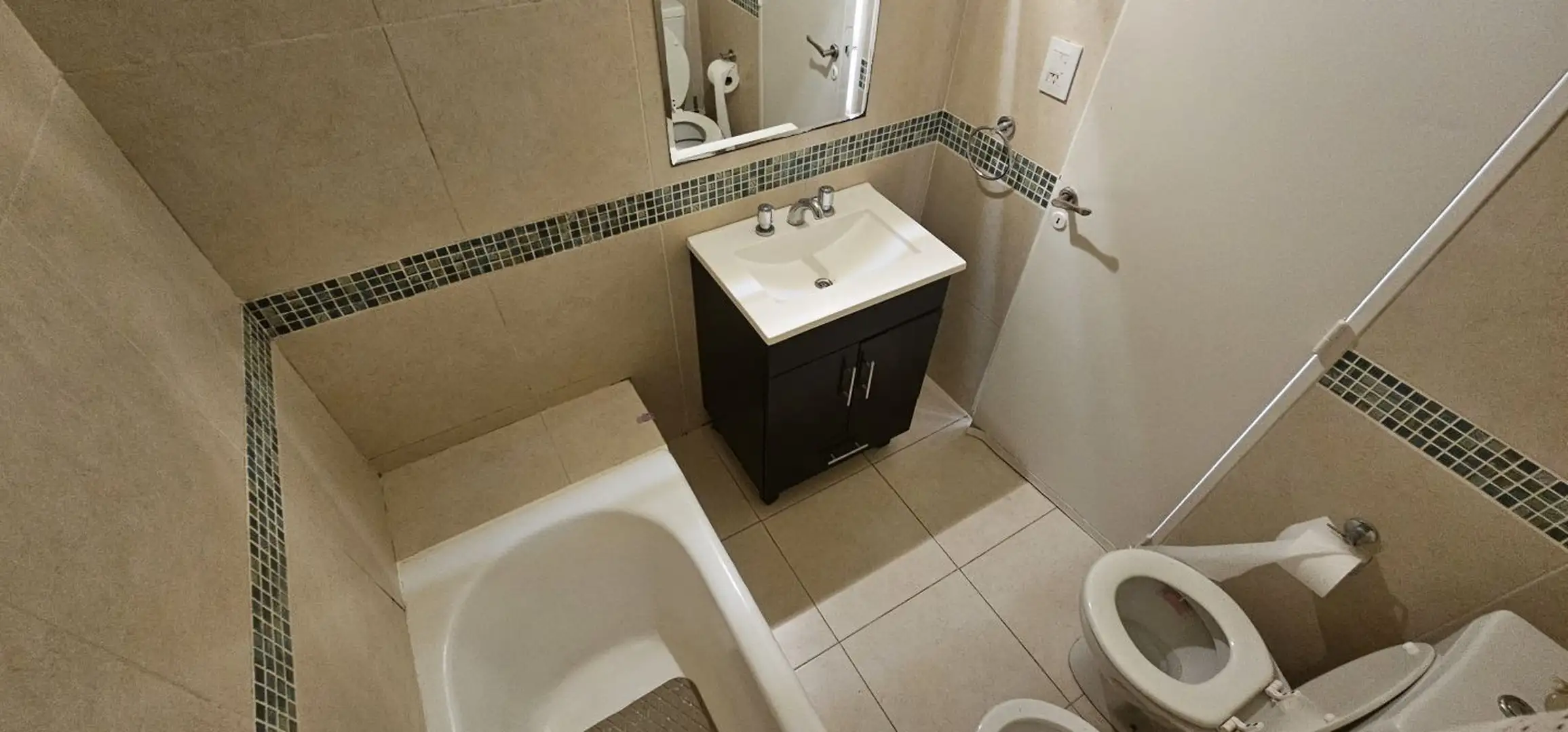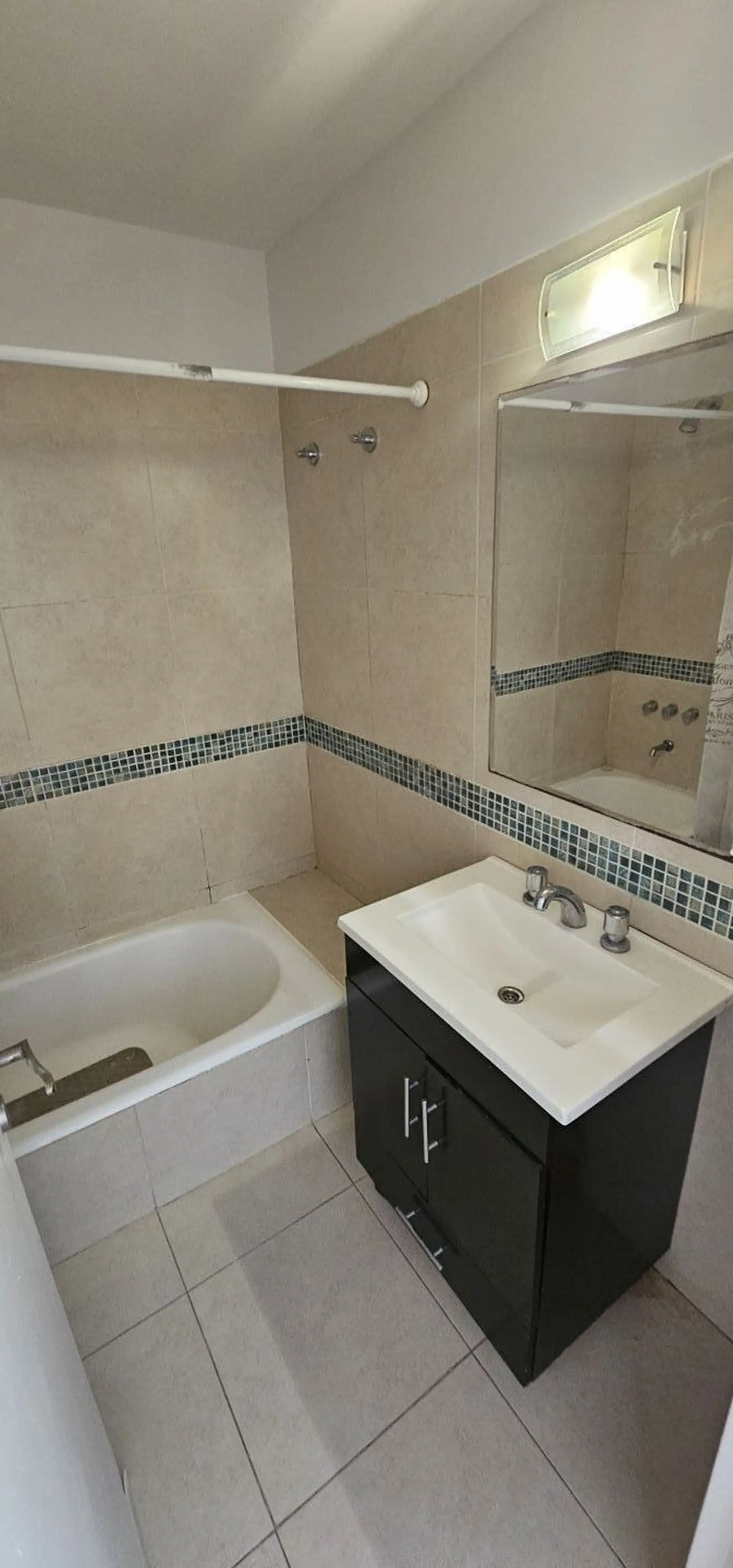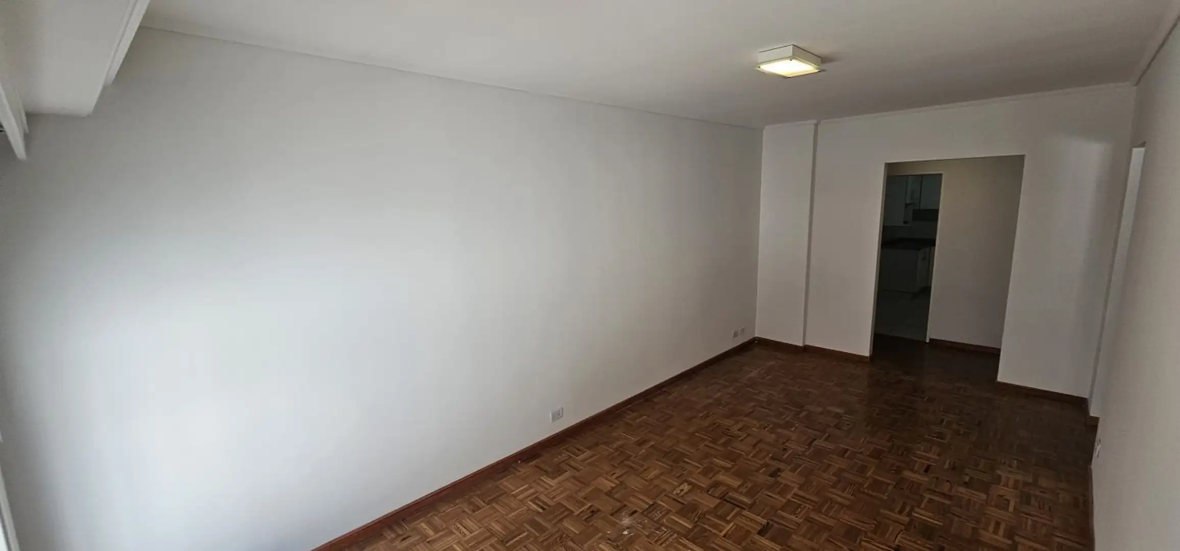 Three-room apartment on the 1st floor in Olivos, Vicente López, courtyard-facing (contrafrente) and north-facing. The unit has a living-dining area with 6 x 3 m wooden floors and a French balcony, plus split air conditioning. There is a separate, fully equipped eat-in kitchen (3.75 x 2.70 m) with an independent laundry (2.50 x 1.50 m), a full bathroom (1.85 x 1.80 m) with a bathtub, a north-oriented main bedroom (3.00 x 2.85 m) with wooden floors, a closet and split air conditioning, and a secon