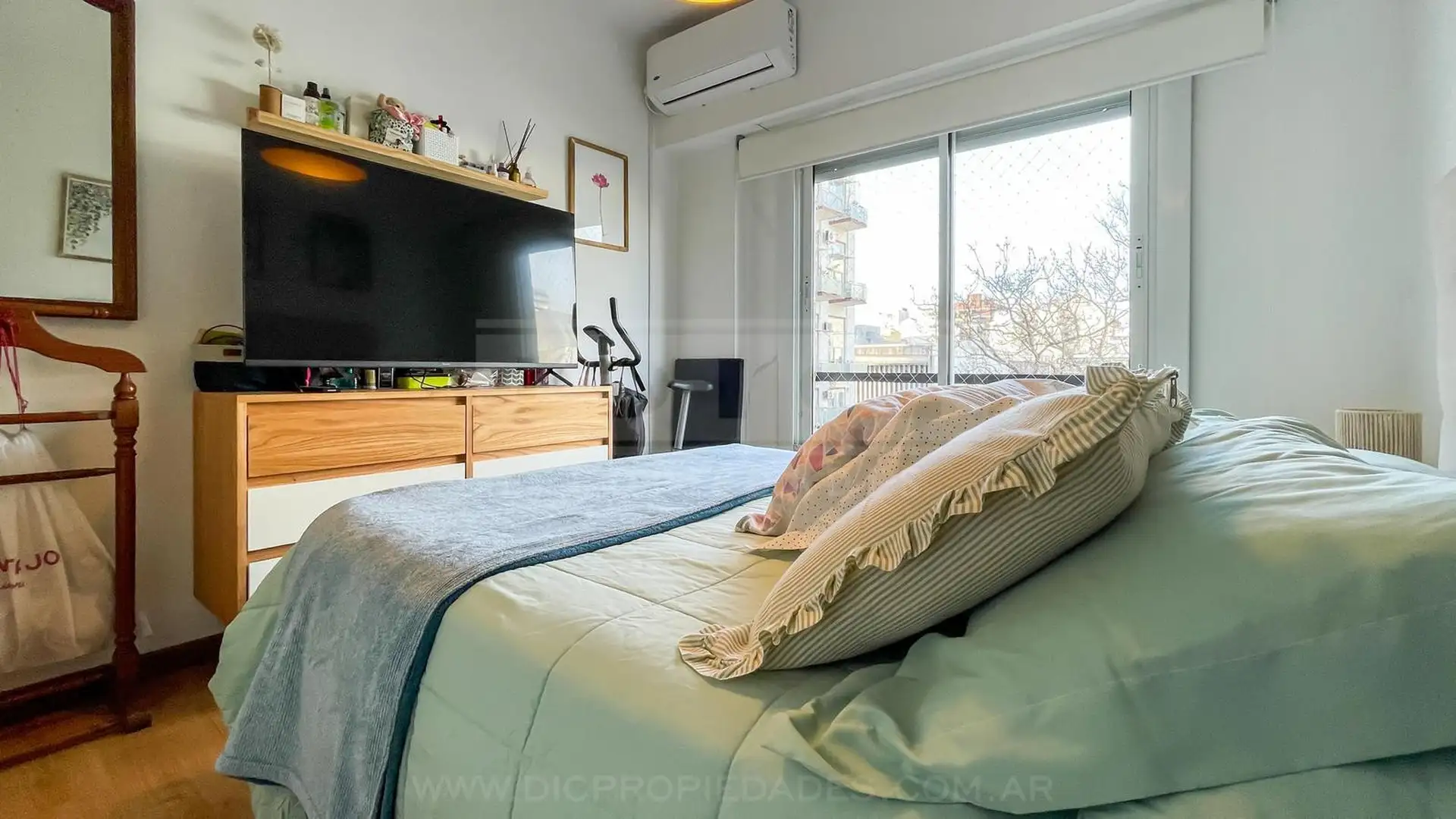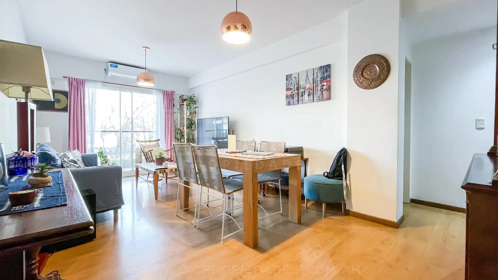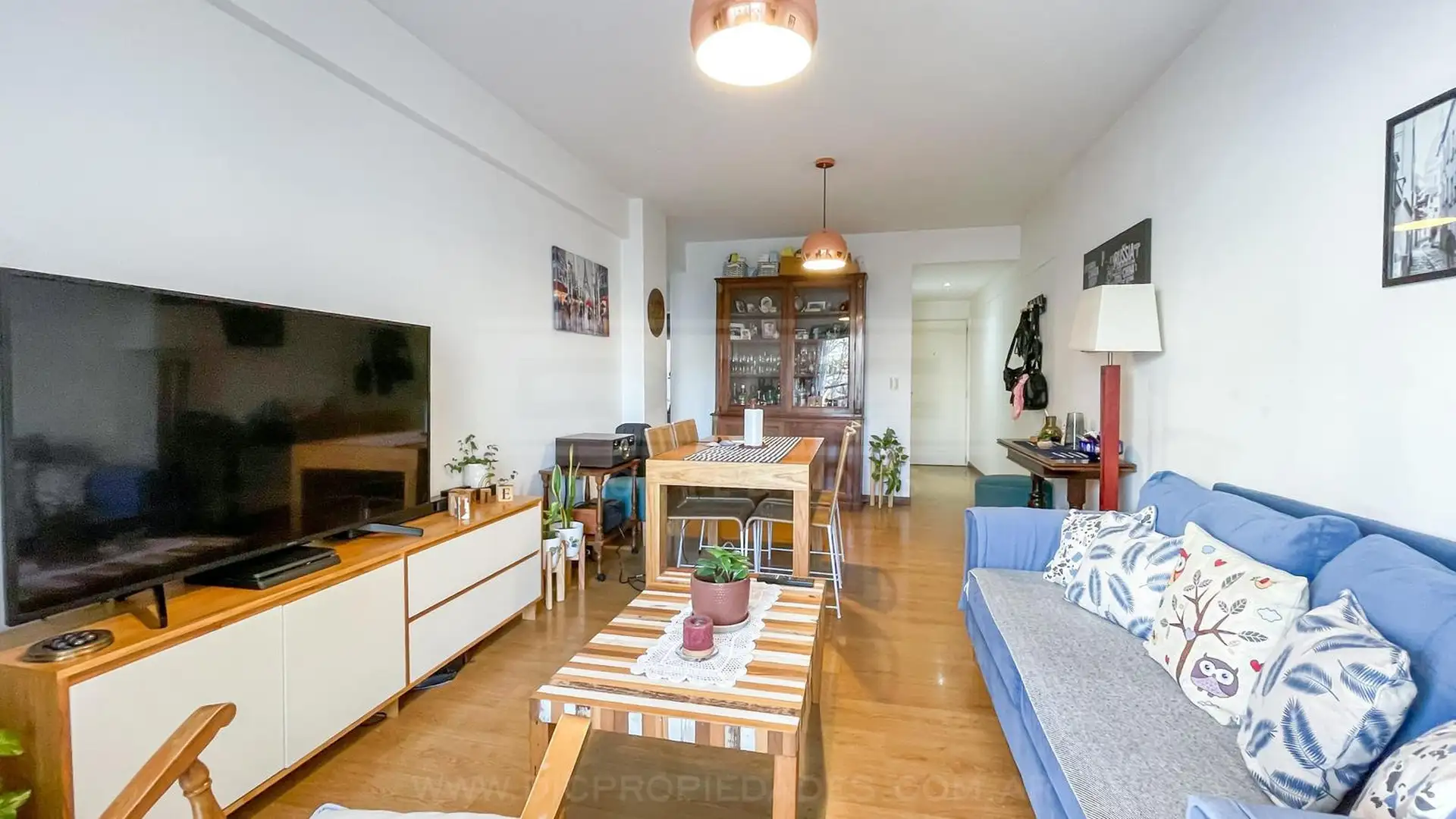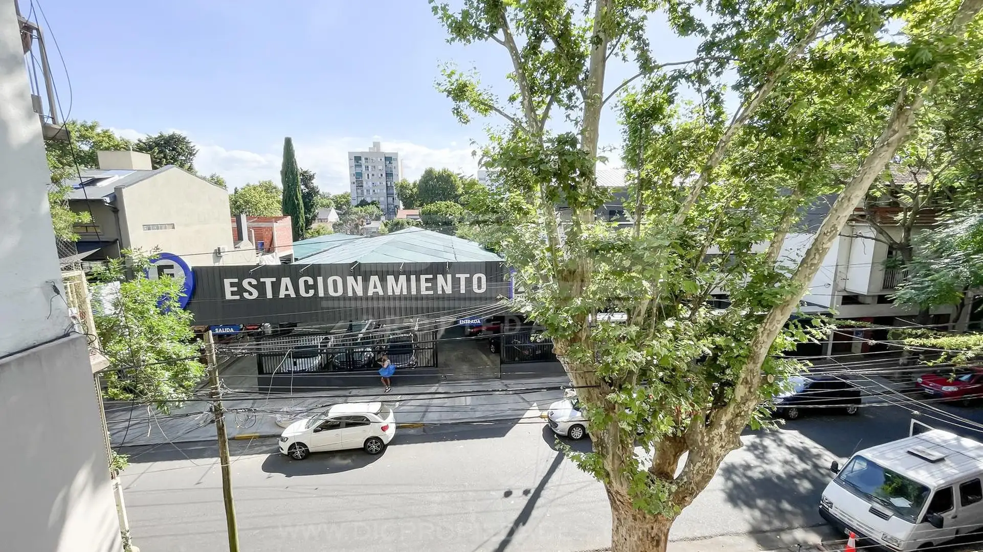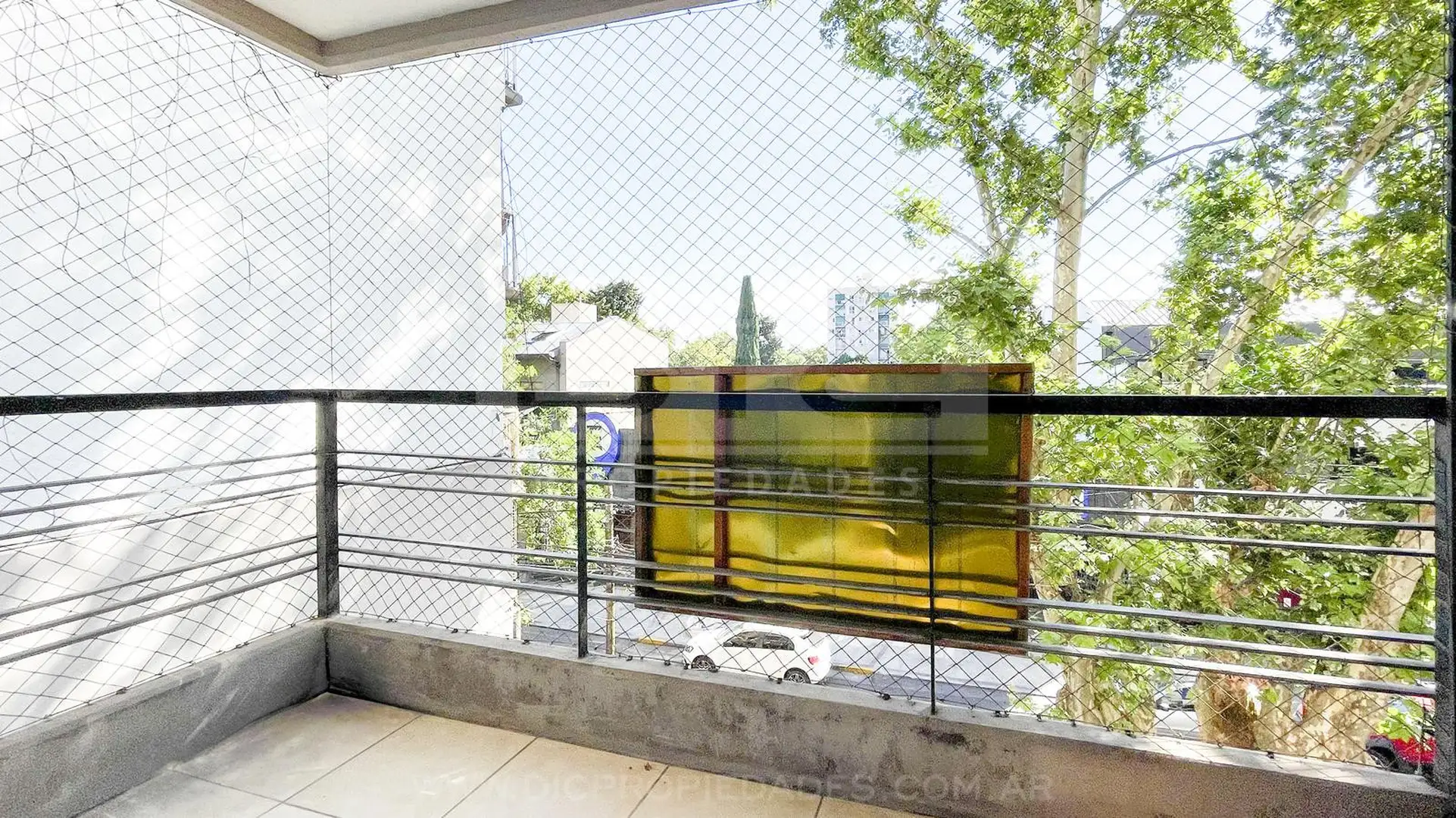 Three-room apartment with street-facing layout in Olivos, Vicente López, one block from Av. Maipú and about three blocks from the train and from Av. Ugarte. It has 2 bedrooms with built-in wardrobes, one en suite, plus a second bathroom. The living-dining room opens to a balcony; the kitchen includes base cabinets, upper cabinets and space for a daily dining area. Heating is individual with an in-apartment boiler powering underfloor radiant heating. The building has a communal lounge and a grill