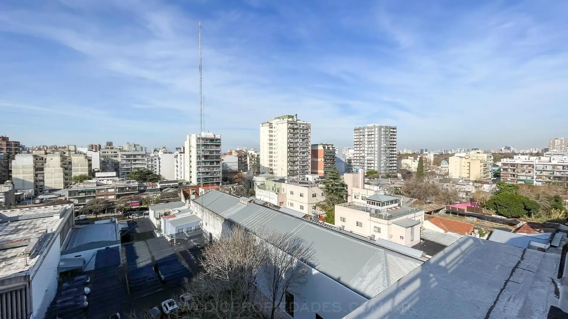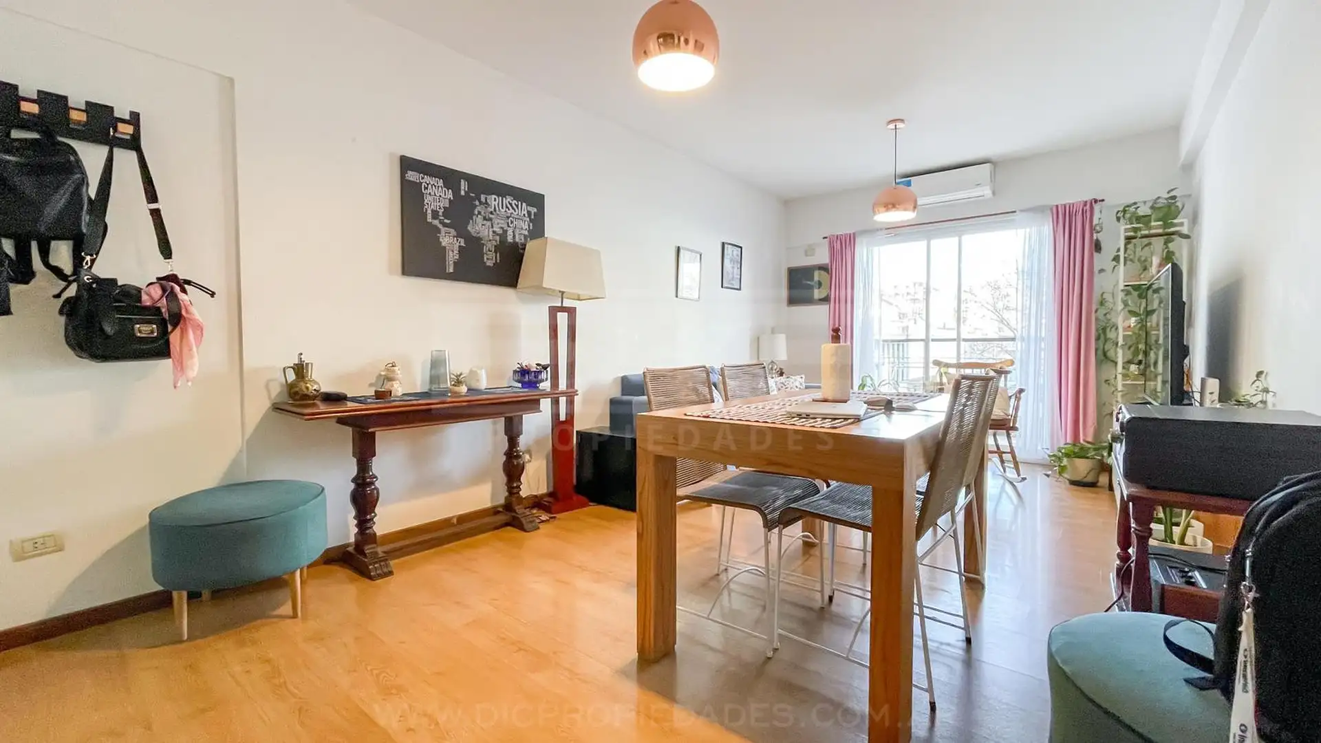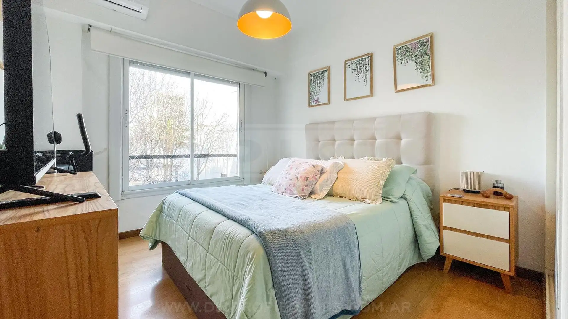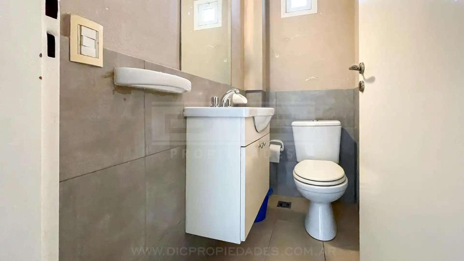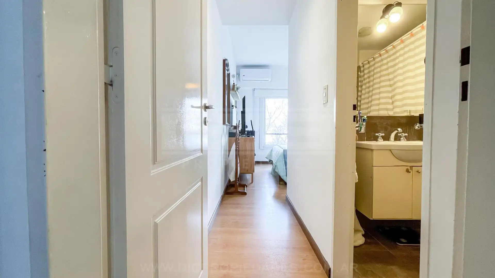Three-room apartment with street-facing layout in Olivos, Vicente López, one block from Av. Maipú and about three blocks from the train and from Av. Ugarte. It has 2 bedrooms with built-in wardrobes, one en suite, plus a second bathroom. The living-dining room opens to a balcony; the kitchen includes base cabinets, upper cabinets and space for a daily dining area. Heating is individual with an in-apartment boiler powering underfloor radiant heating. The building has a communal lounge and a grill