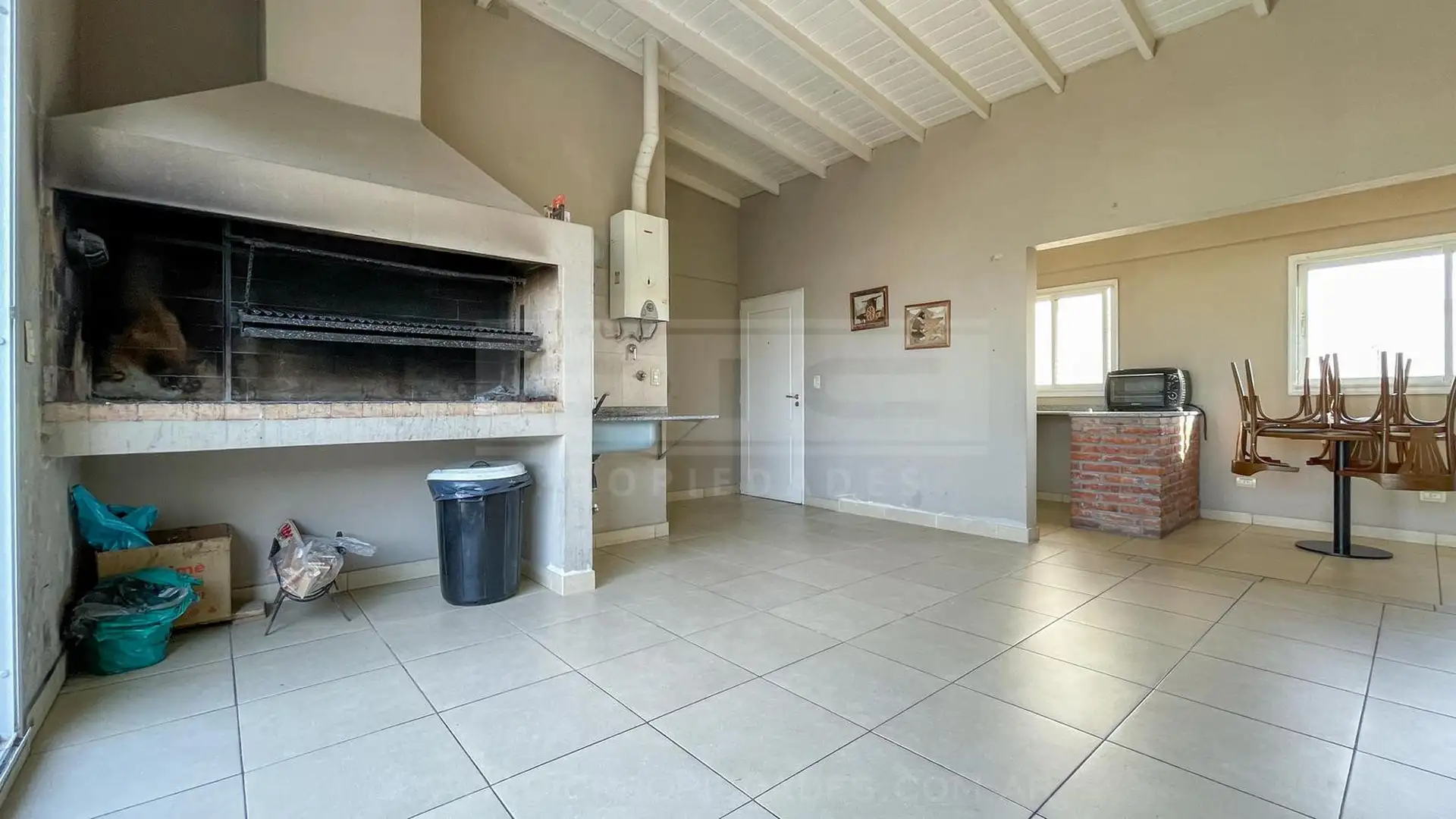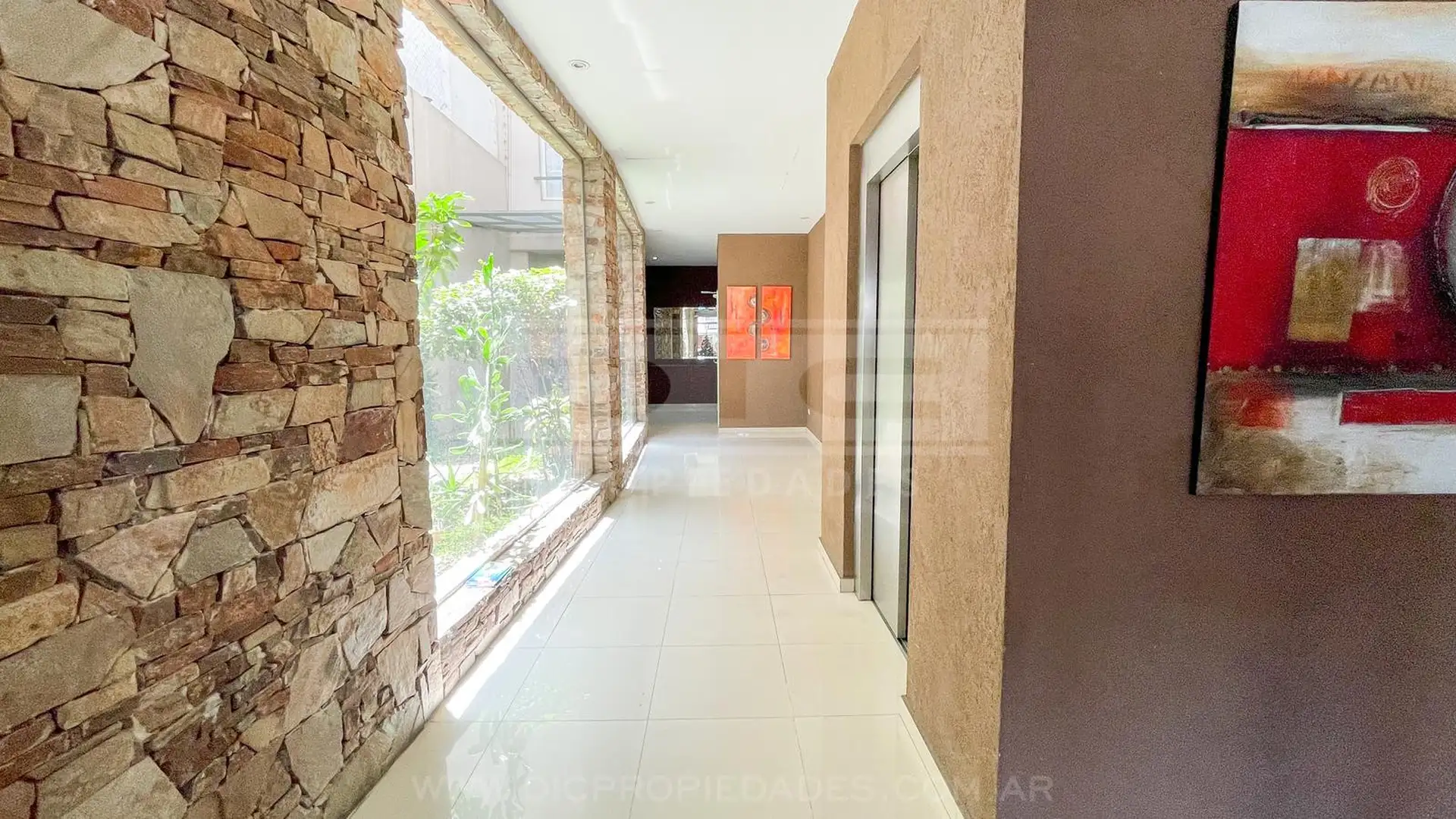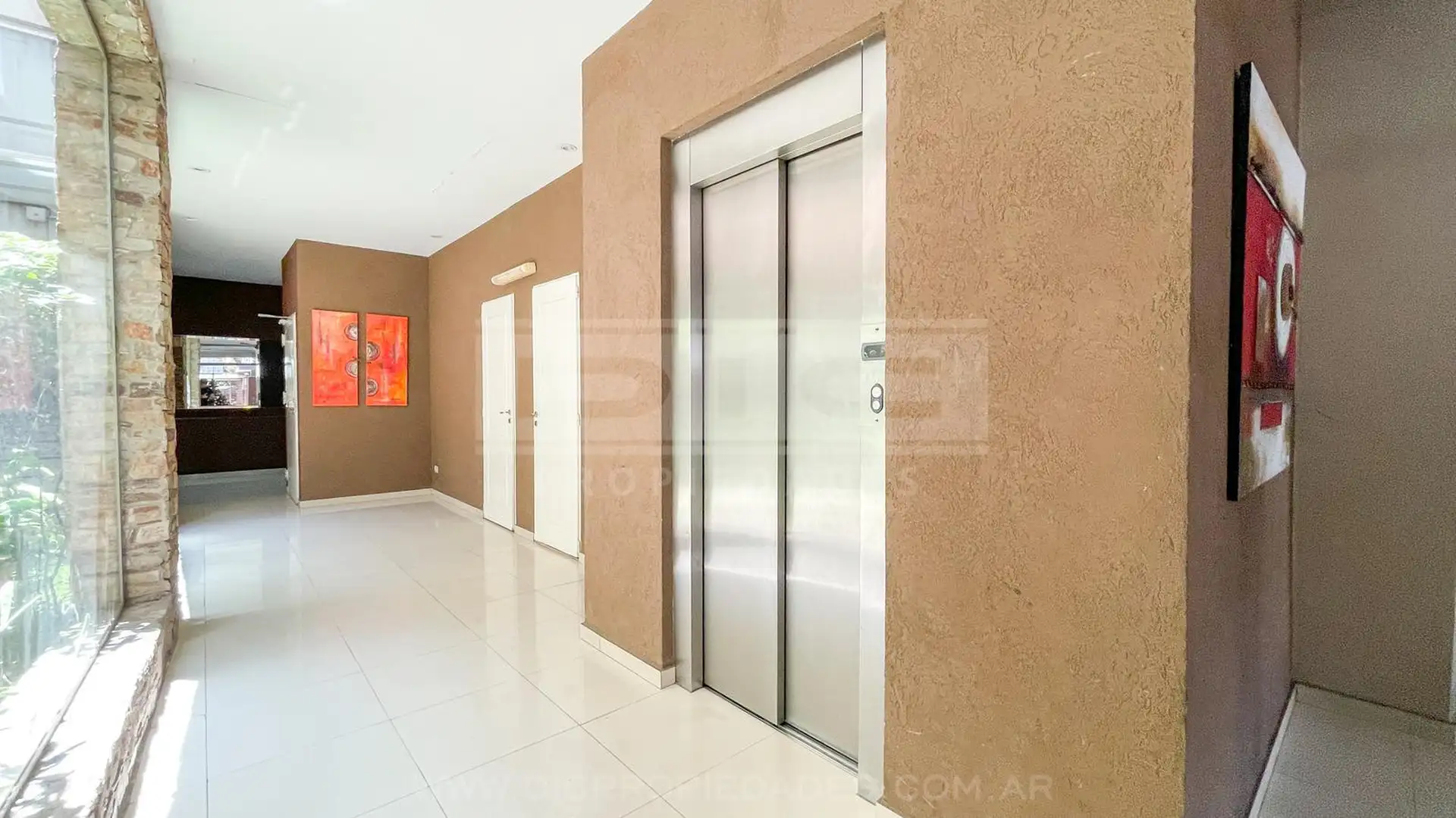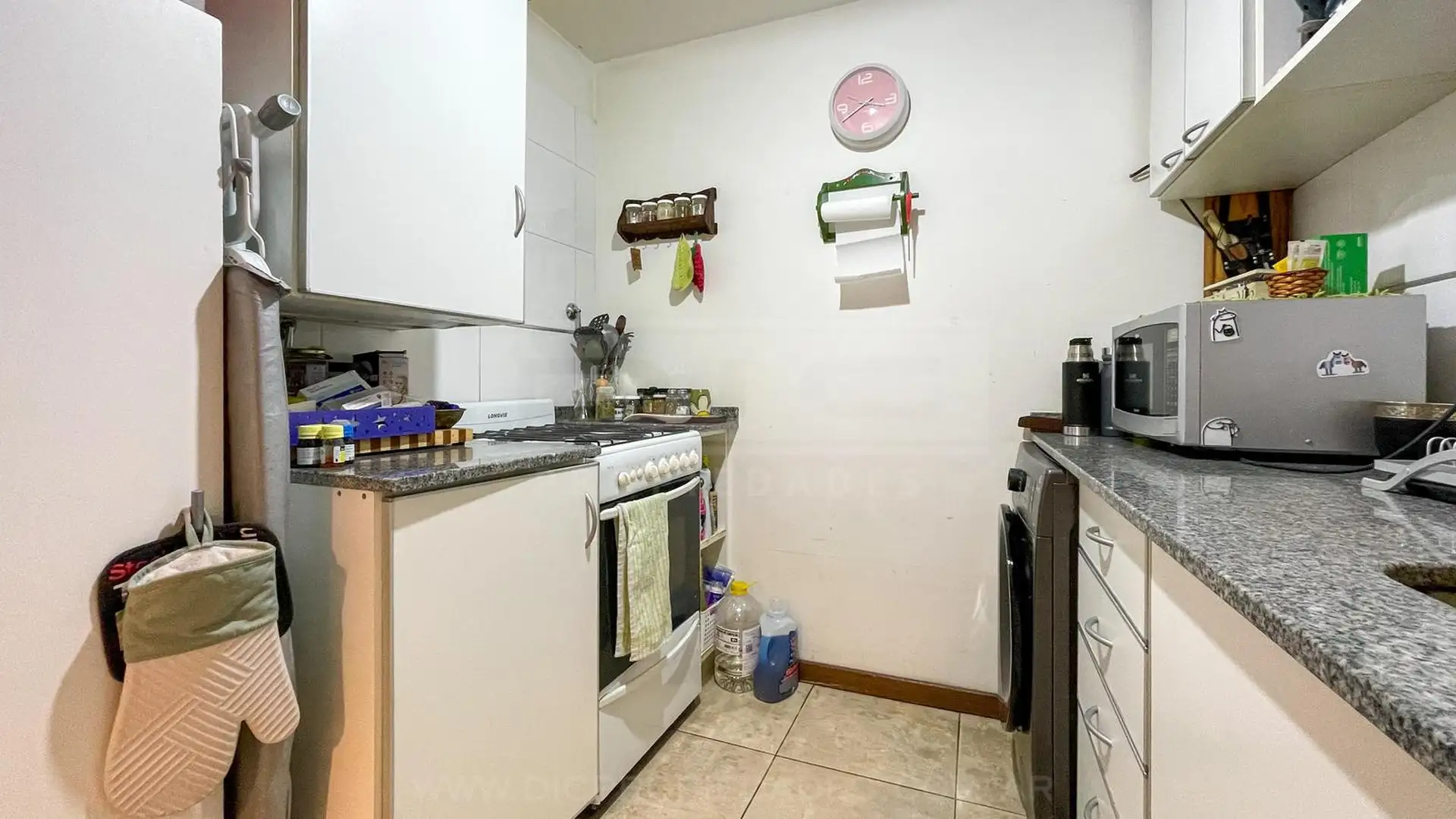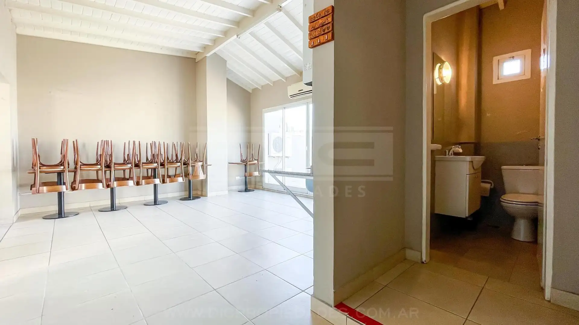 Three-room apartment with street-facing layout in Olivos, Vicente López, one block from Av. Maipú and about three blocks from the train and from Av. Ugarte. It has 2 bedrooms with built-in wardrobes, one en suite, plus a second bathroom. The living-dining room opens to a balcony; the kitchen includes base cabinets, upper cabinets and space for a daily dining area. Heating is individual with an in-apartment boiler powering underfloor radiant heating. The building has a communal lounge and a grill