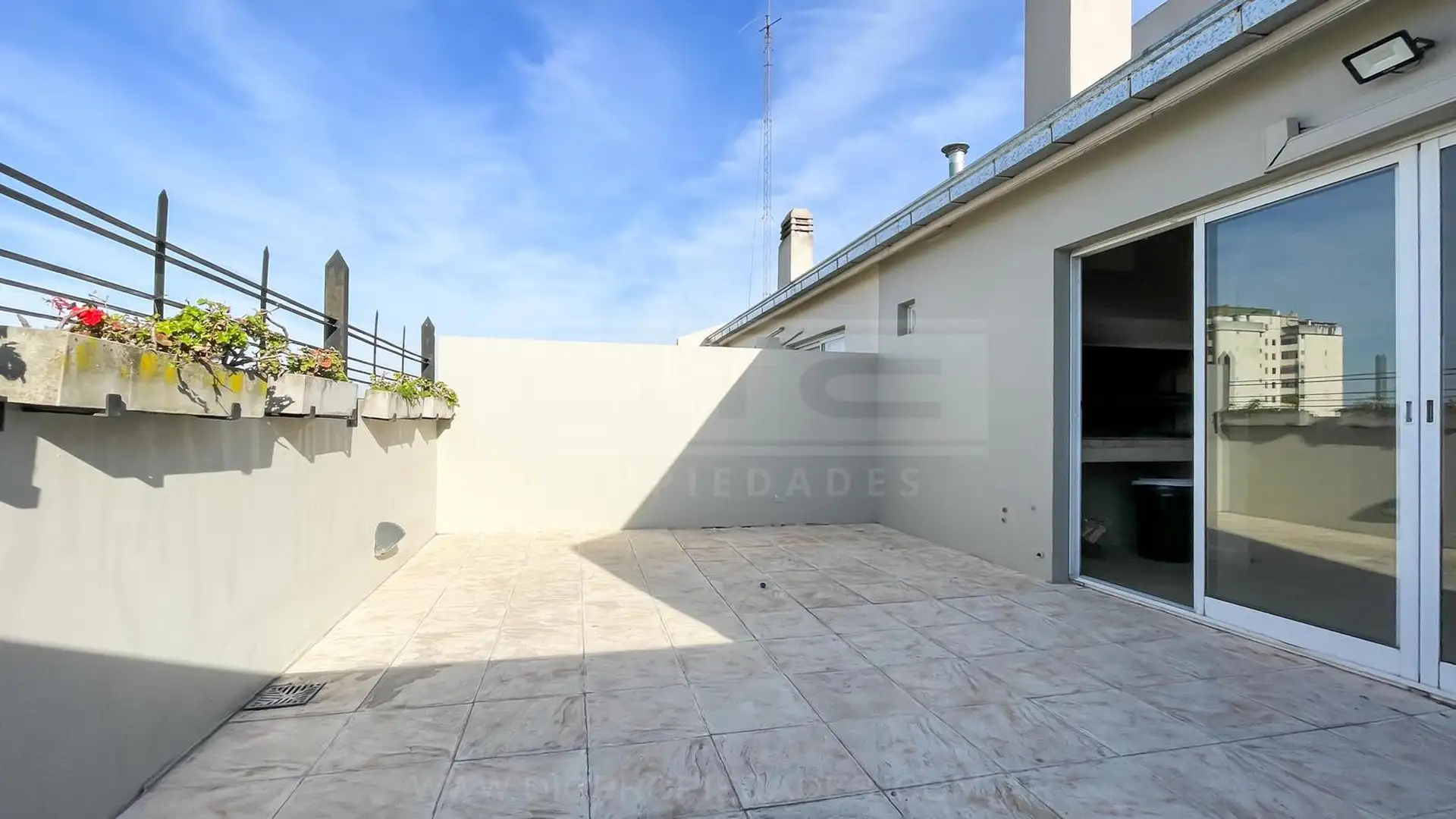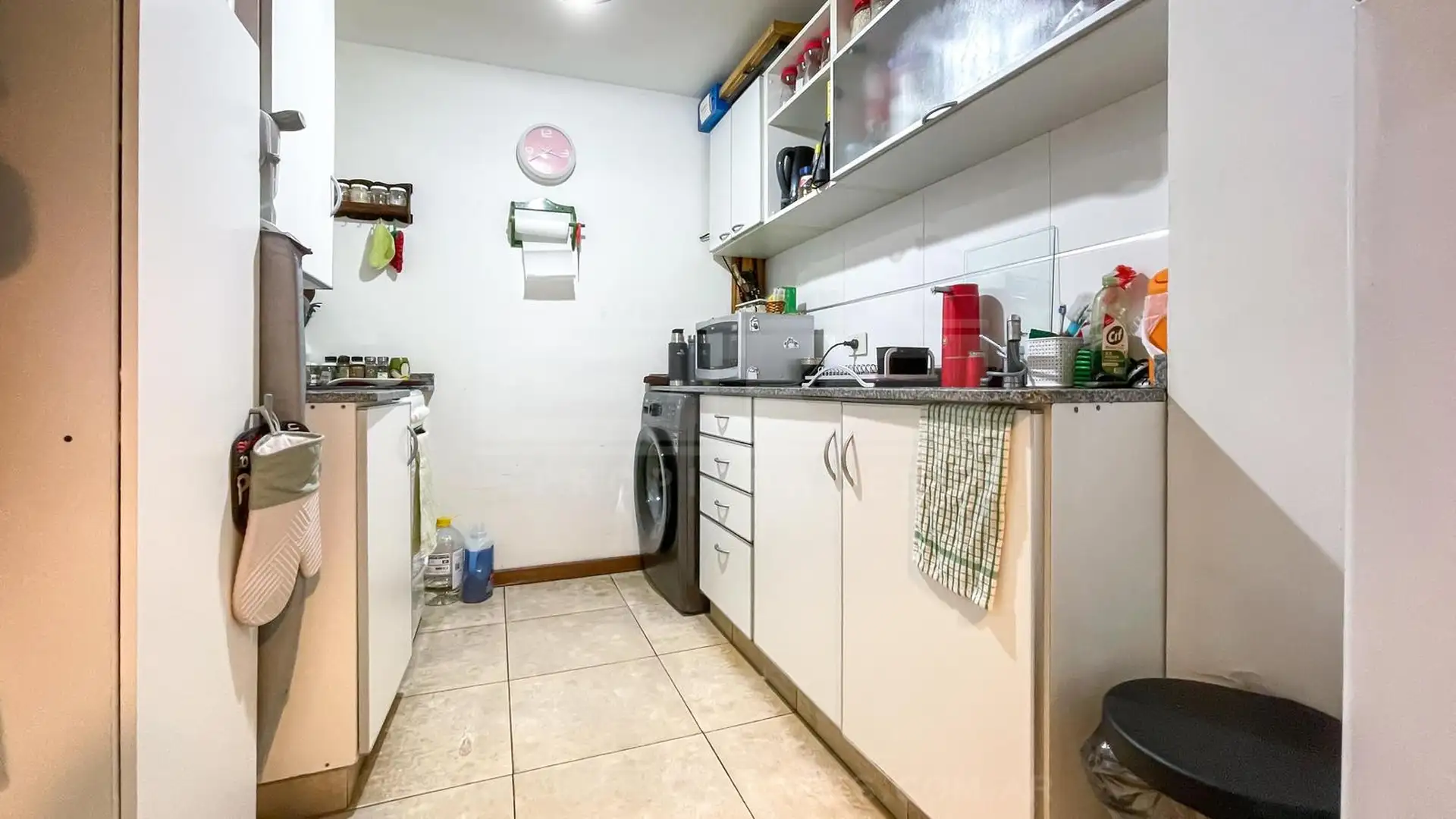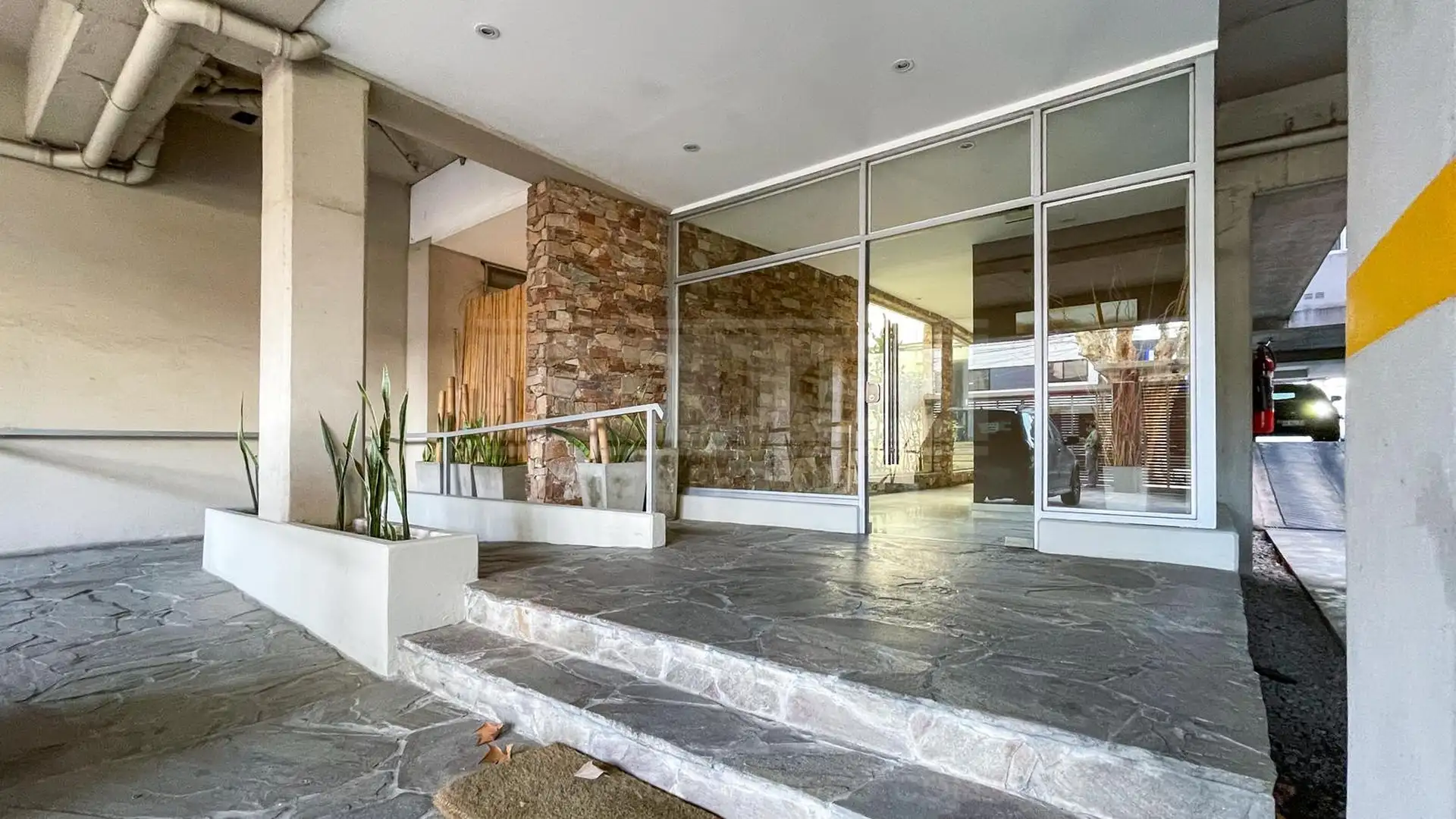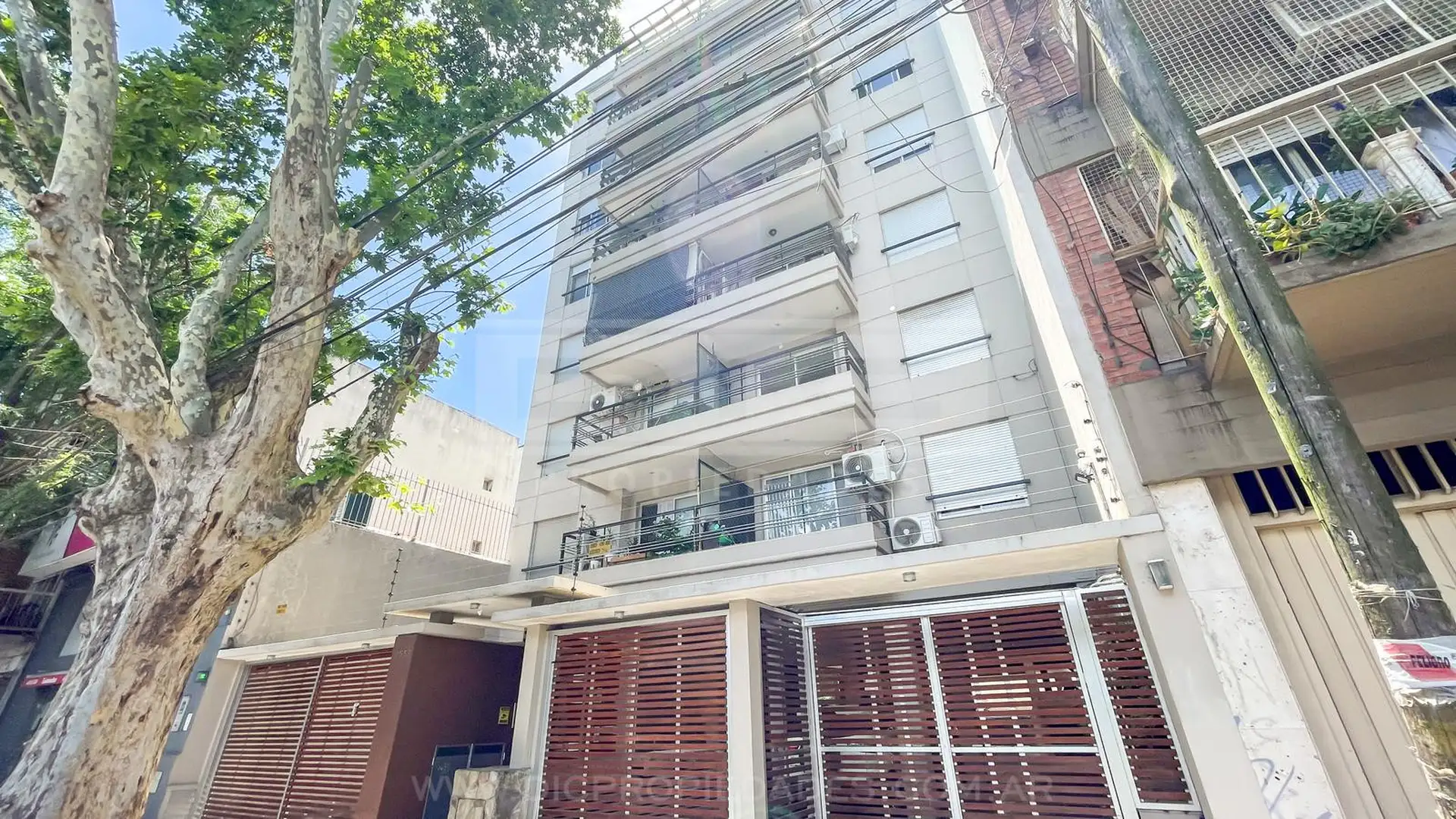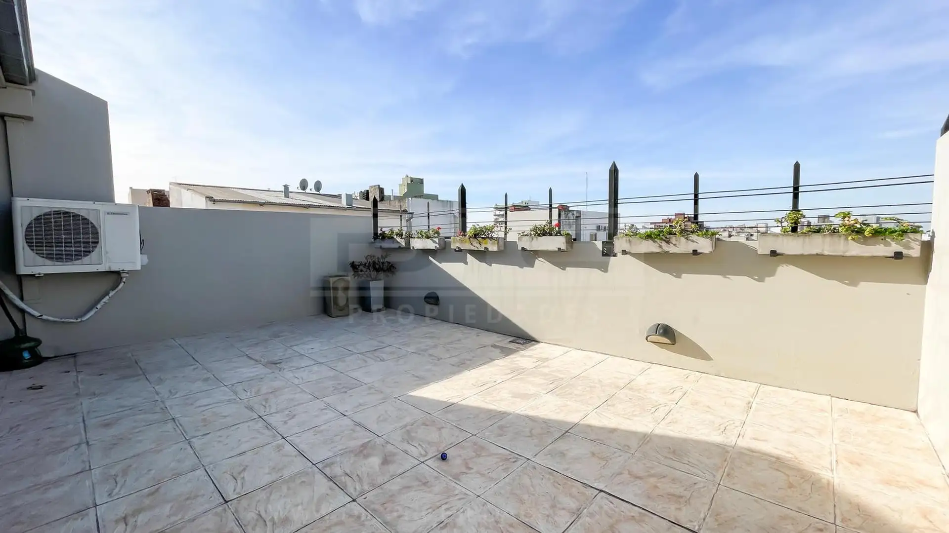 Three-room apartment with street-facing layout in Olivos, Vicente López, one block from Av. Maipú and about three blocks from the train and from Av. Ugarte. It has 2 bedrooms with built-in wardrobes, one en suite, plus a second bathroom. The living-dining room opens to a balcony; the kitchen includes base cabinets, upper cabinets and space for a daily dining area. Heating is individual with an in-apartment boiler powering underfloor radiant heating. The building has a communal lounge and a grill