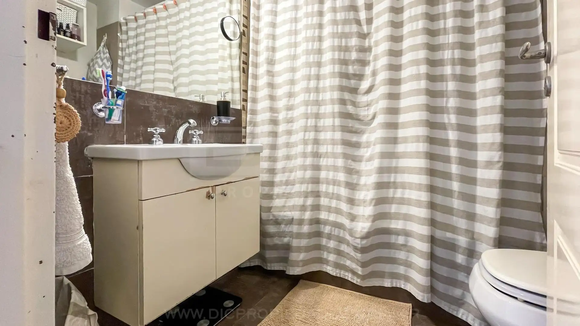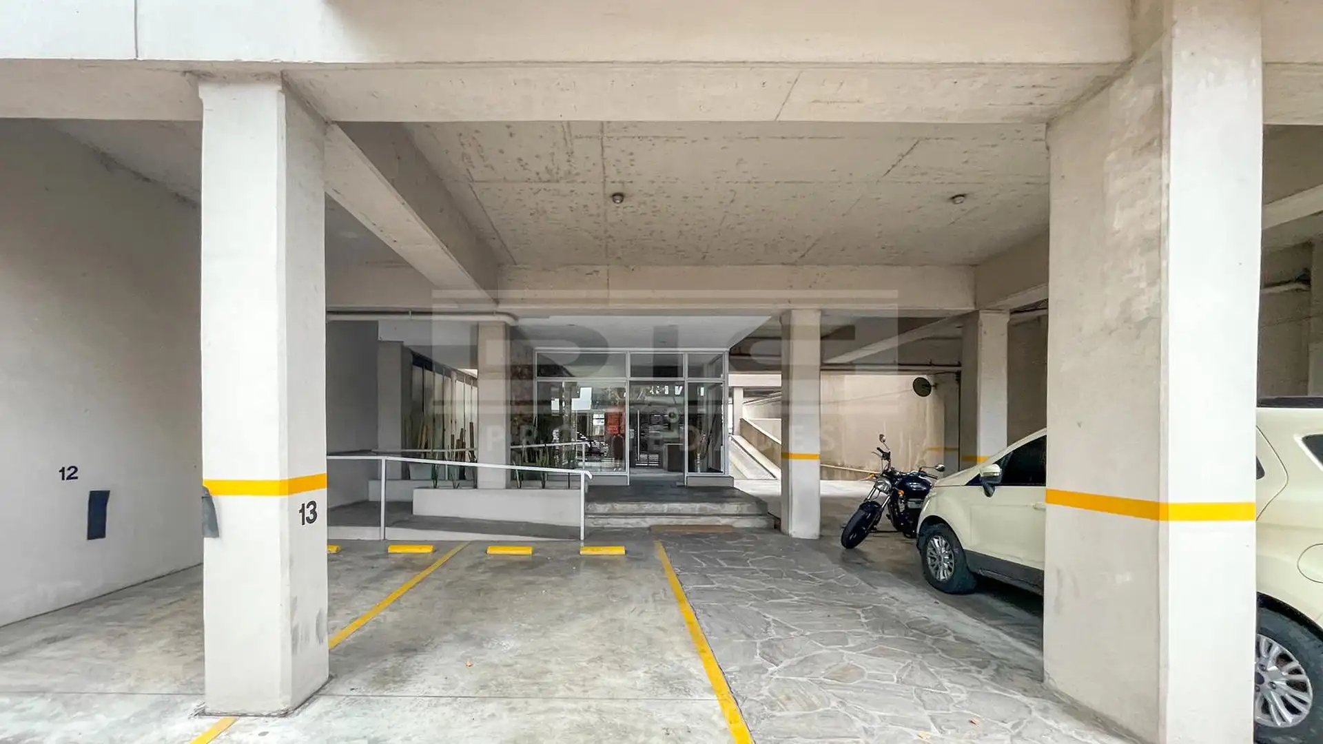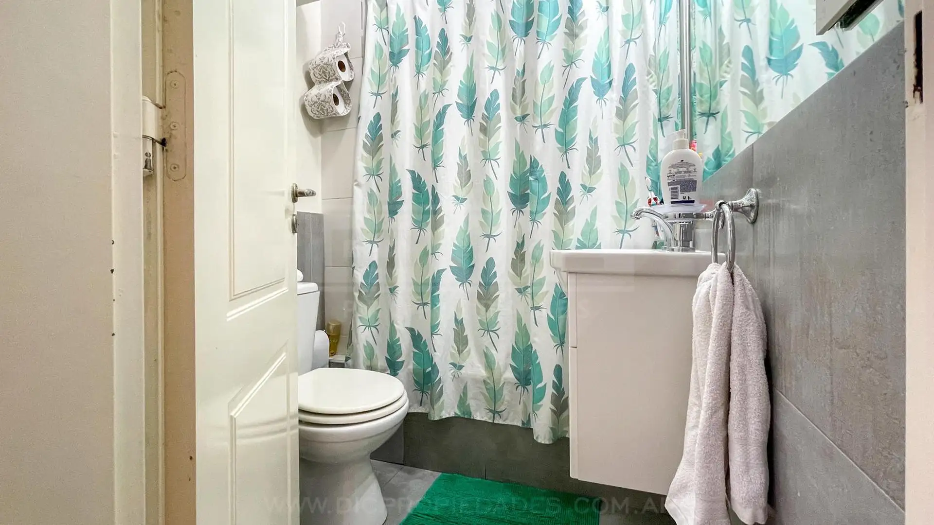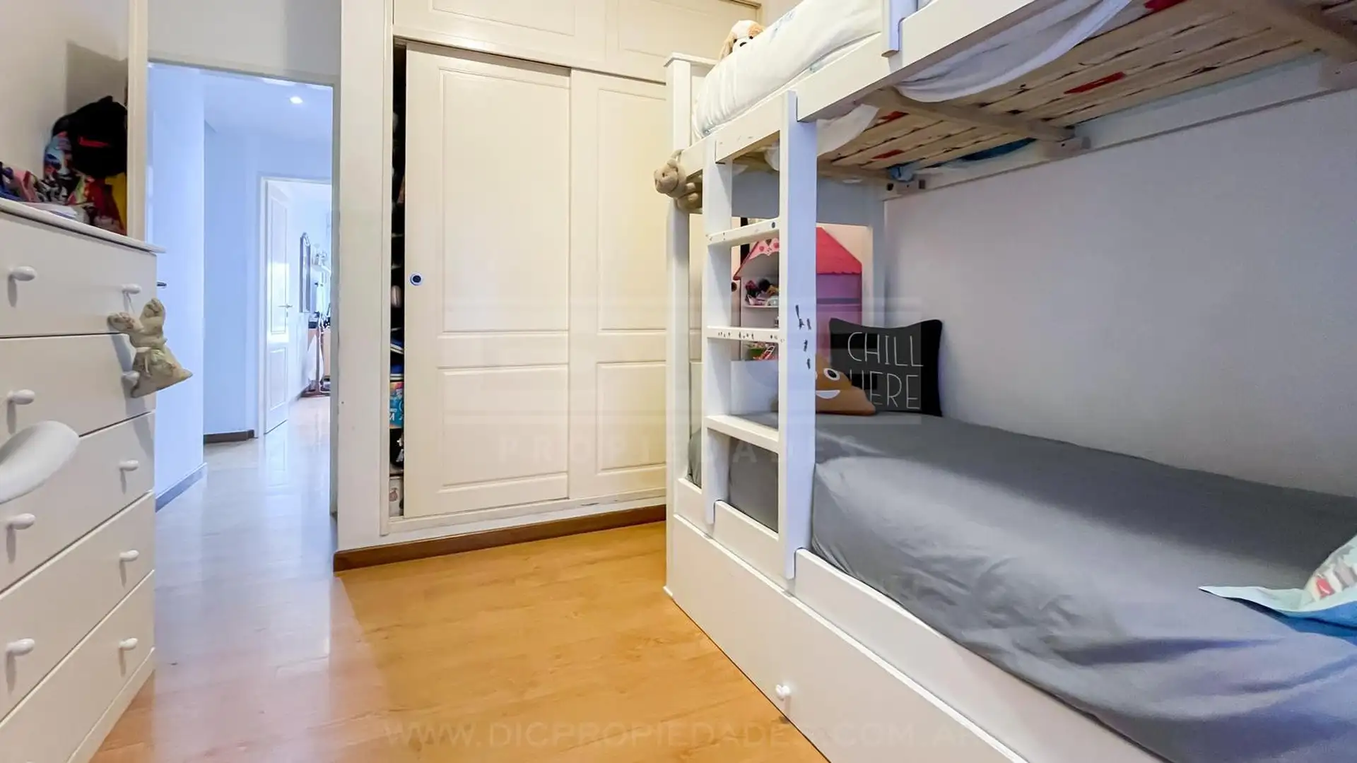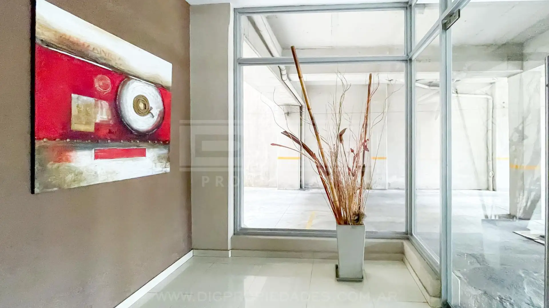 Three-room apartment with street-facing layout in Olivos, Vicente López, one block from Av. Maipú and about three blocks from the train and from Av. Ugarte. It has 2 bedrooms with built-in wardrobes, one en suite, plus a second bathroom. The living-dining room opens to a balcony; the kitchen includes base cabinets, upper cabinets and space for a daily dining area. Heating is individual with an in-apartment boiler powering underfloor radiant heating. The building has a communal lounge and a grill