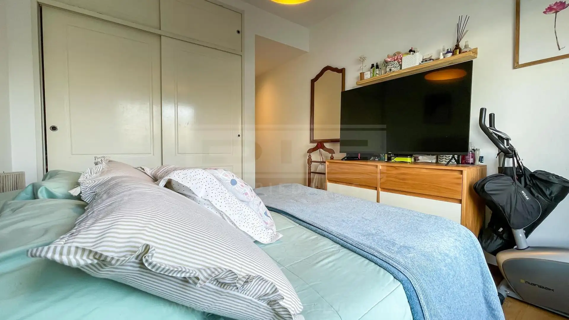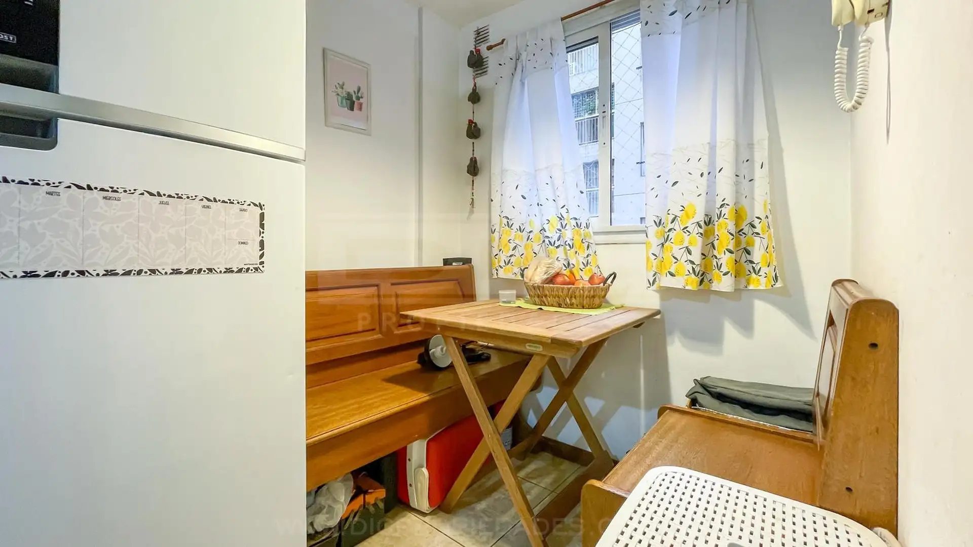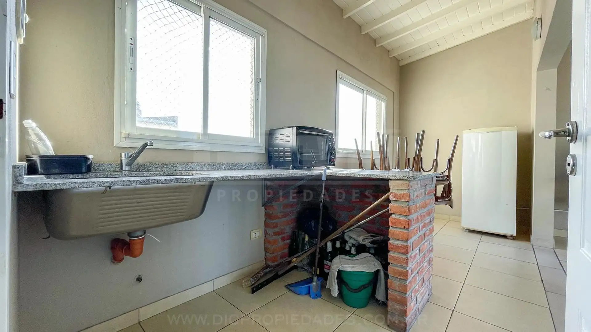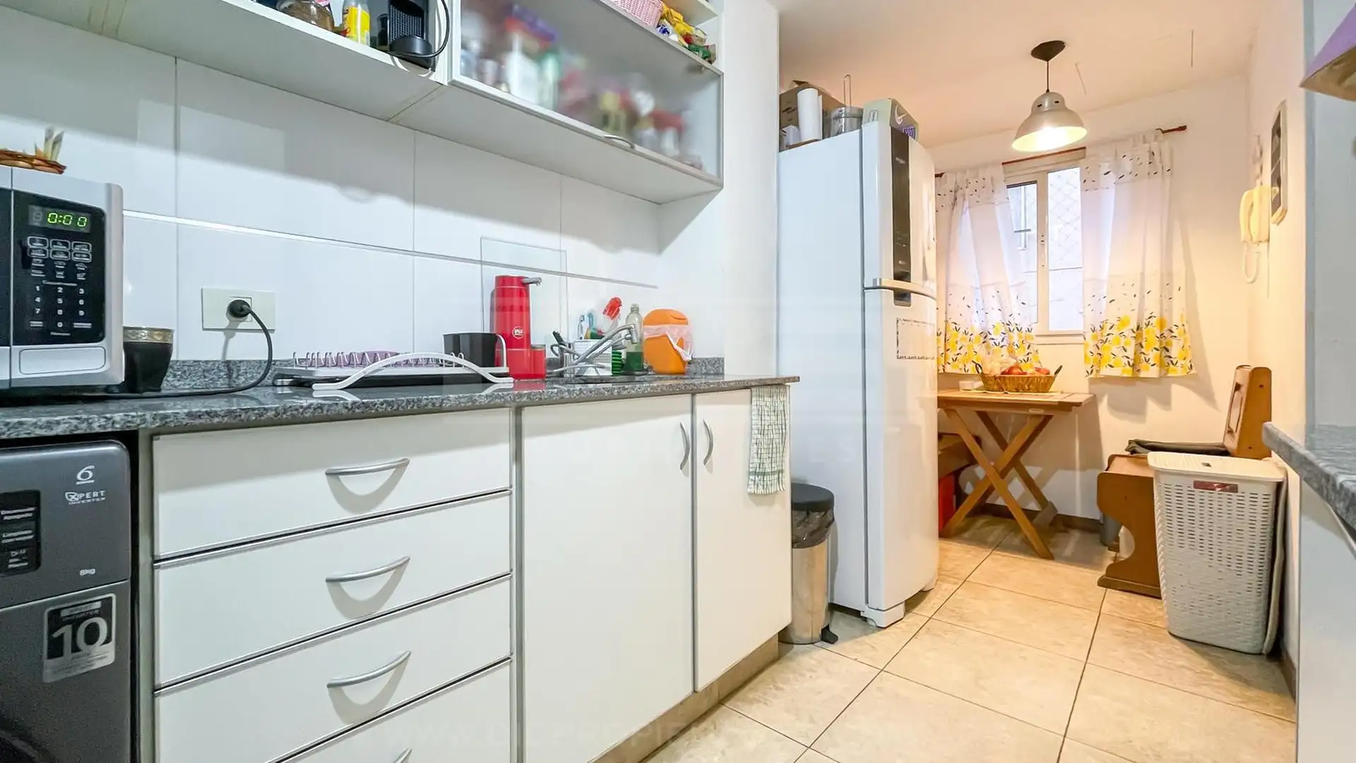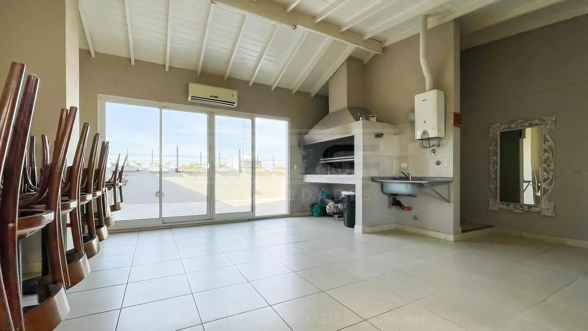 Three-room apartment with street-facing layout in Olivos, Vicente López, one block from Av. Maipú and about three blocks from the train and from Av. Ugarte. It has 2 bedrooms with built-in wardrobes, one en suite, plus a second bathroom. The living-dining room opens to a balcony; the kitchen includes base cabinets, upper cabinets and space for a daily dining area. Heating is individual with an in-apartment boiler powering underfloor radiant heating. The building has a communal lounge and a grill