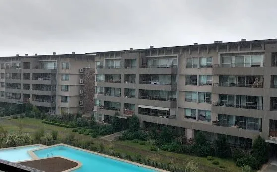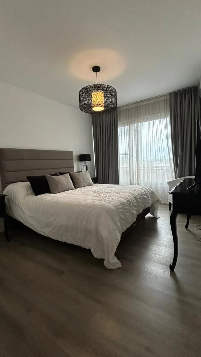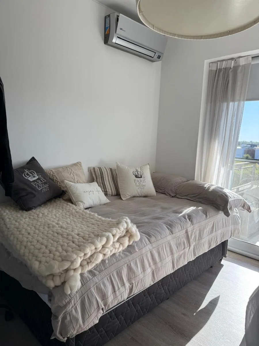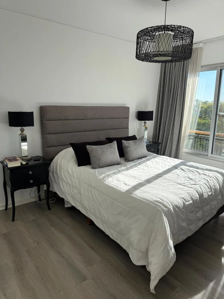 Furnished apartment in Quartier Buenavista, San Fernando. It has a living-dining area, open-plan kitchen, a primary suite with dressing room, a second room, and a full bathroom, plus a balcony overlooking the pool. The apartment has double-glazed windows and an (assigned) covered parking space, with a storage room. The complex offers a central pool with deck, gym, 24-hour security, clubhouse, laundry, children’s day-care, residents’ lounge, and sauna. Building fees and taxes are listed as estima