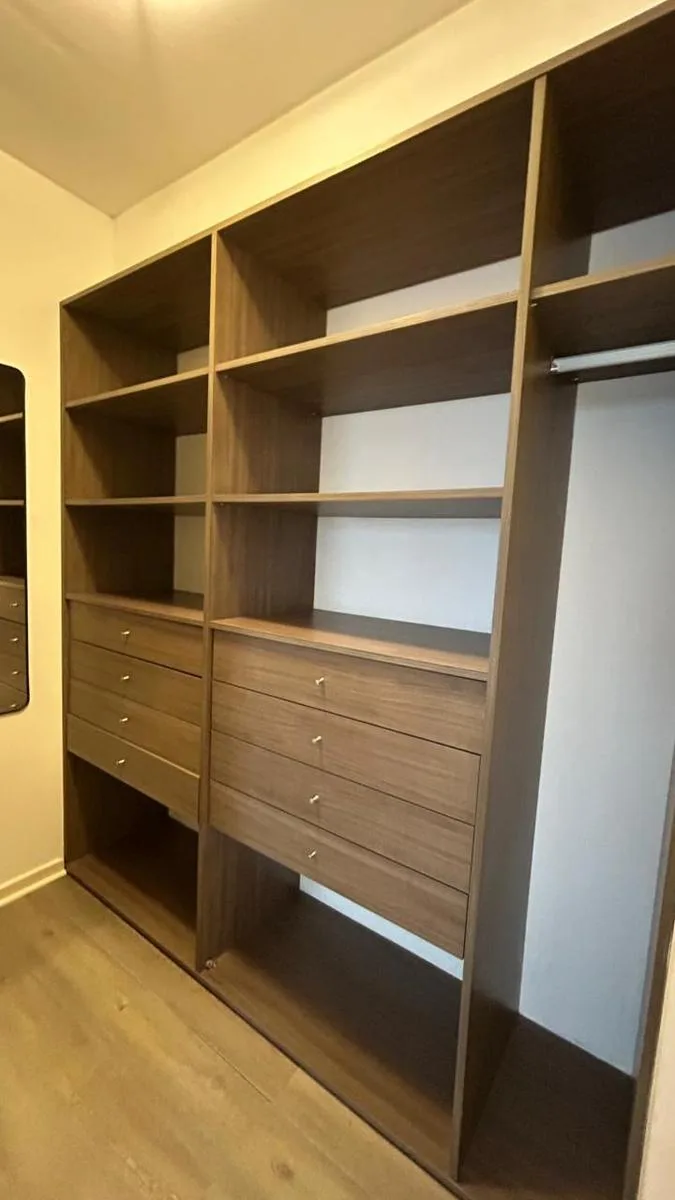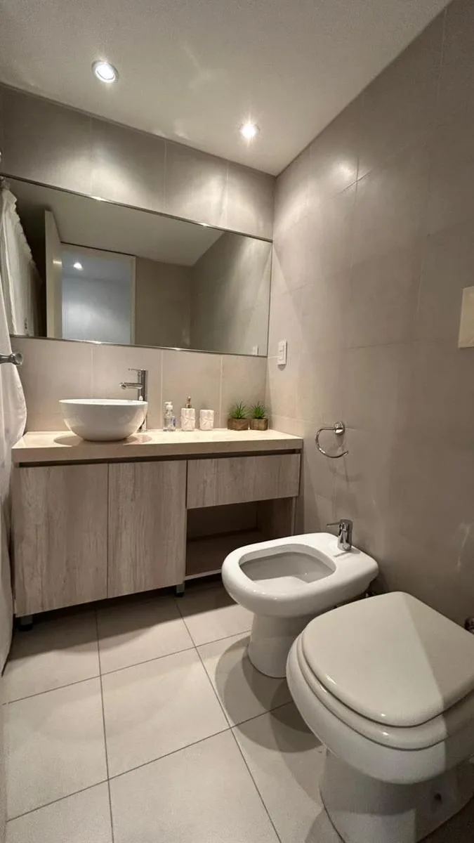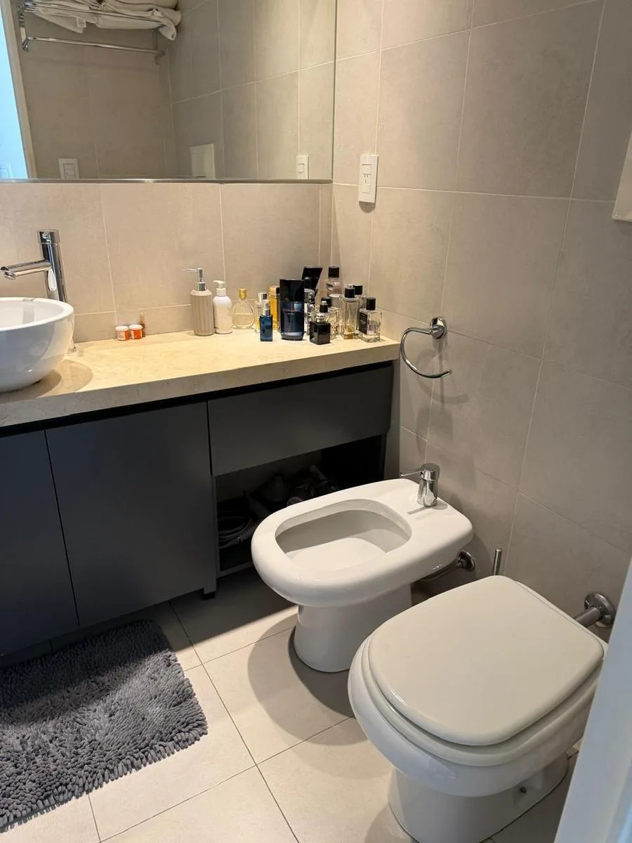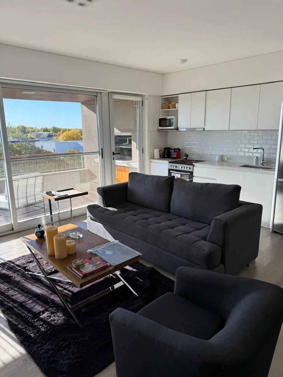 Furnished apartment in Quartier Buenavista, San Fernando. It has a living-dining area, open-plan kitchen, a primary suite with dressing room, a second room, and a full bathroom, plus a balcony overlooking the pool. The apartment has double-glazed windows and an (assigned) covered parking space, with a storage room. The complex offers a central pool with deck, gym, 24-hour security, clubhouse, laundry, children’s day-care, residents’ lounge, and sauna. Building fees and taxes are listed as estima