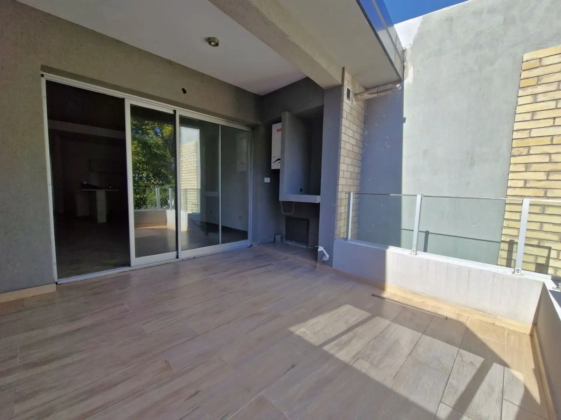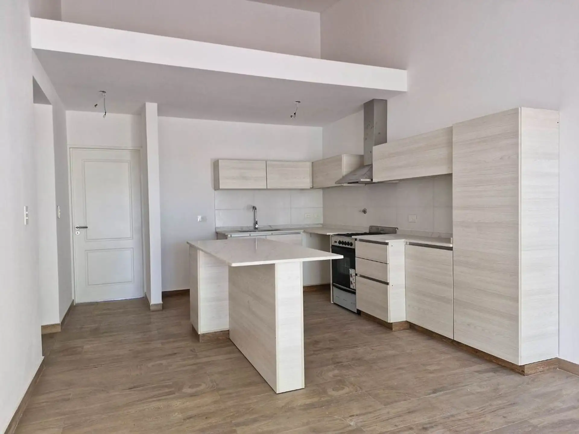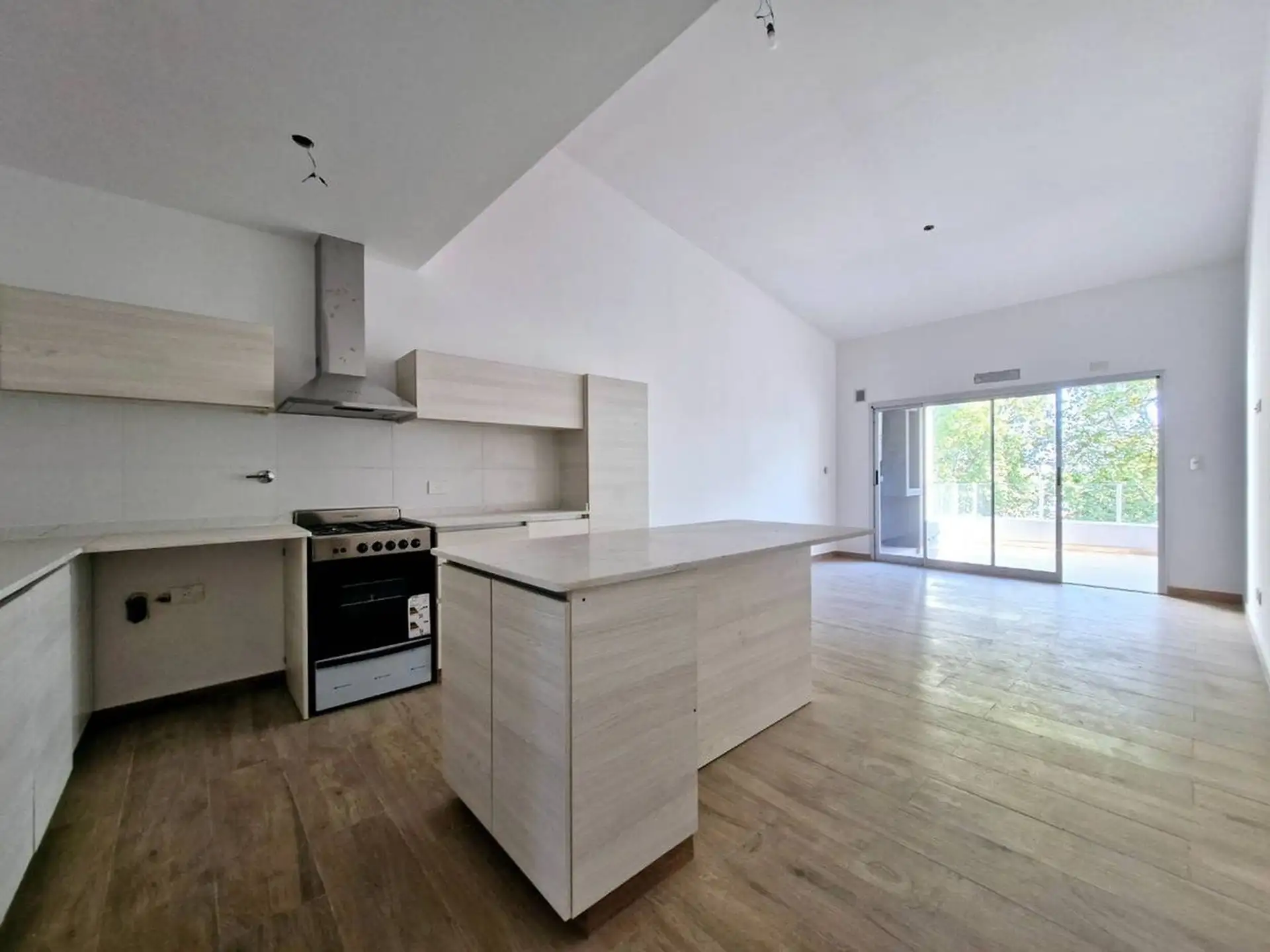 New three-room apartment in Victoria, San Fernando, in a modern building, street-facing on Av. Del Libertador. It has a corridor entry, a living-dining area with slanted ceilings and a window opening to private open space, and a front terrace with space for a private grill. The kitchen is semi-integrated with a gas cooktop, stainless steel extractor hood, Silestone countertop and island/breakfast bar, with connection for a washing machine; the private area includes a master suite with slanted ce