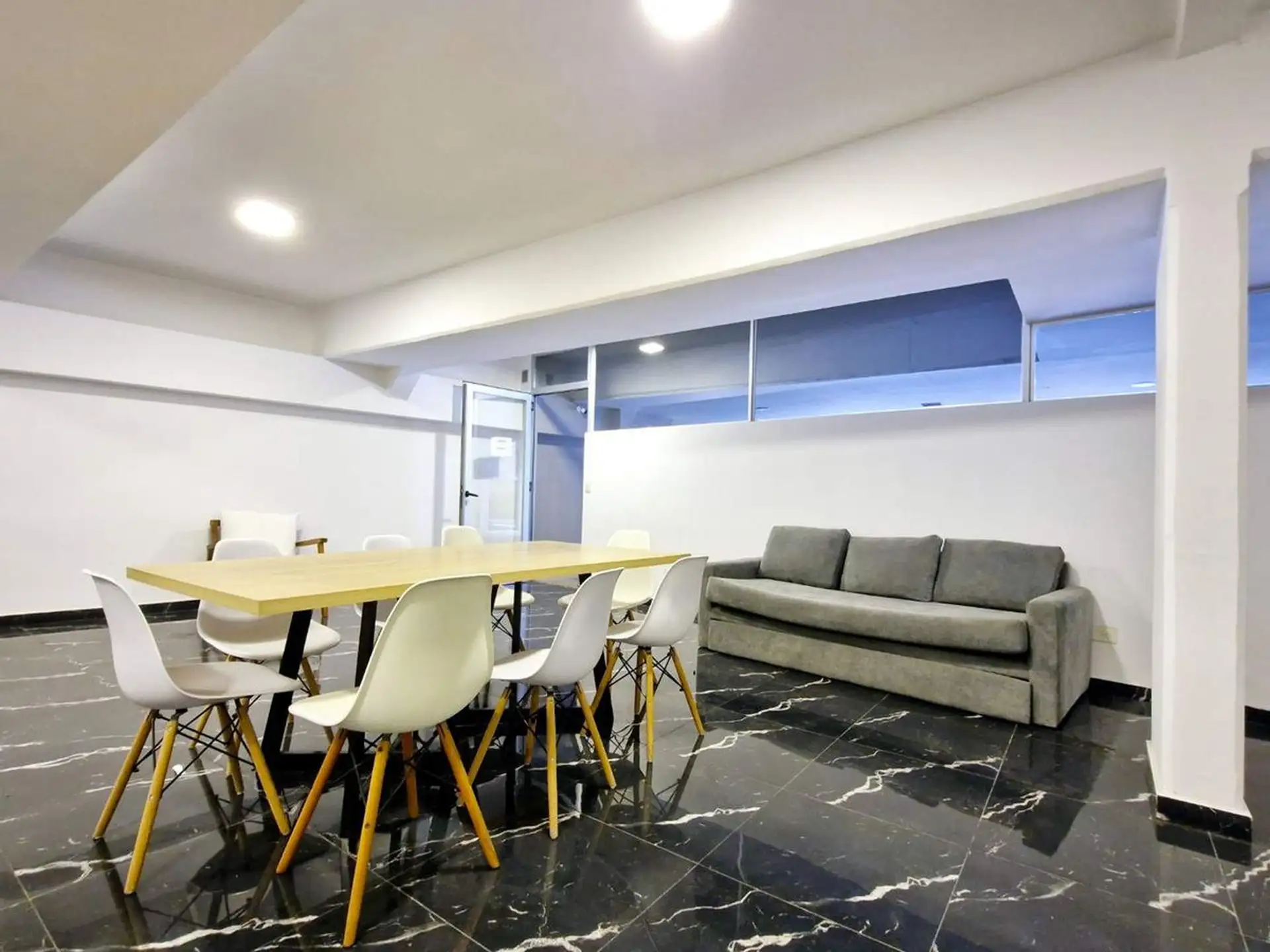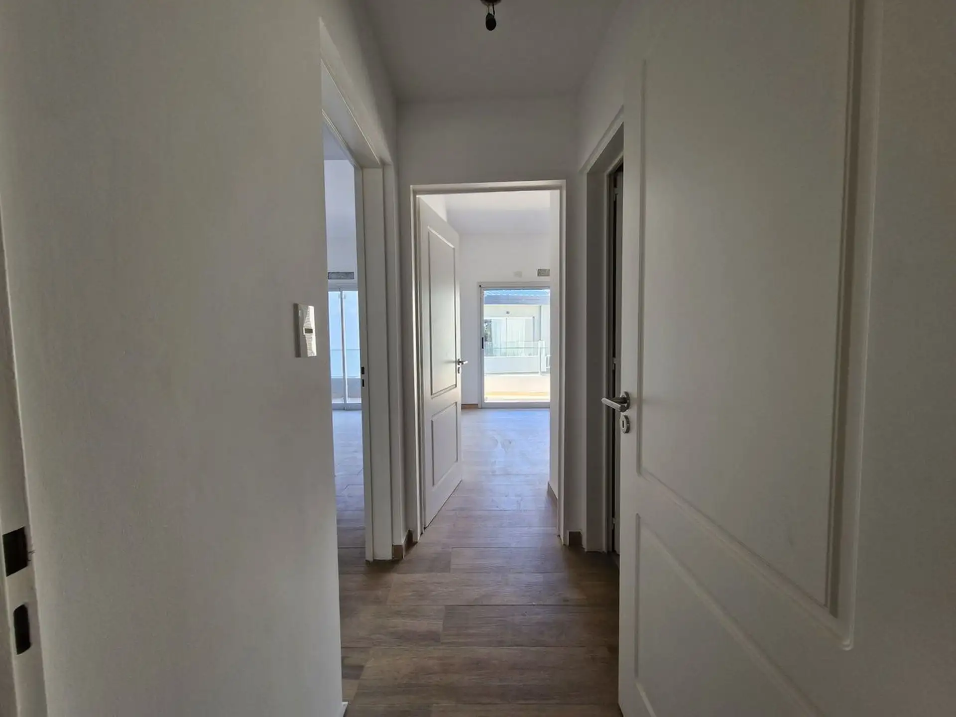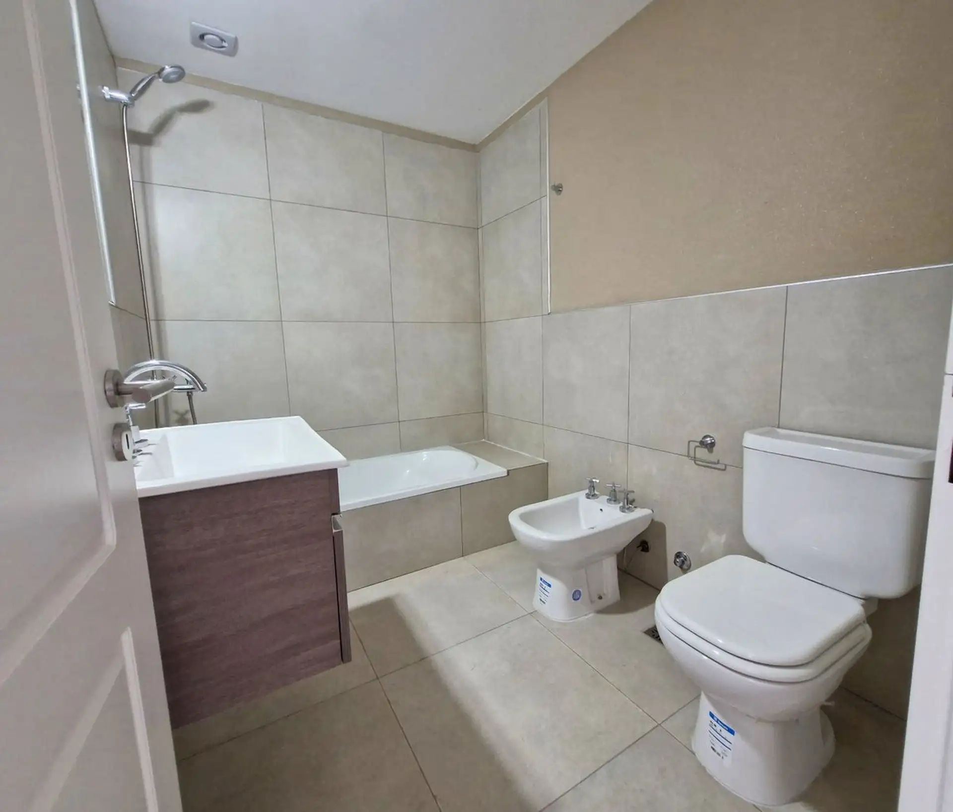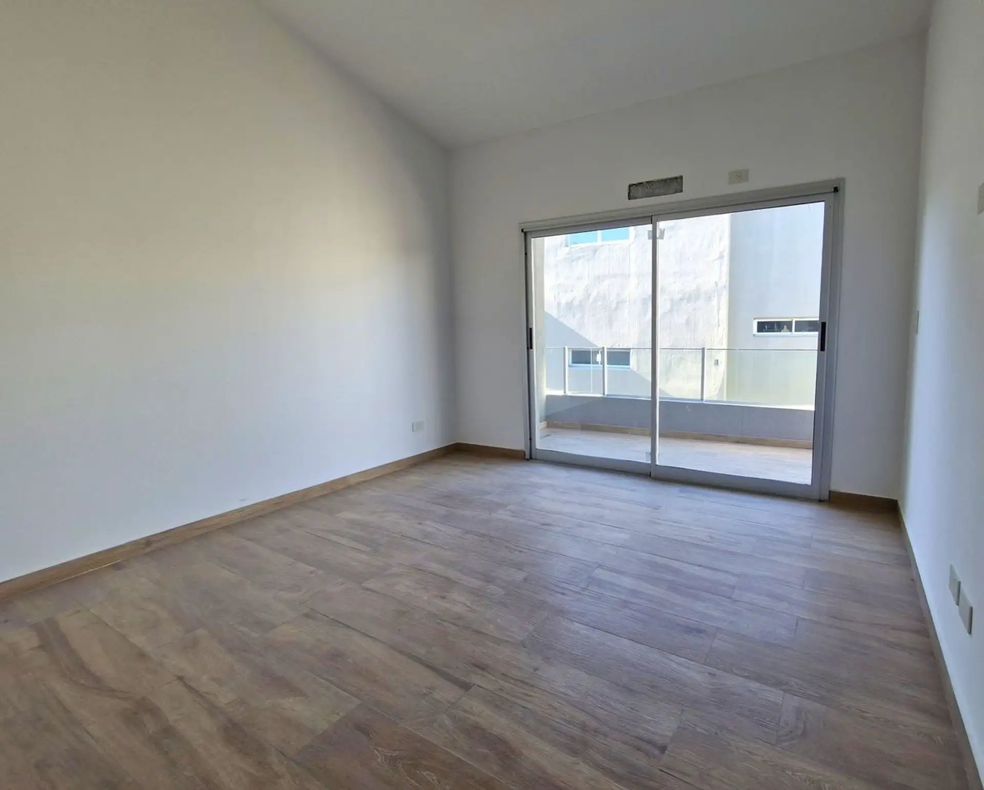 New three-room apartment in Victoria, San Fernando, in a modern building, street-facing on Av. Del Libertador. It has a corridor entry, a living-dining area with slanted ceilings and a window opening to private open space, and a front terrace with space for a private grill. The kitchen is semi-integrated with a gas cooktop, stainless steel extractor hood, Silestone countertop and island/breakfast bar, with connection for a washing machine; the private area includes a master suite with slanted ce