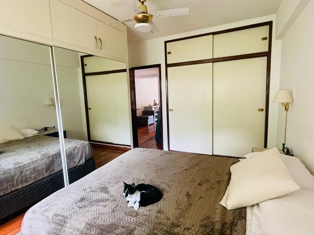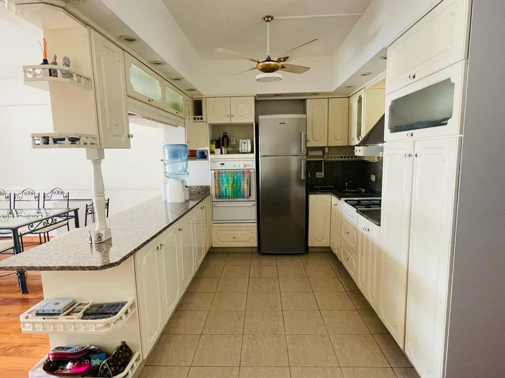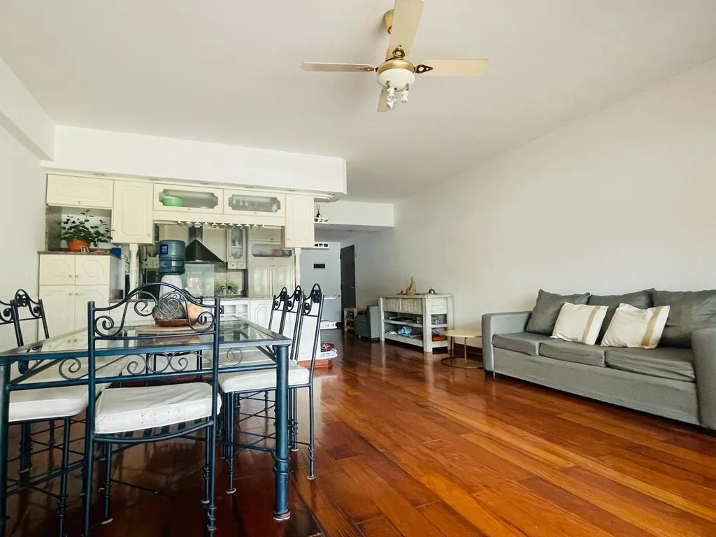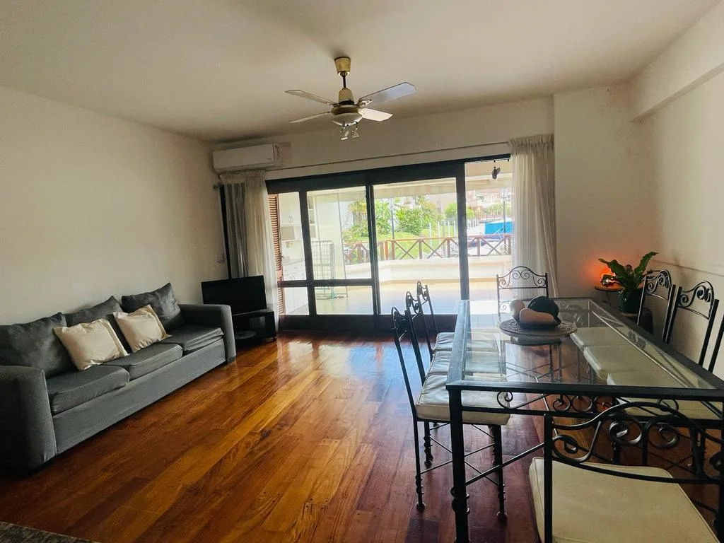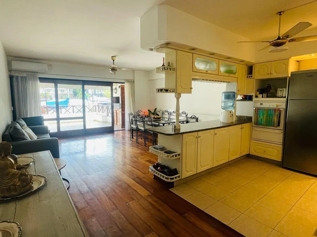 Two-bedroom apartment for rent in Victoria. It has a living-dining room with cold/hot air conditioning, a balcony terrace with river view, and a fully equipped integrated kitchen with a ceiling fan. The unit also has two bedrooms with air conditioning; the main bedroom includes a ceiling fan and wardrobe, while the second bedroom includes a desk and wardrobe. Floors are wooden throughout, with heating via panel heaters. There is a full bathroom, a laundry area, and a covered BBQ area with a gril