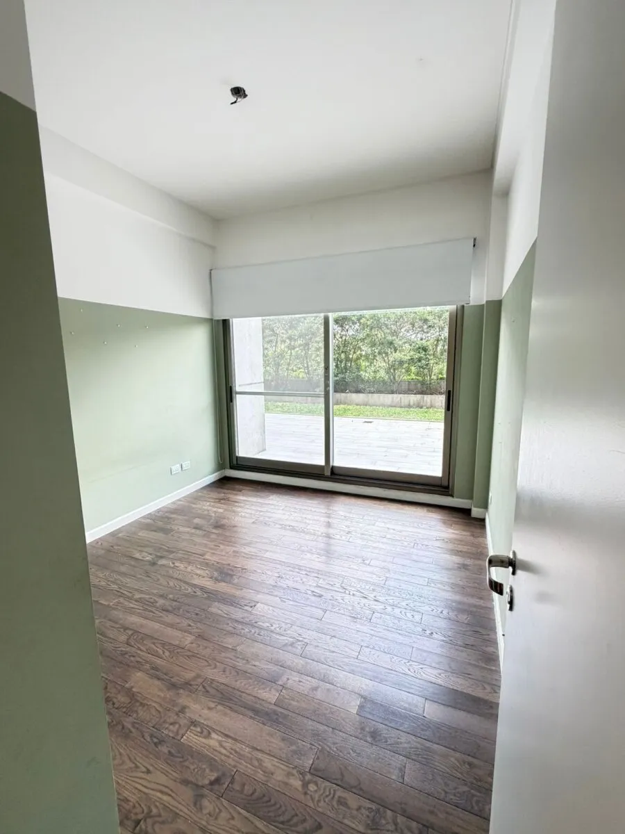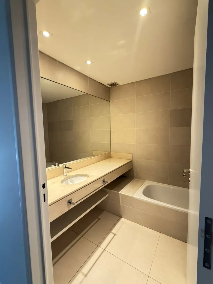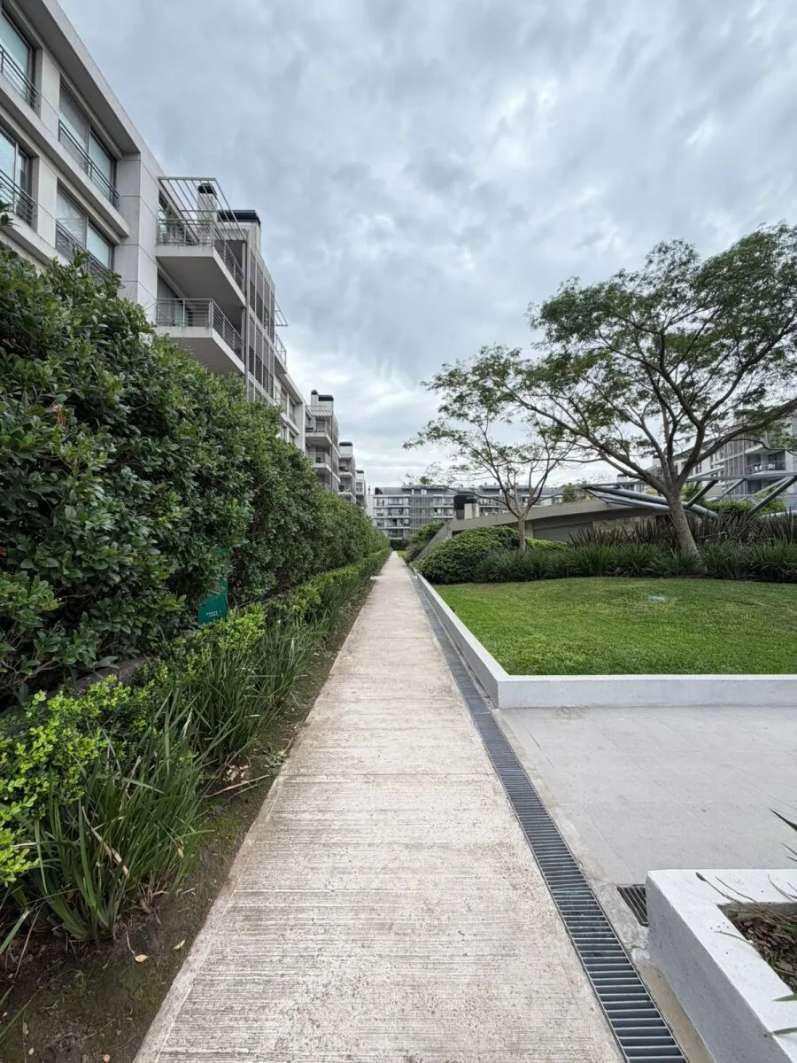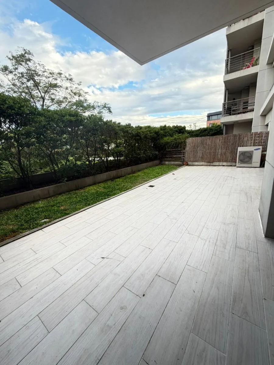 Ground-floor three-room apartment with a private garden. It has 2 bedrooms, one en suite with a dressing area and full bathroom, plus a second bedroom with an additional bathroom. Living and dining with an integrated kitchen, air conditioning units in the living room and bedrooms, and hot-cold air heating. There is a private grill and (assigned) parking space with a storage room. The Arboris complex offers a pool, sauna, communal room (SUM), and a gym, with 24-hour security.