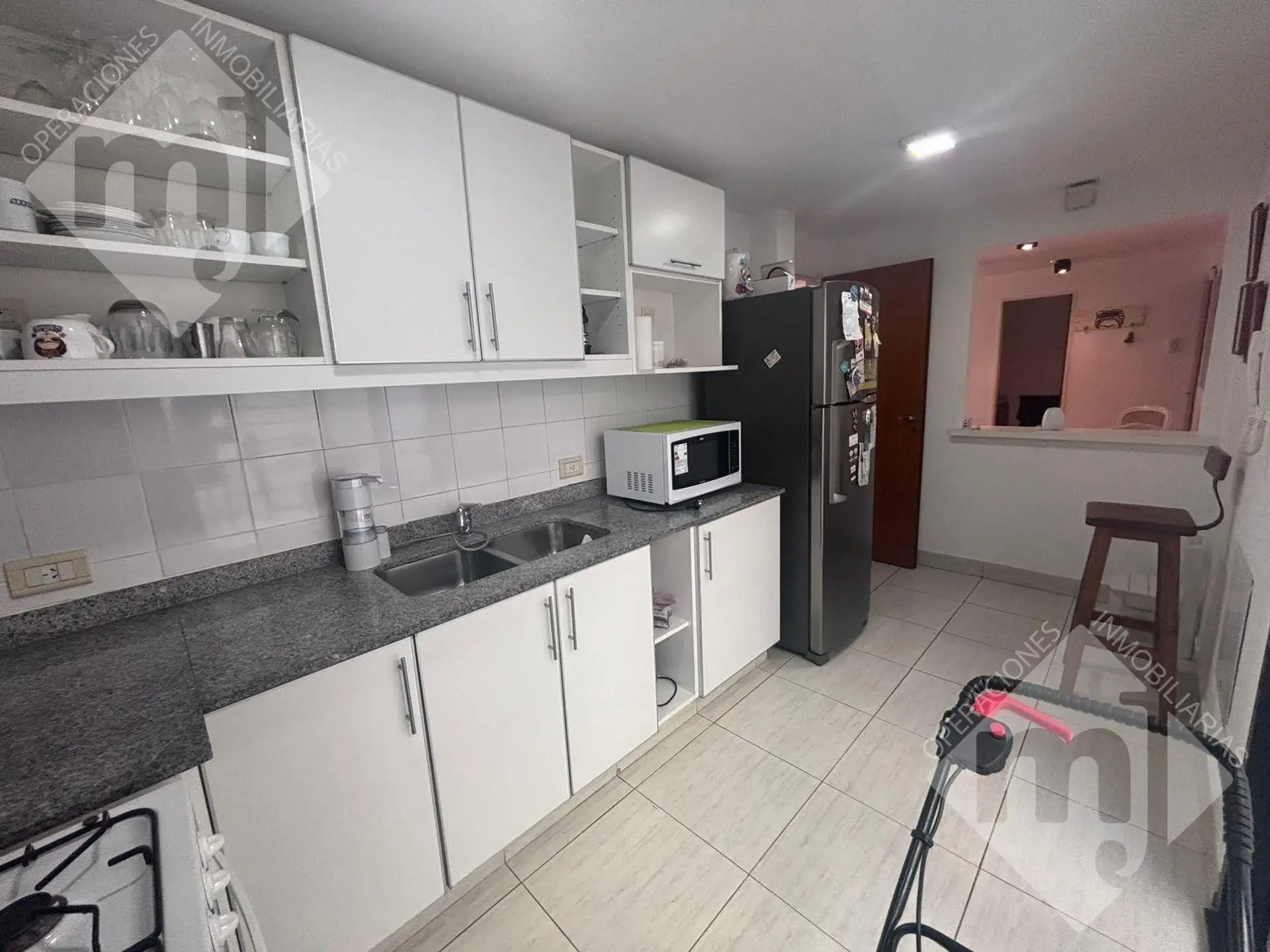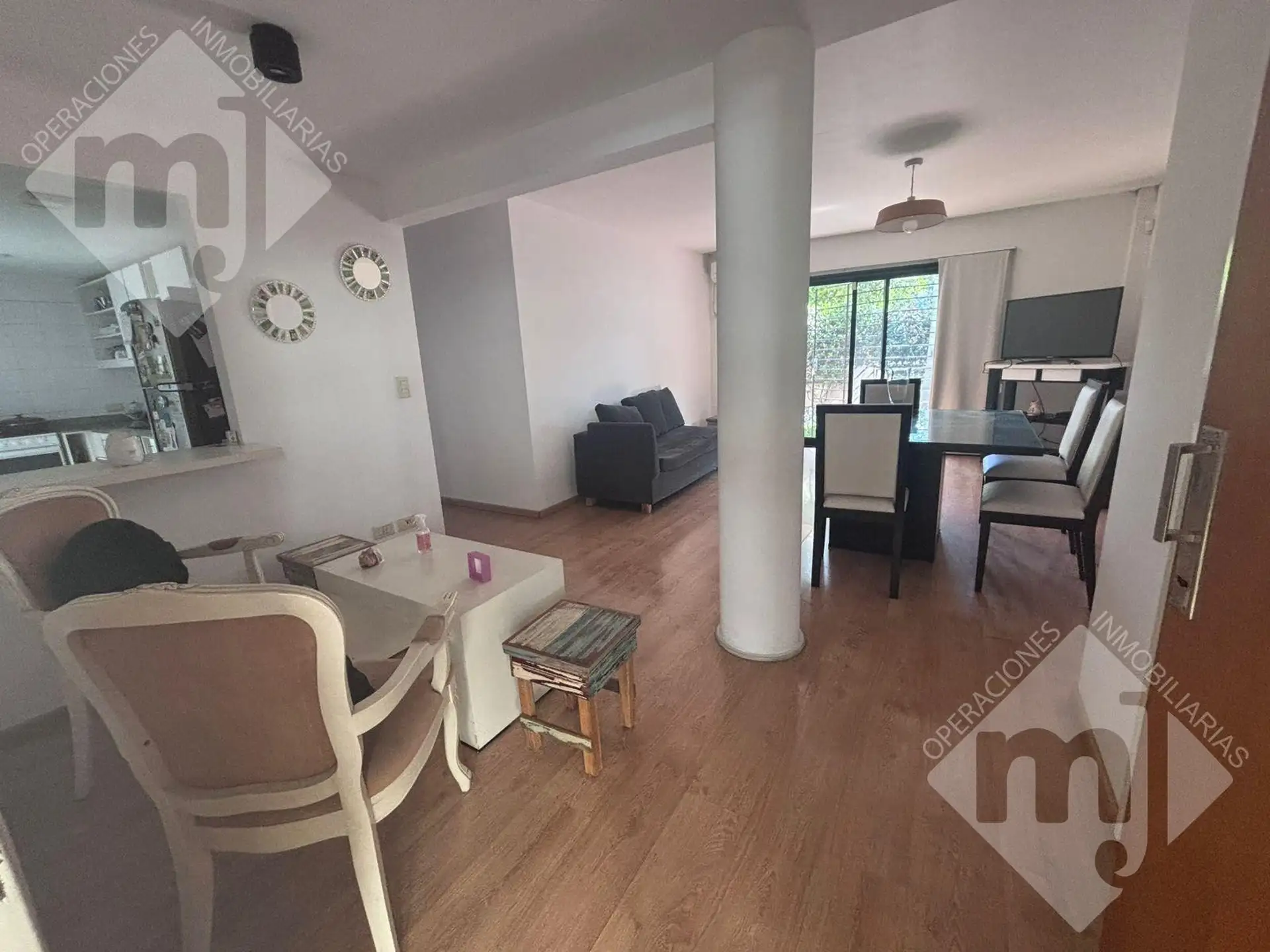 Ground-floor apartment in a residential complex in Punta Chica, near Av. Libertador. The unit has a living-dining room with direct access to a private garden, a semi-integrated kitchen with a breakfast bar, and an internal patio with a laundry area. It includes 2 bedrooms with built-in wardrobes and an uncovered parking space with independent access. The complex has a communal solarium and pool. Building fees are $150,000 and ABL is $65,000.