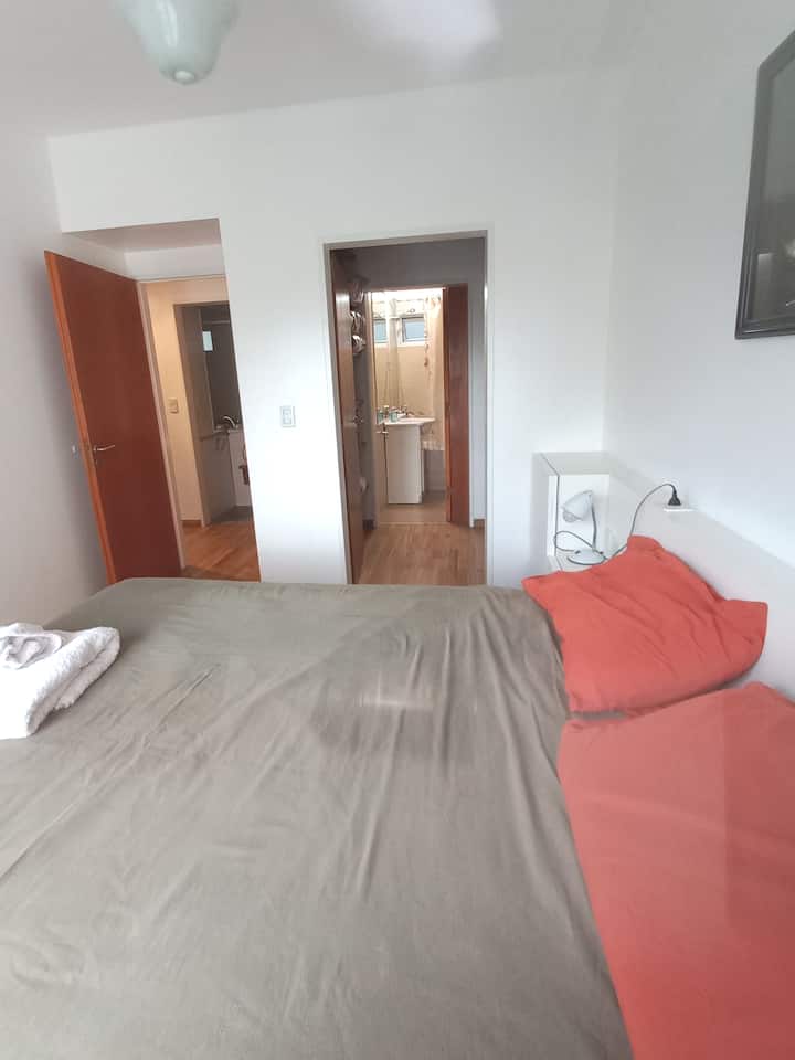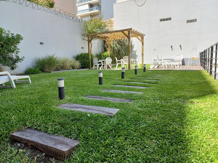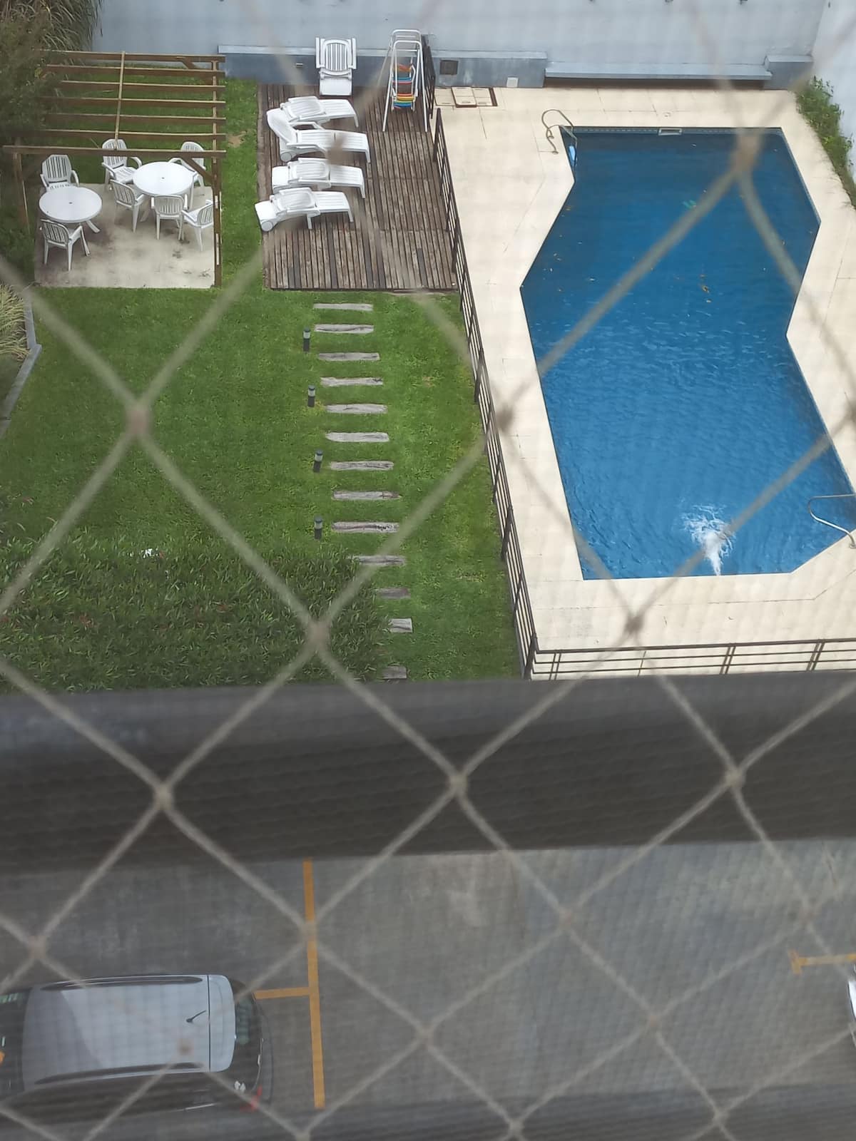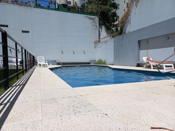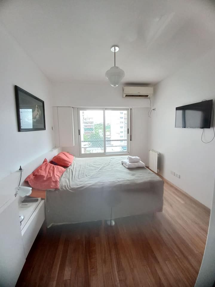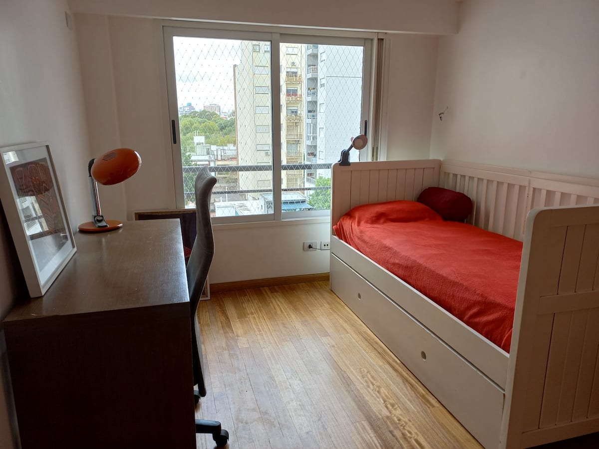 Two-bedroom apartment in Villa Crespo. The building has a garden, pool, gym and a communal room (SUM). The master bedroom has an en-suite bathroom, a walk-in closet and a queen bed; the second room has a single bed plus a trundle bed and a desk. The living room opens to a balcony overlooking the pool, other terraces and the garden, with a fully equipped kitchen. The apartment is 2 blocks from Parque Centenario.