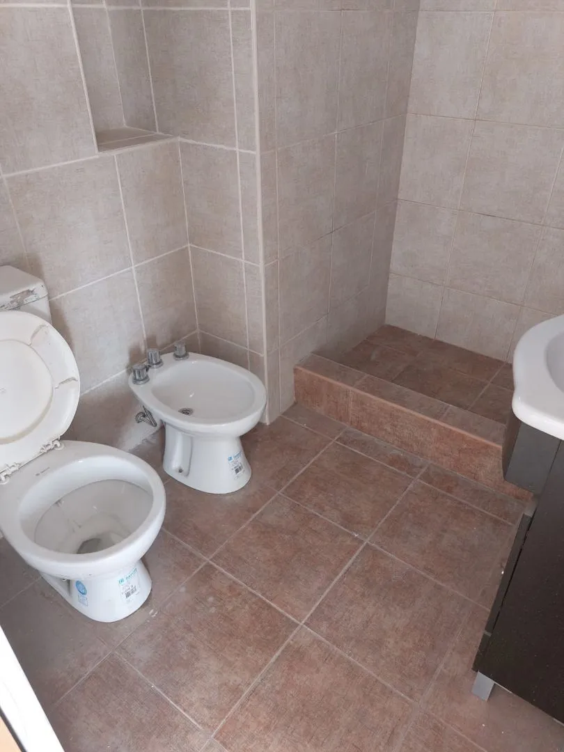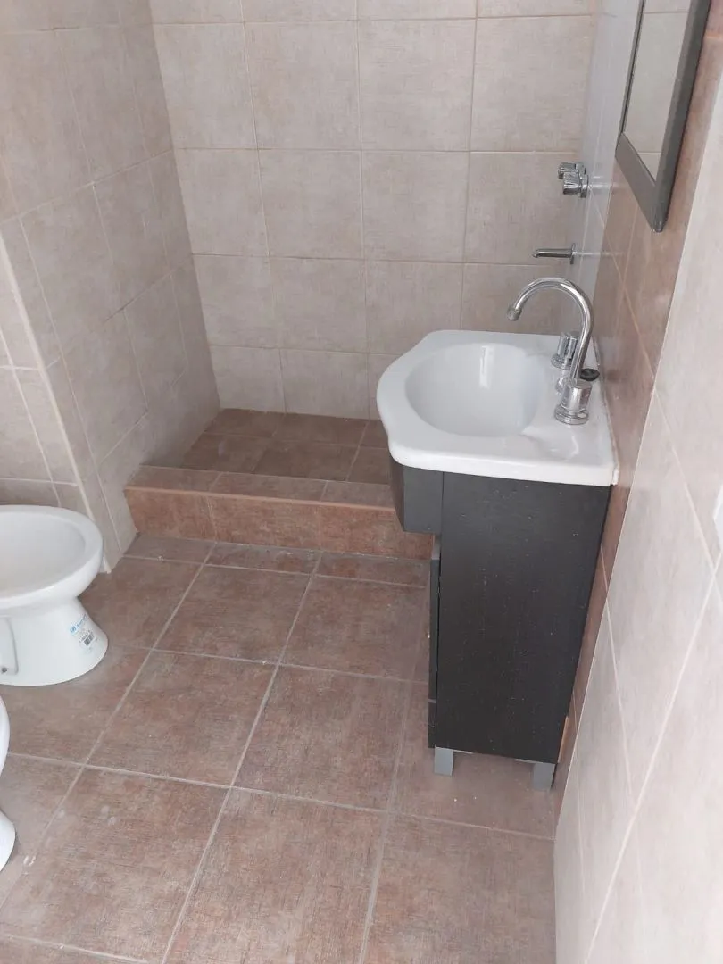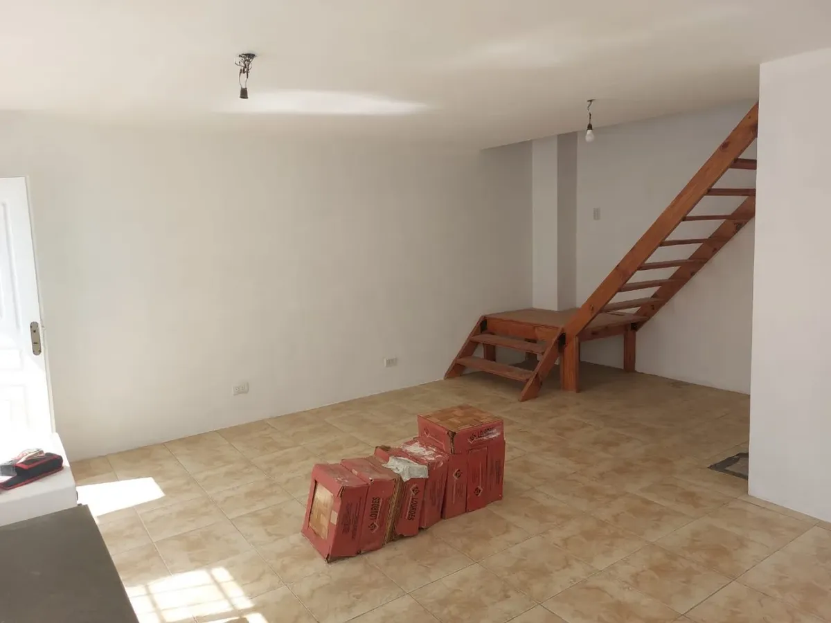 PH for rent in Valentín Alsina, Lanús. It is accessed by stairs from the street and is set on the first floor, spread over two levels. Ground floor includes a 4 m by 5.74 m kitchen-dining area with stairs to the bedrooms and a bathroom measuring 2.23 m by 1.63 m. The first-floor level has two bedrooms (3.23 m by 3.86 m and 3.81 m by 2.34 m) and a study space (2.11 m by 1.73 m).