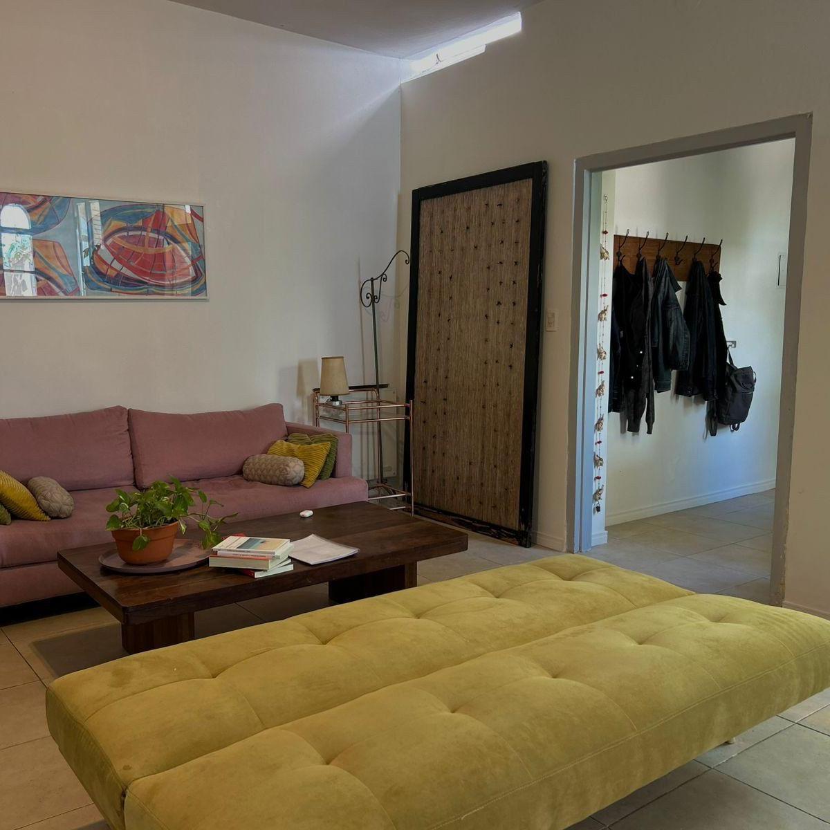 PH in Villa Ortúzar, ground-floor or upper unit with private entrance, with 140 m² covered and 70 m² semi-covered/open m². Furnished. The layout includes two ground-floor patios, a separate kitchen with breakfast bar, a guest toilet, a large living-dining room, and a laundry area with a washing machine. There are 2 bedrooms: one on the 1st floor with a full bathroom (double vanity, bathtub and shower), and another on the 2nd floor with an additional toilet and two terraces. The rental is approve