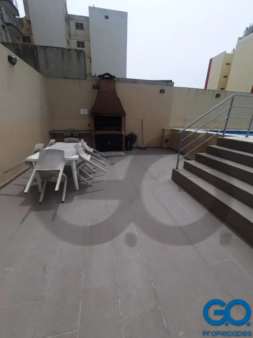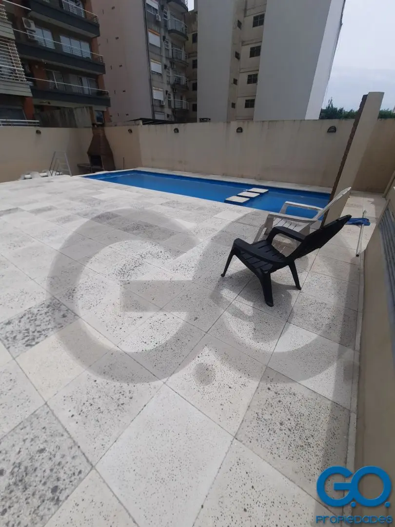 Furnished three-room apartment with 2 bedrooms on the 10th floor, street-facing on Av. Monroe with open views. The unit has a large living-dining area with a semi-integrated kitchen ventilating to an interior patio, a full bathroom, and built-in wardrobes in both bedrooms. A continuous front balcony. Amenities include a pool with solarium and a grill on the first floor, plus a laundry room on the 12th floor. Equipment listed includes a fridge, coffee maker, blender and toaster; air conditioning