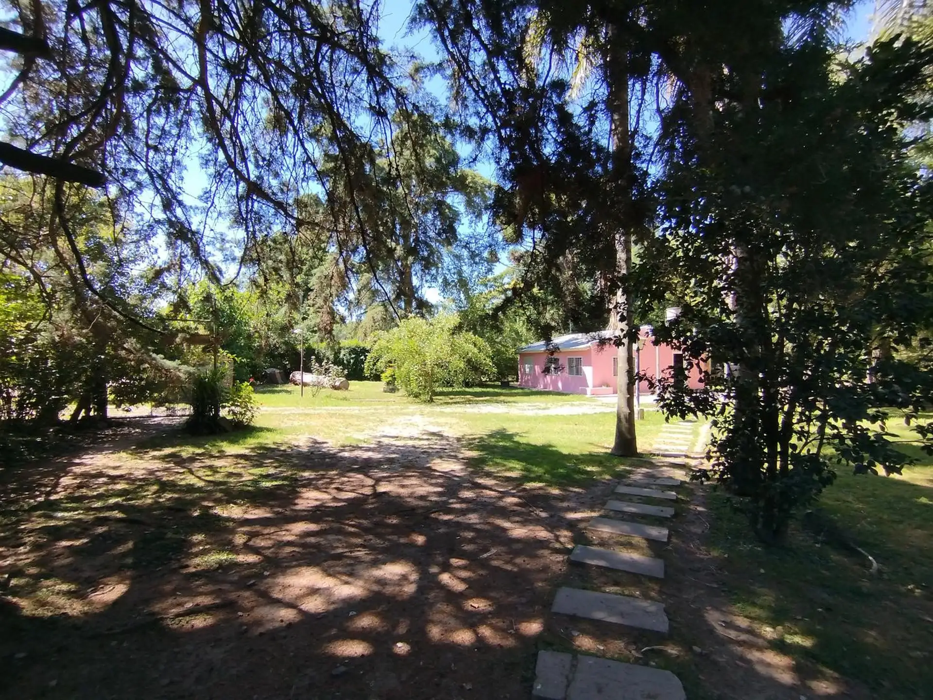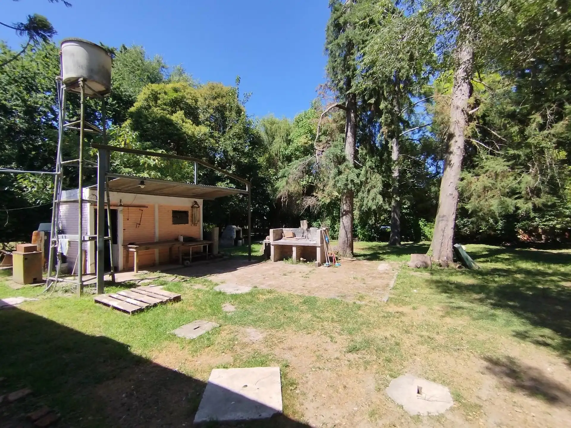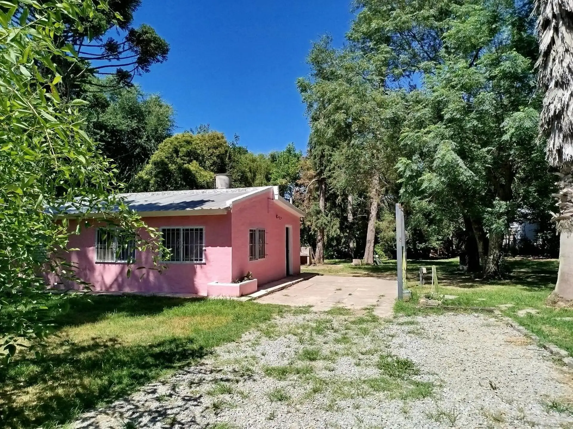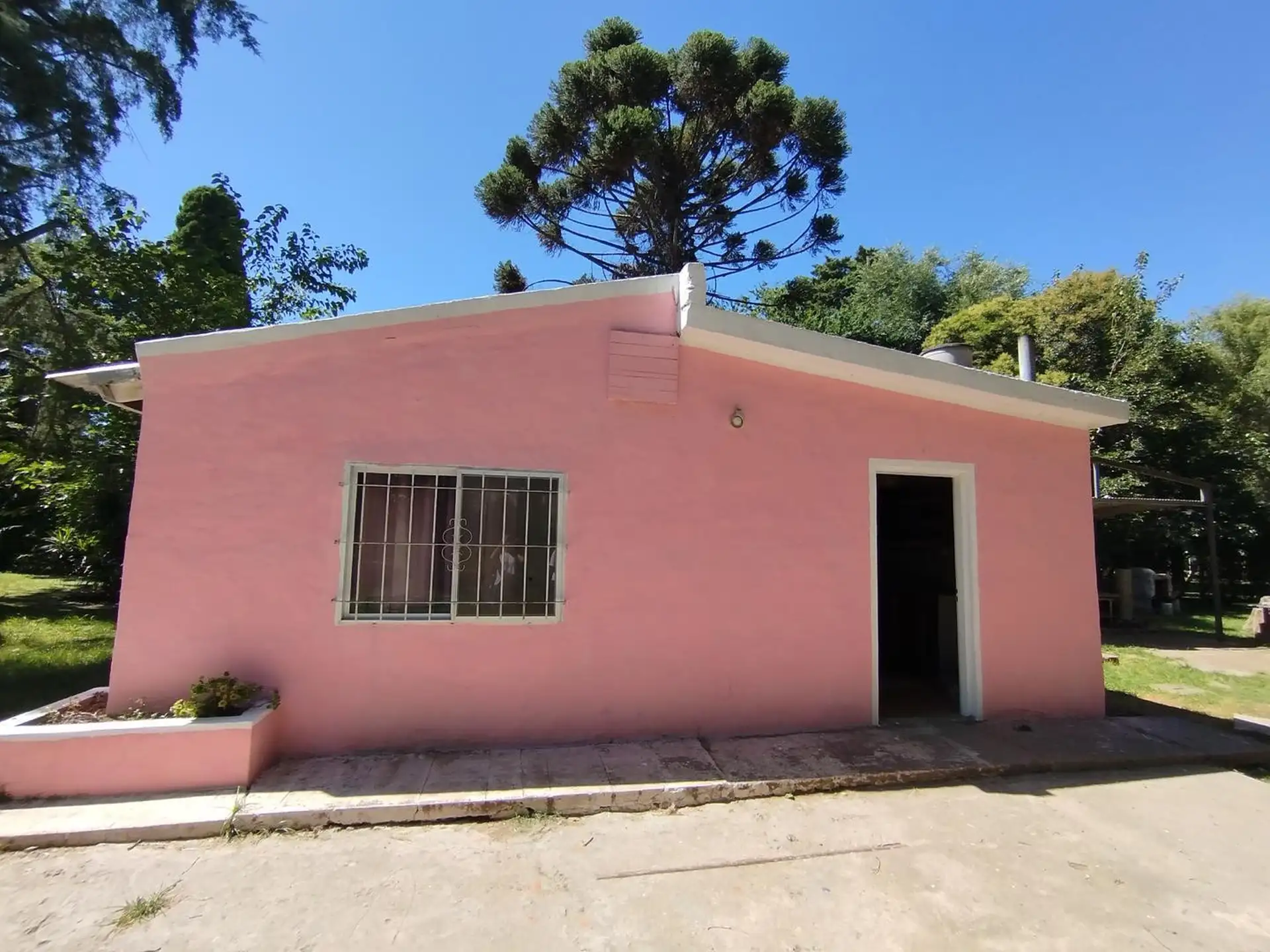 House with 2 bedrooms and 1 bathroom. Separate kitchen-dining area with air conditioning. Includes a small outbuilding (galponcito), a grill area and a landscaped, tree-filled garden, plus a communal-use annex (SUM).