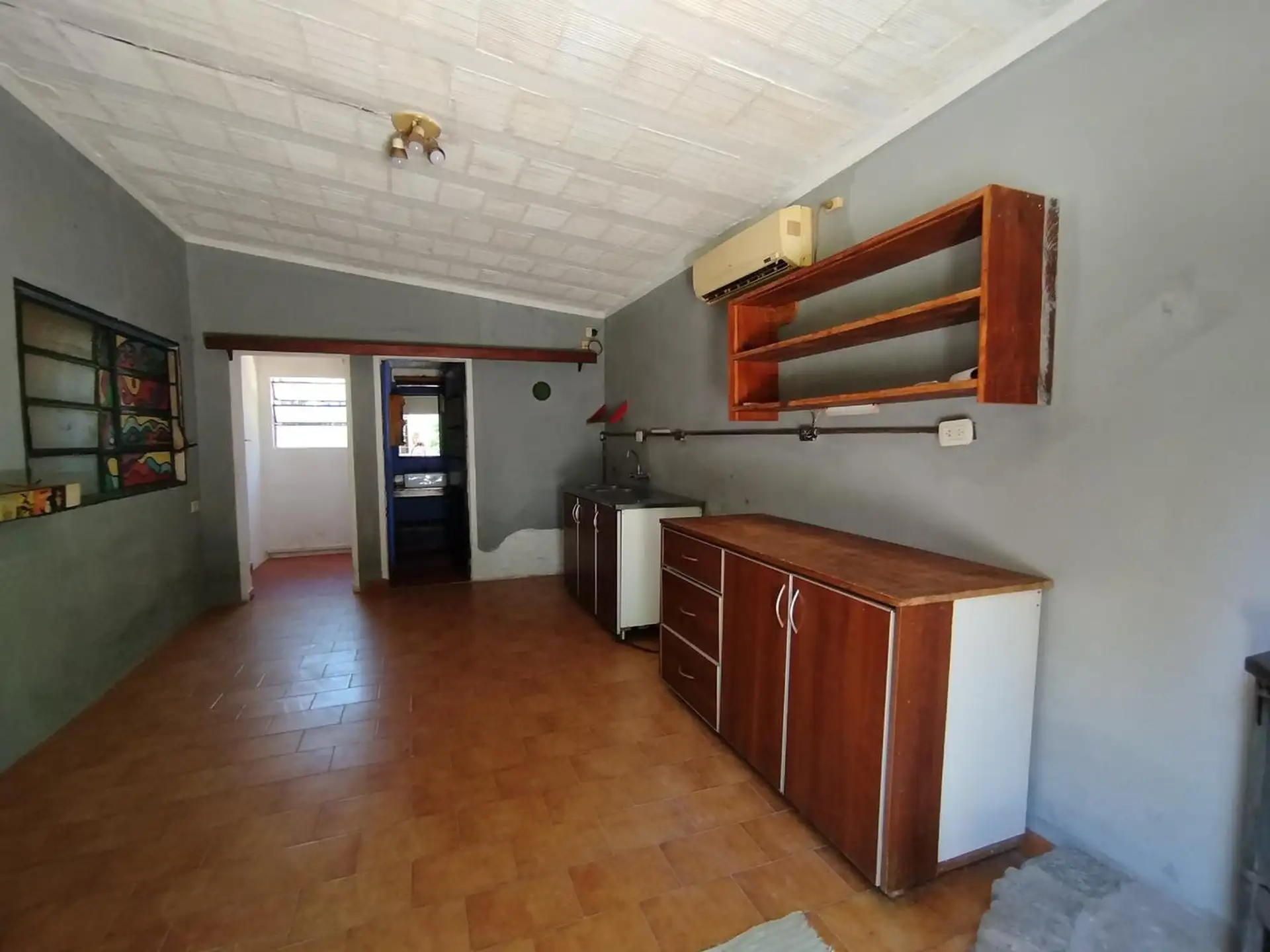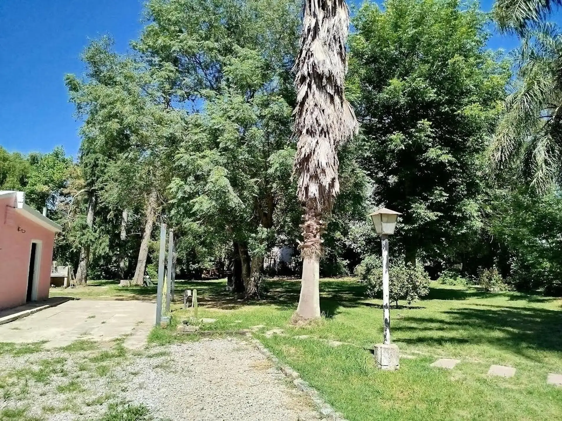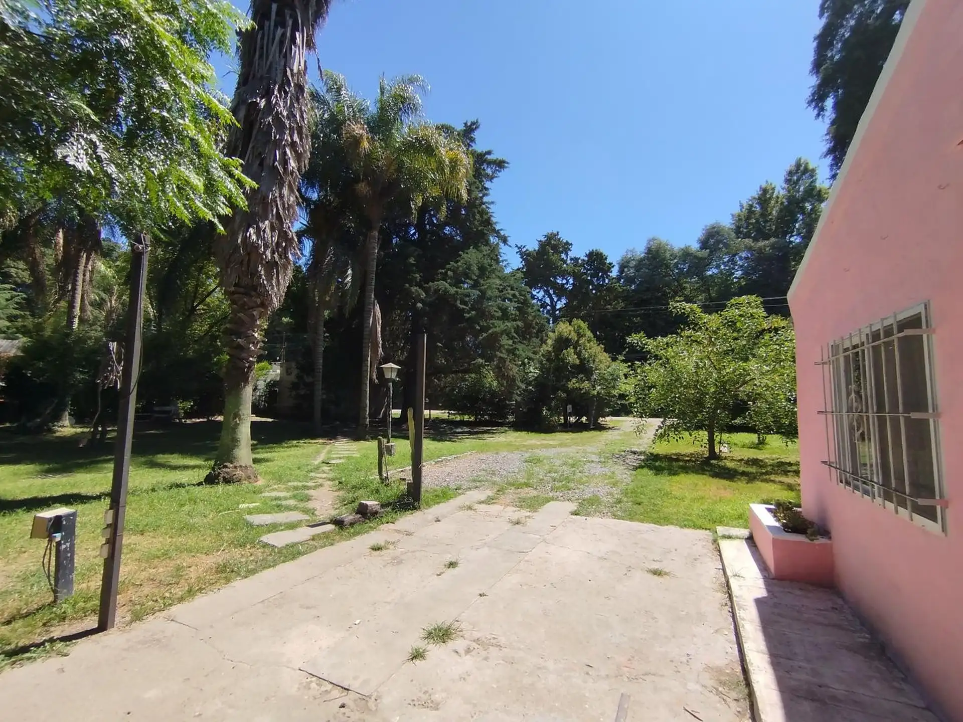 House with 2 bedrooms and 1 bathroom. Separate kitchen-dining area with air conditioning. Includes a small outbuilding (galponcito), a grill area and a landscaped, tree-filled garden, plus a communal-use annex (SUM).