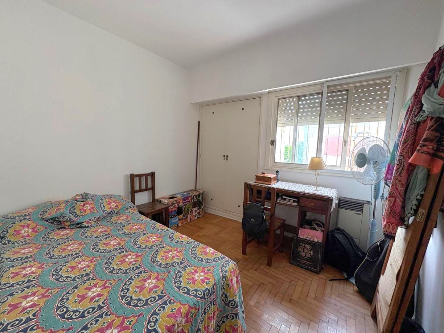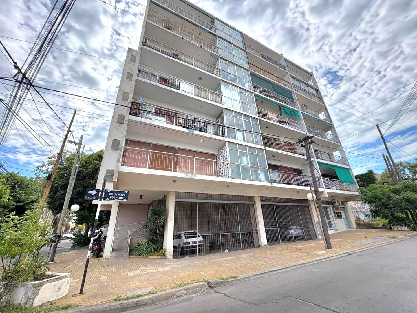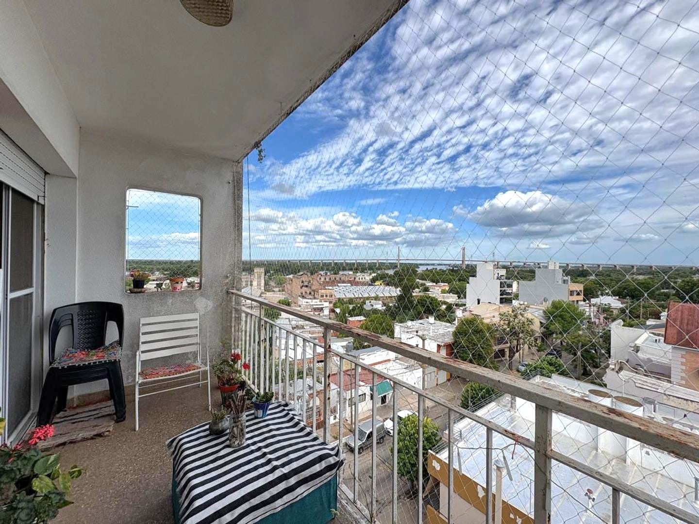 Apartment for rent in the BETINA I building at Castelli 409, 5th floor in central Zárate. The unit has 2 bedrooms with built-in closets, a full bathroom, a separate kitchen with space for a laundry area, and a living-dining room with a window to a semi-covered balcony facing the front of the building with views of the Zárate Brazo Largo bridge. Hot water comes from a caléfón and heating is via a balanced-flue system; ceiling fans are installed in the bedrooms. Includes a storage room on the terr