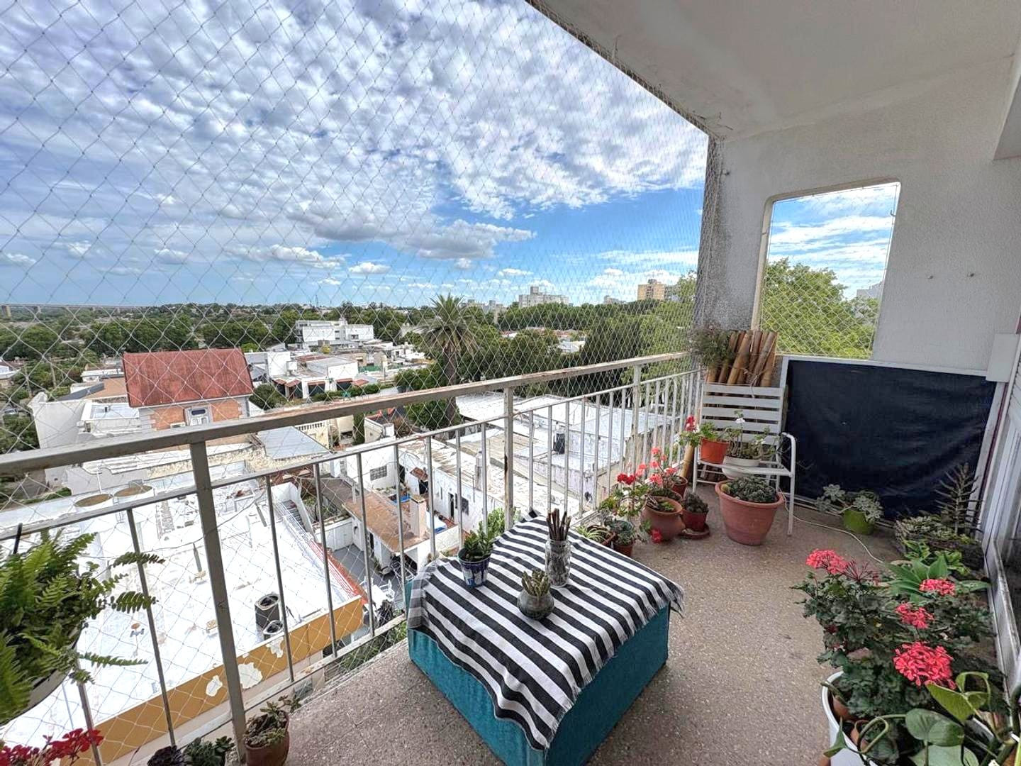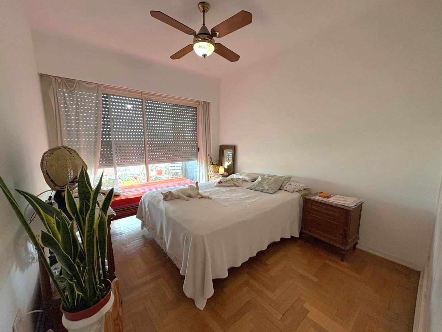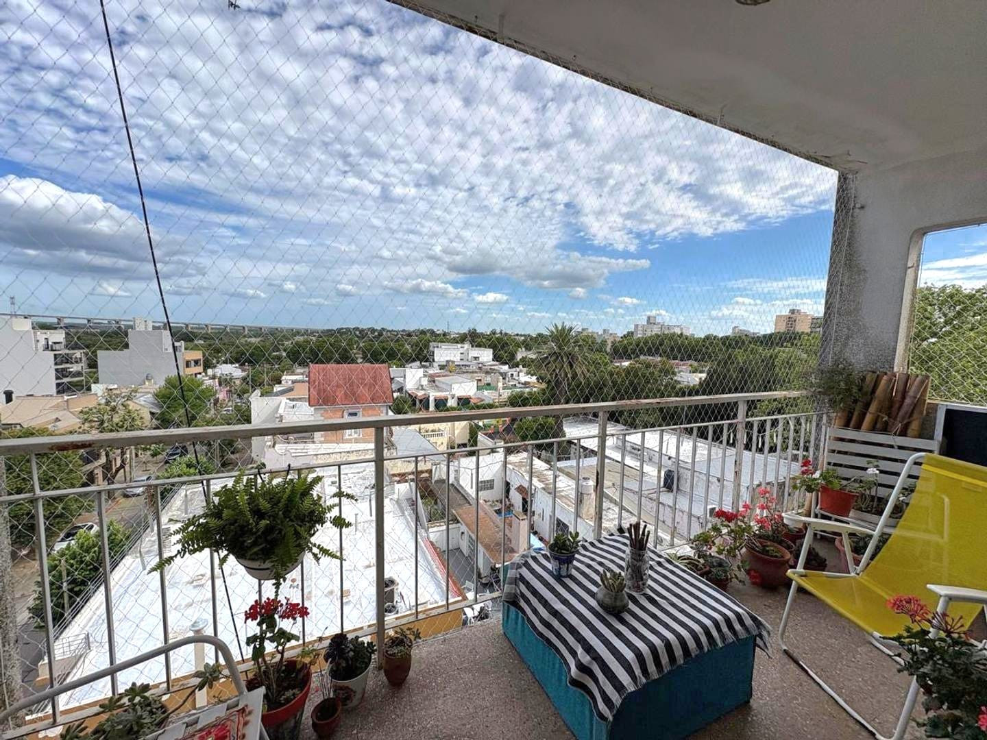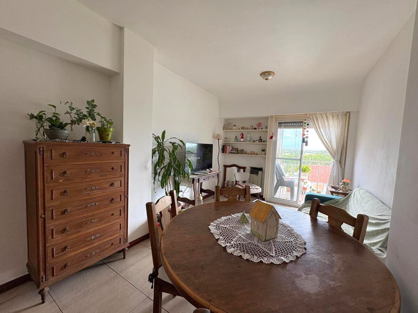 Apartment for rent in the BETINA I building at Castelli 409, 5th floor in central Zárate. The unit has 2 bedrooms with built-in closets, a full bathroom, a separate kitchen with space for a laundry area, and a living-dining room with a window to a semi-covered balcony facing the front of the building with views of the Zárate Brazo Largo bridge. Hot water comes from a caléfón and heating is via a balanced-flue system; ceiling fans are installed in the bedrooms. Includes a storage room on the terr
