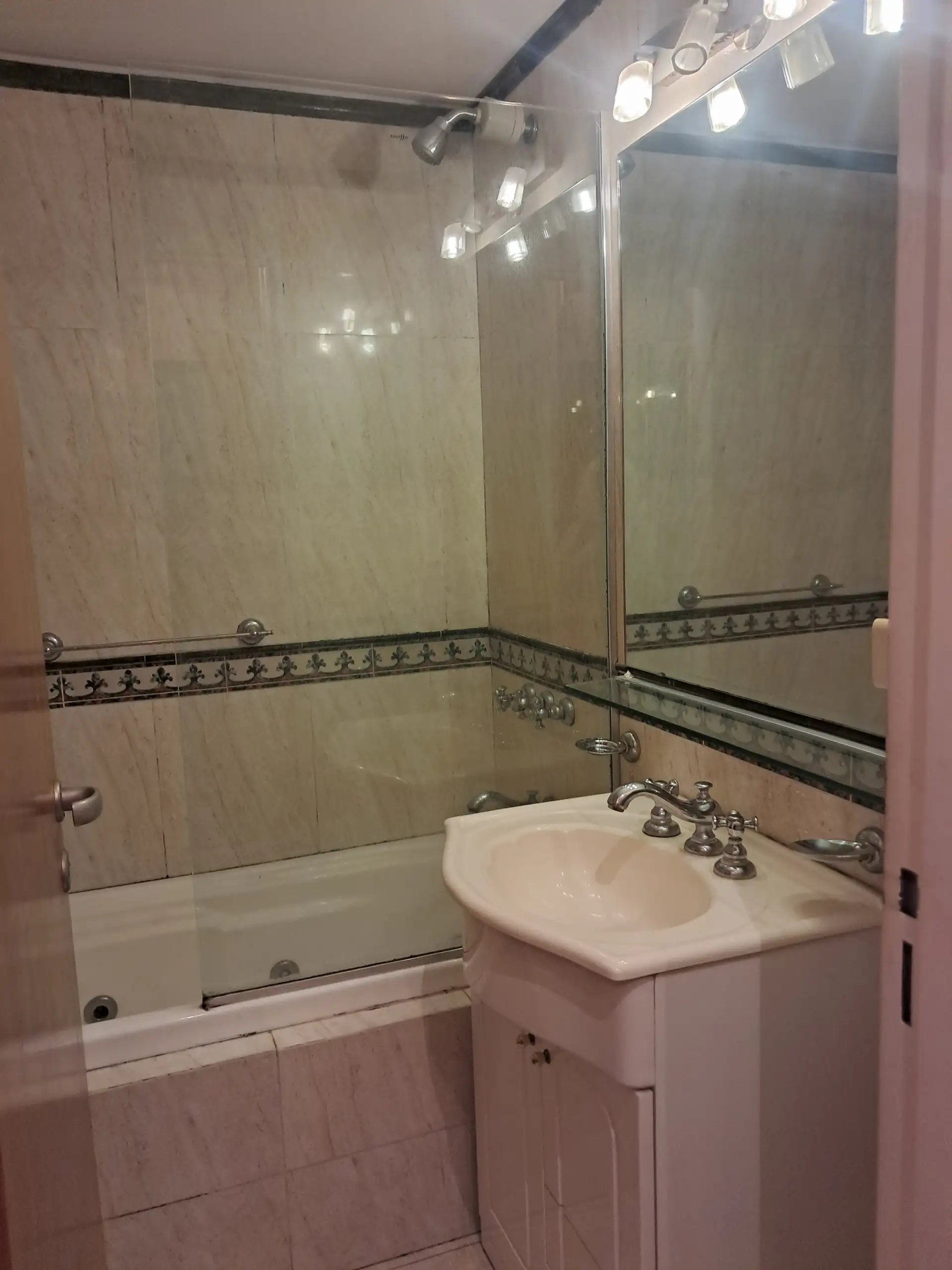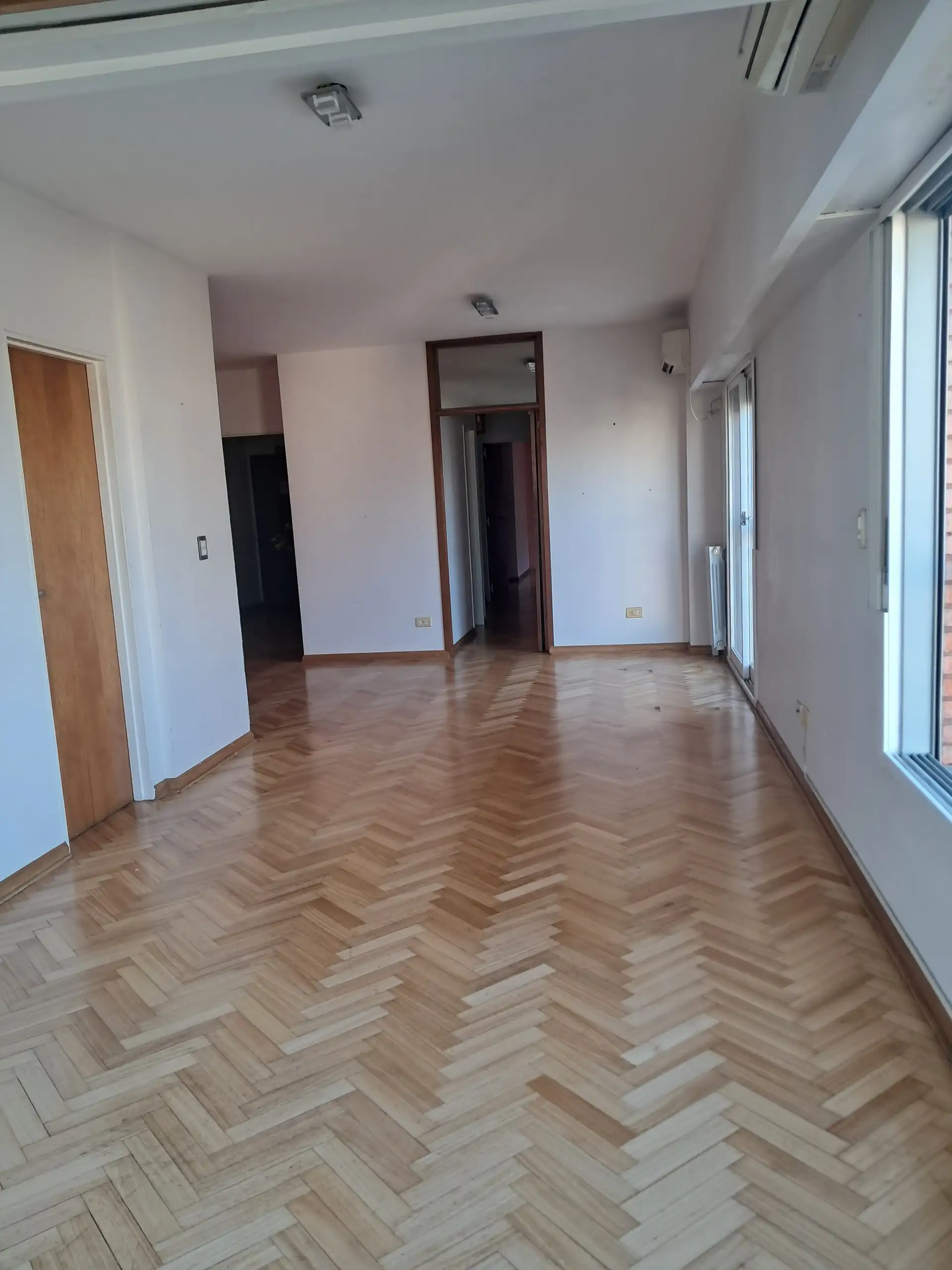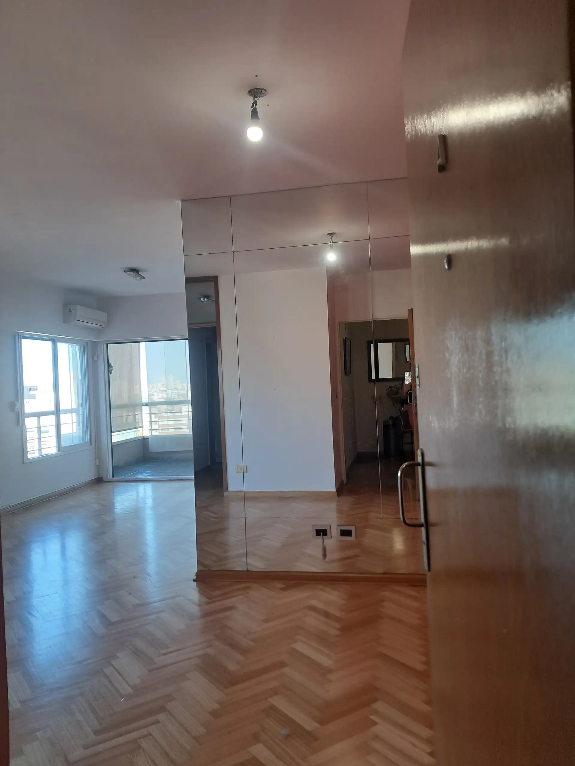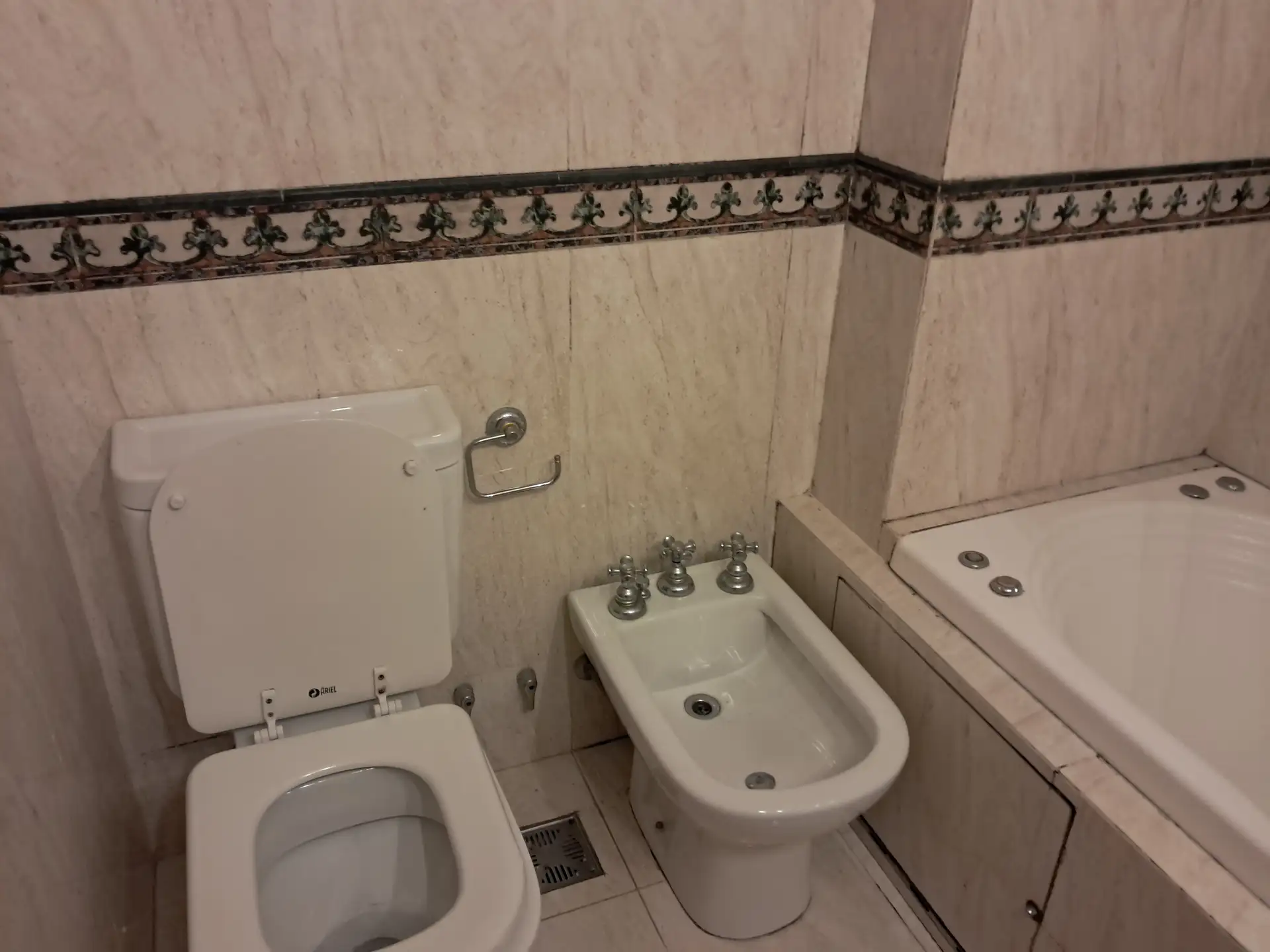 Three-bedroom apartment with a large living room at the building’s upper levels. Includes a street-facing balcony with sliding blinds, separate dining kitchen with daily-meal area, laundry area, a guest toilet, and a full bathroom plus an en-suite bedroom with dressing room and hydro-massage shower. Hot water is provided by an individual boiler; parquet floors with plastified guatambú, air conditioning in all rooms, and cable/TV connections in all rooms. The unit has a fixed, covered (assigned)
