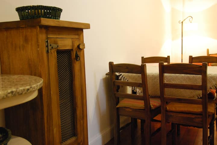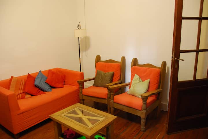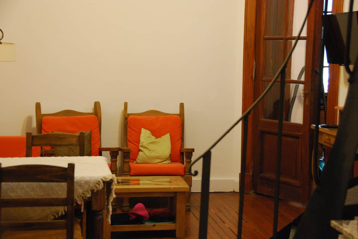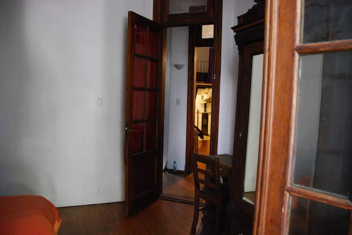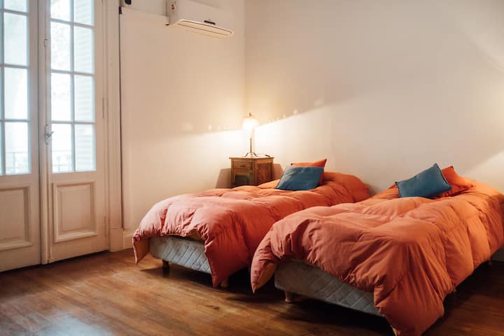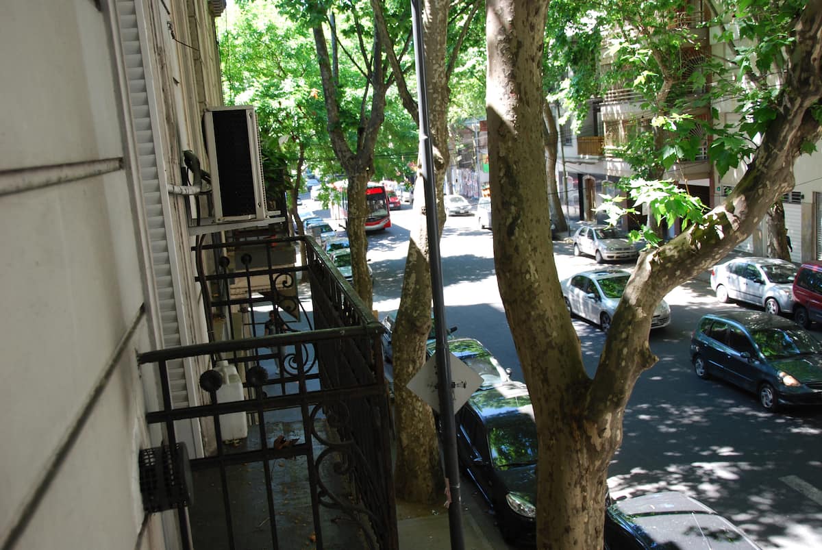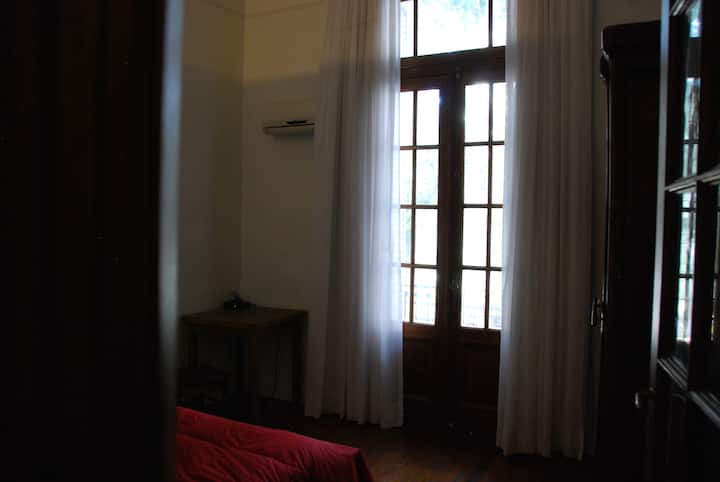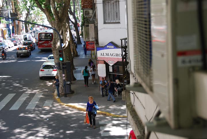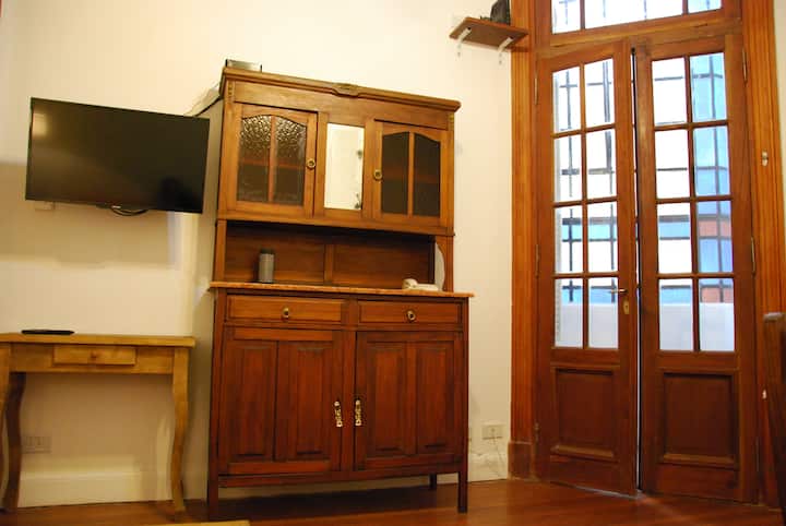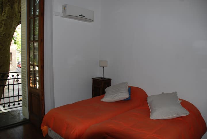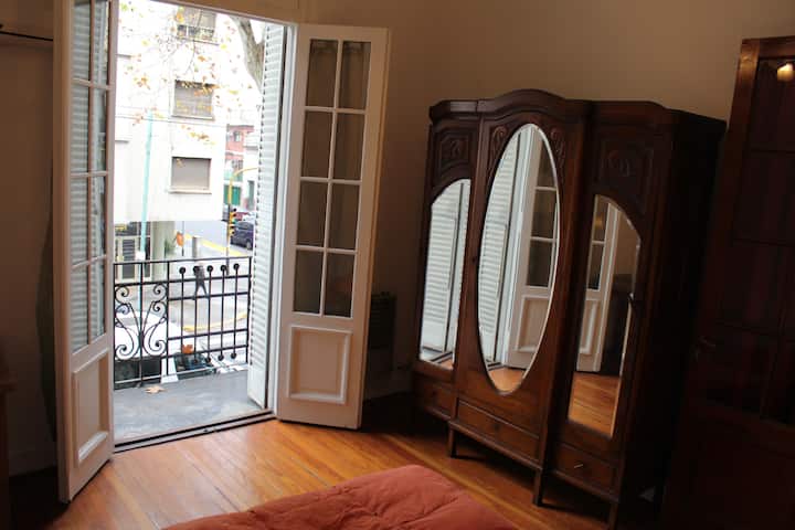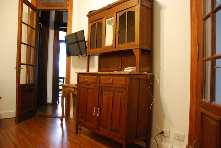Apartment in a early-20th-century building in Almagro with high ceilings and balconies. Restored with original-style wooden windows, doors and floors. Second-floor unit with air conditioning, Cable TV and high-speed WiFi, plus a full kitchen and dining area.