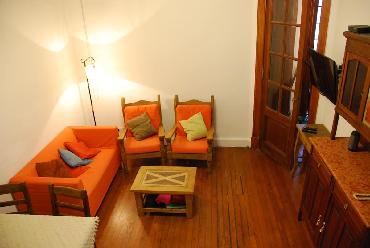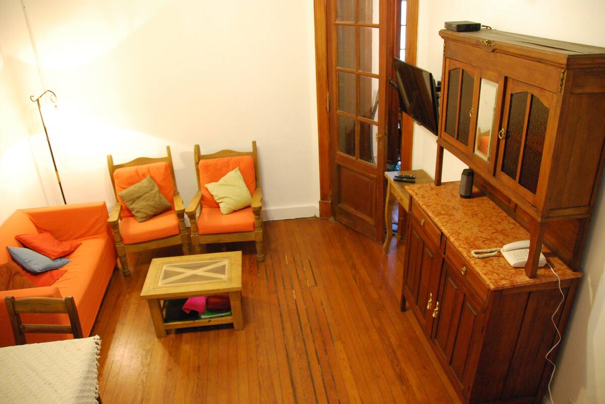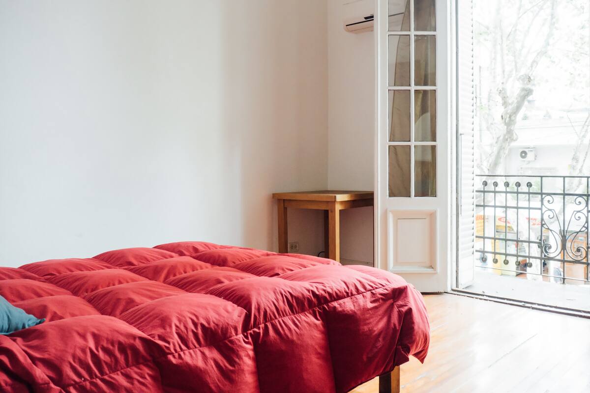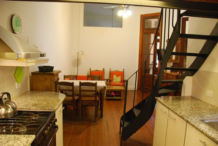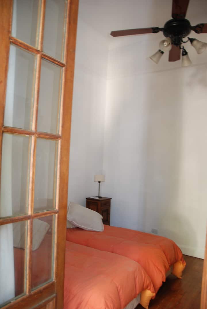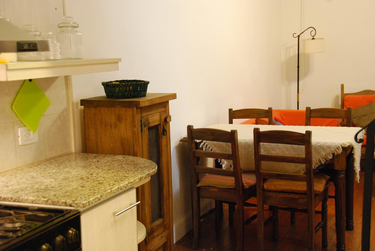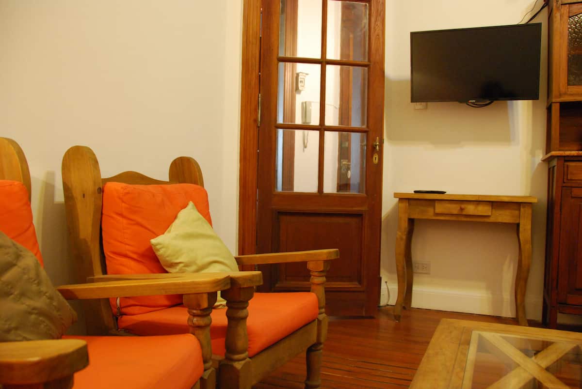 Apartment in a early-20th-century building in Almagro with high ceilings and balconies. Restored with original-style wooden windows, doors and floors. Second-floor unit with air conditioning, Cable TV and high-speed WiFi, plus a full kitchen and dining area.