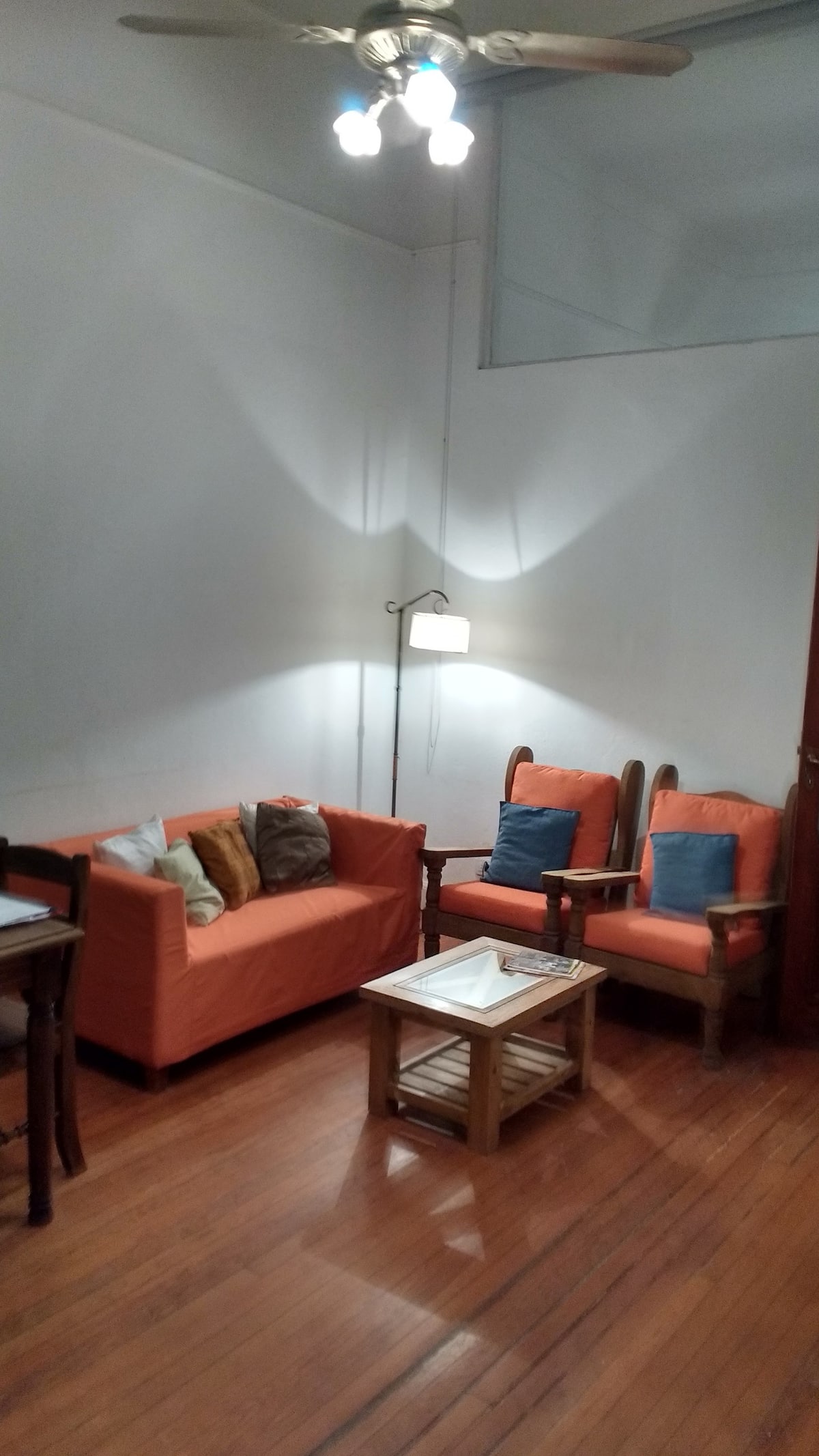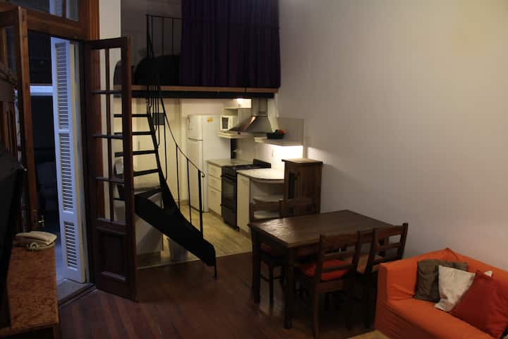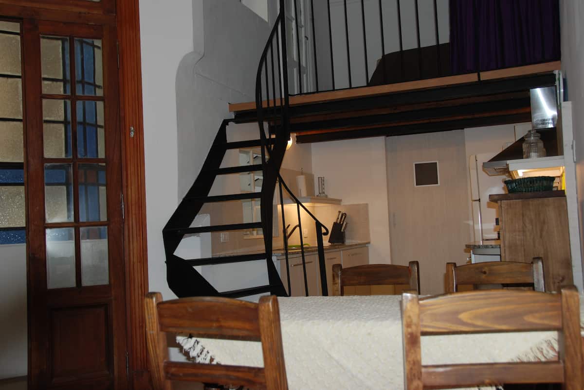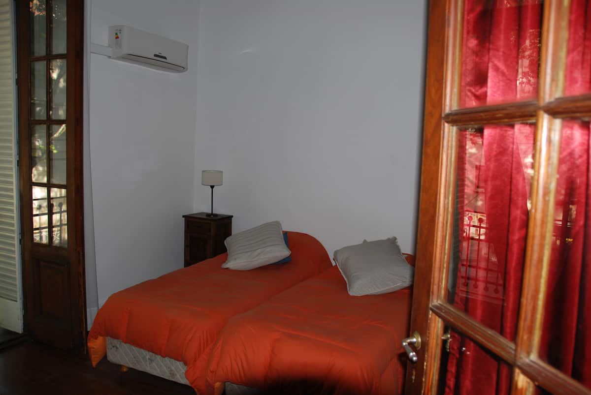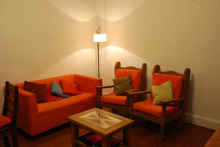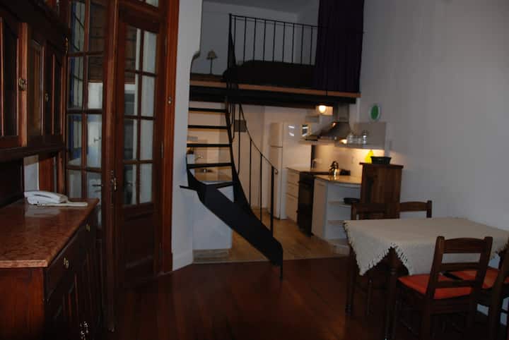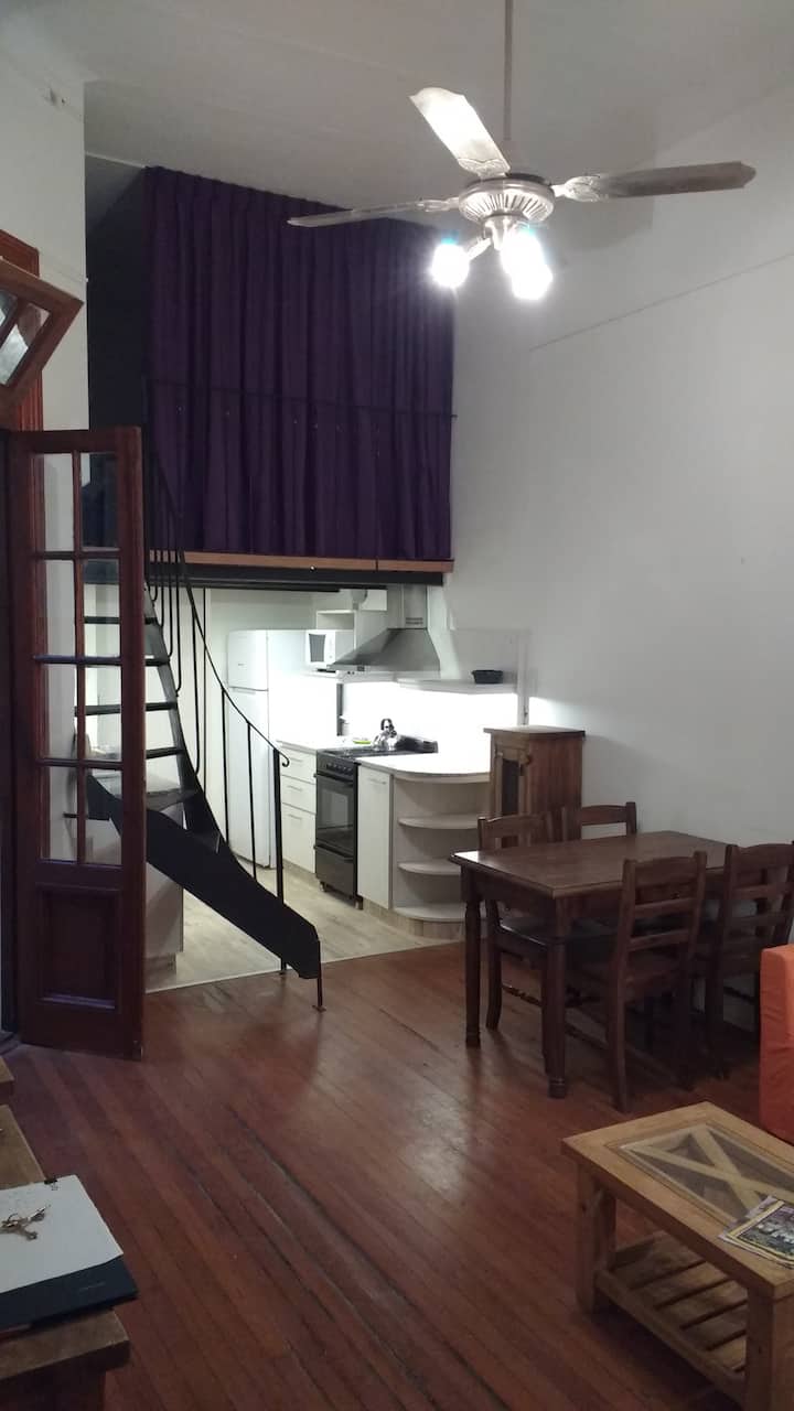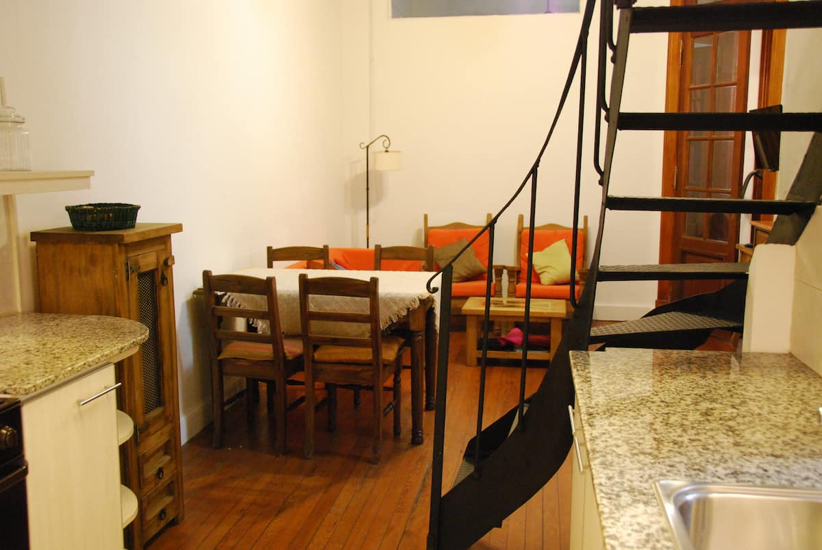 Apartment in a early-20th-century building in Almagro with high ceilings and balconies. Restored with original-style wooden windows, doors and floors. Second-floor unit with air conditioning, Cable TV and high-speed WiFi, plus a full kitchen and dining area.