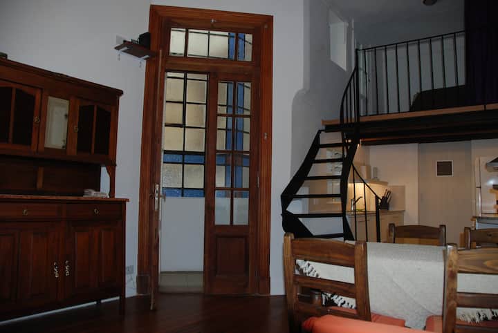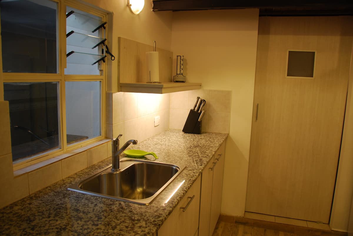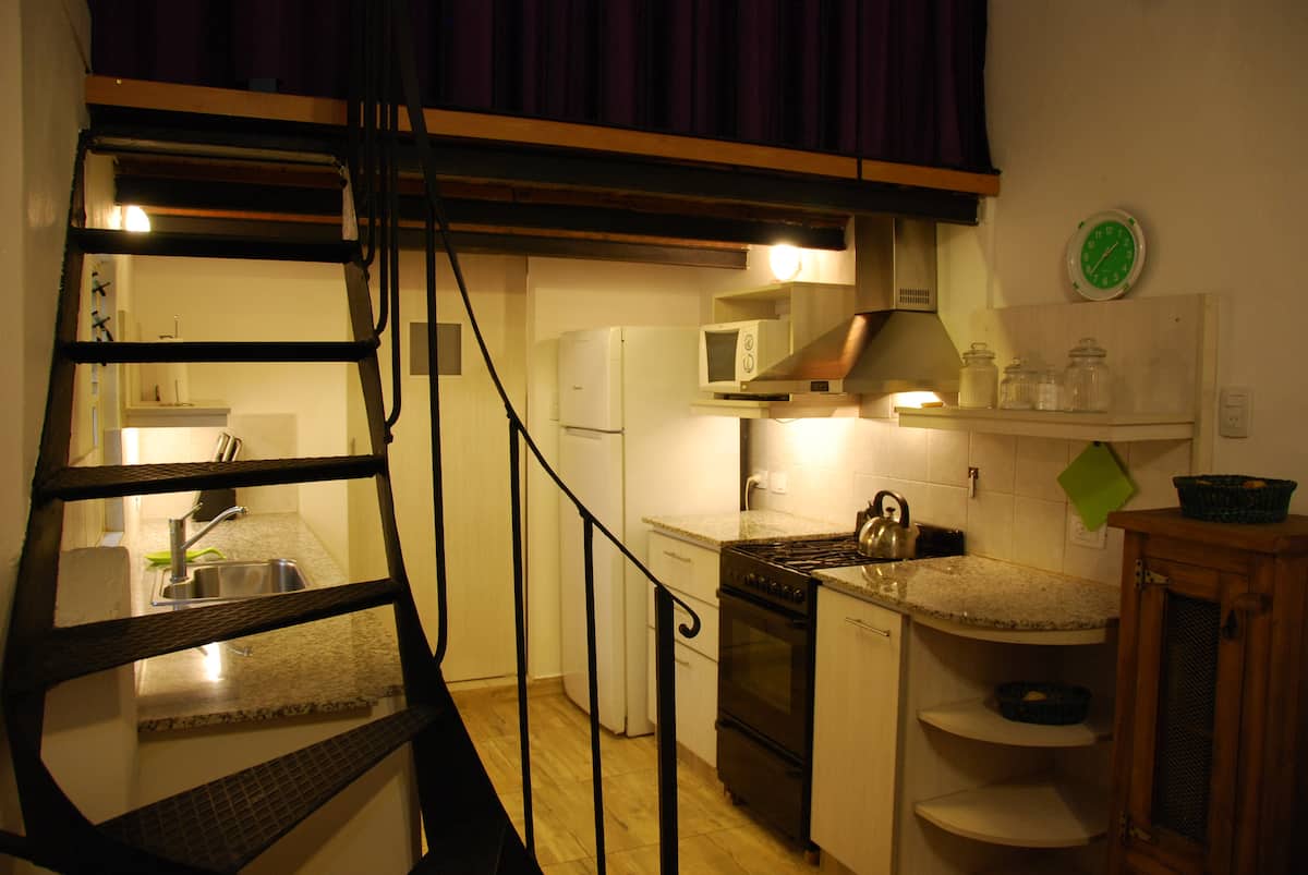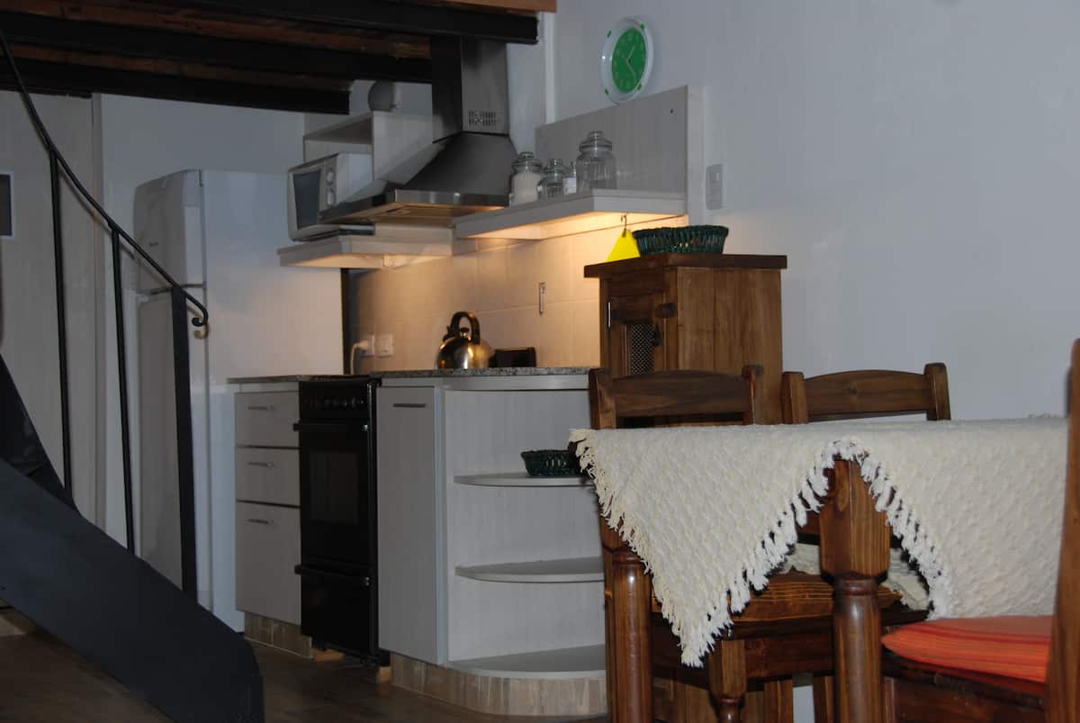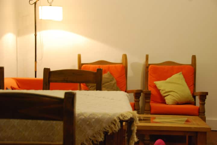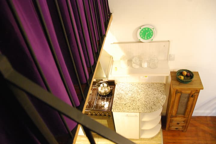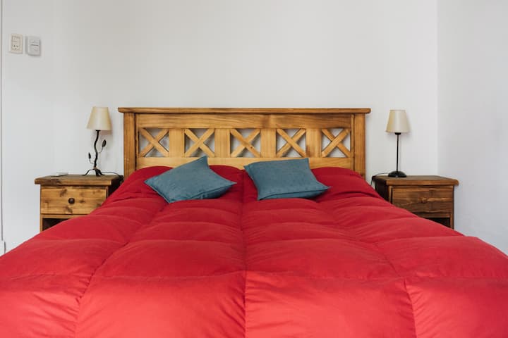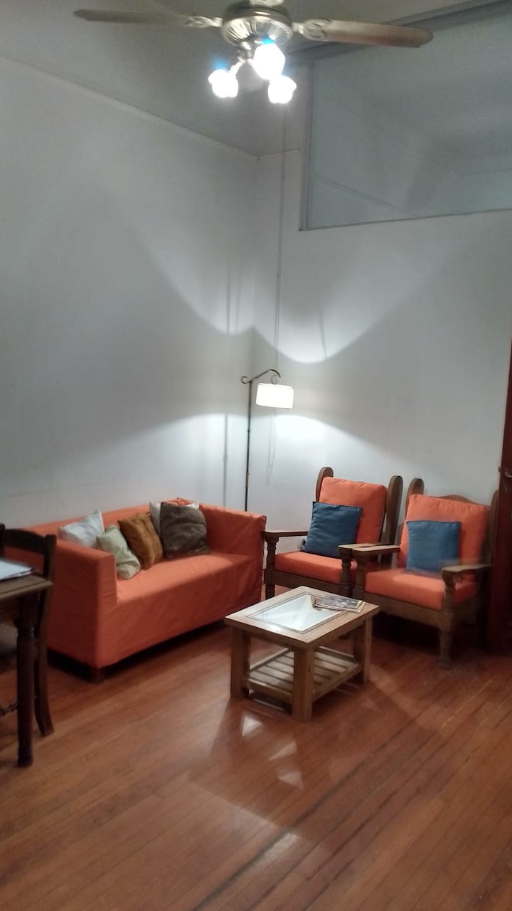 Apartment in a early-20th-century building in Almagro with high ceilings and balconies. Restored with original-style wooden windows, doors and floors. Second-floor unit with air conditioning, Cable TV and high-speed WiFi, plus a full kitchen and dining area.