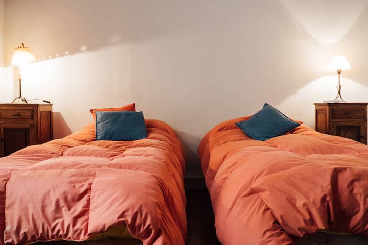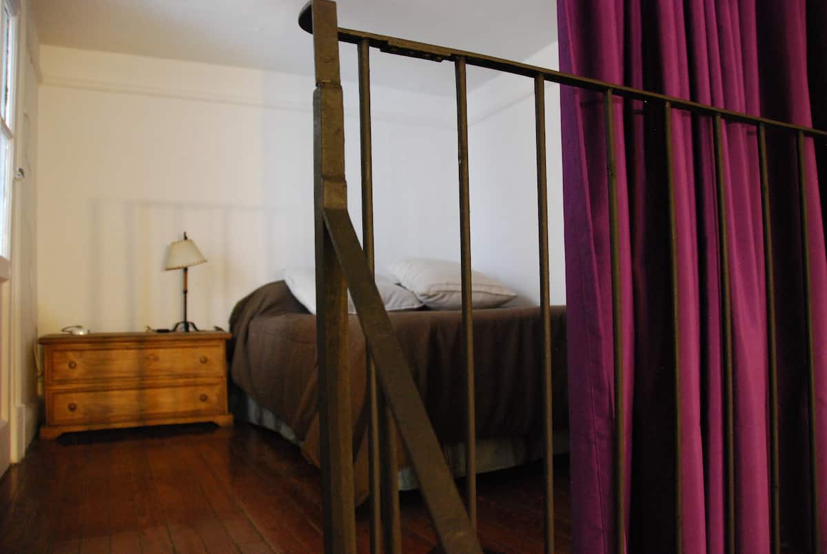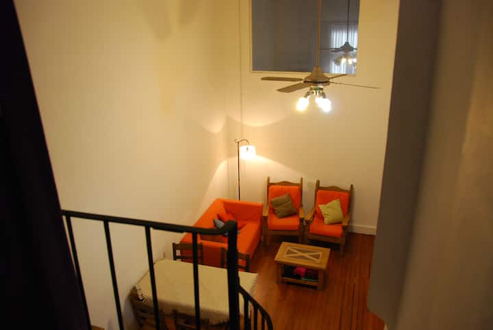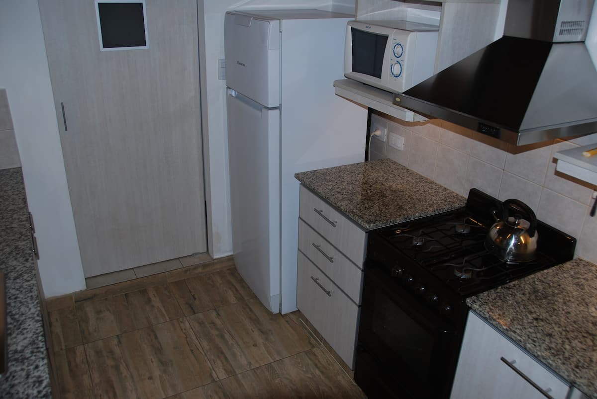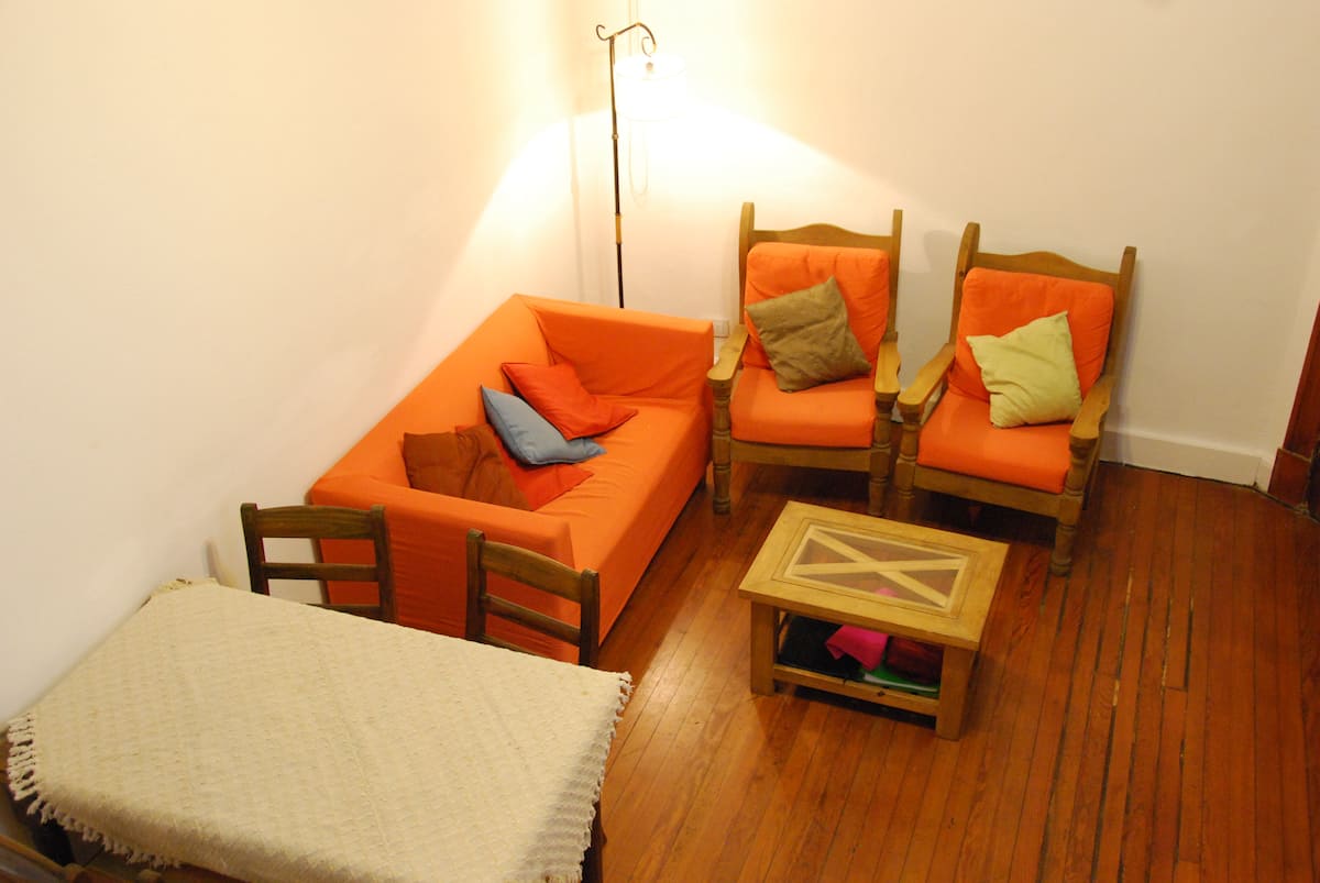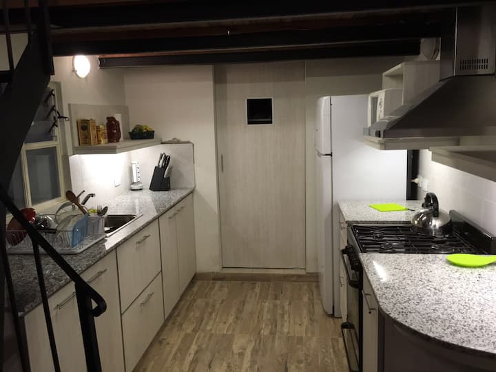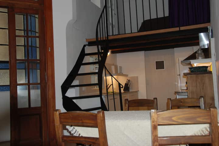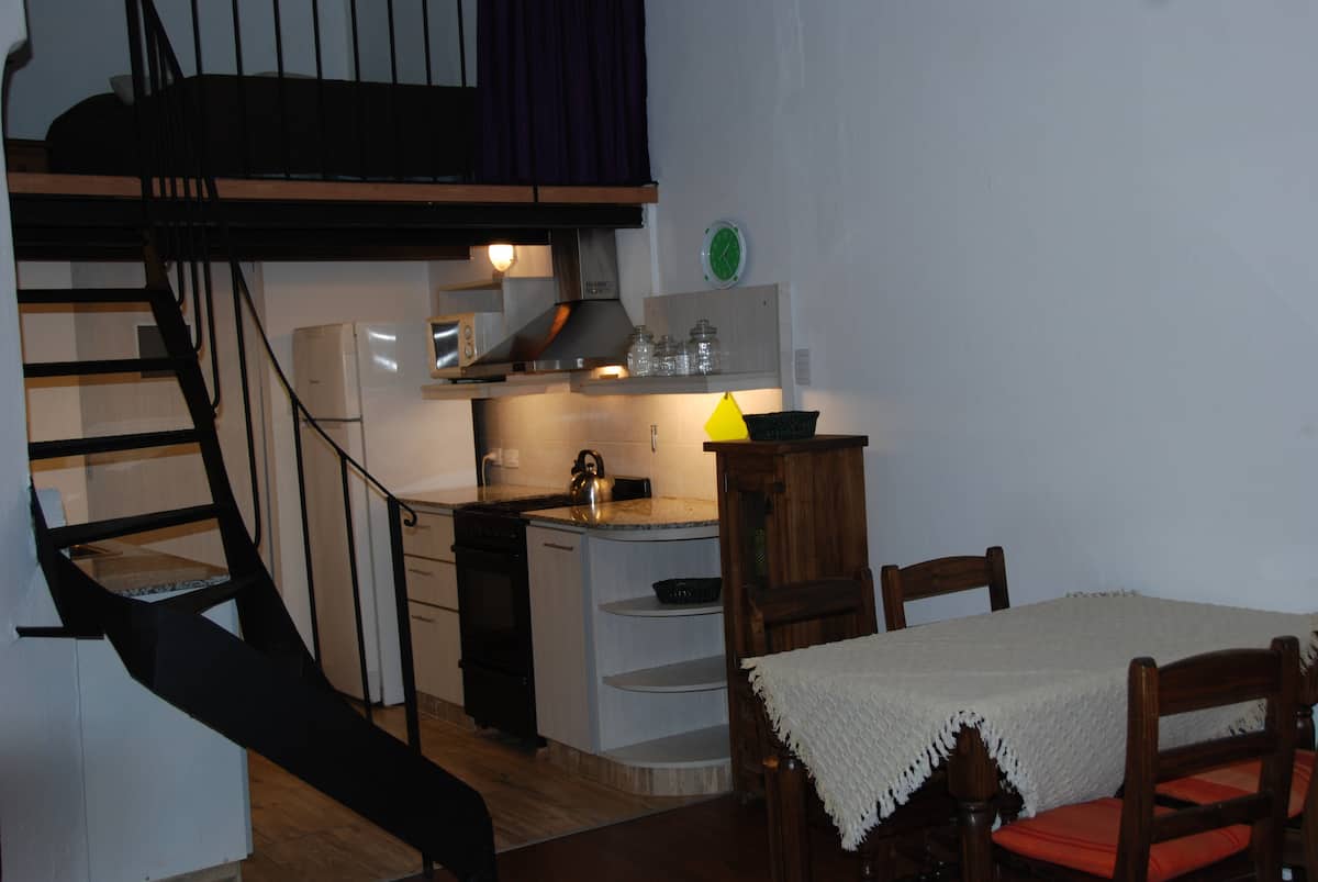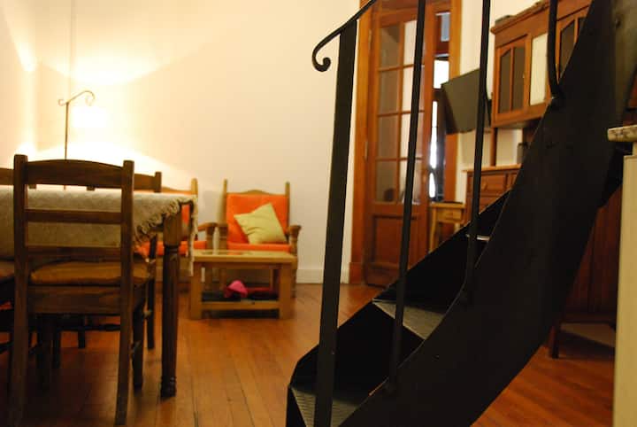 Apartment in a early-20th-century building in Almagro with high ceilings and balconies. Restored with original-style wooden windows, doors and floors. Second-floor unit with air conditioning, Cable TV and high-speed WiFi, plus a full kitchen and dining area.