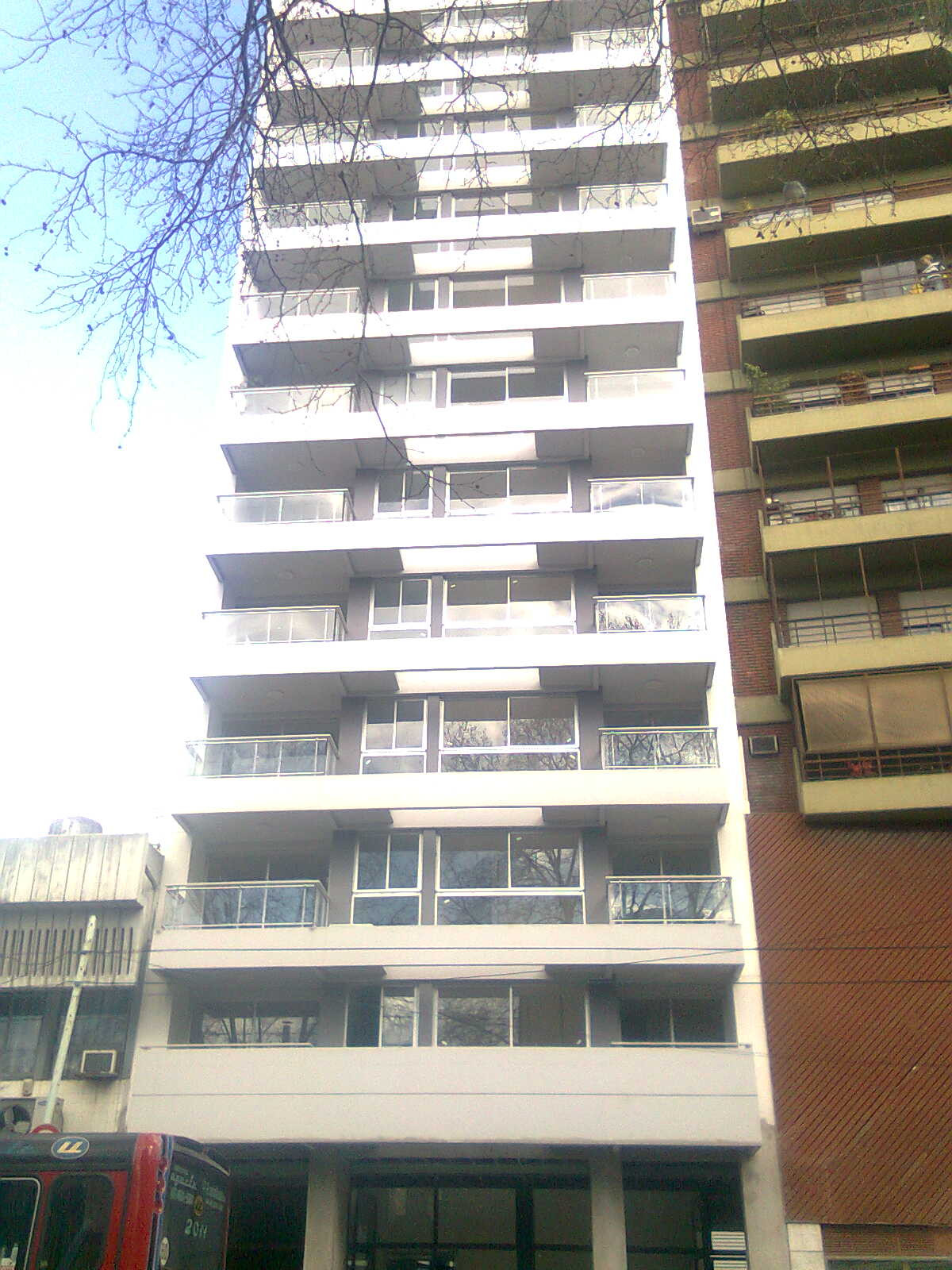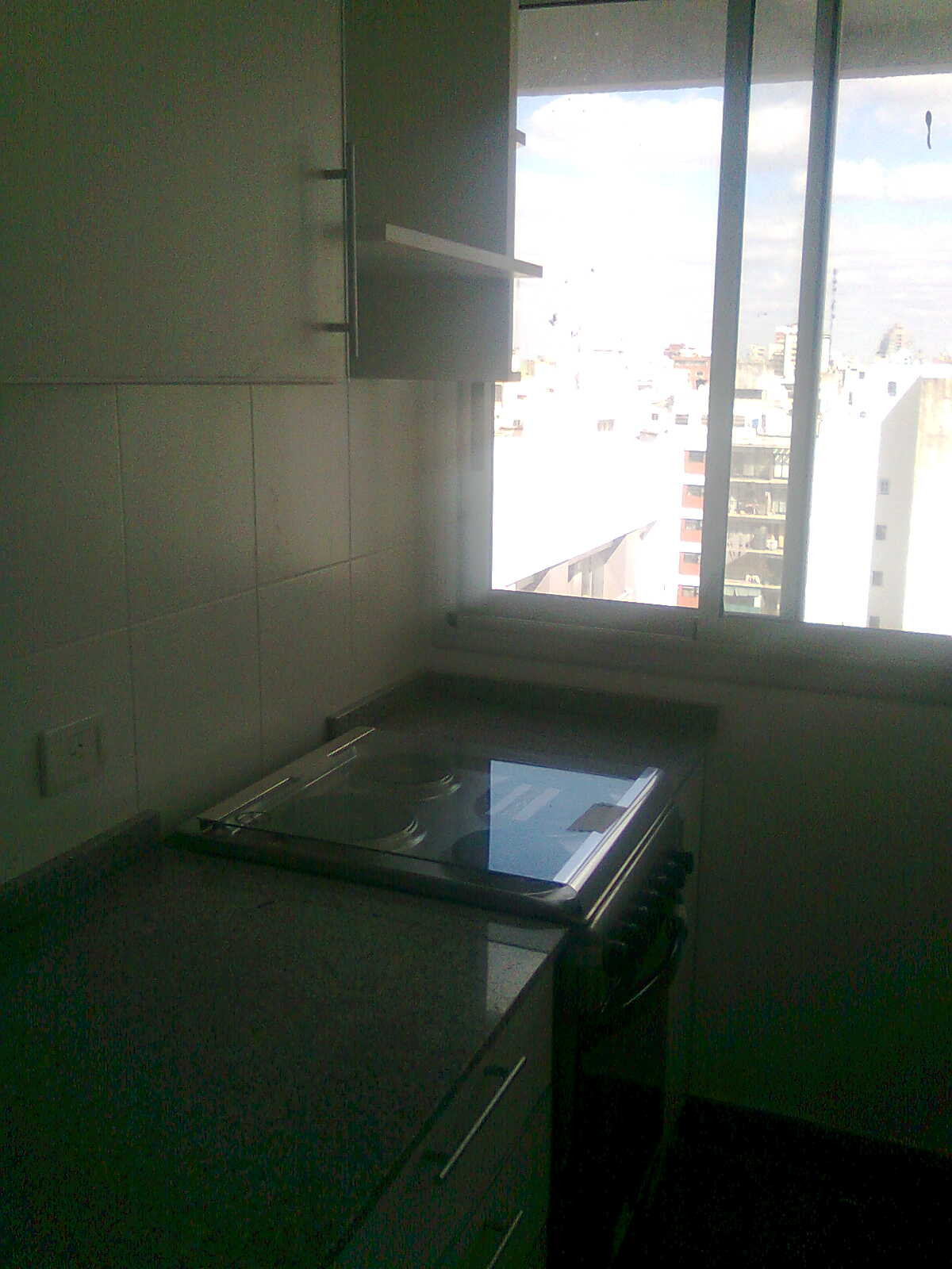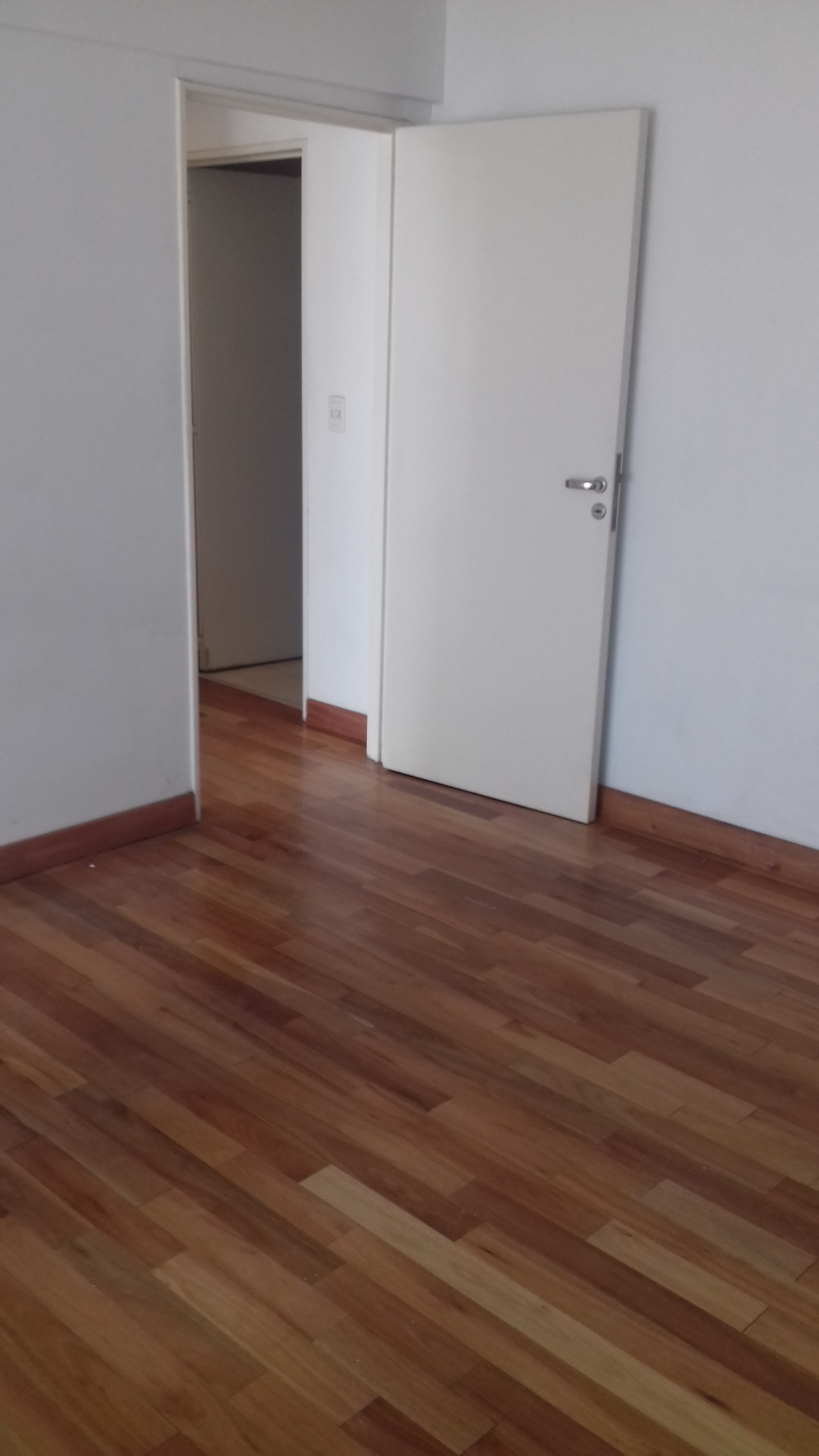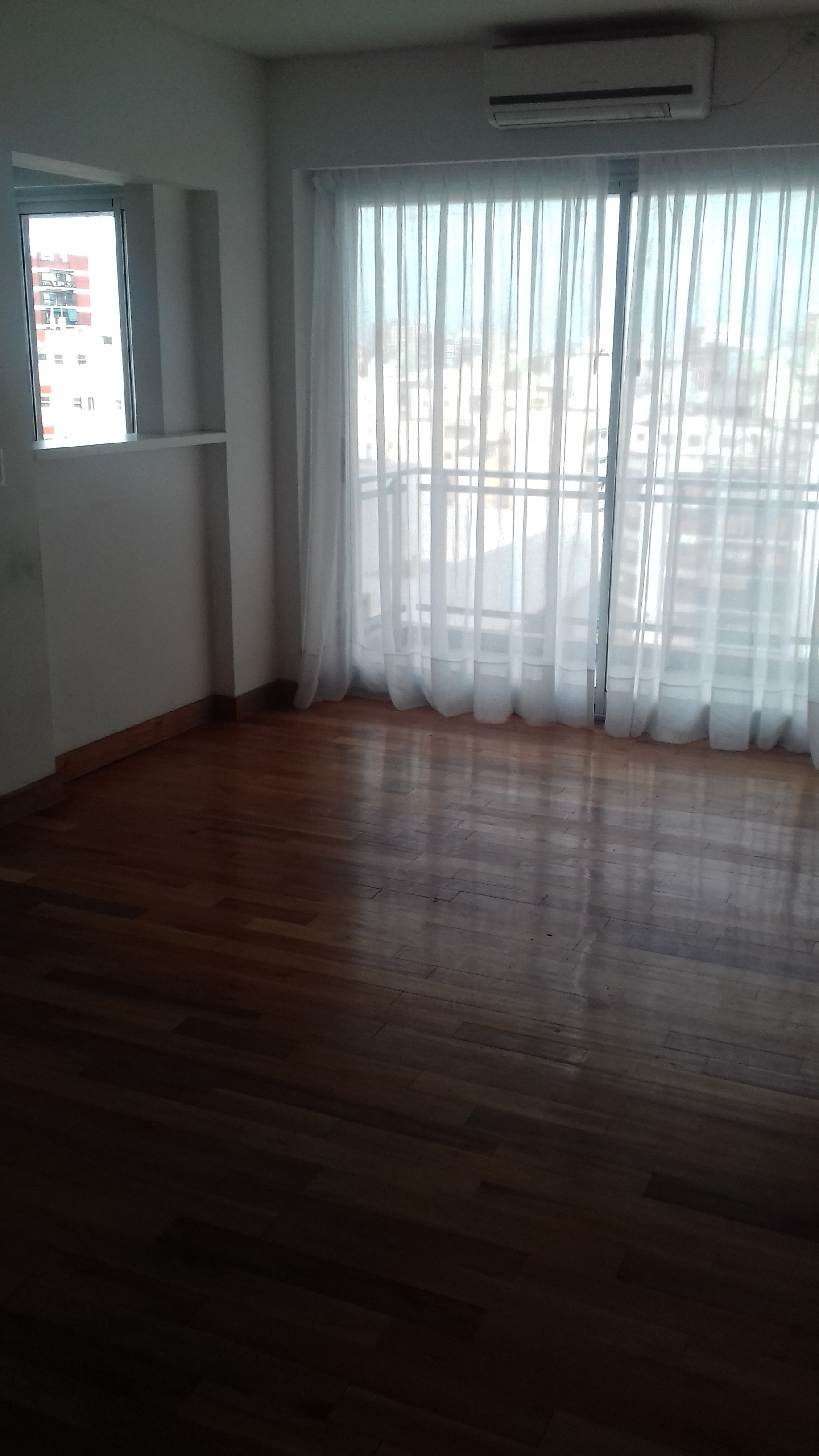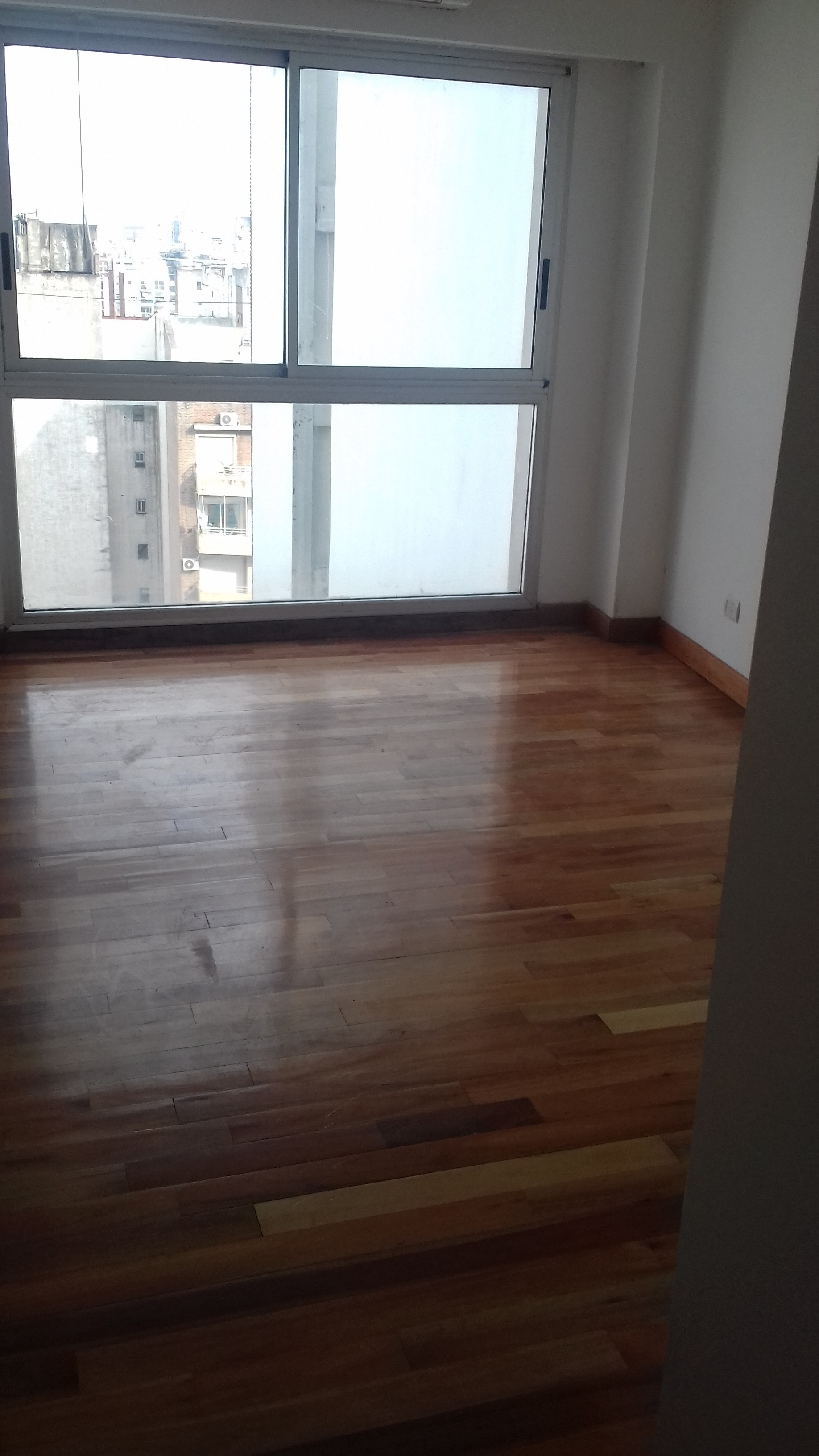 Apartment for rent in Almagro on Av. Corrientes at 3,700, 11th floor unit “C”, courtyard-facing. The unit has 3 bedrooms, a full bathroom and a half bathroom, and a fully fitted kitchen. It includes hot and cold air conditioning (2 units, in the main bedroom and living/dining room), blackout curtains in the bedroom, installed lights, and a large balcony; the flooring is plasticised parquet. Building amenities include a pool, communal room (SUM), and grill, plus a gym and laundry.
