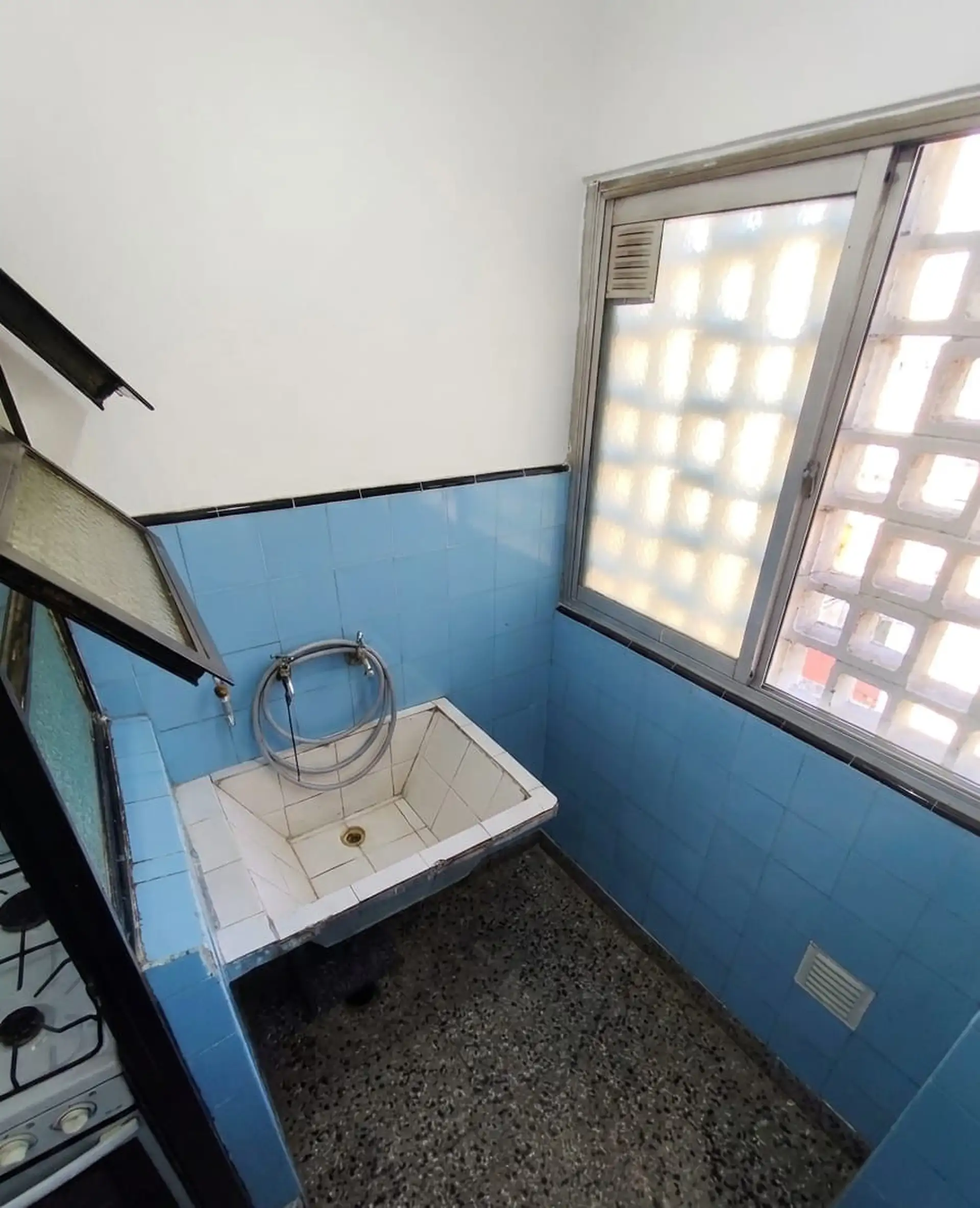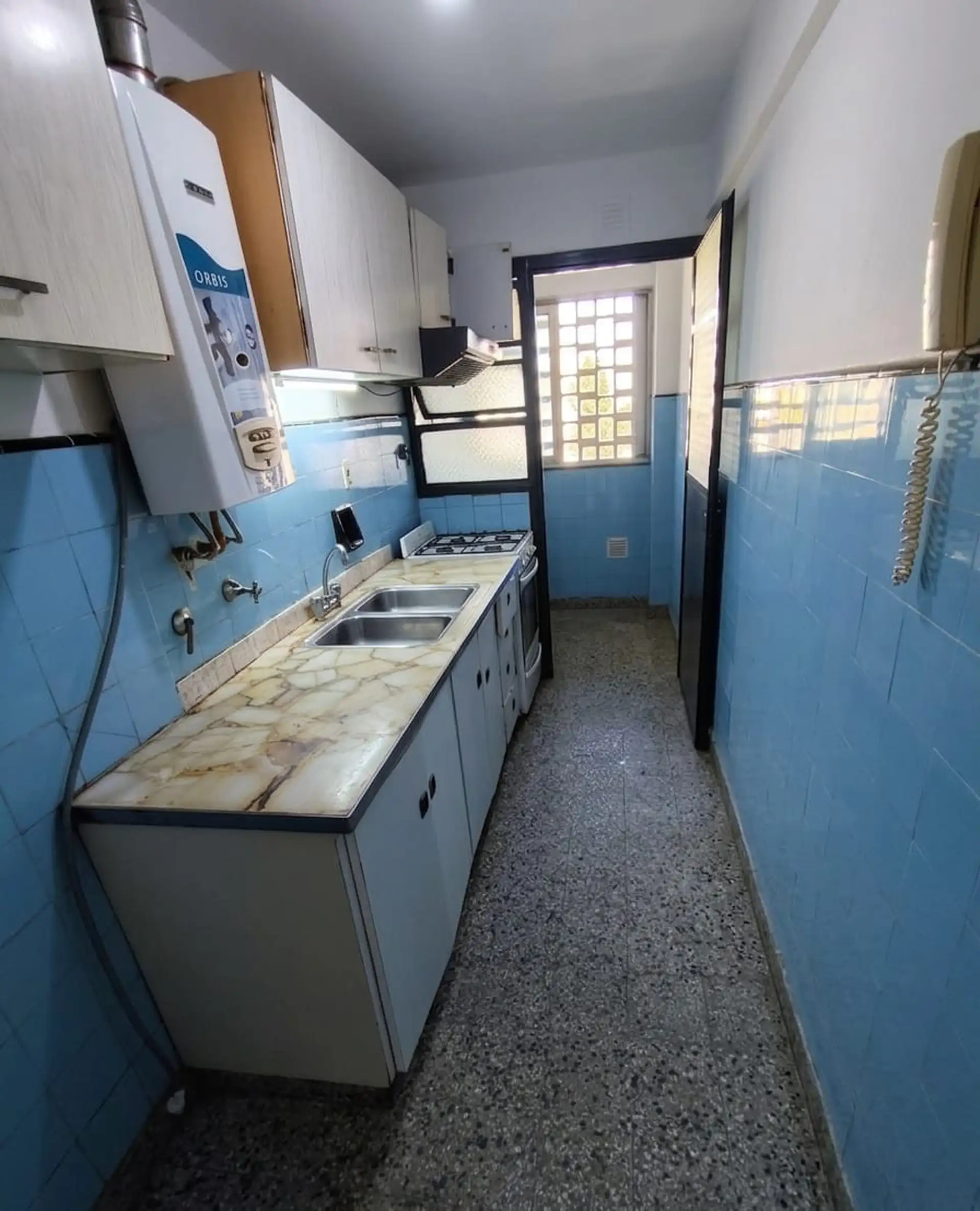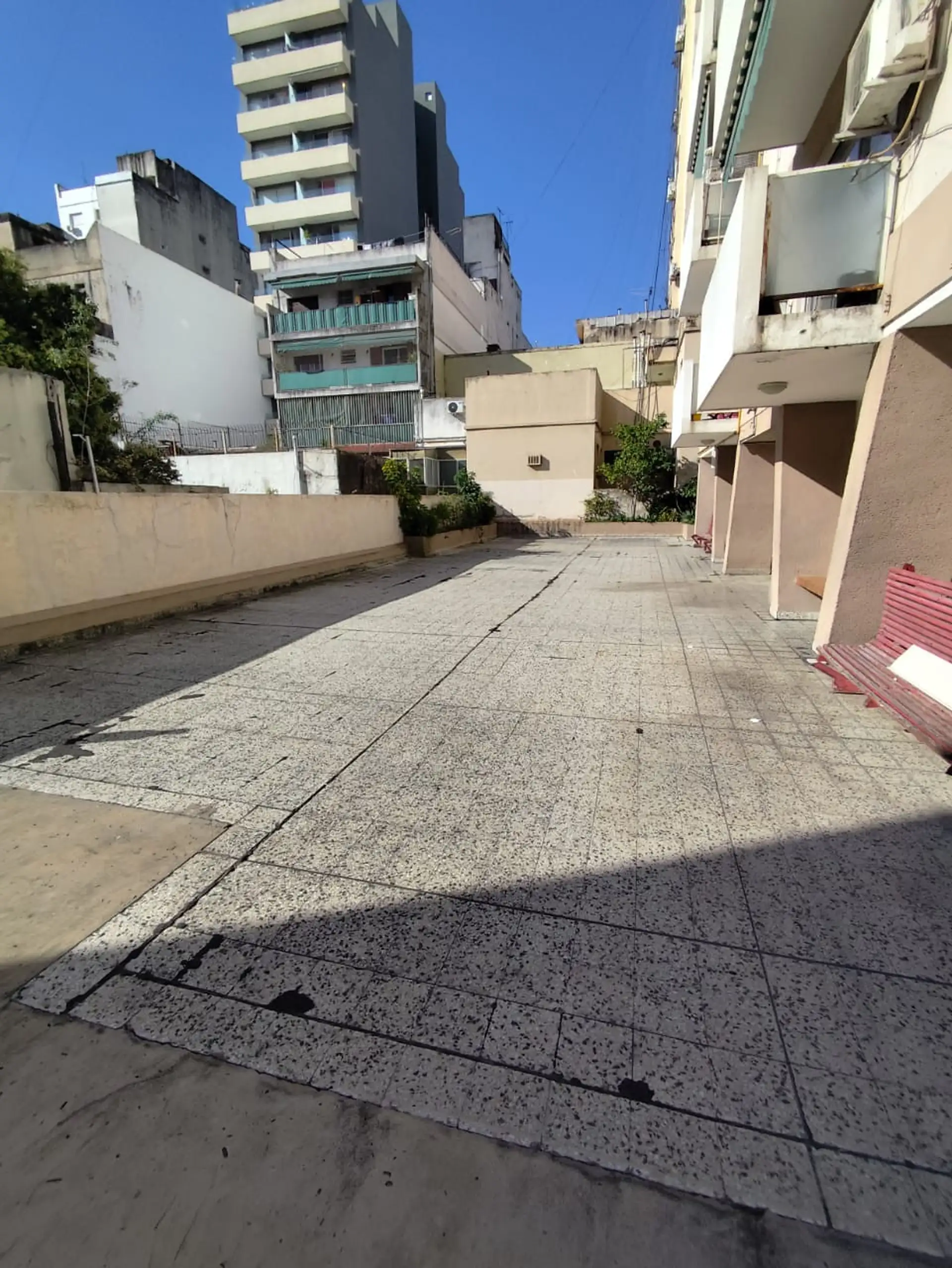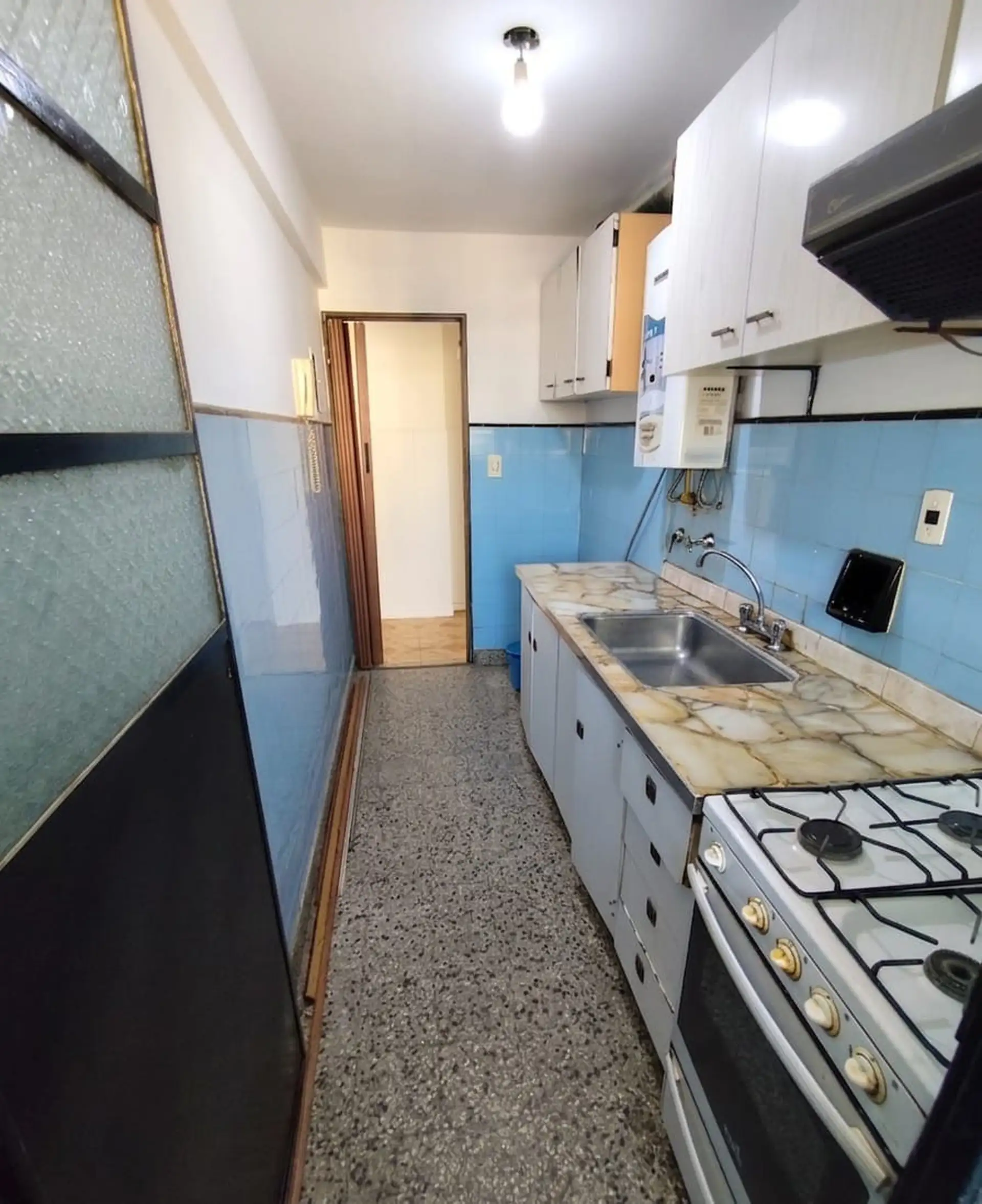 Four-room apartment in Almagro. It has a separate gas kitchen with built-in lower cabinets and wall units, a living-dining area with access to a courtyard-facing balcony, a laundry area, and three bedrooms with windows and closets. The unit was recently painted and includes storage in storage rooms (bauleras); the building has a ground-floor patio and a communal room (SUM) equipped with a refrigerator, oven and air conditioning. Building fees are ARS 124,000. Rental terms require a rental guaran
