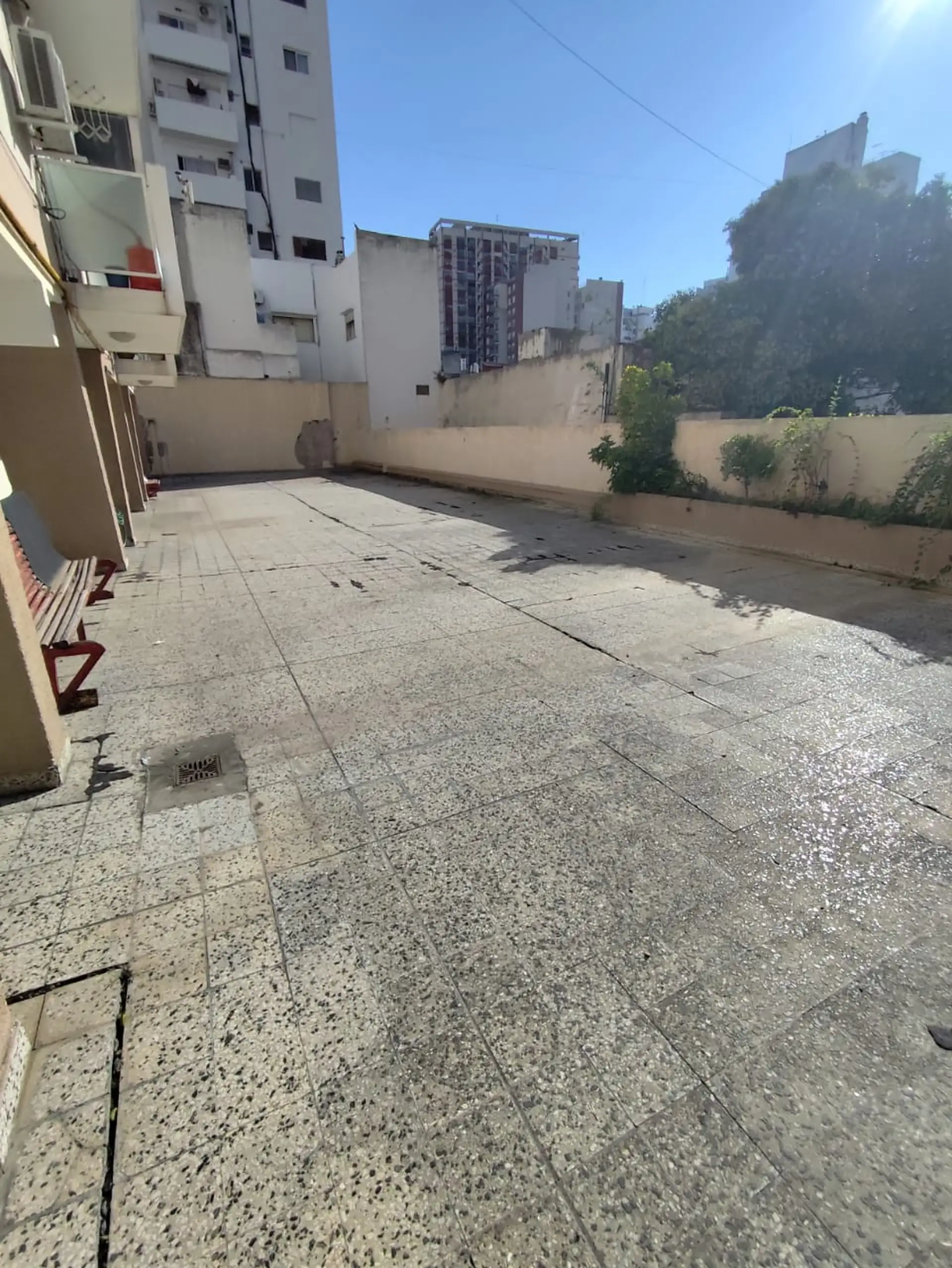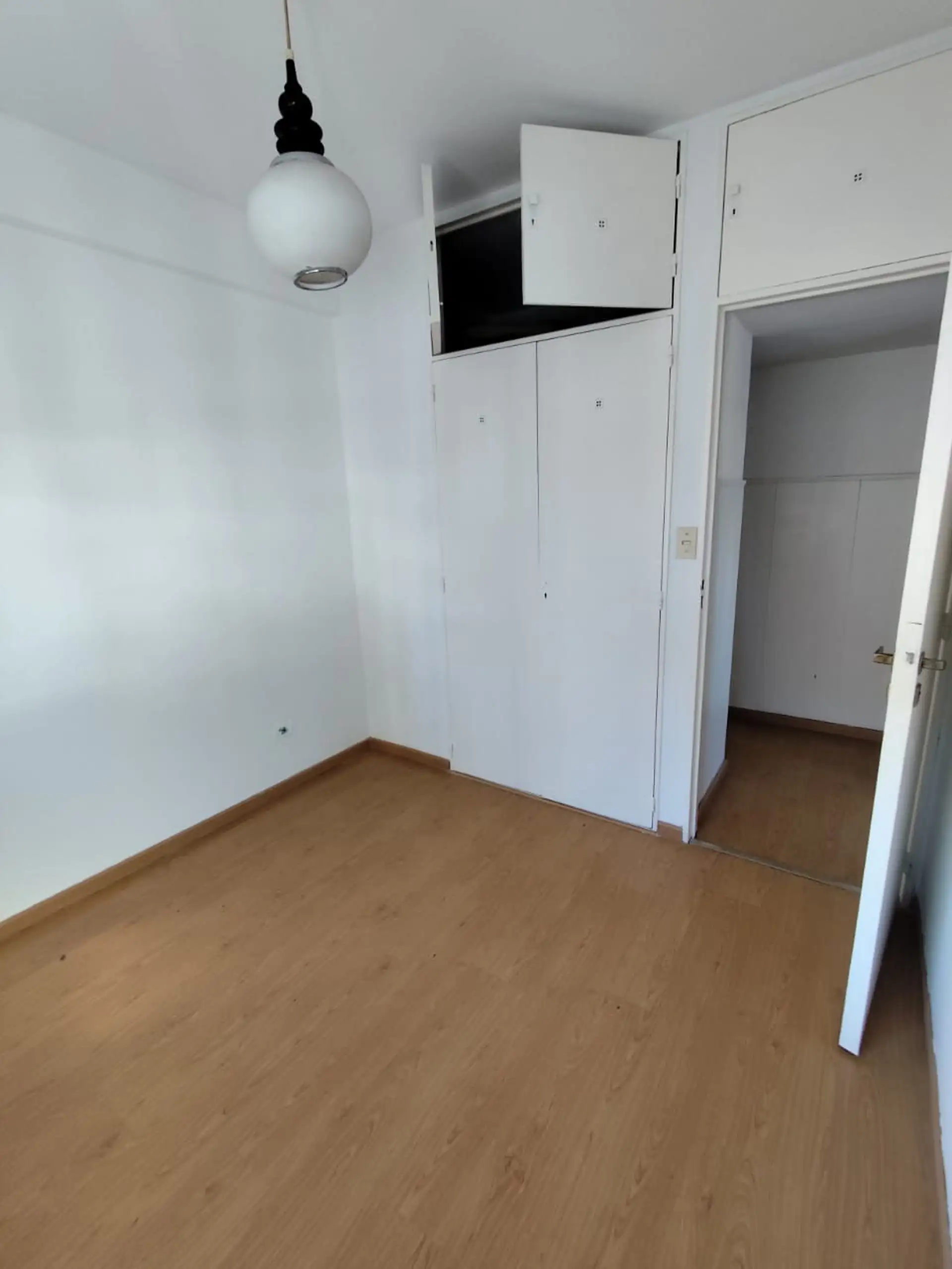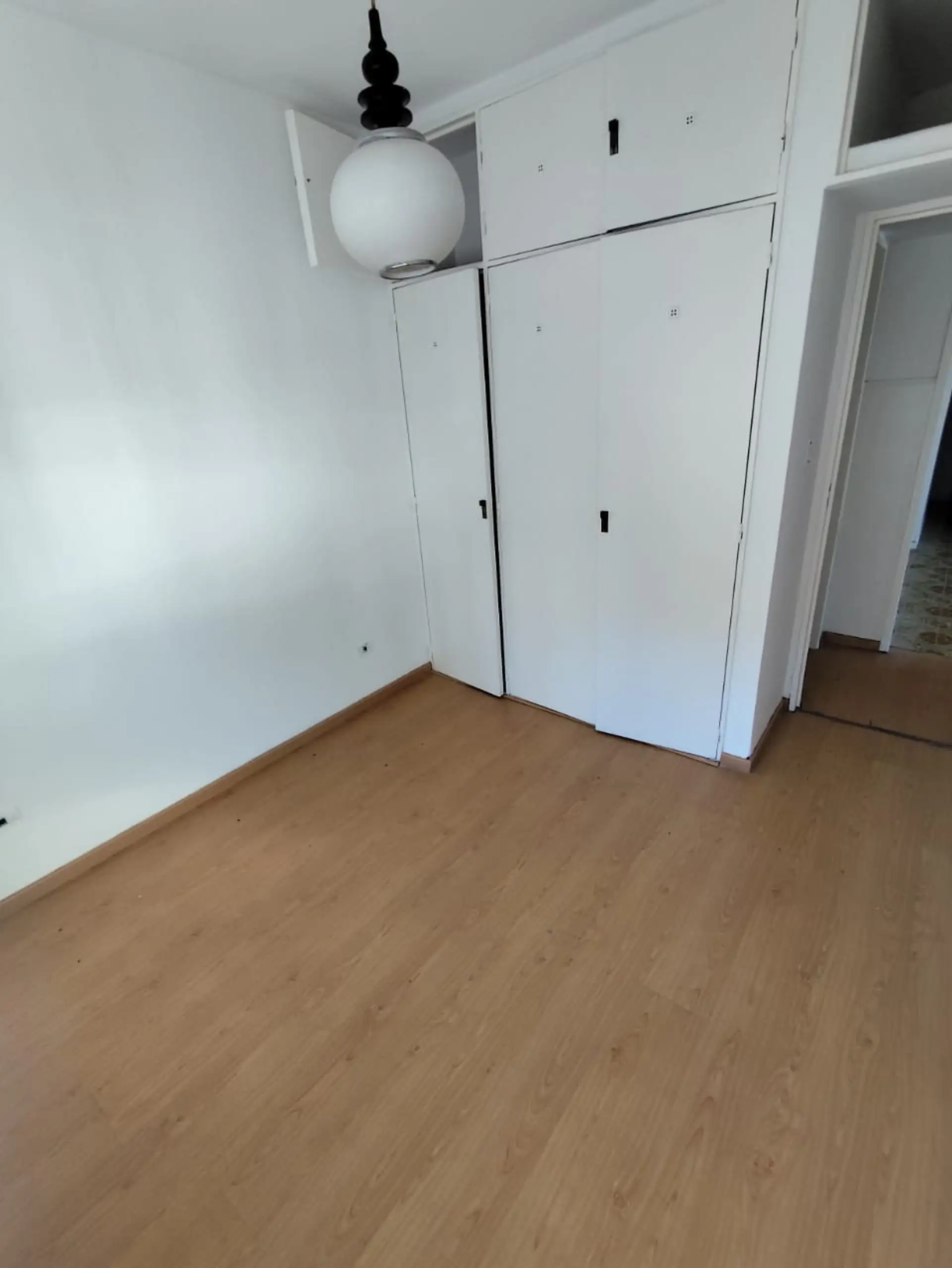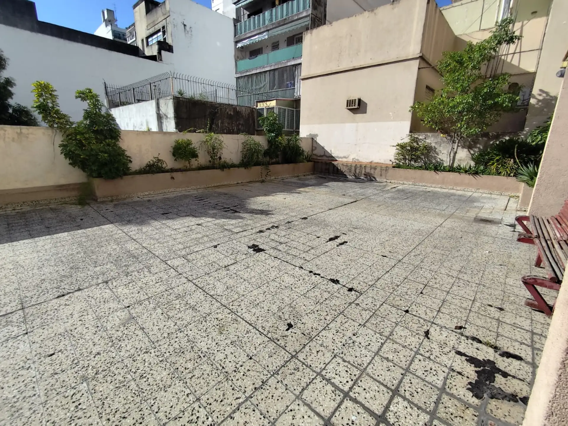 Four-room apartment in Almagro. It has a separate gas kitchen with built-in lower cabinets and wall units, a living-dining area with access to a courtyard-facing balcony, a laundry area, and three bedrooms with windows and closets. The unit was recently painted and includes storage in storage rooms (bauleras); the building has a ground-floor patio and a communal room (SUM) equipped with a refrigerator, oven and air conditioning. Building fees are ARS 124,000. Rental terms require a rental guaran