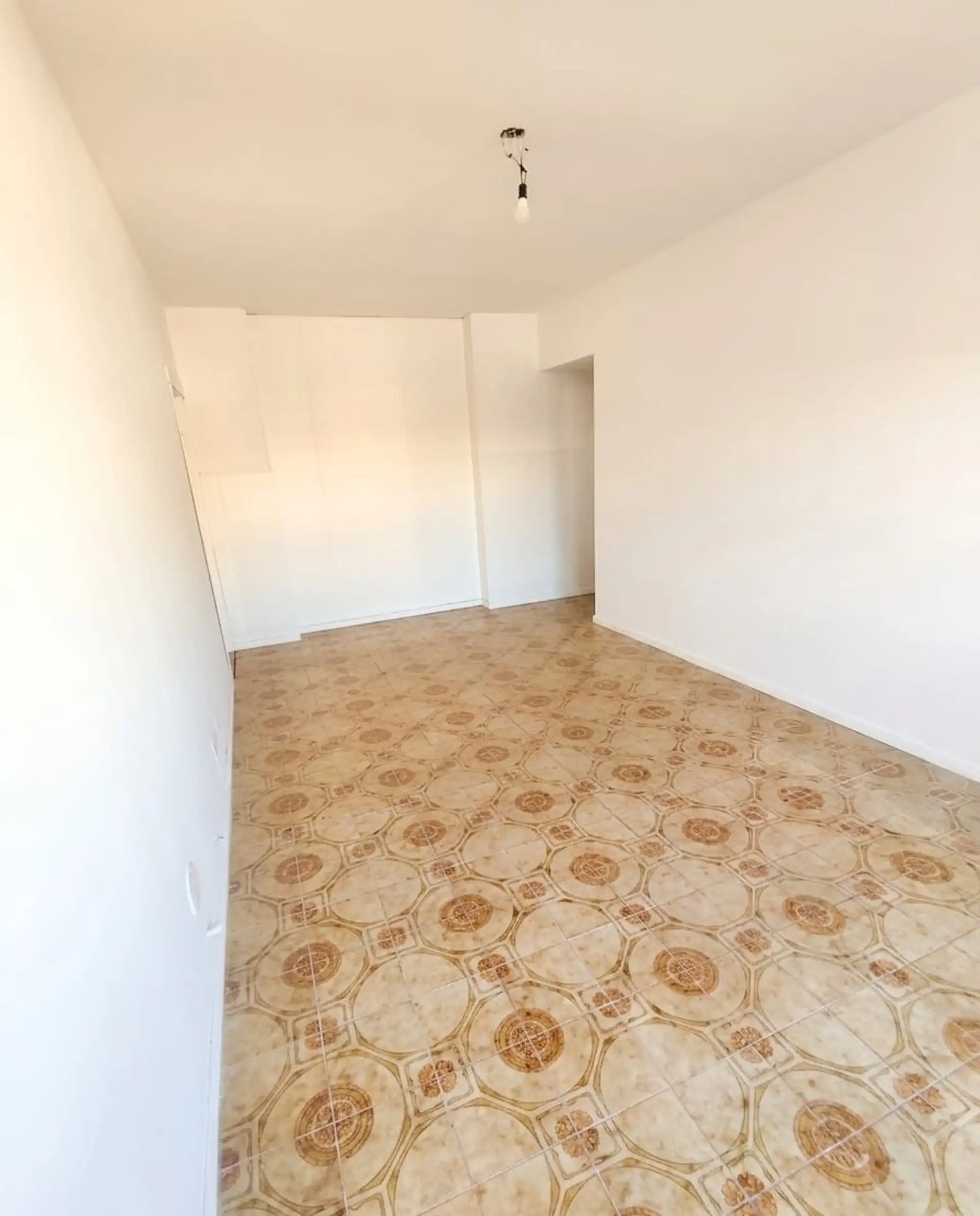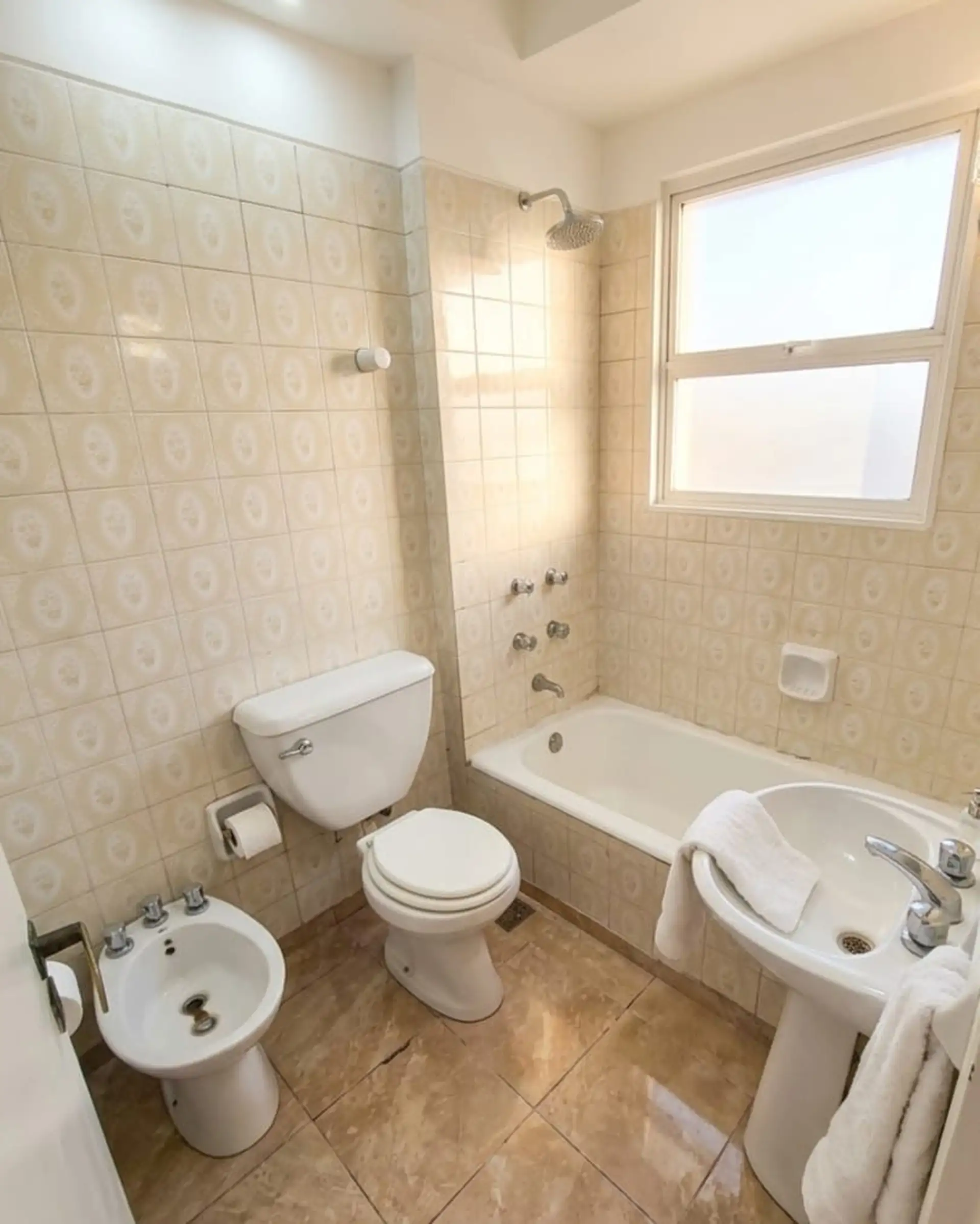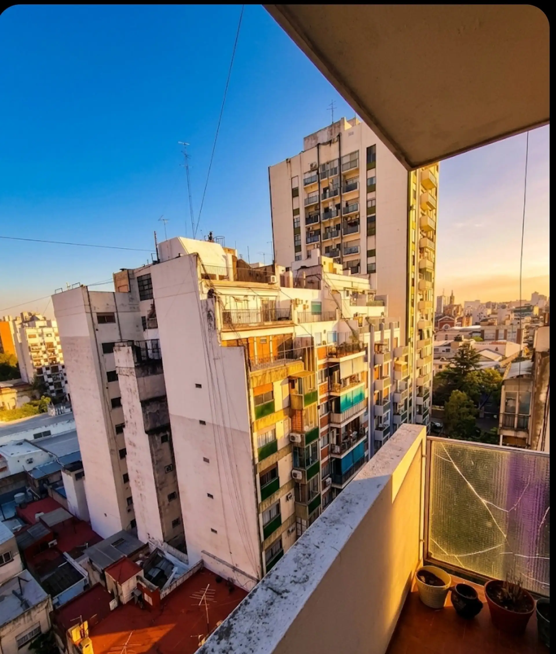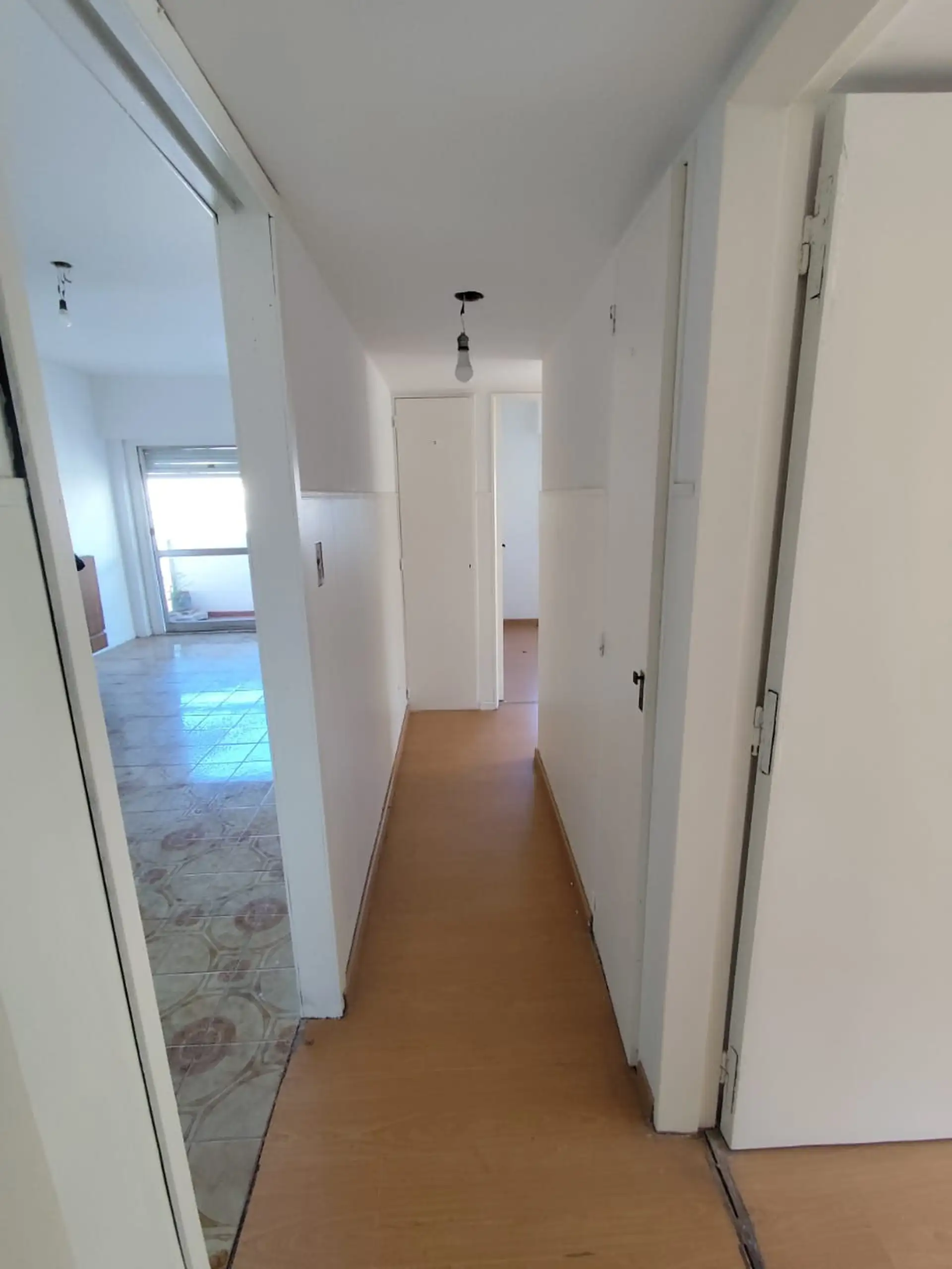 Four-room apartment in Almagro. It has a separate gas kitchen with built-in lower cabinets and wall units, a living-dining area with access to a courtyard-facing balcony, a laundry area, and three bedrooms with windows and closets. The unit was recently painted and includes storage in storage rooms (bauleras); the building has a ground-floor patio and a communal room (SUM) equipped with a refrigerator, oven and air conditioning. Building fees are ARS 124,000. Rental terms require a rental guaran