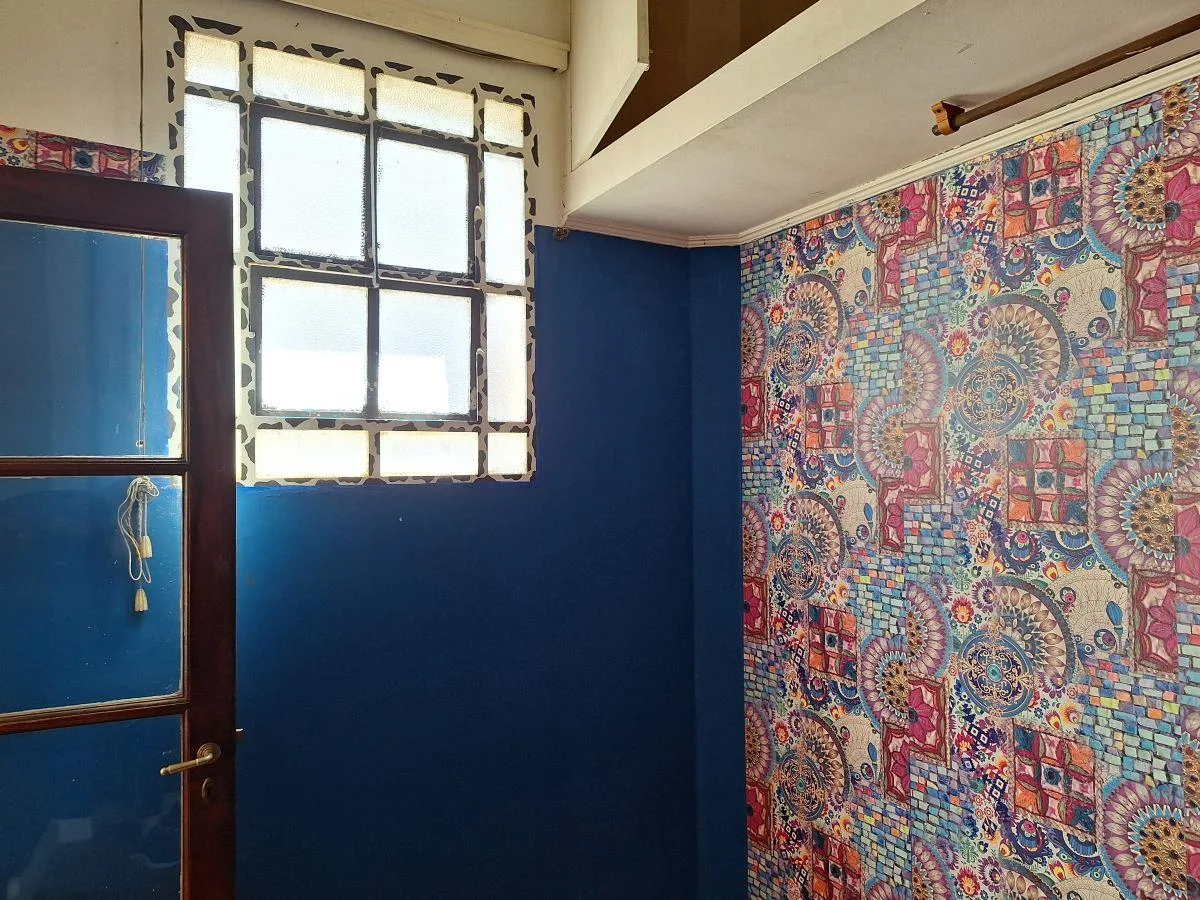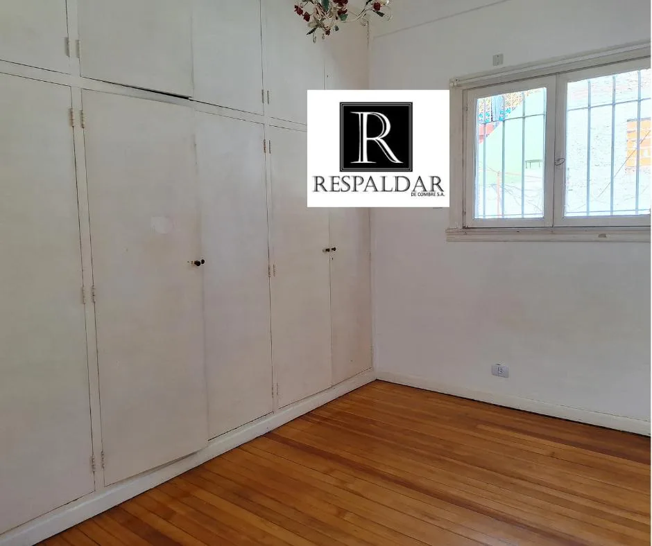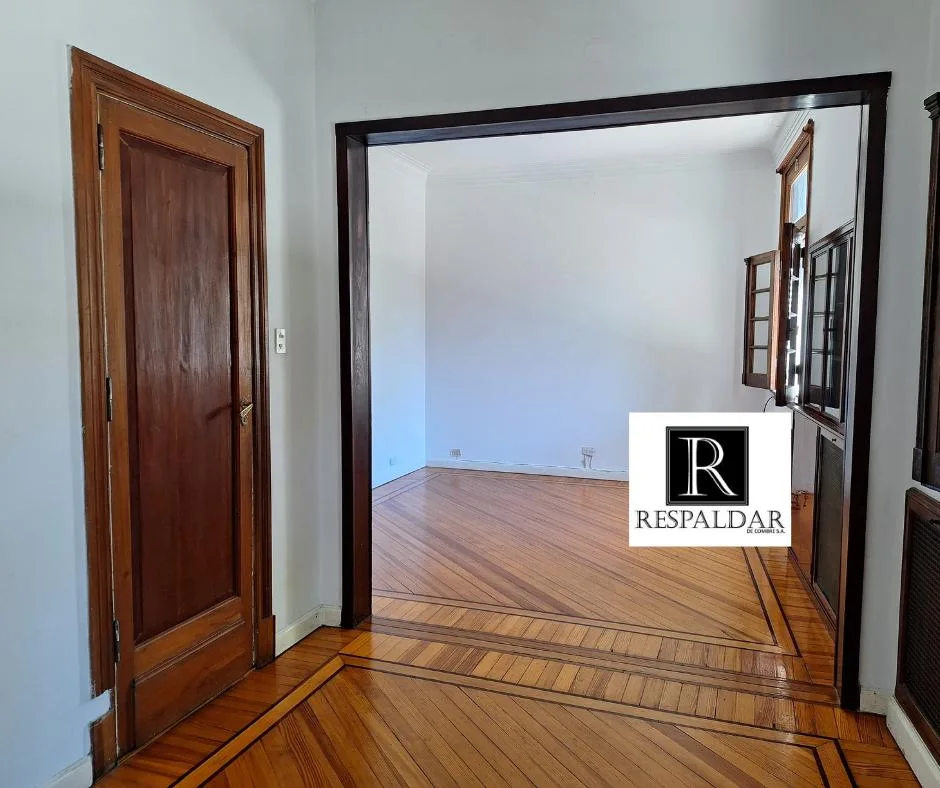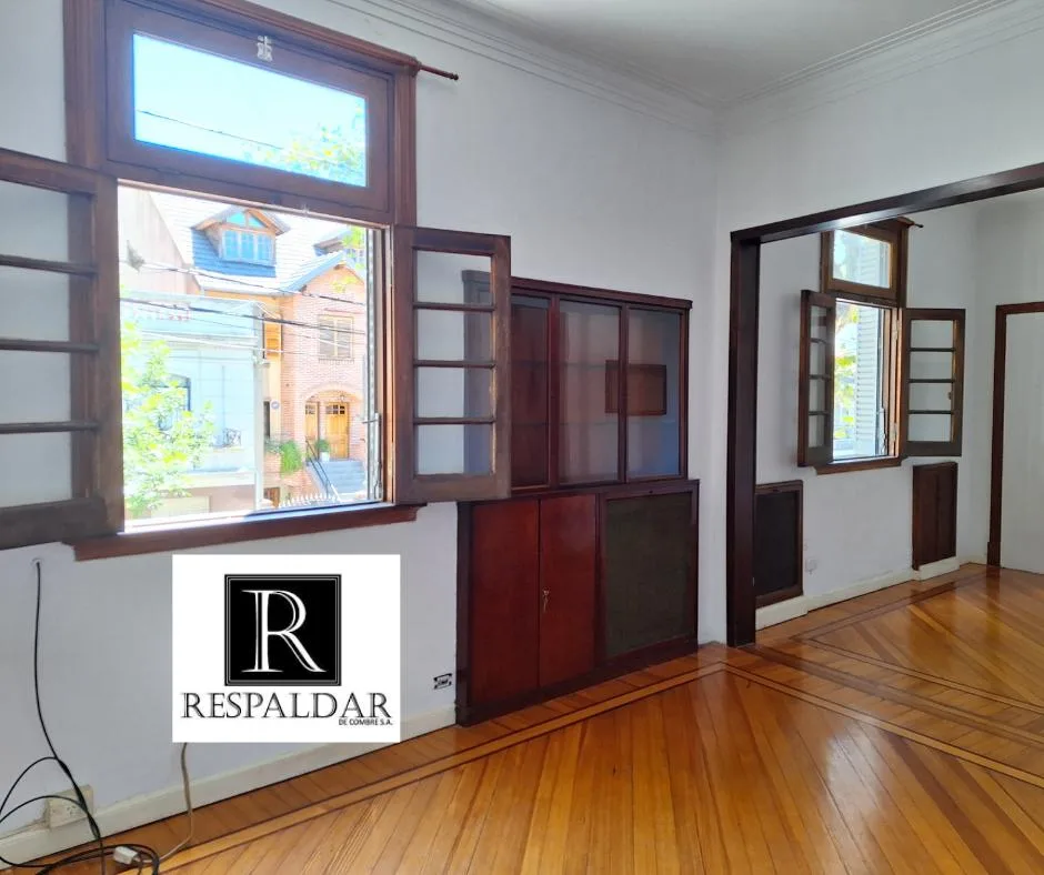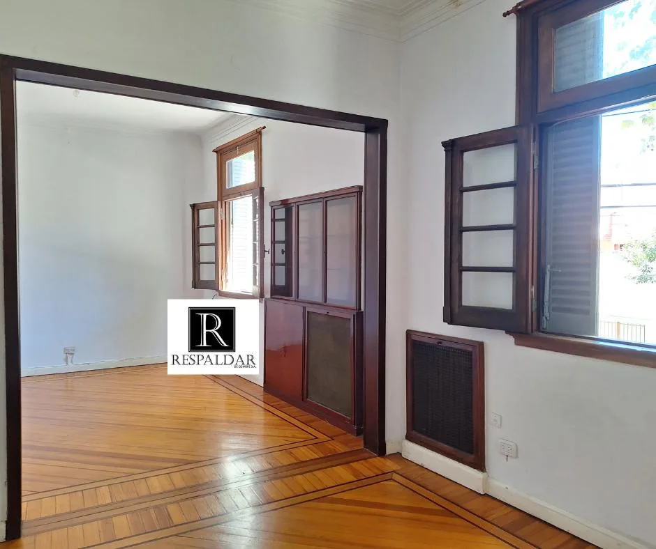 House-style unit on the first floor reached by stairs, with 4 rooms and no building fees. It has a reception hall with mosaic floors, a large living-dining room at the front with plastified pinotea flooring, two built-in wooden display cases with glass doors, and two front-facing windows. There are two bedrooms with plastified pinotea flooring and built-in closets, a full bathroom with a built-in cabinet and electric water heater, a distribution hall with a high window, and a kitchen with a 4-bu