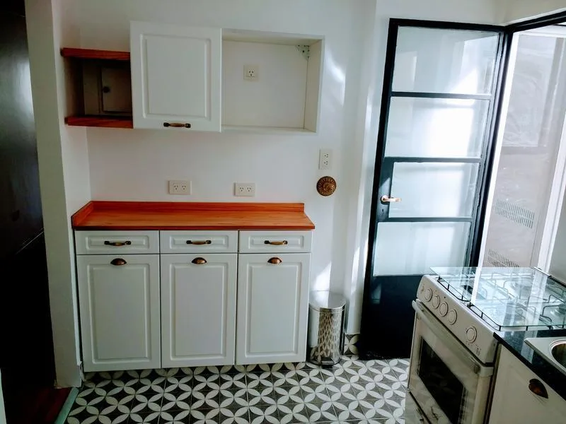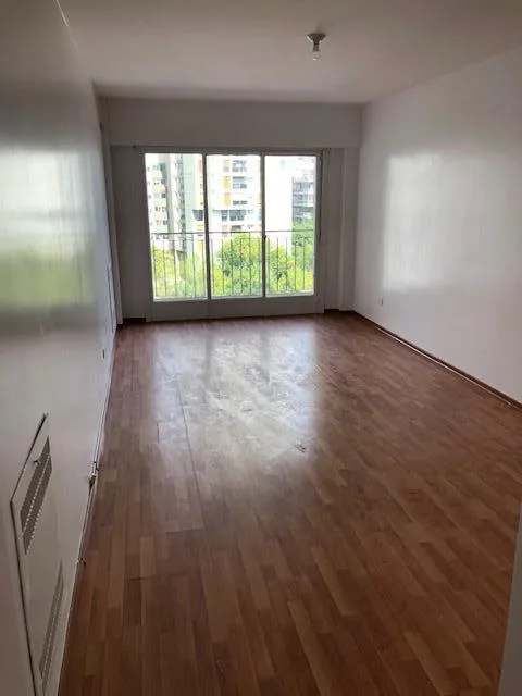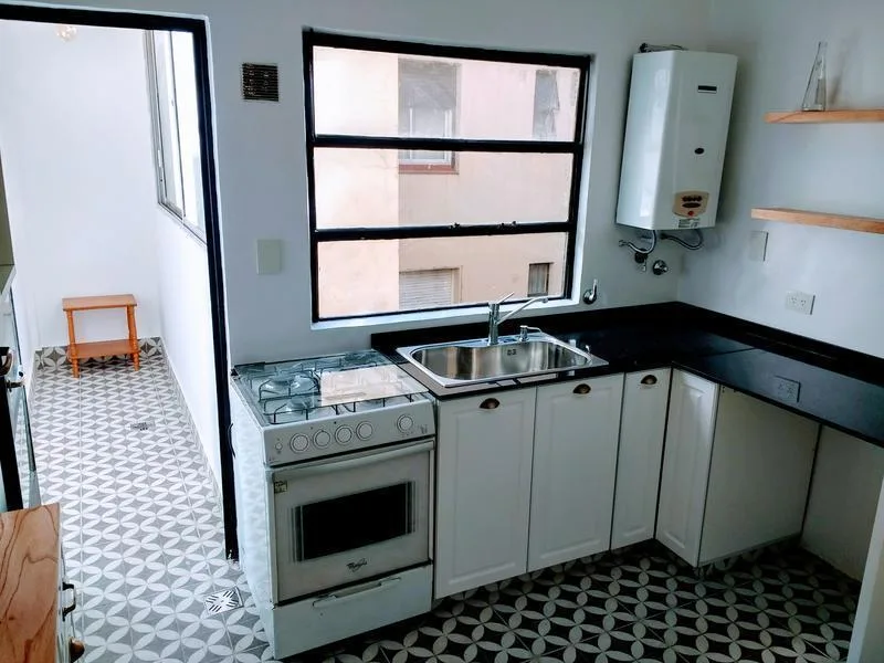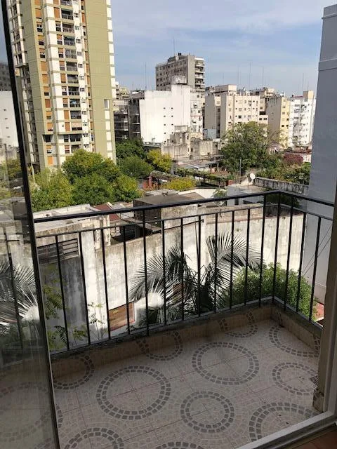 Four-room apartment on the 6th floor, courtyard-facing in Caballito. Refurbished 5 years ago and in good condition, with a separate kitchen (gas oven and cooktop), hot-water heater, and connection for a washing machine. The unit has a large living-dining area with access to a balcony plus an internal balcony/patio, a full bathroom, and a separate toilet. Air conditioning (hot and cold) is installed in the living area. Building has 8 floors and has a permanent caretaker; building fees are ARS 230